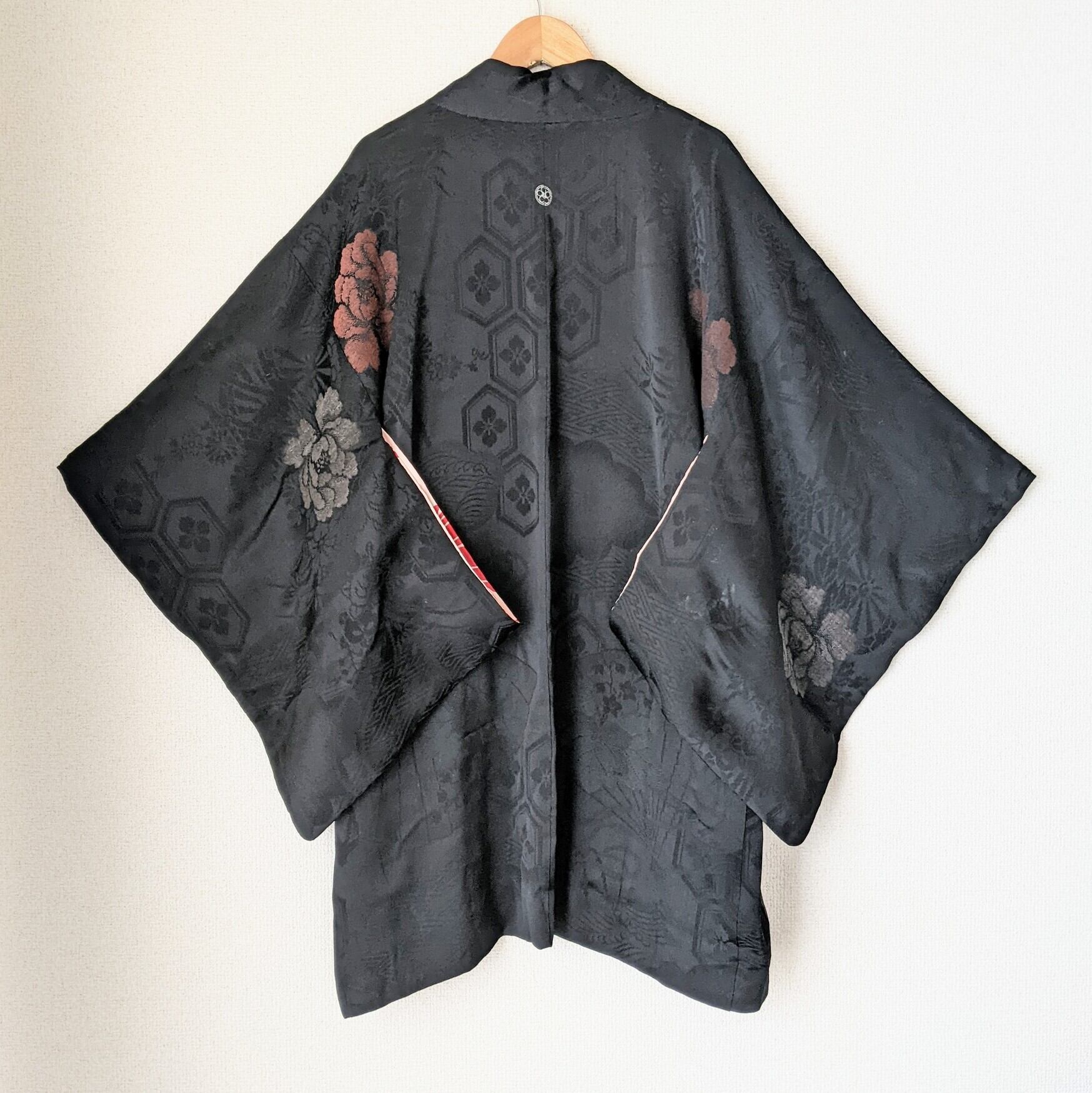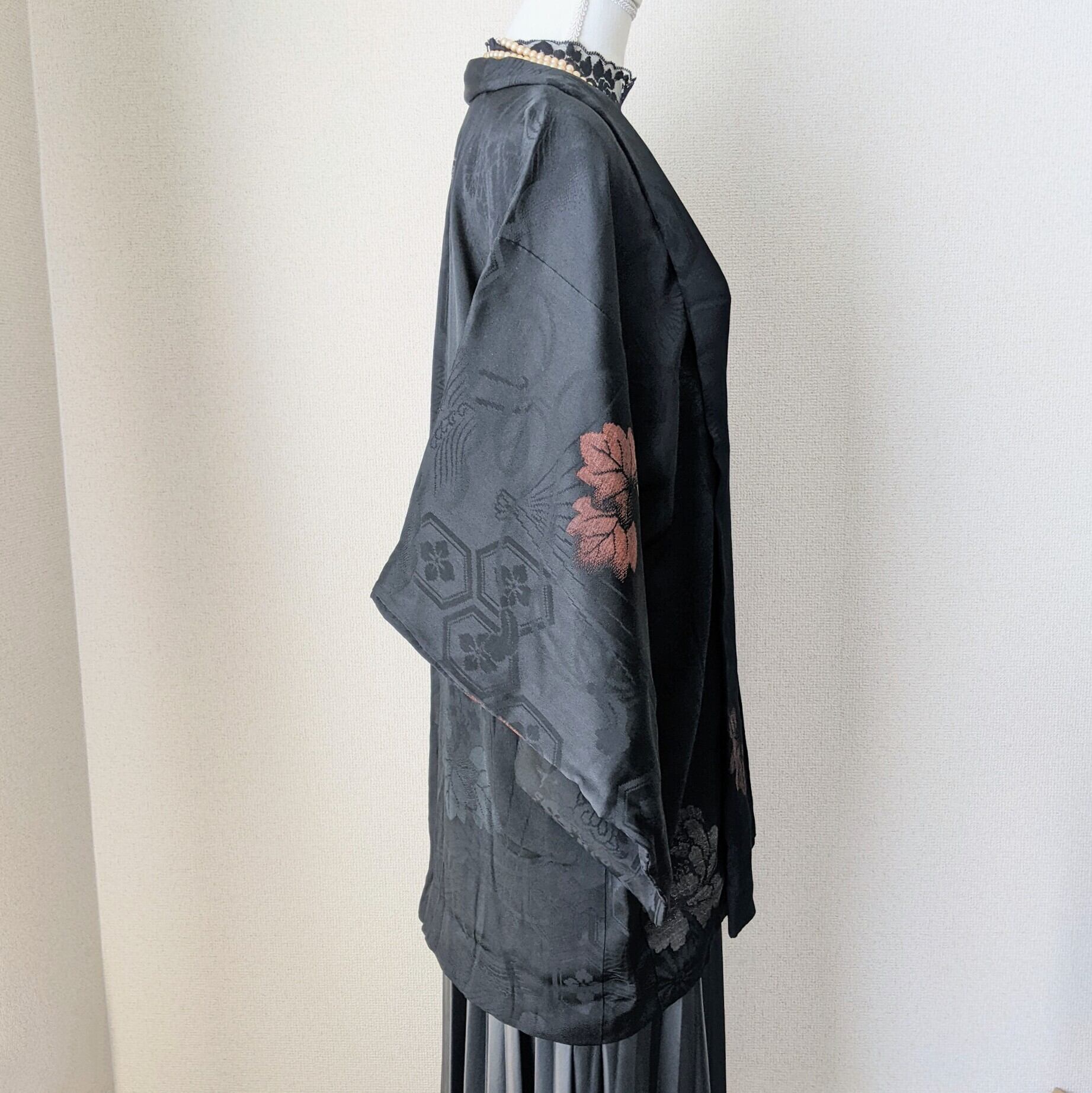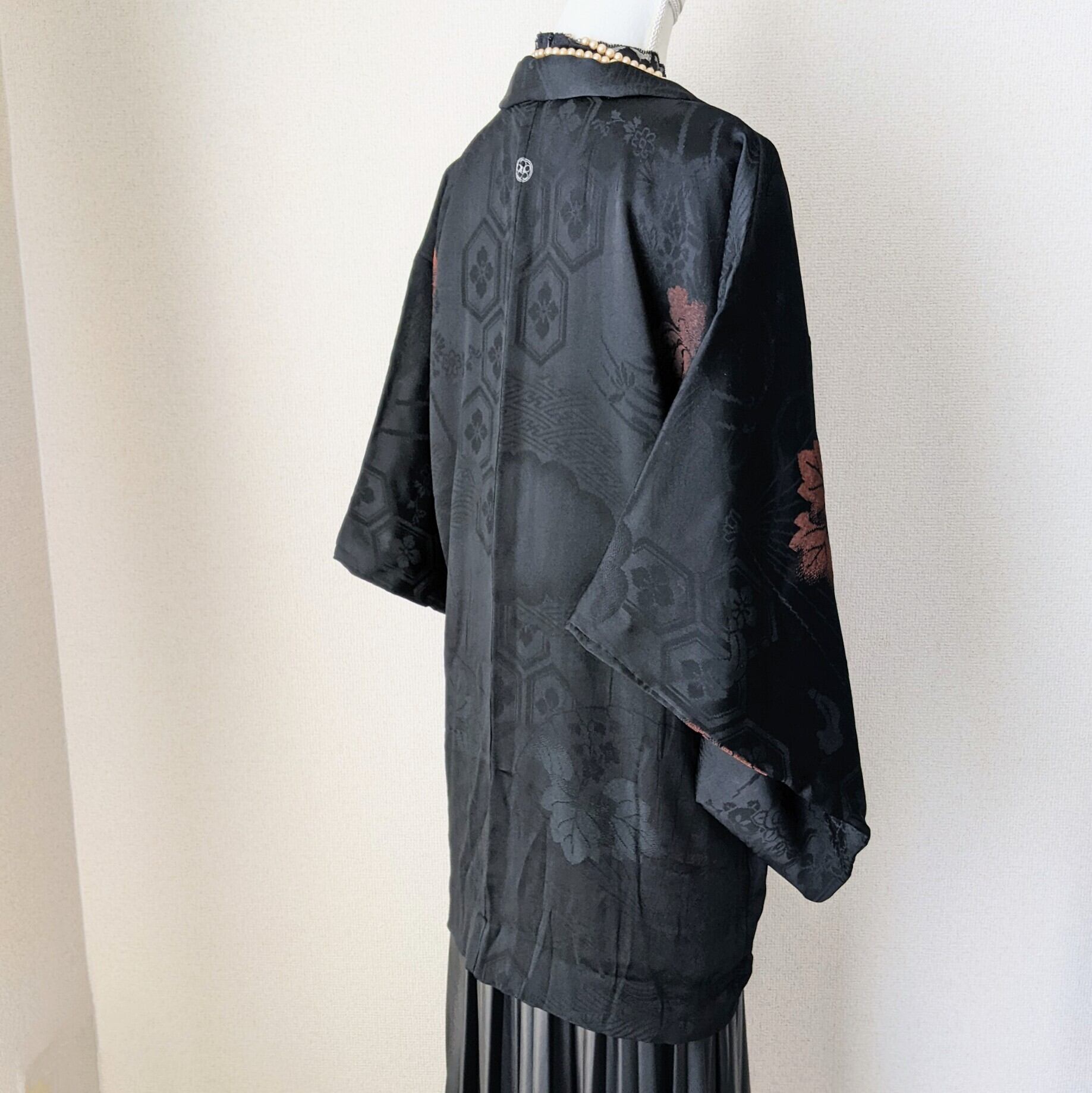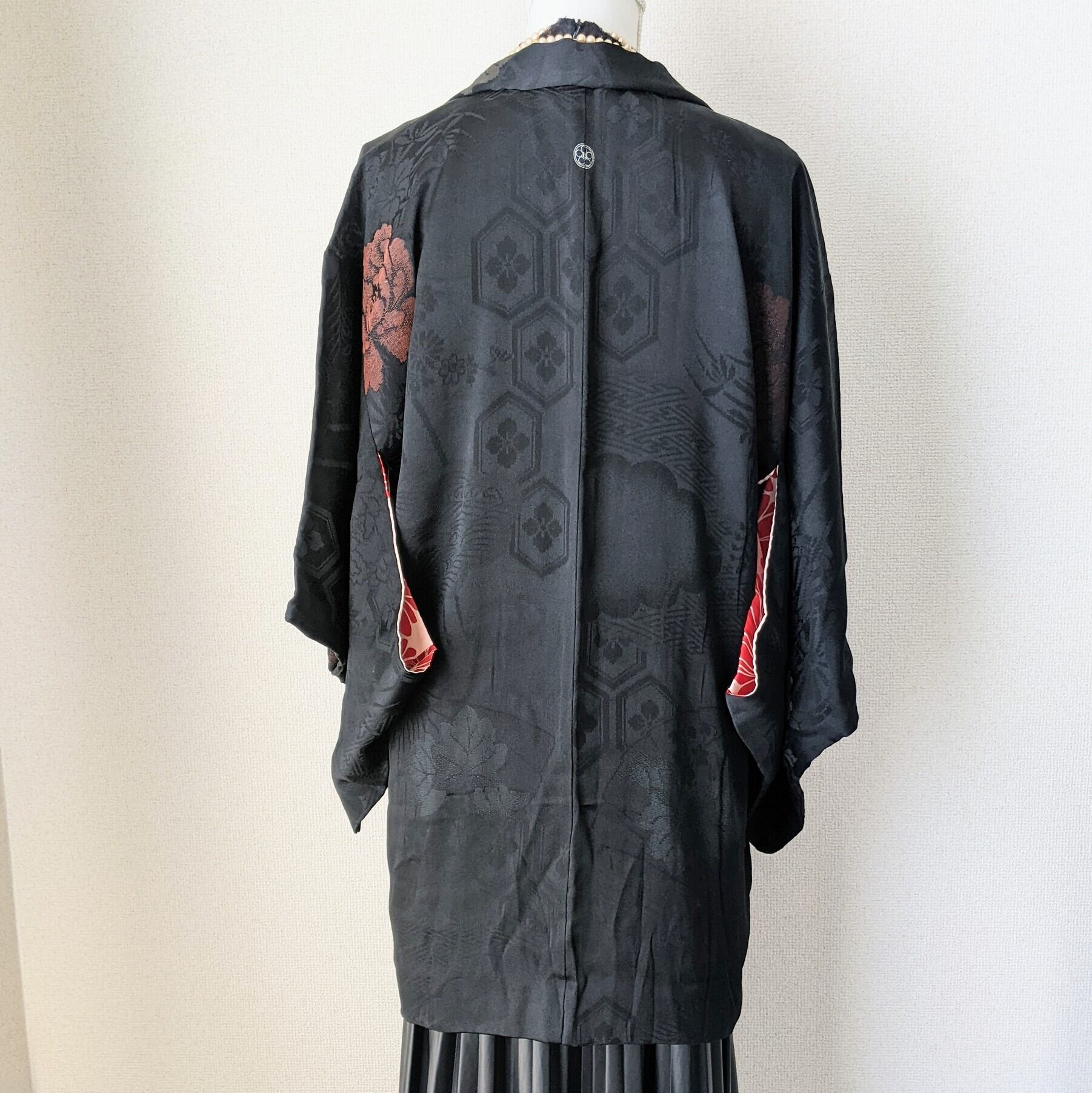 【Vintage】HAORI 長羽織 羽織 正絹 縮緬 黒羽織 芍薬柄 亀甲地紋入り シルク 大正浪漫 和洋折衷