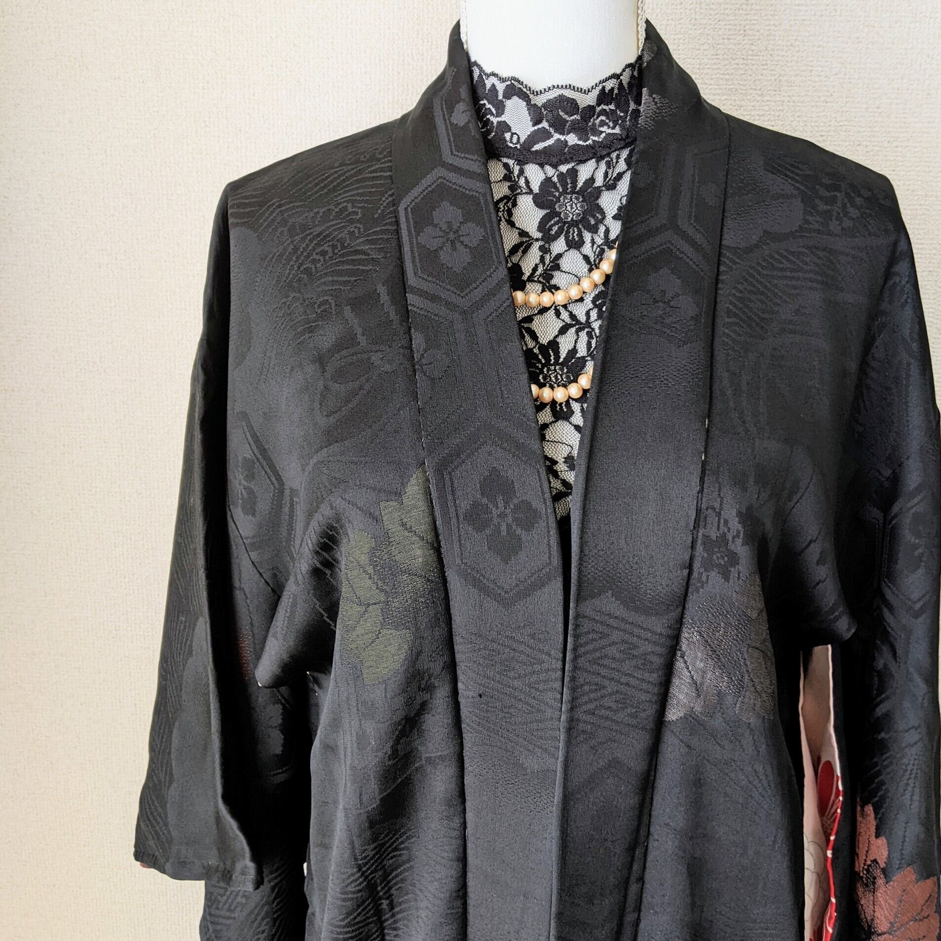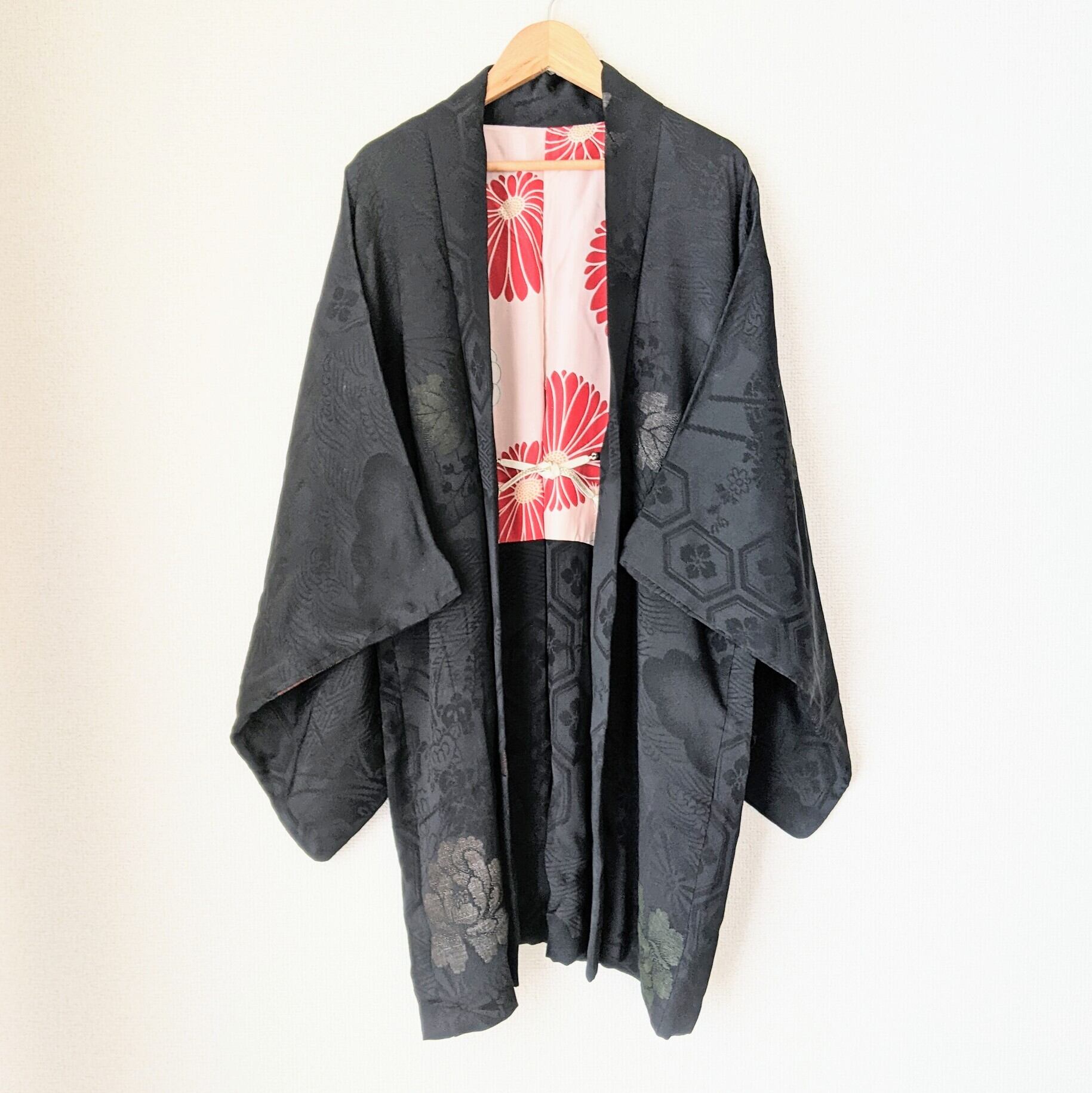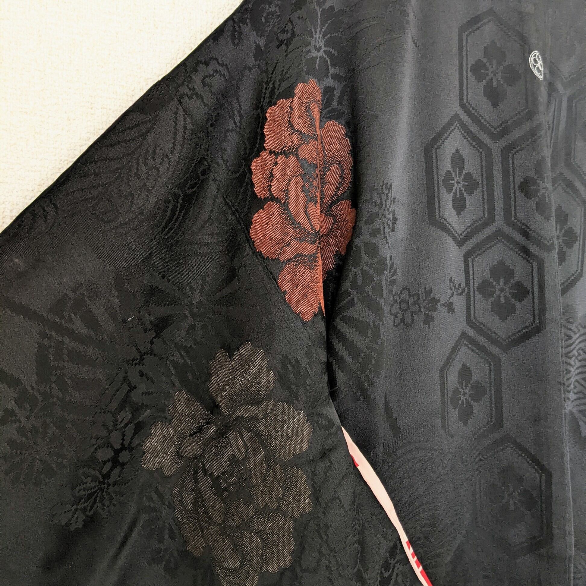 【Vintage】HAORI 長羽織 羽織 正絹 縮緬 黒羽織 芍薬柄 亀甲地紋入り シルク 大正浪漫 和洋折衷
