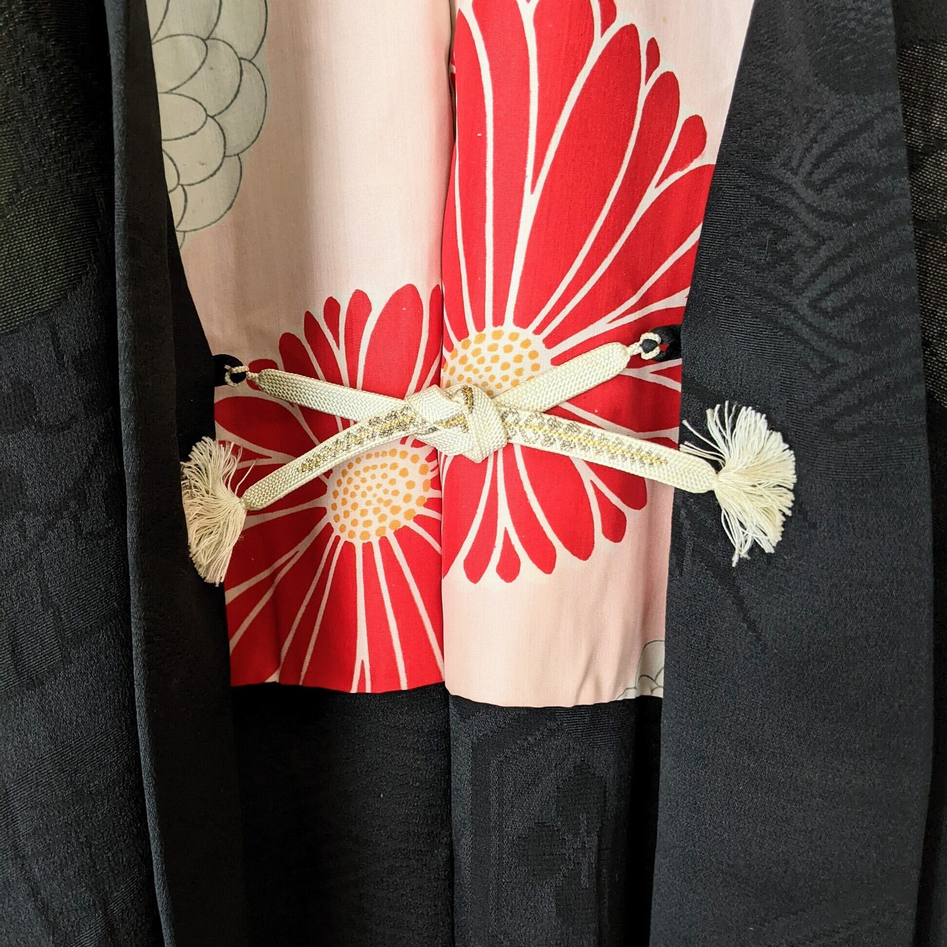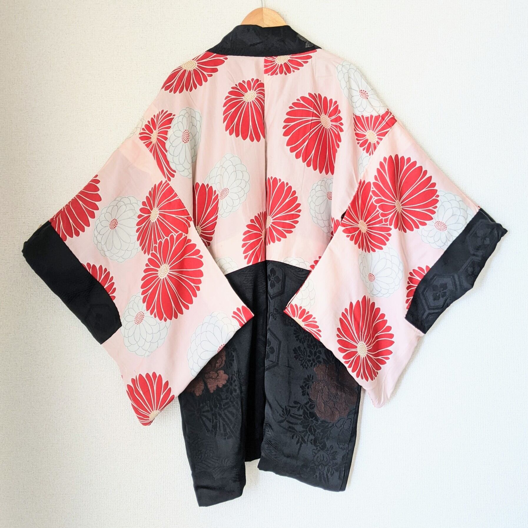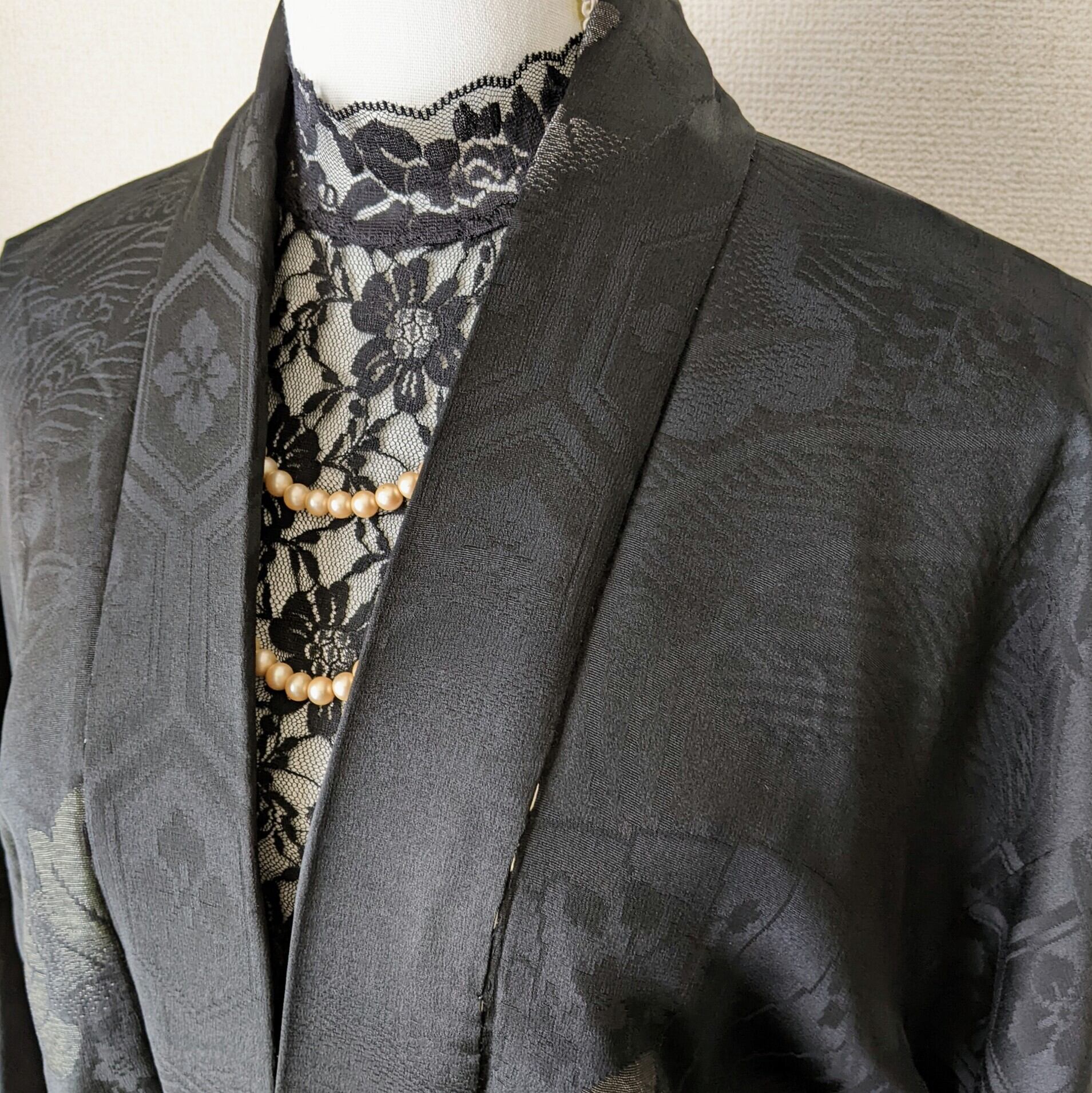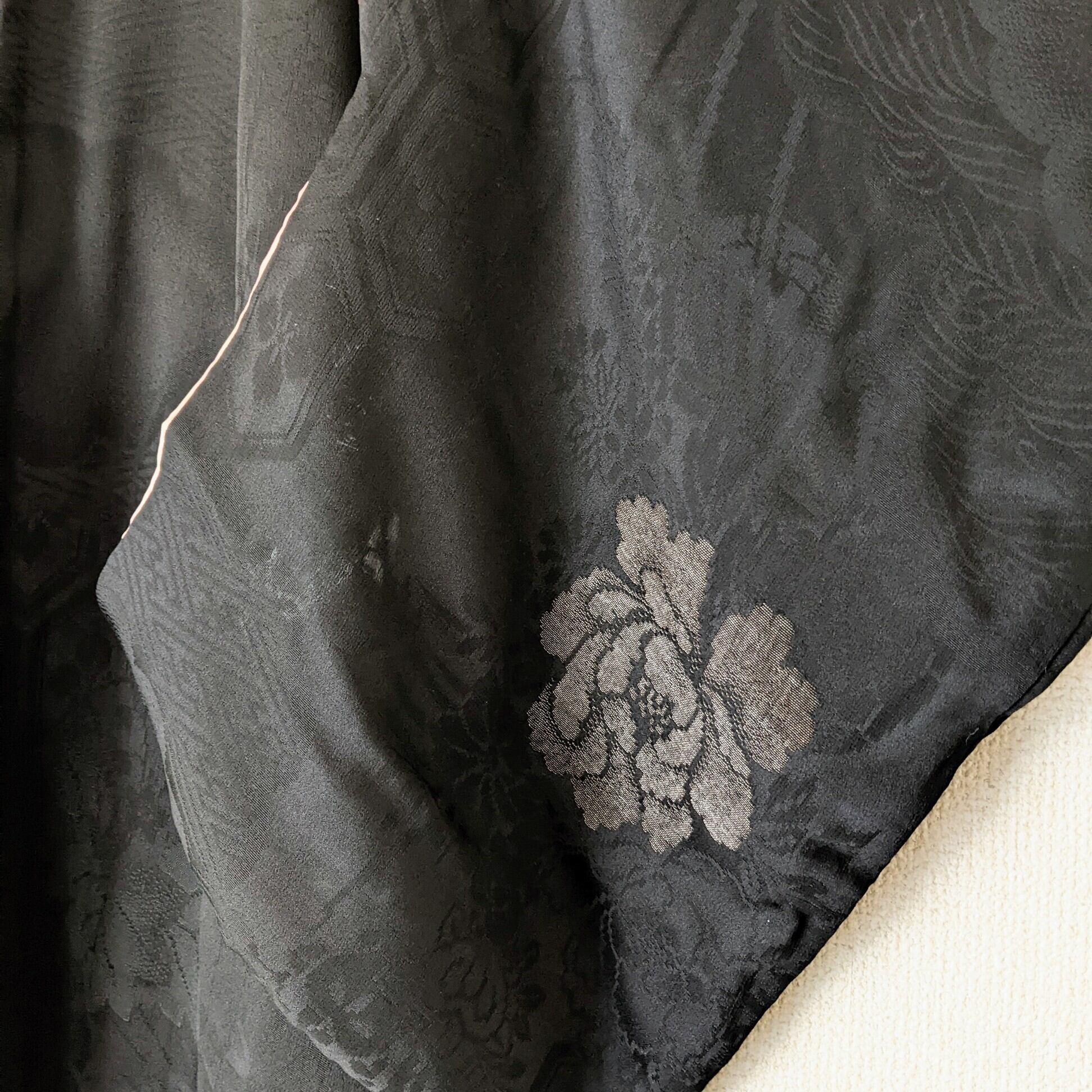 【Vintage】HAORI 長羽織 羽織 正絹 縮緬 黒羽織 芍薬柄 亀甲地紋入り シルク 大正浪漫 和洋折衷