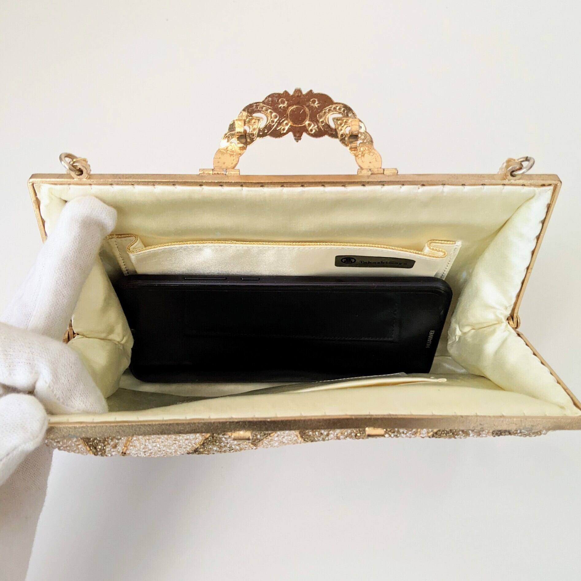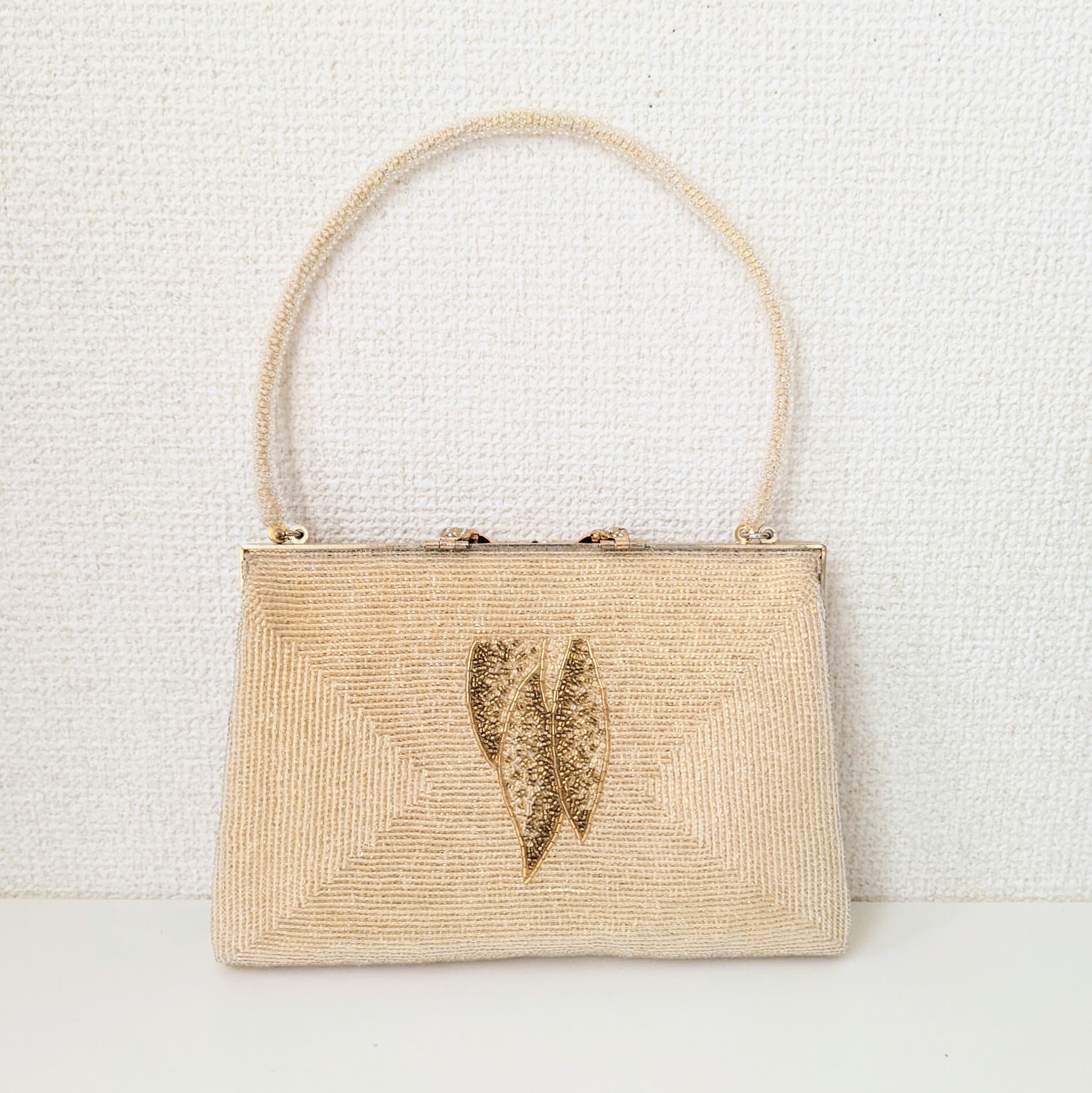 しっとりとした大人の雰囲気を感じさせる、ベージュゴールドの輝きが品よくゴージャスなビーズバッグ。和装洋装問わずフォーマルな場に相応しい佇まいです。