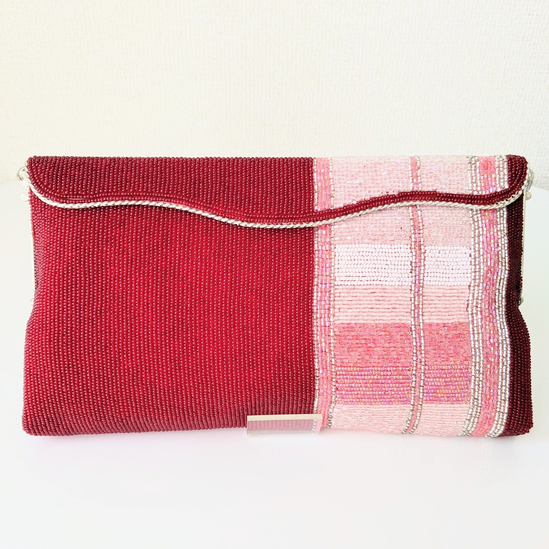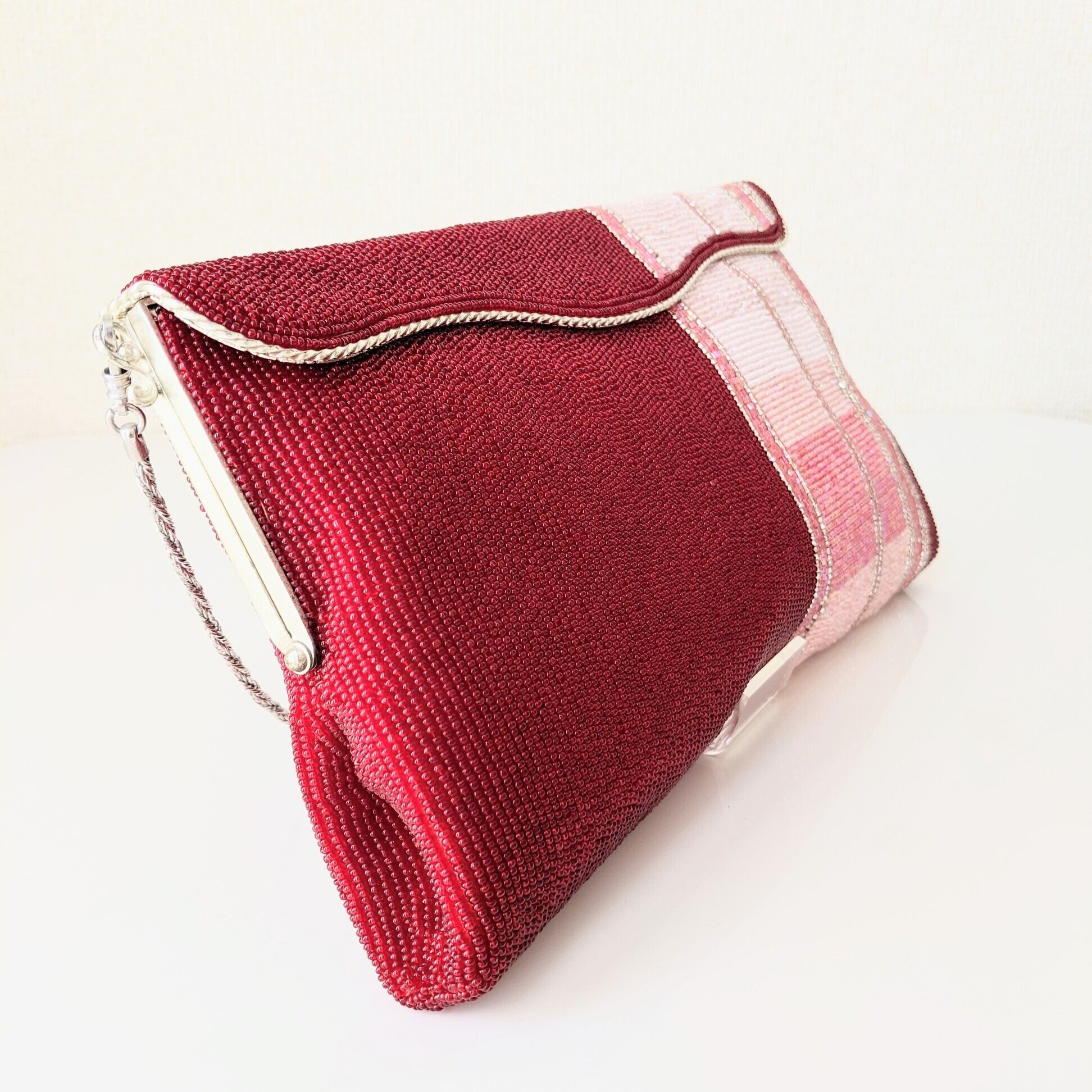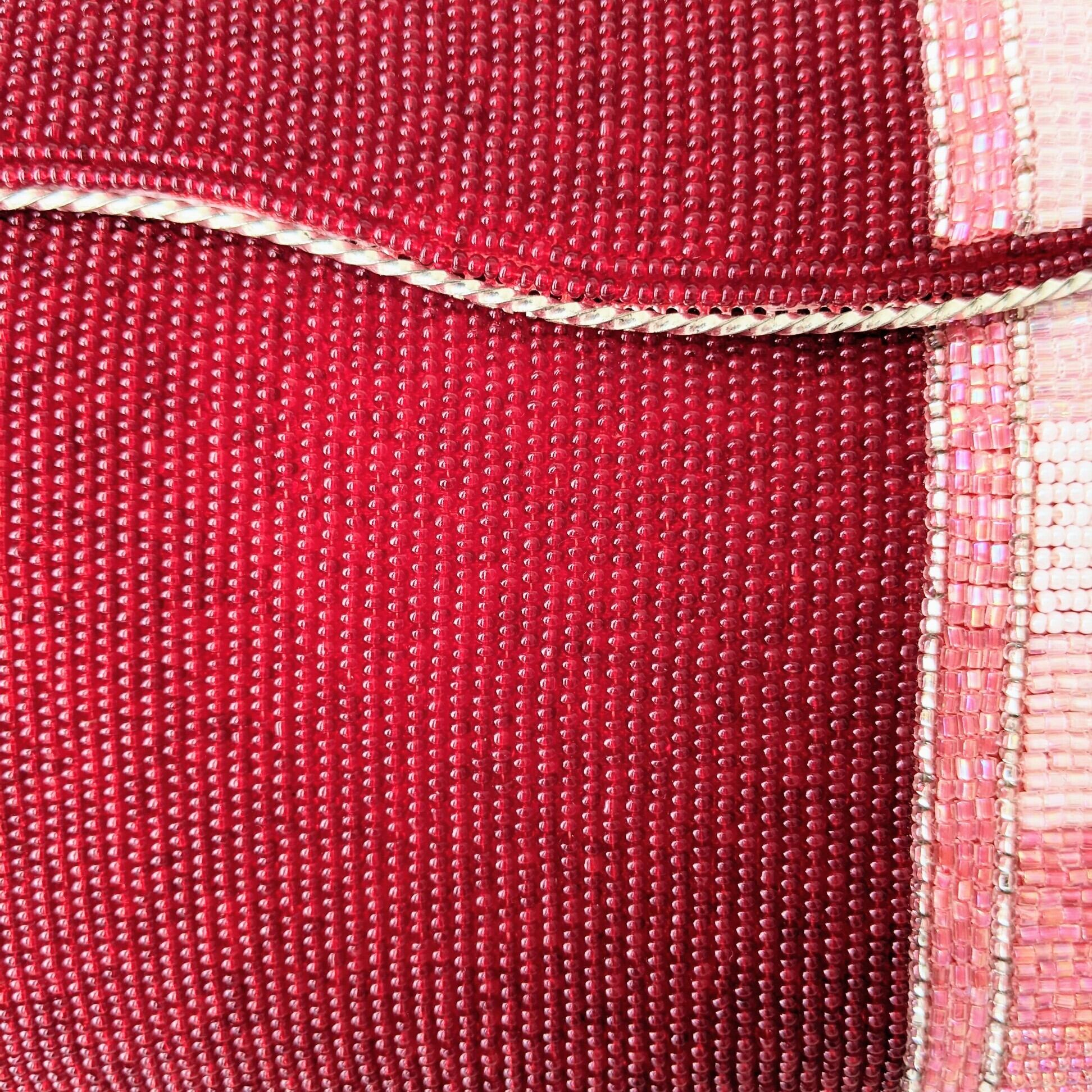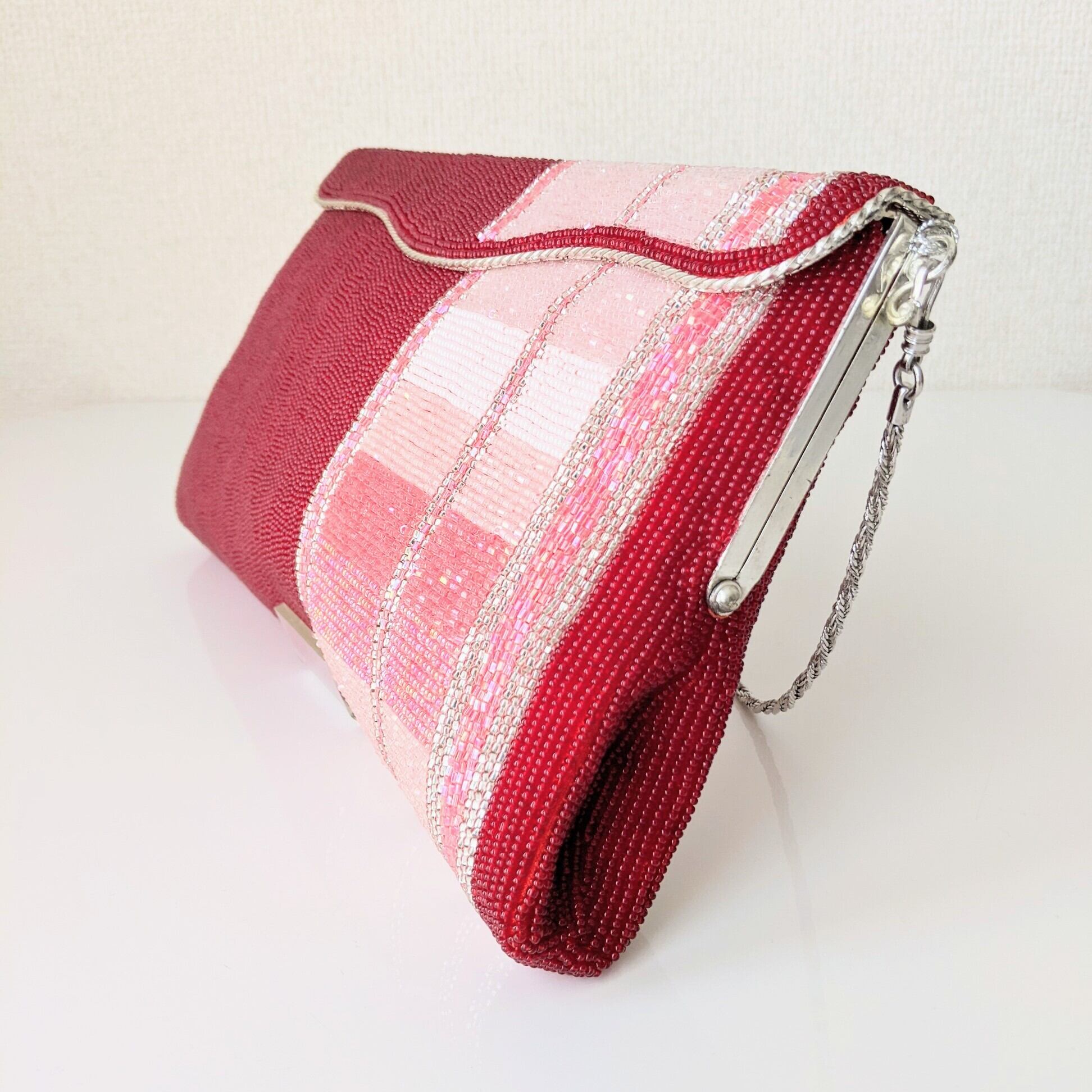 落ち着いた濃い赤に、ピンク系の縞模様が入ったビーズバッグです。