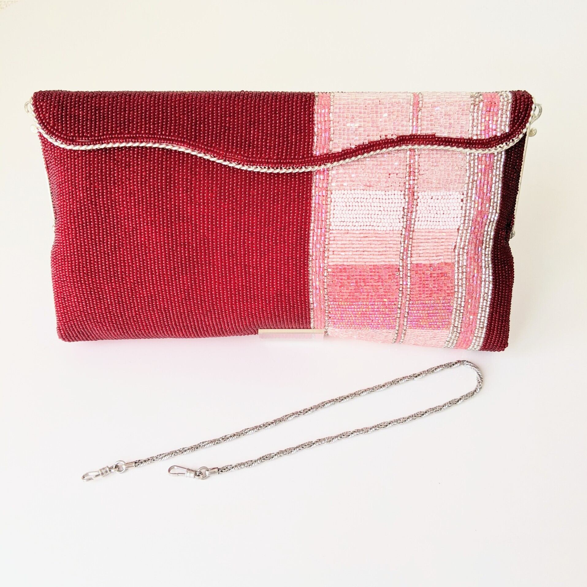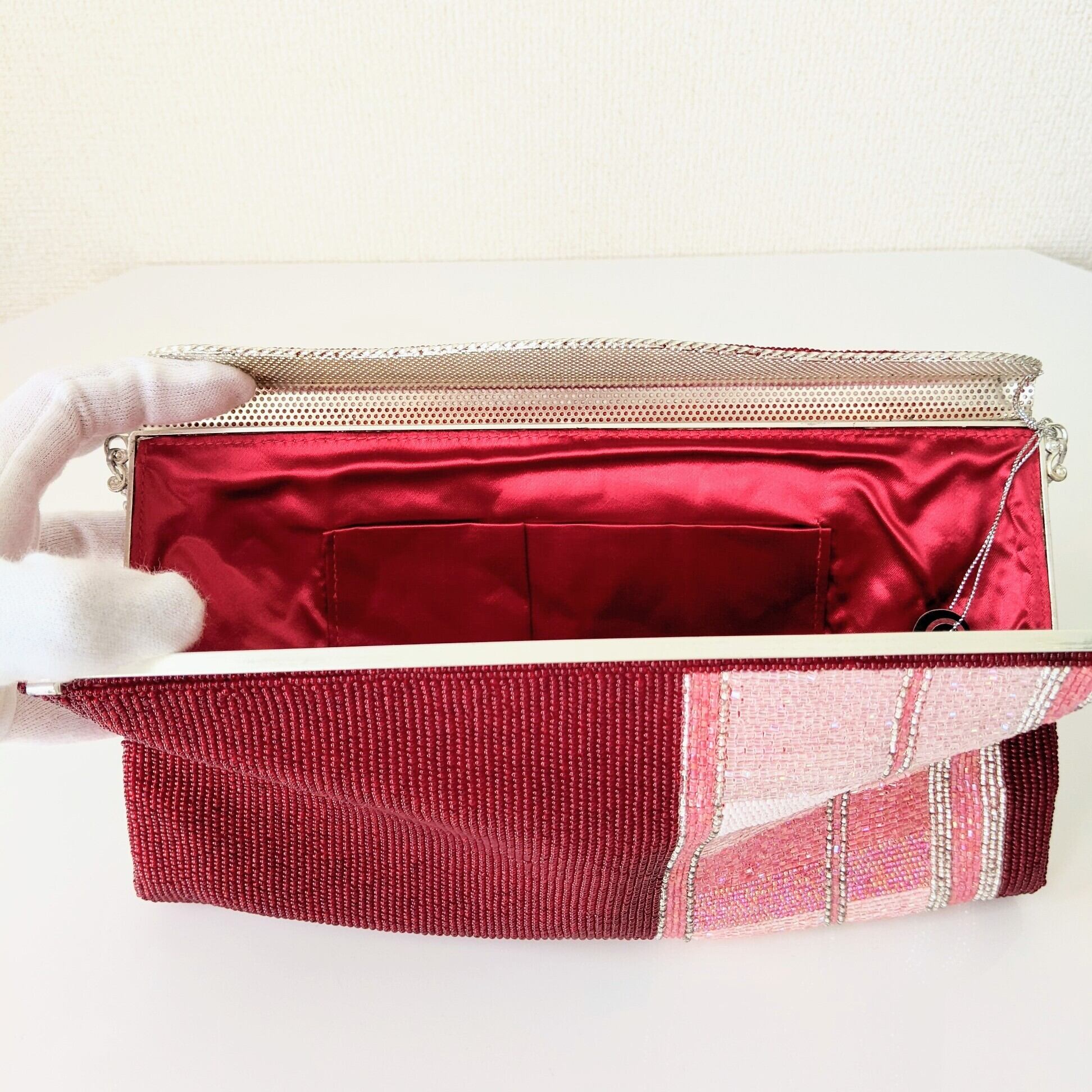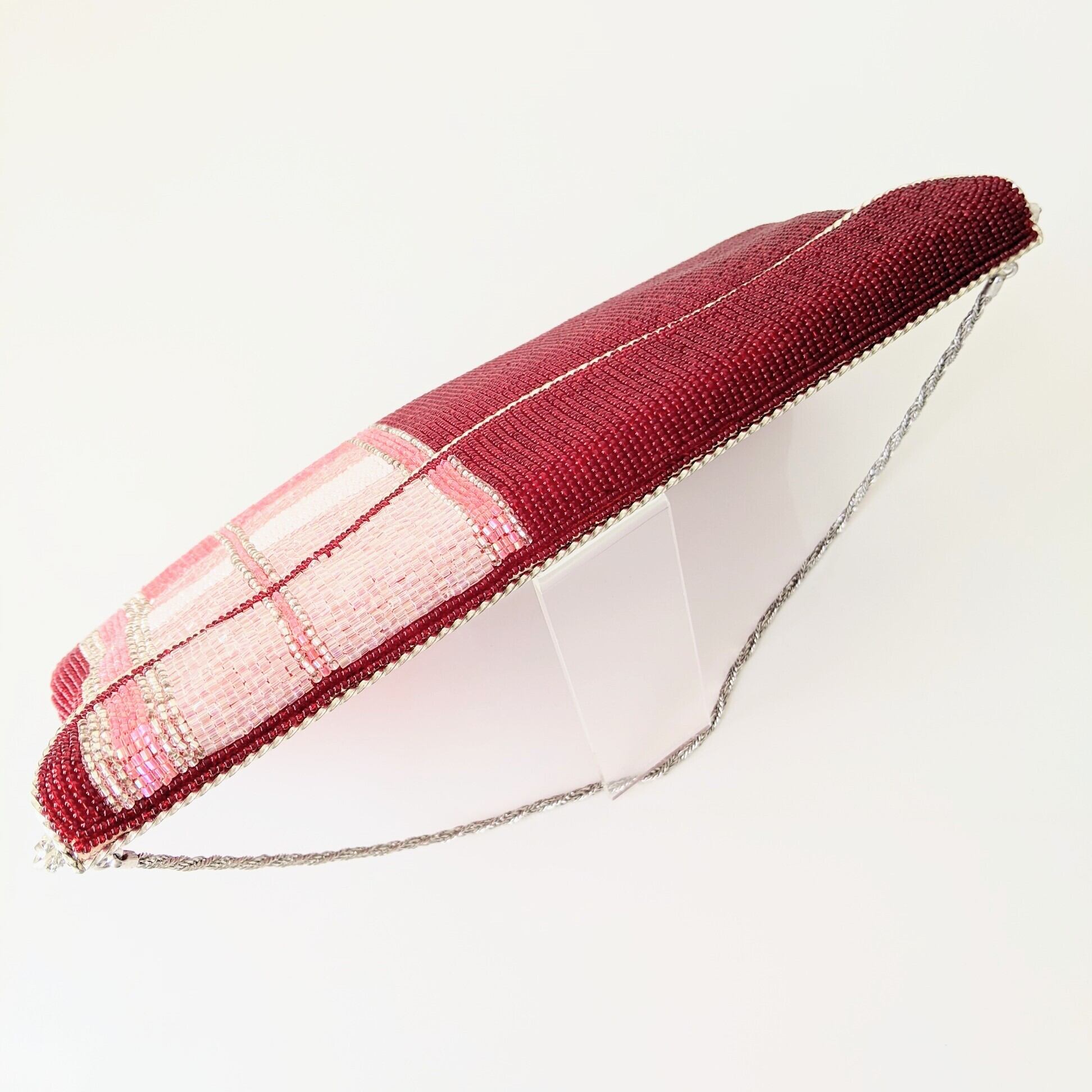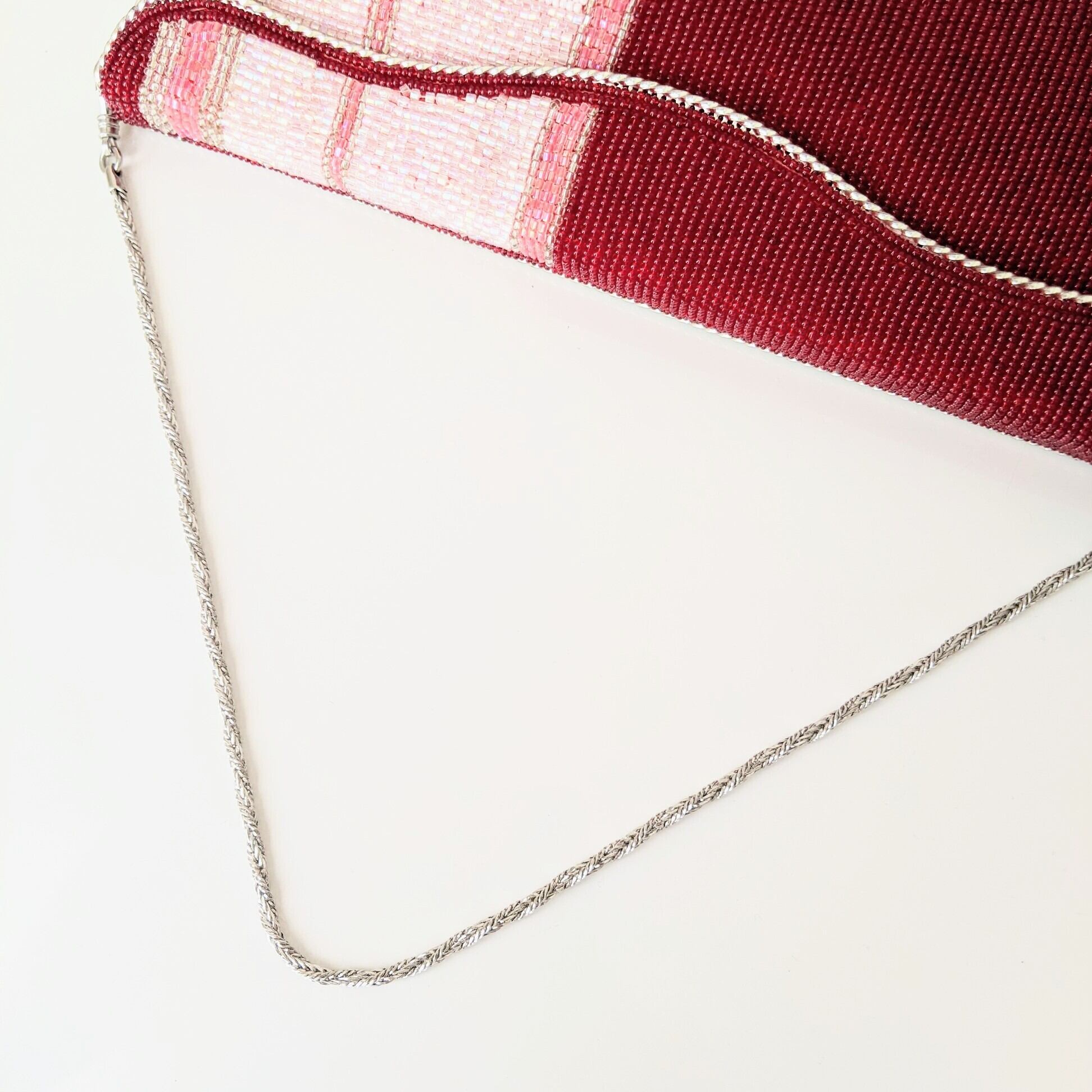 落ち着いた濃い赤に、ピンク系の縞模様が入ったビーズバッグです。