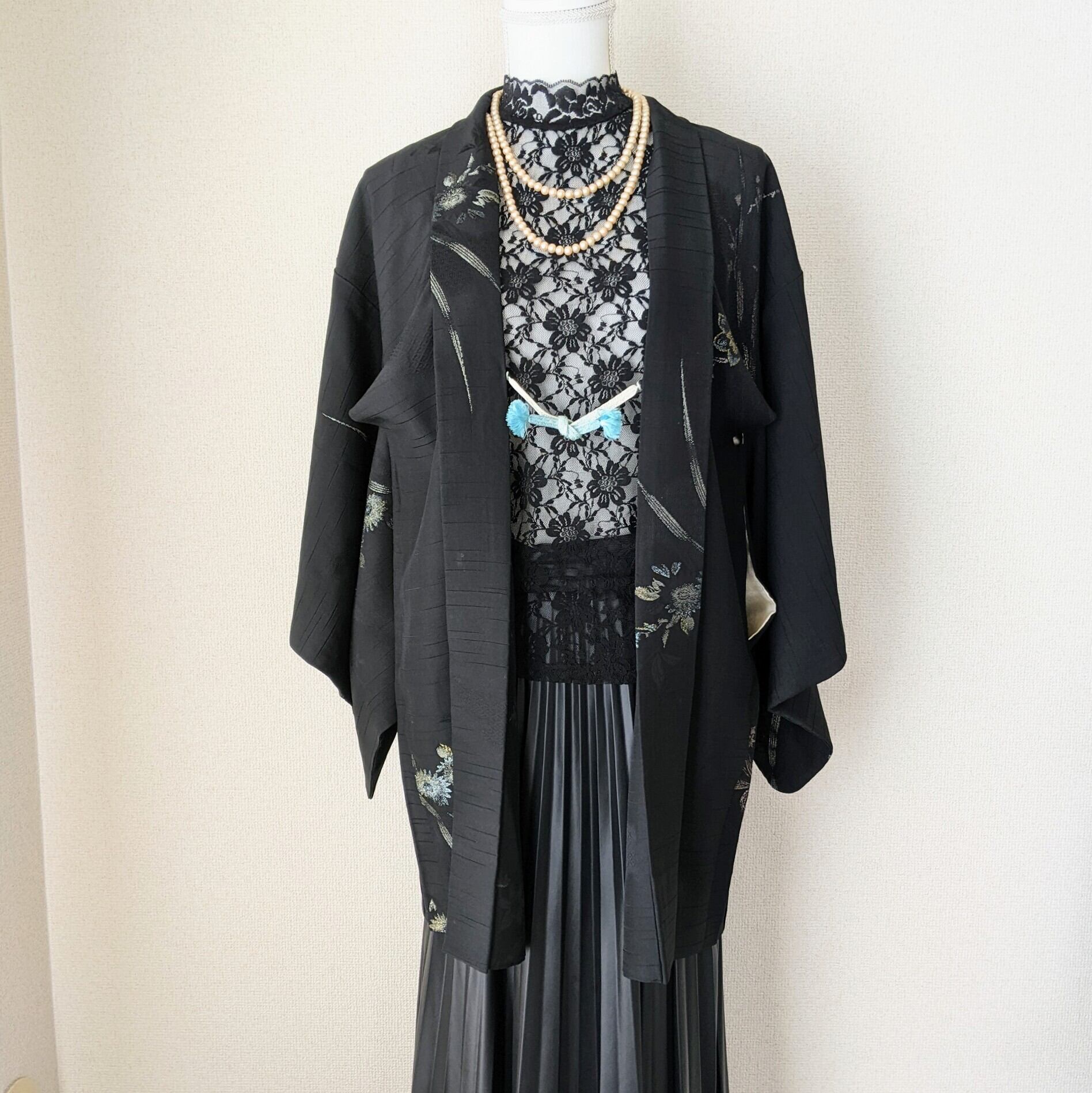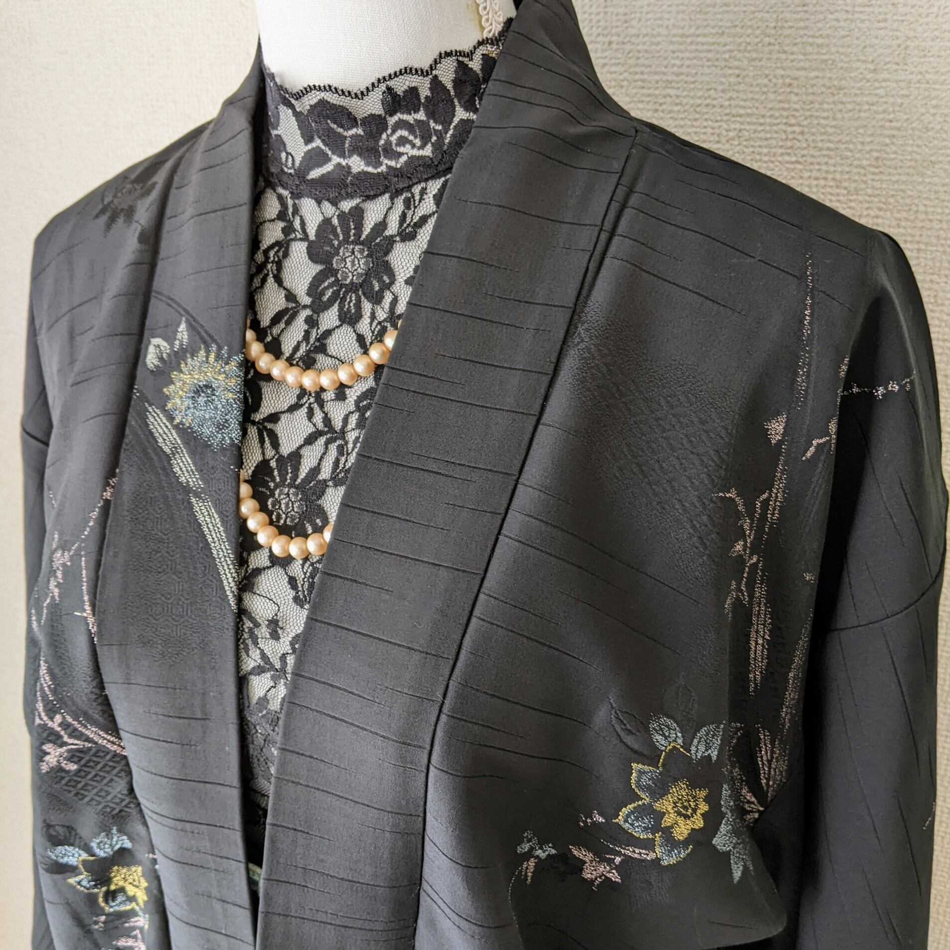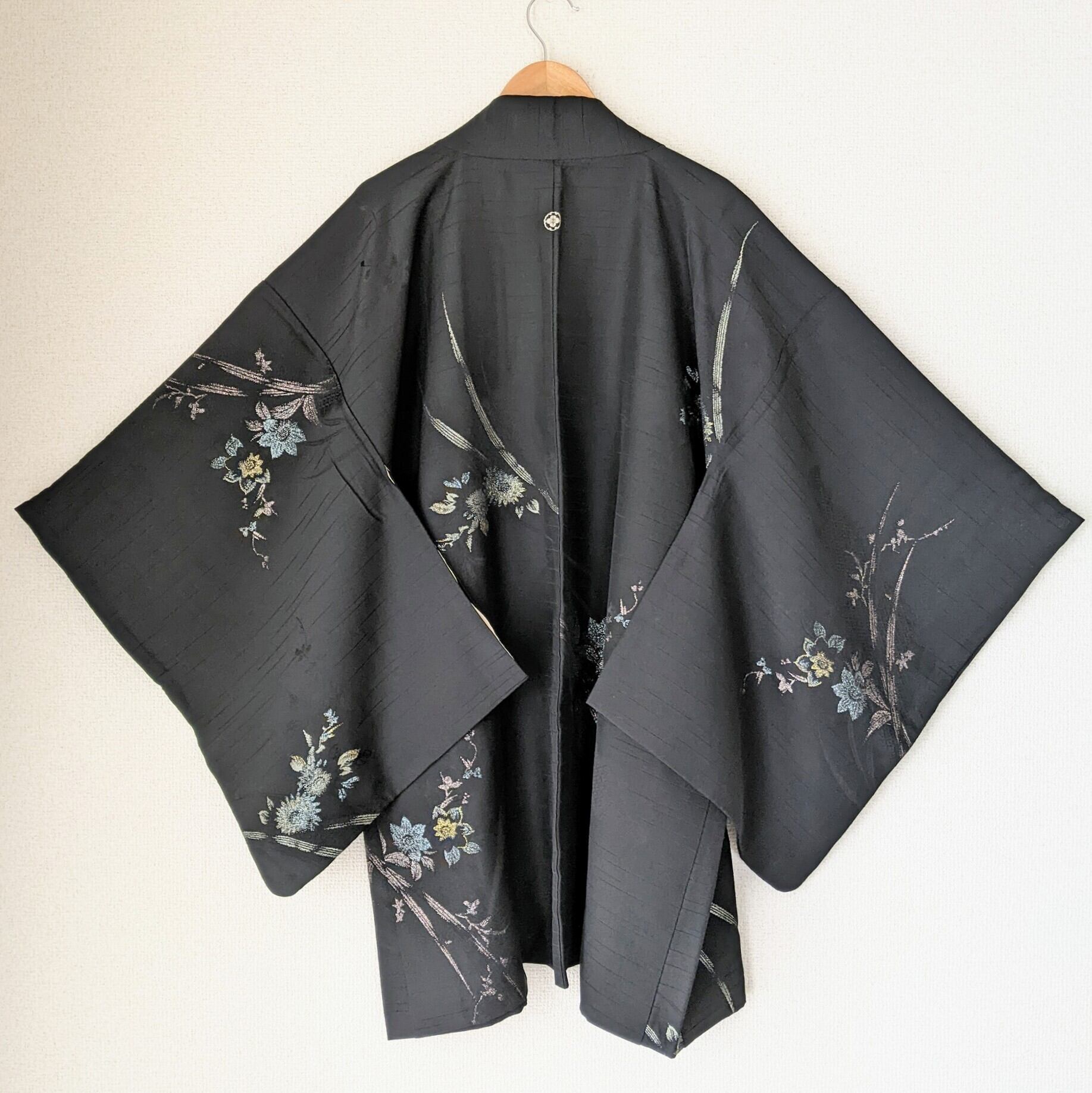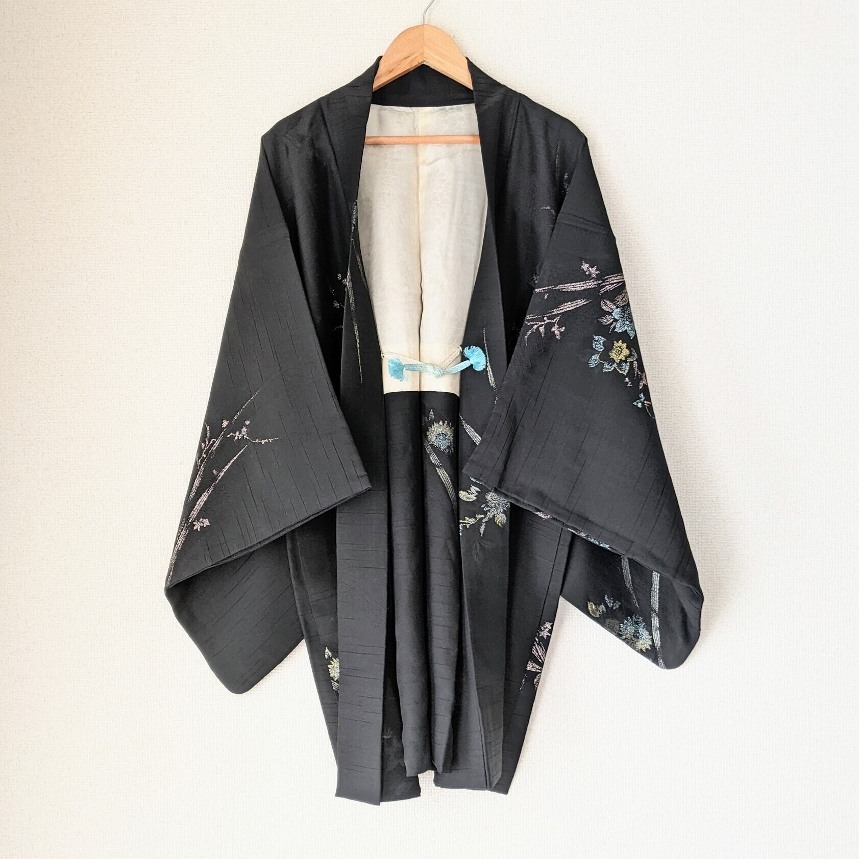 【Vintage】HAORI 長羽織 羽織 正絹 縮緬 黒 金糸銀糸 桔梗柄 一つ紋 シルク 大正浪漫 和洋折衷