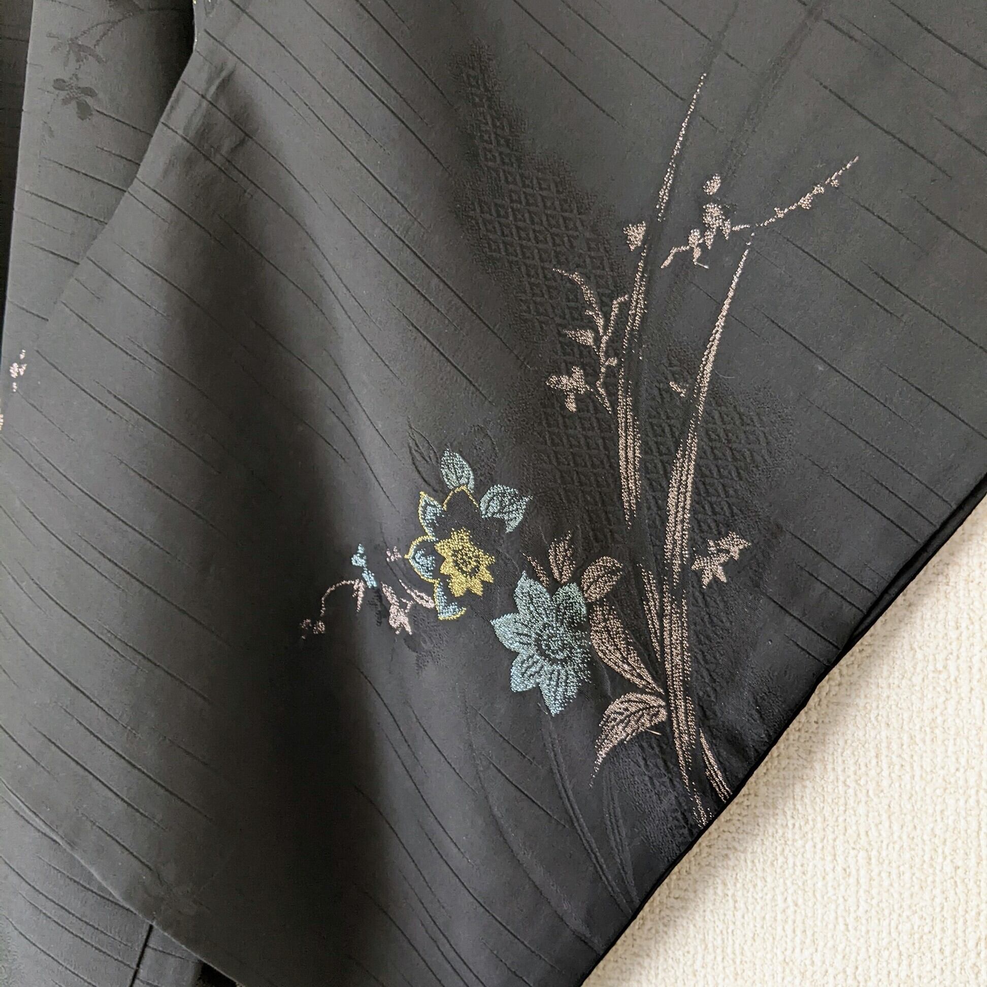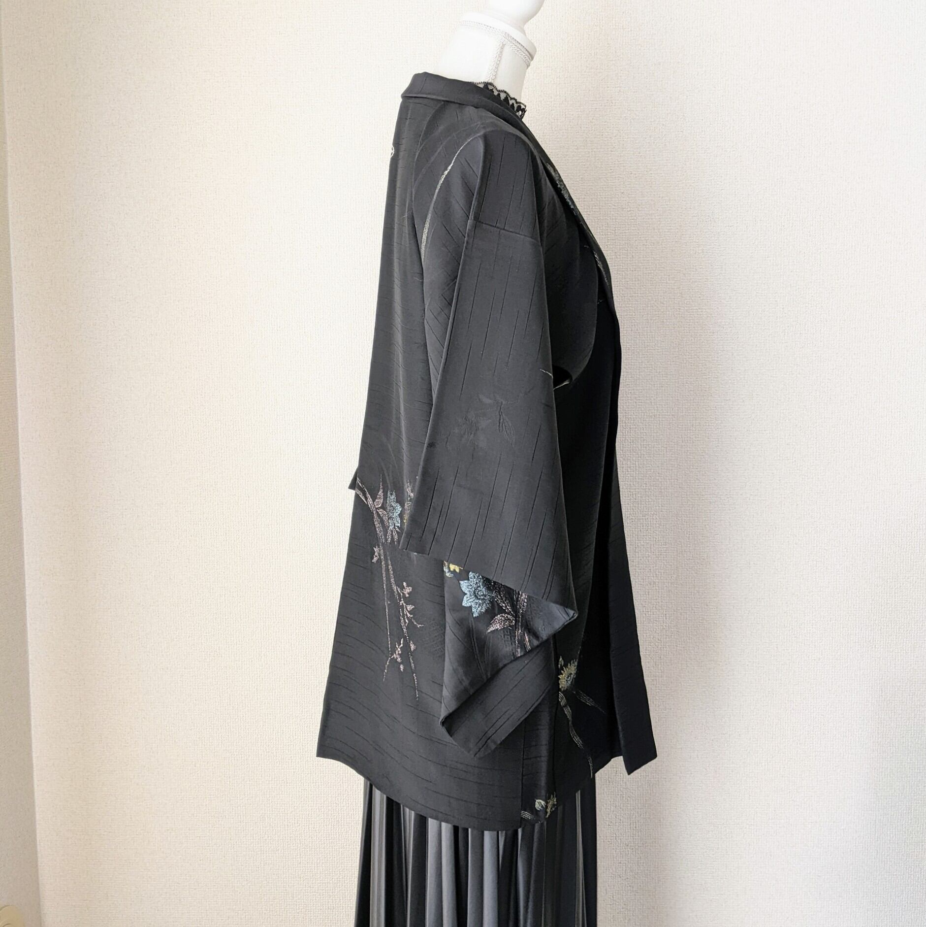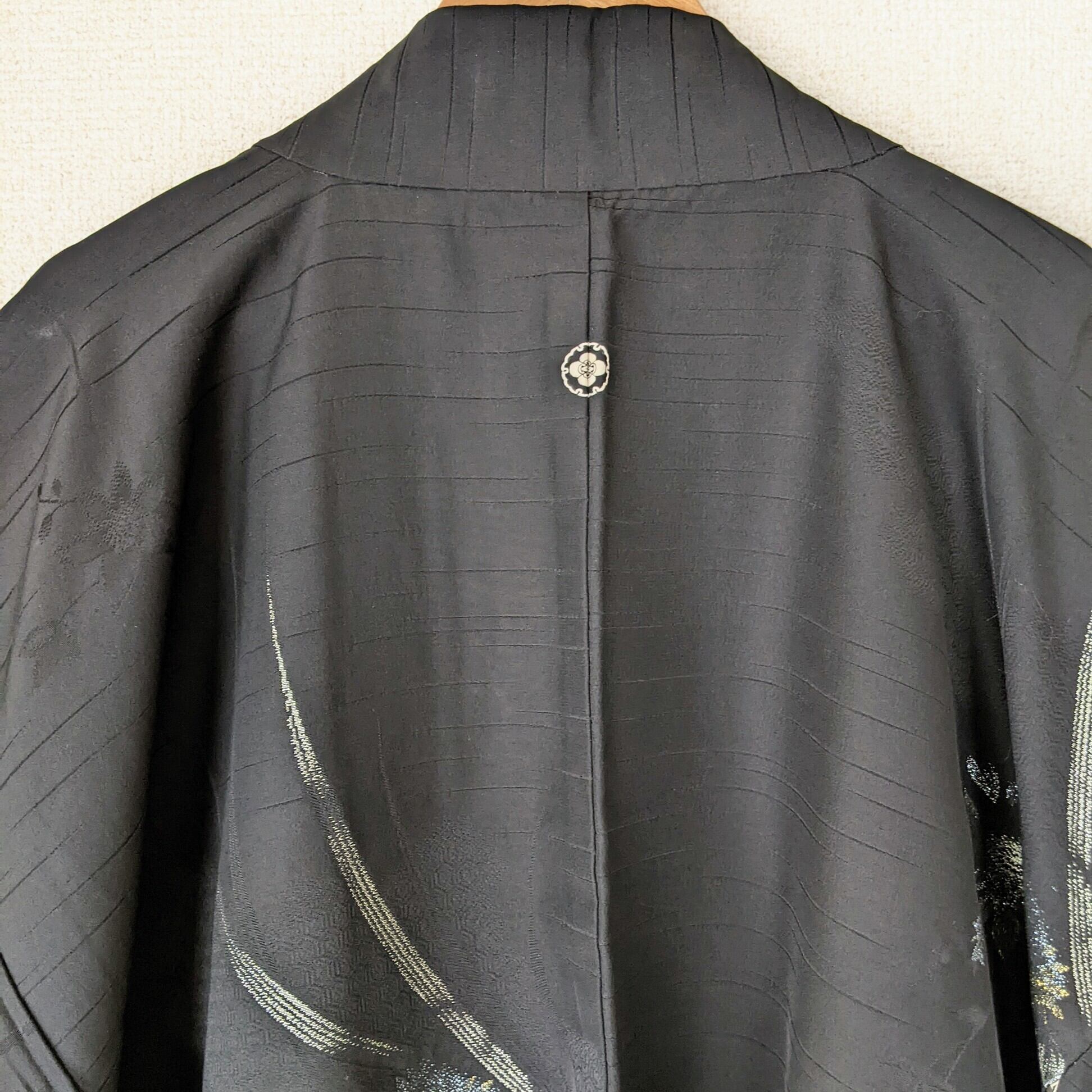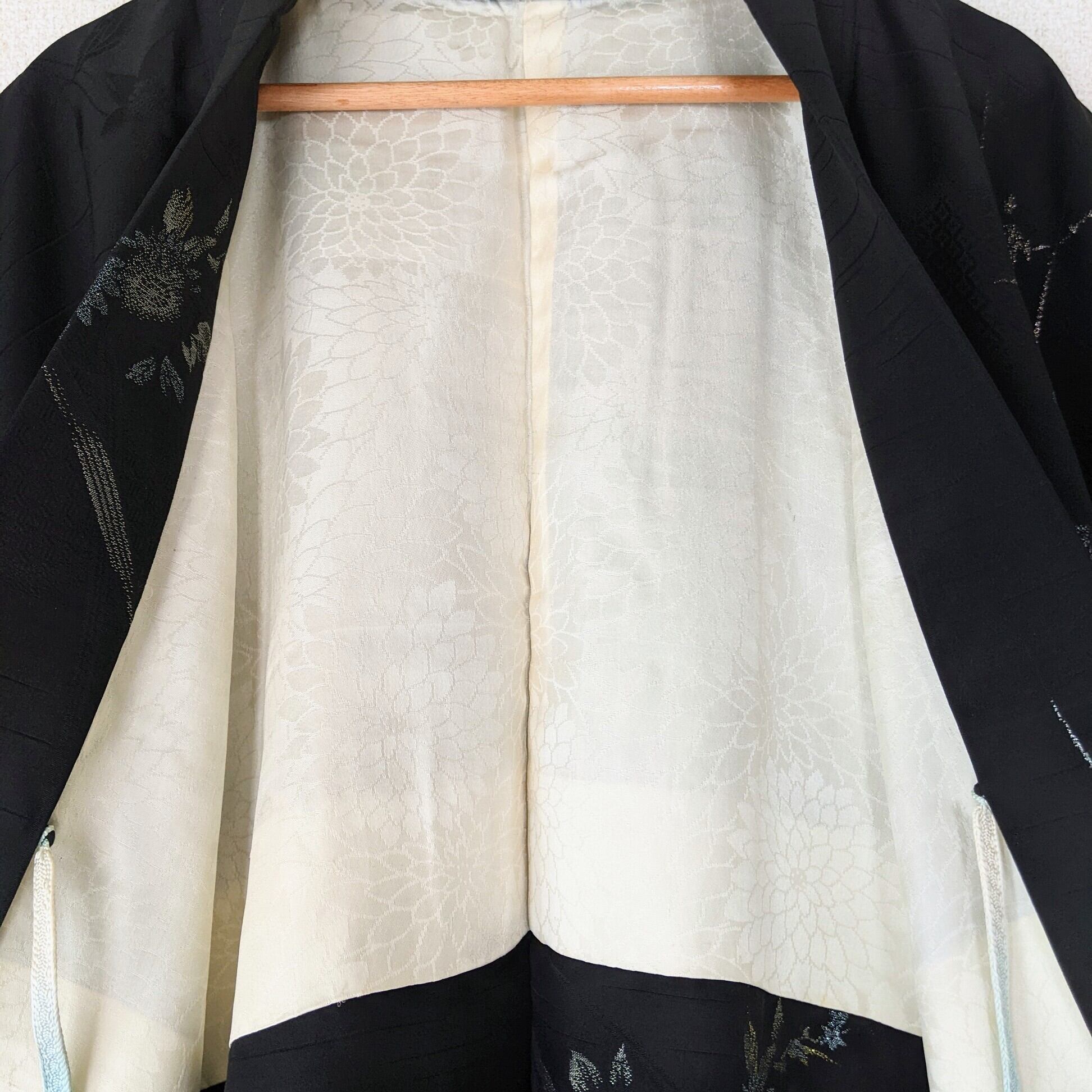 【Vintage】HAORI 長羽織 羽織 正絹 縮緬 黒 金糸銀糸 桔梗柄 一つ紋 シルク 大正浪漫 和洋折衷