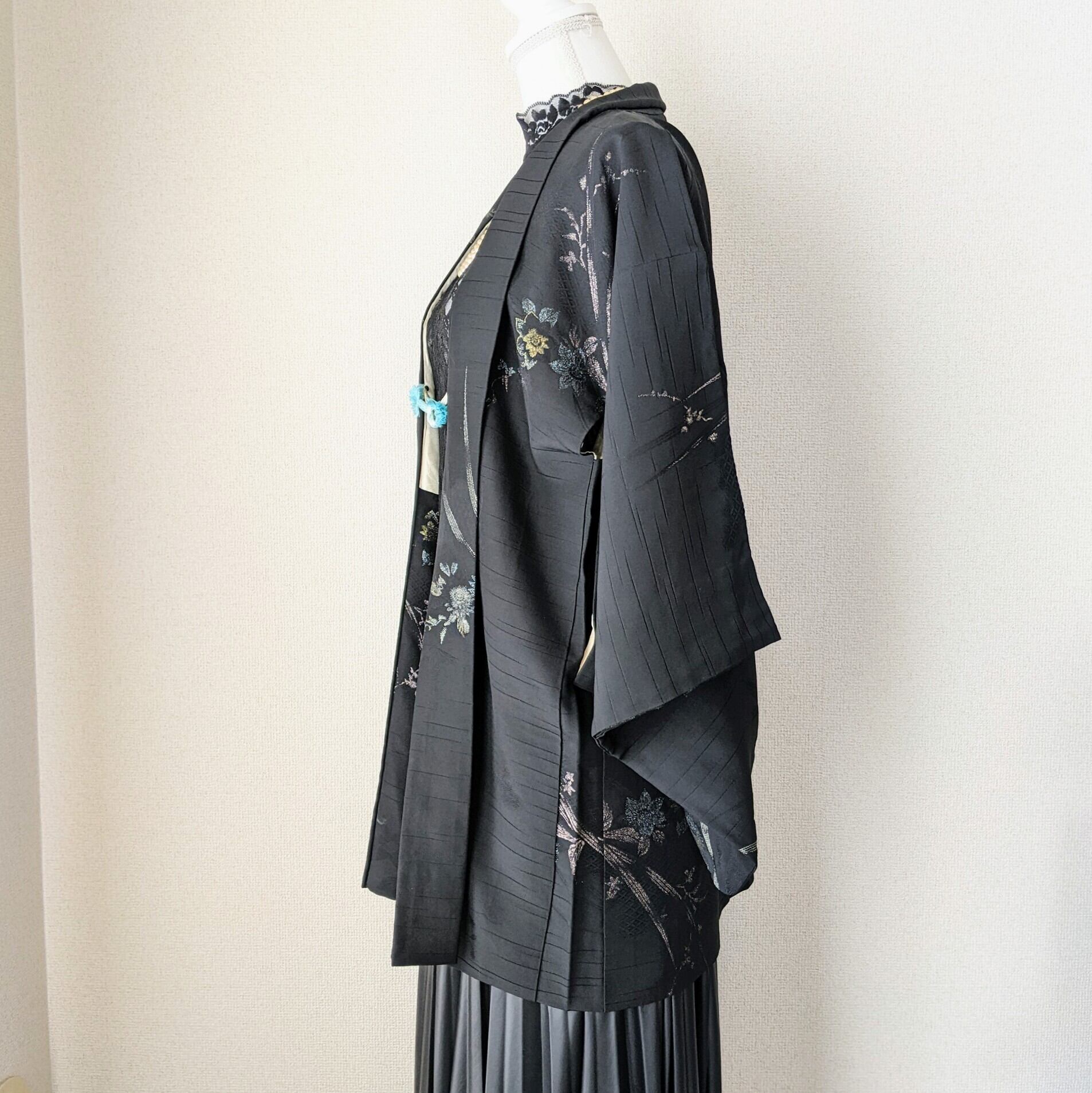 金糸銀糸で織られた桔梗の花模様が入った黒の長羽織です。柄の入り方がとてもエレガントです。