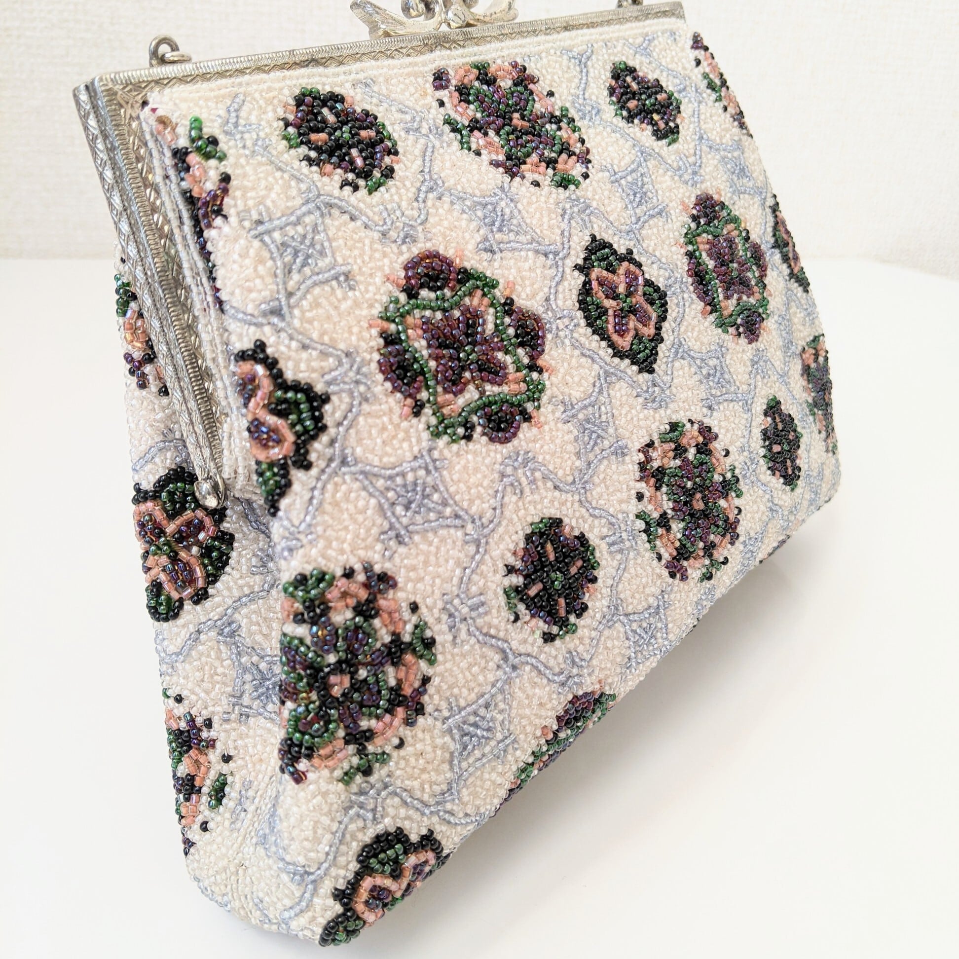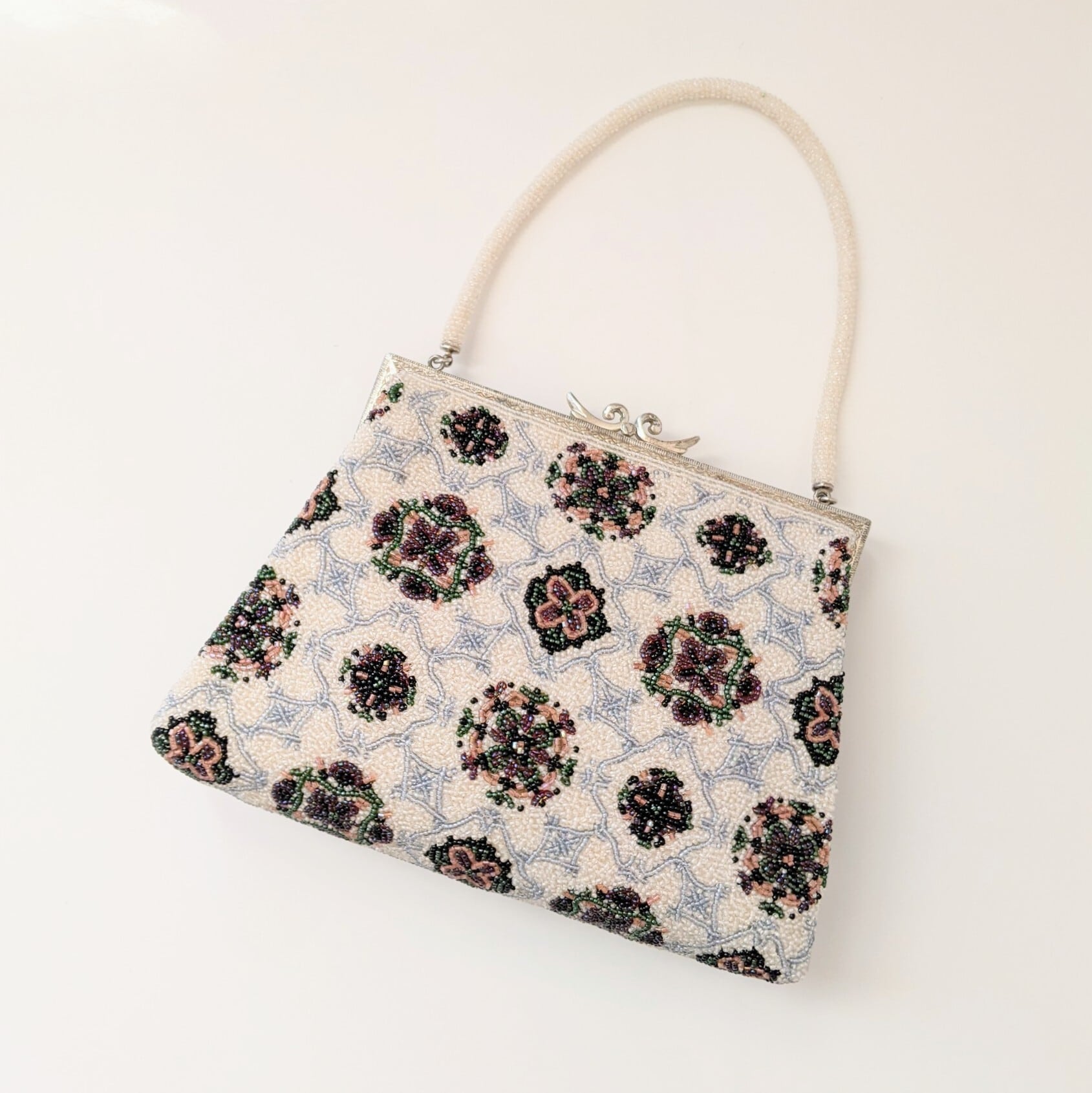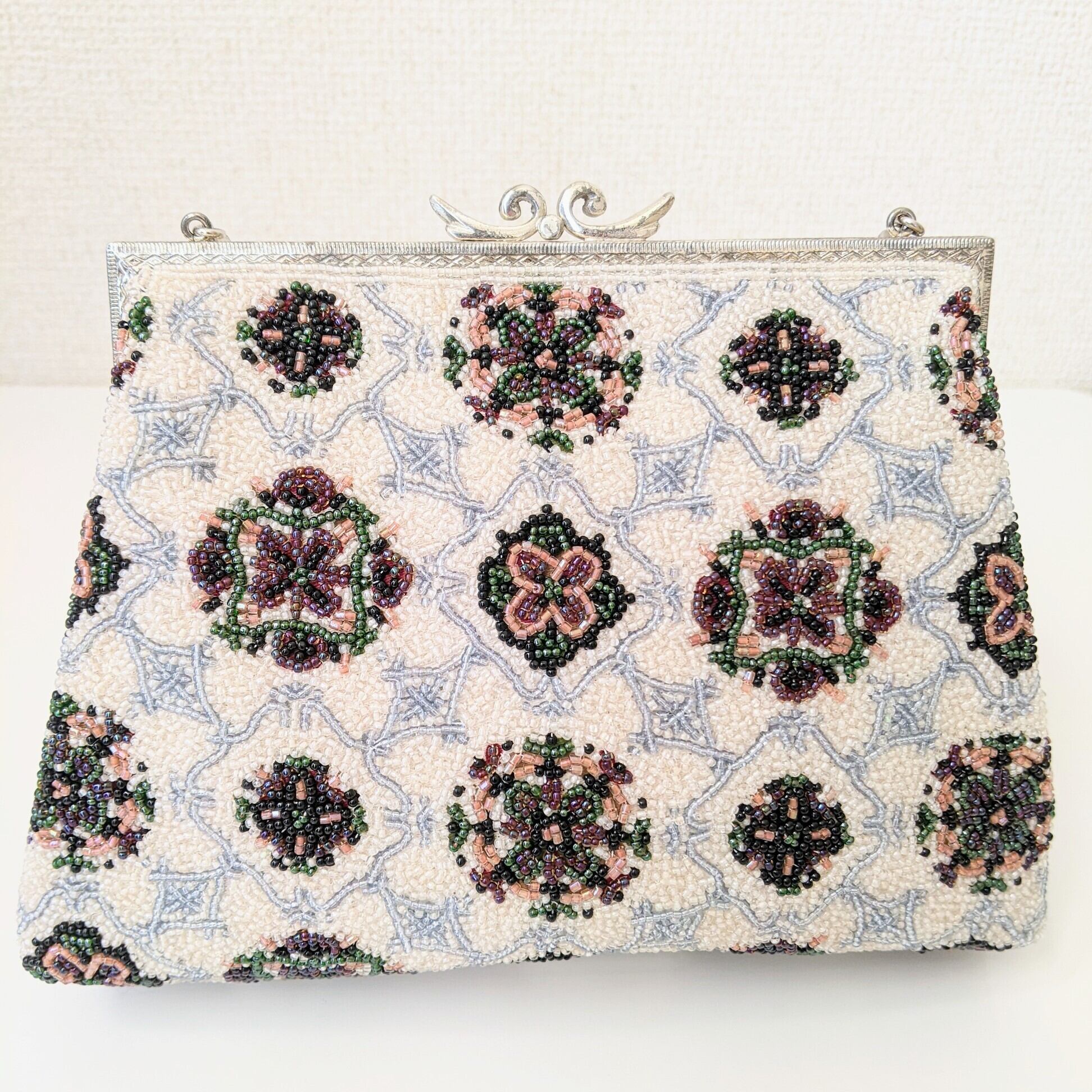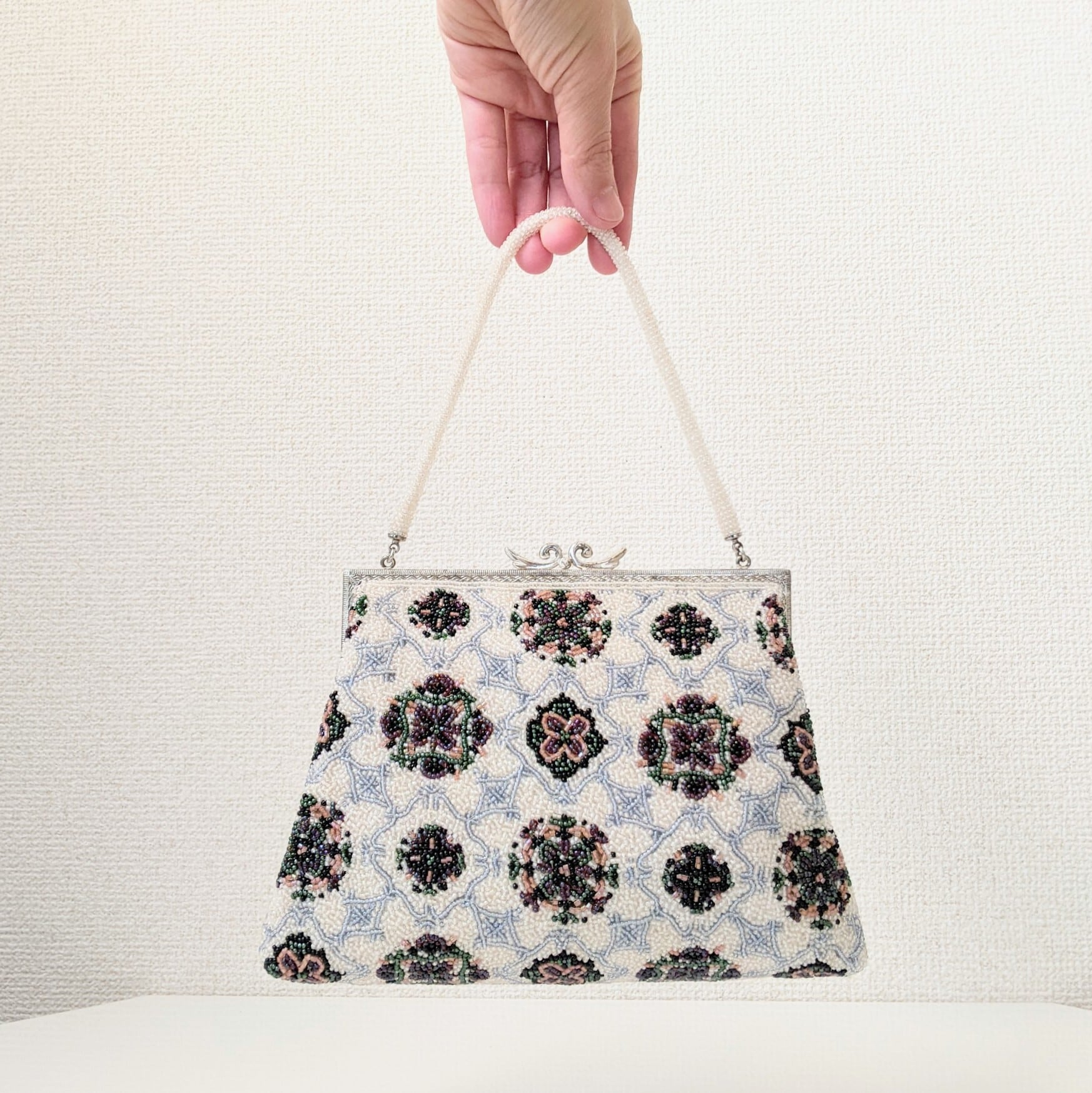 【Vintage】ビーズ刺繍バッグ Vintage Beaded Bag WAKO 白 マジョリカタイル風 パーティーバッグ 昭和レトロ 大正浪漫 フォーマルバッグ