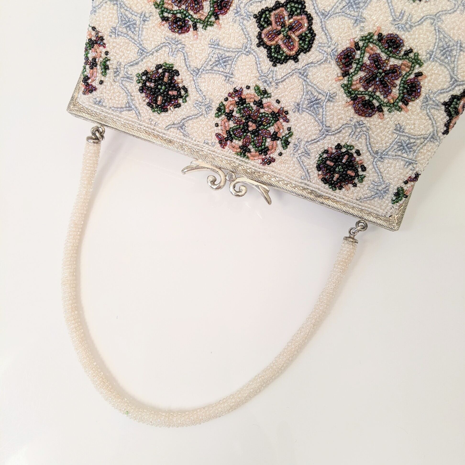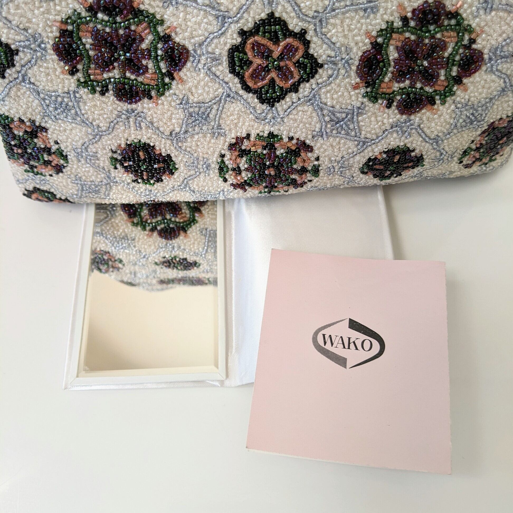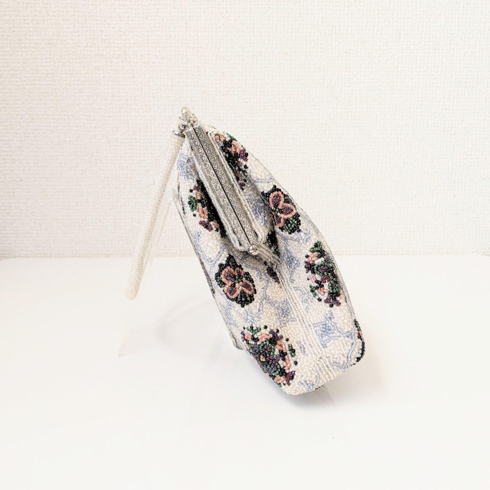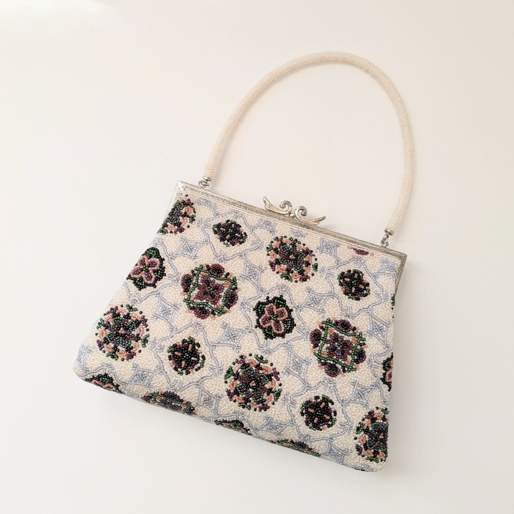 【Vintage】ビーズ刺繍バッグ Vintage Beaded Bag WAKO 白 マジョリカタイル風 パーティーバッグ 昭和レトロ 大正浪漫 フォーマルバッグ