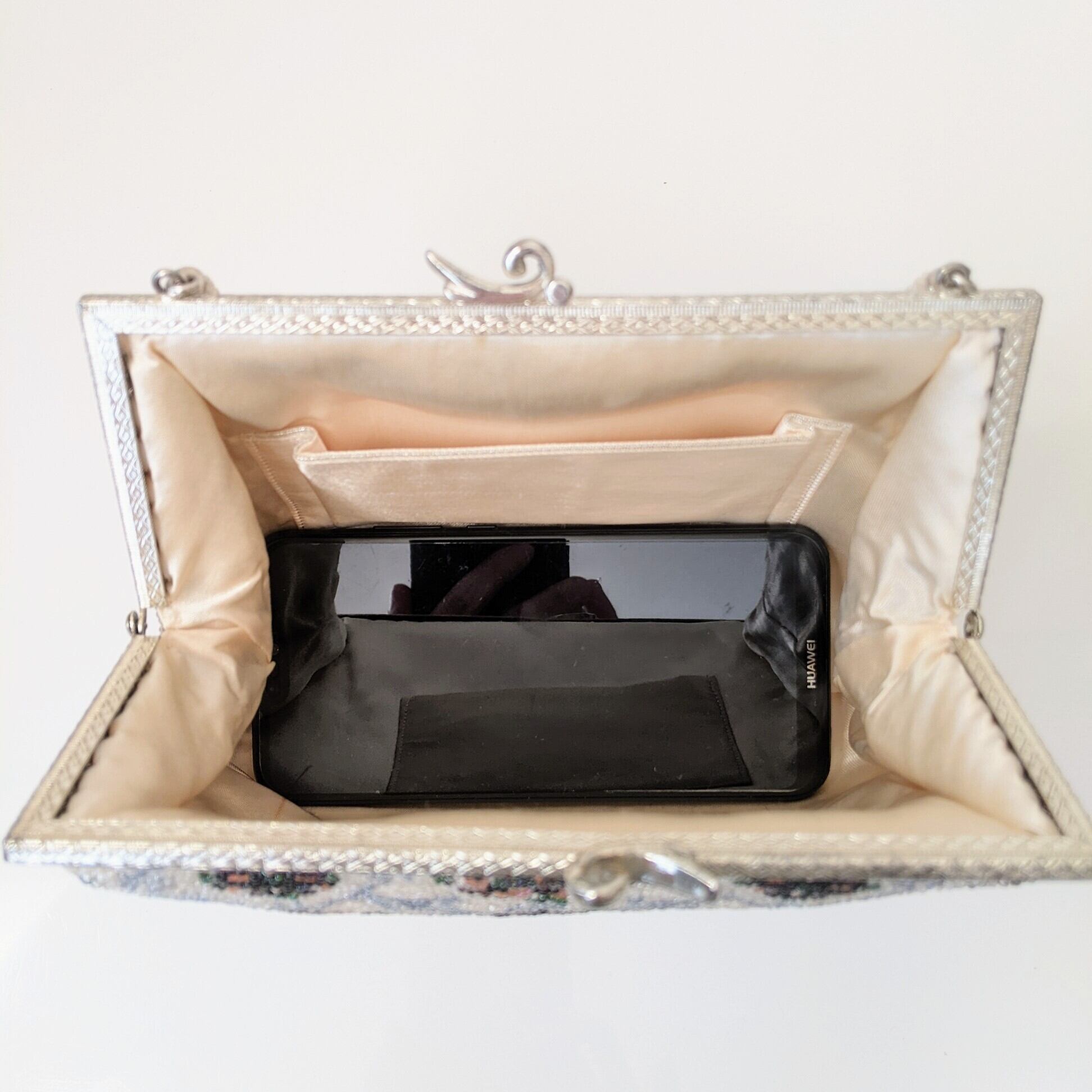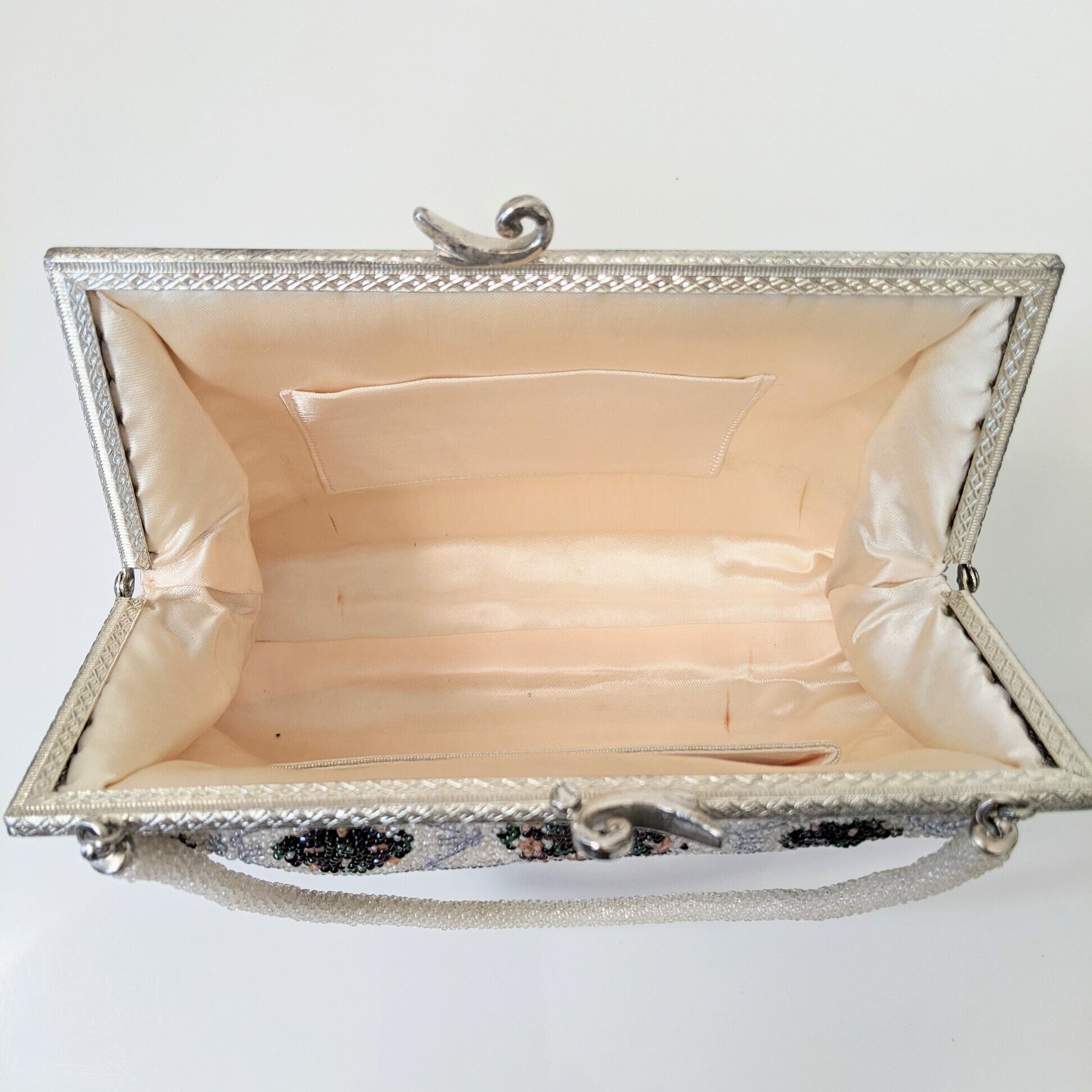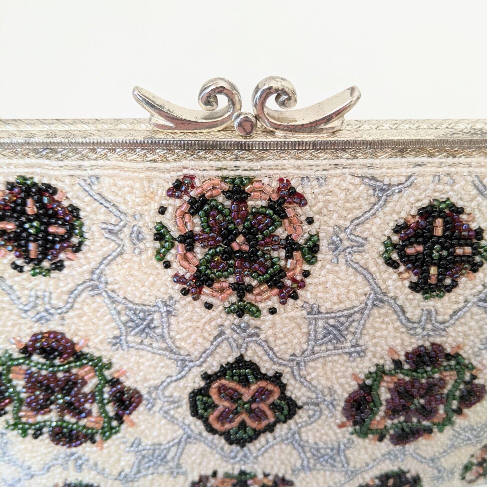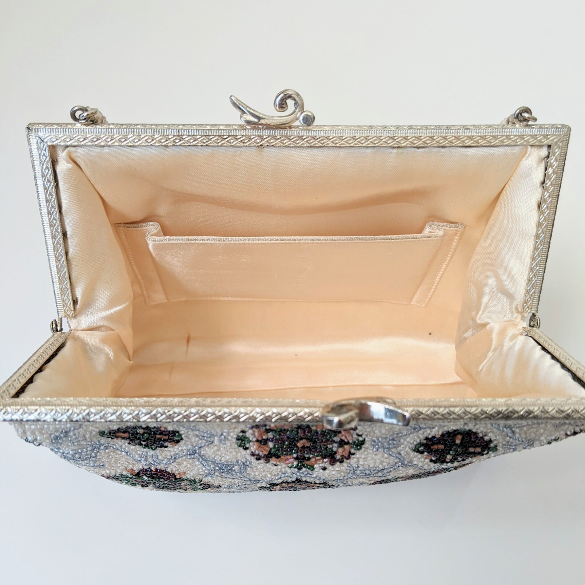 【Vintage】ビーズ刺繍バッグ Vintage Beaded Bag WAKO 白 マジョリカタイル風 パーティーバッグ 昭和レトロ 大正浪漫 フォーマルバッグ