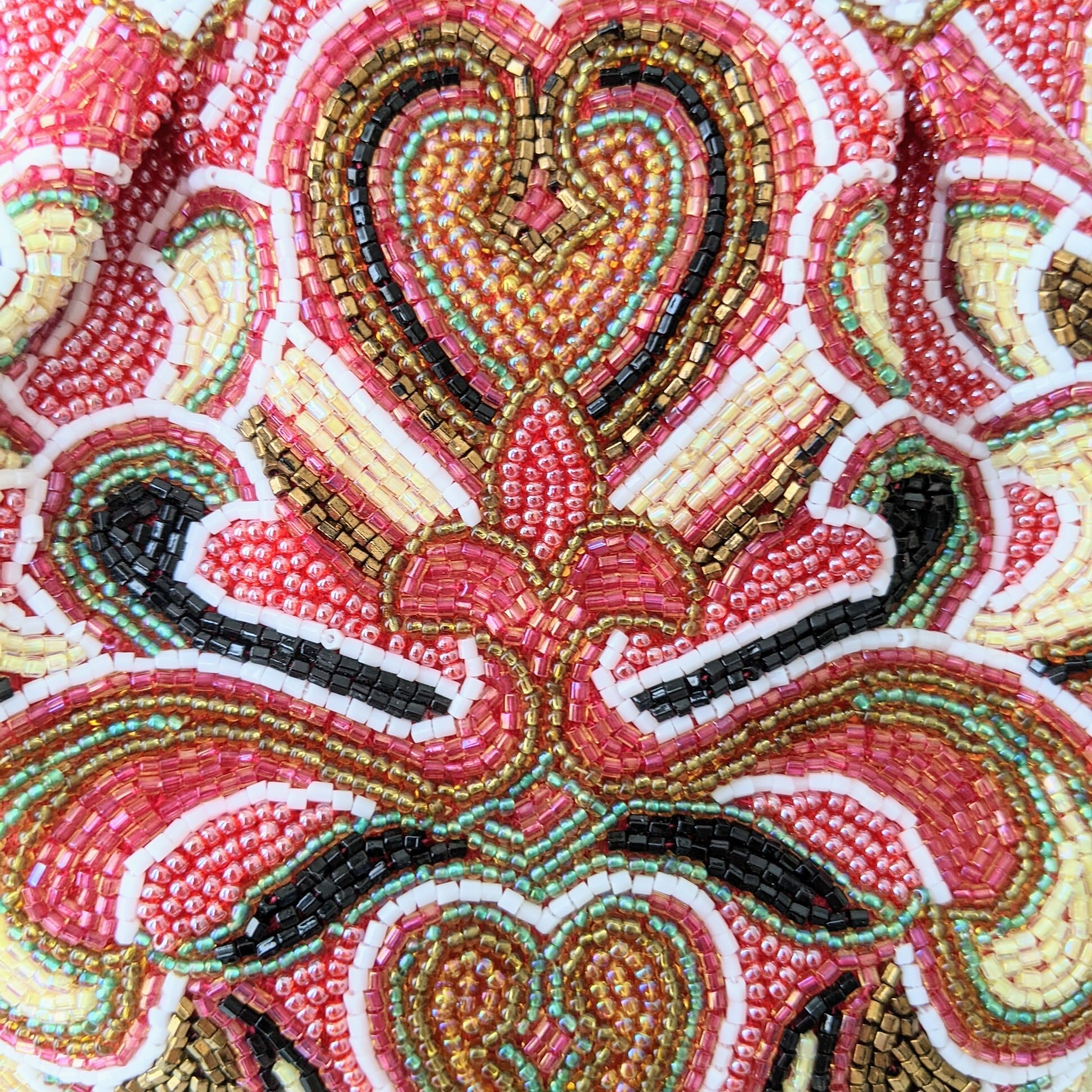 ビーズバッグの楽しみは、何と言っても手編みのビーズ刺繍。職人が一つ一つ丁寧に手作業で編み上げた、贅沢で美しいディテールです。
