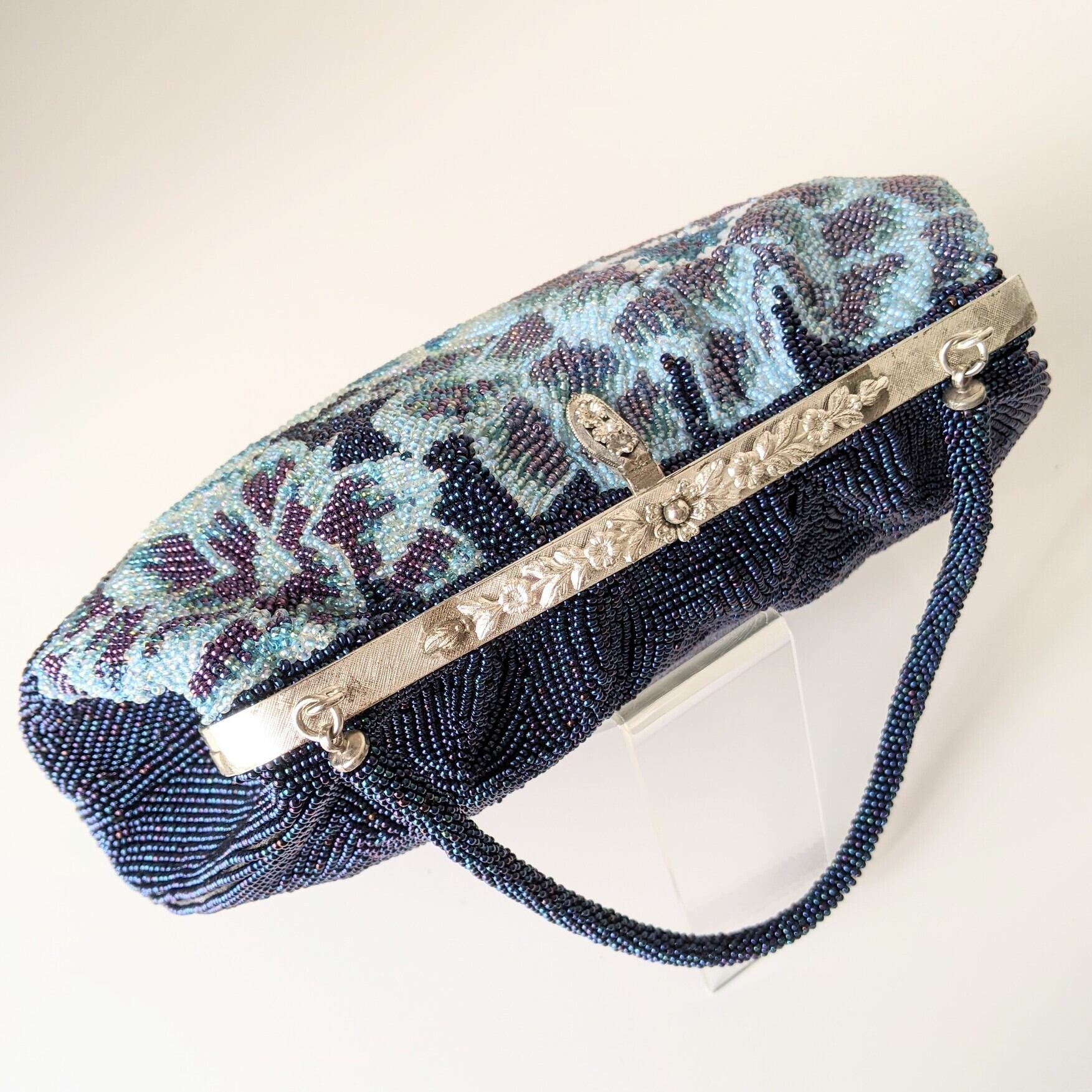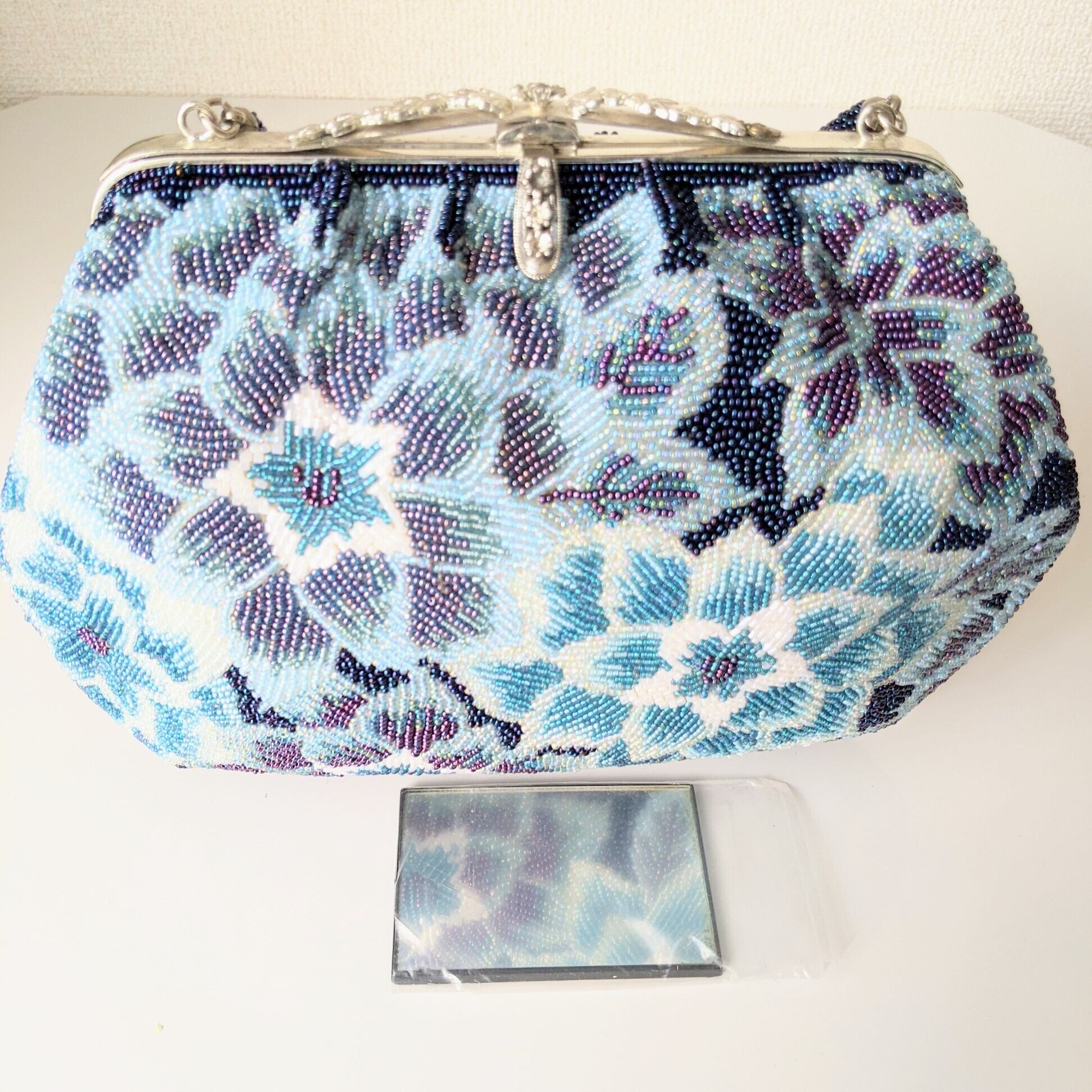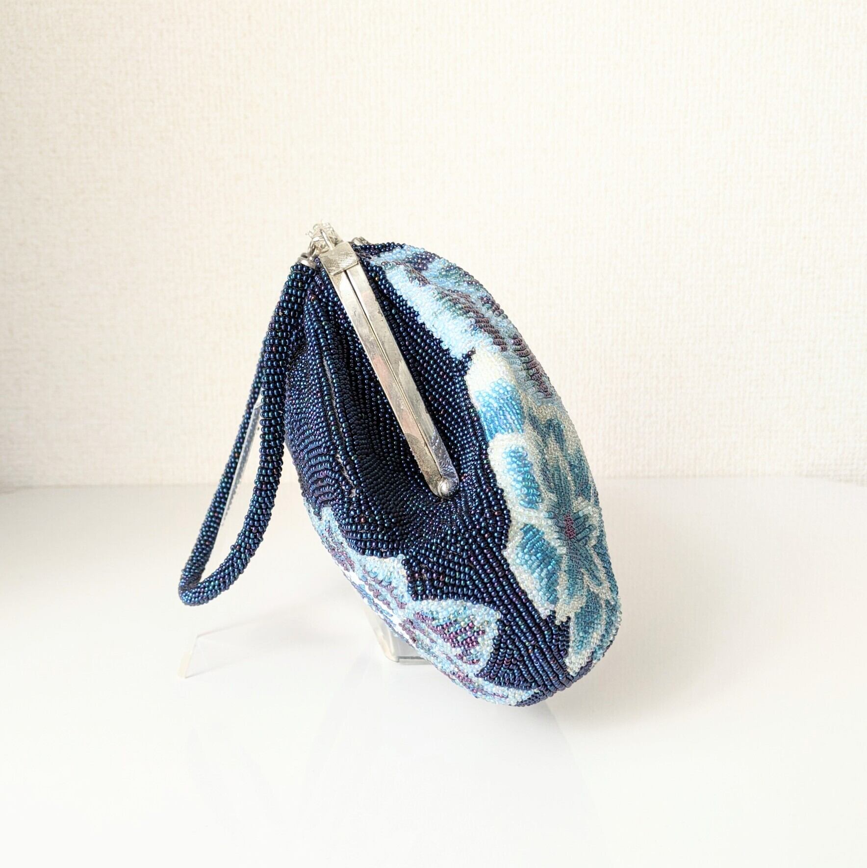 【Vintage】ビーズ刺繍バッグ Vintage Beaded Bag 青系 ダリア 花柄 パーティーバッグ 昭和レトロ 大正浪漫 フォーマルバッグ
