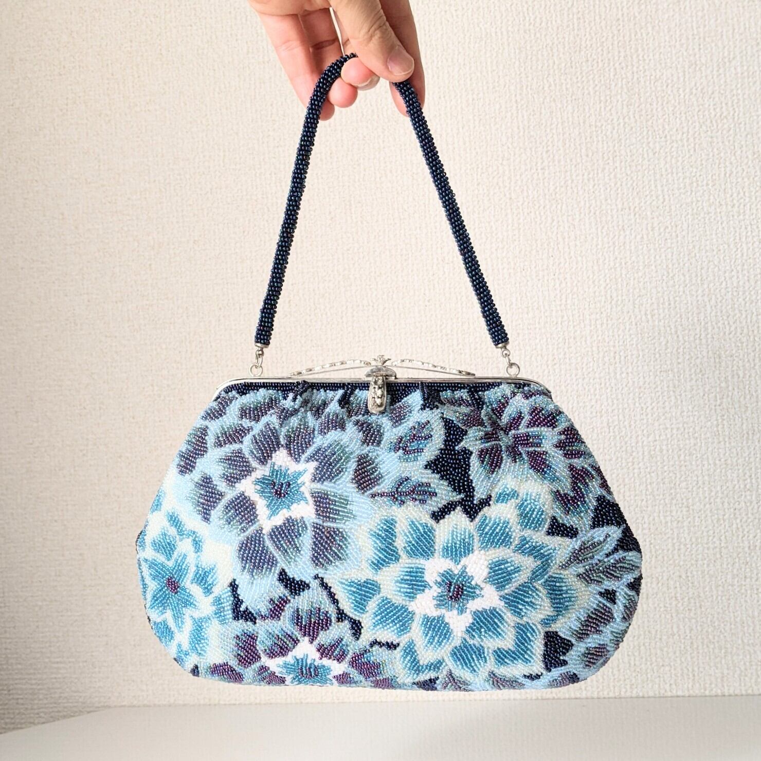 青色のグラデーションで描かれたダリア(天竺牡丹)の花がバッグいっぱいに咲き誇っているかのような大胆なデザインが印象的なビーズバッグです。