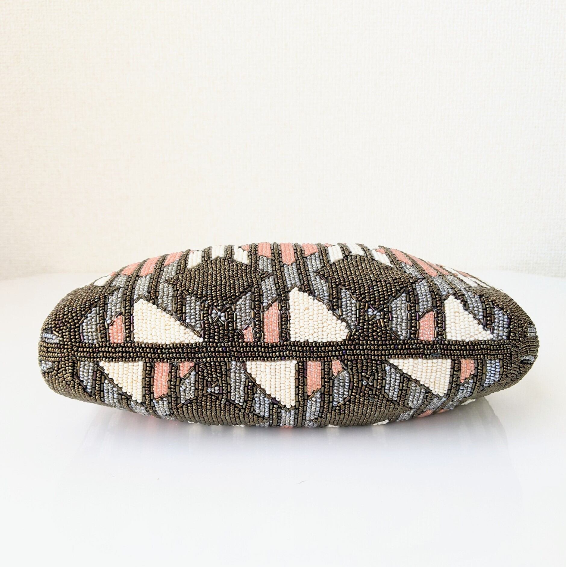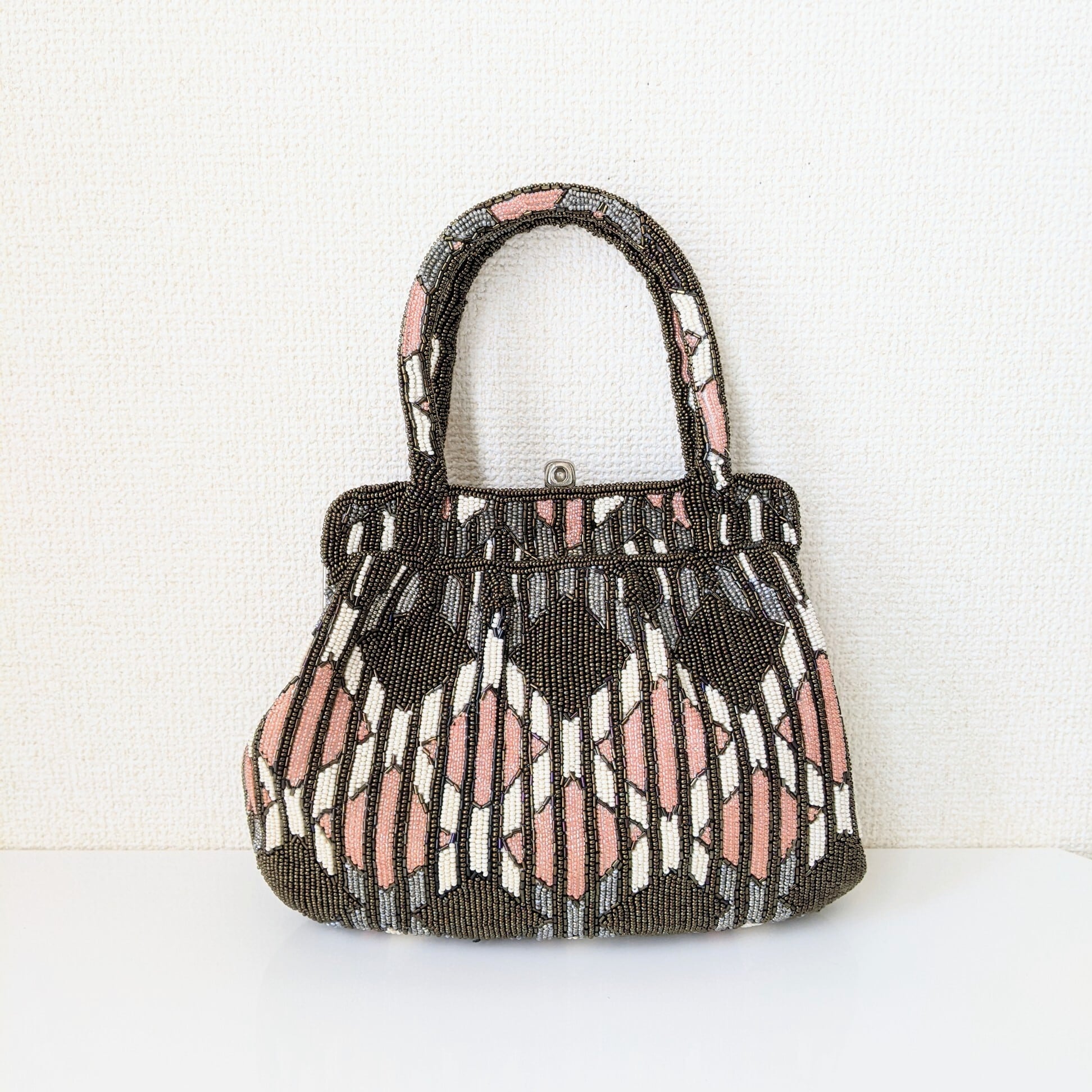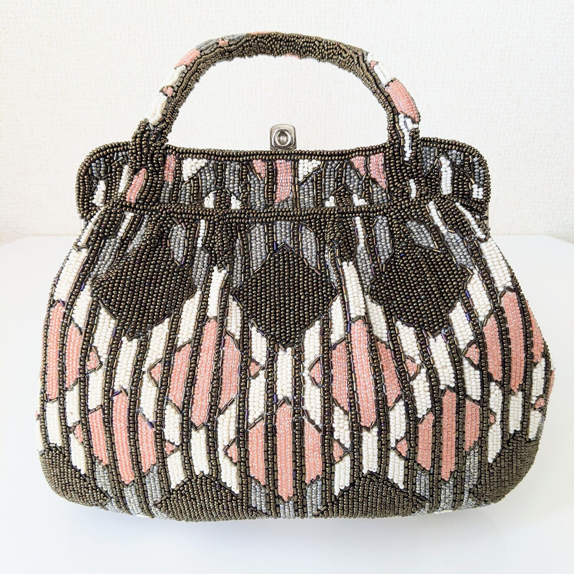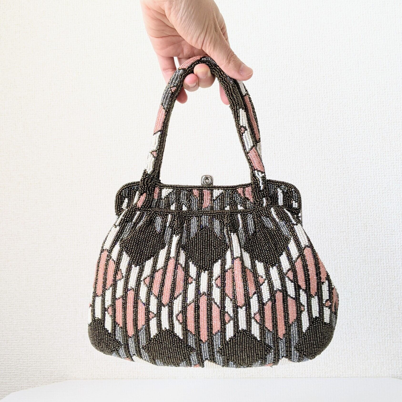 【Vintage】ビーズ刺繍バッグ Beaded Bag ピンク×カーキブラウン 菱形×縞 モダン パーティーバッグ 昭和レトロ 大正浪漫 フォーマルバッグ
