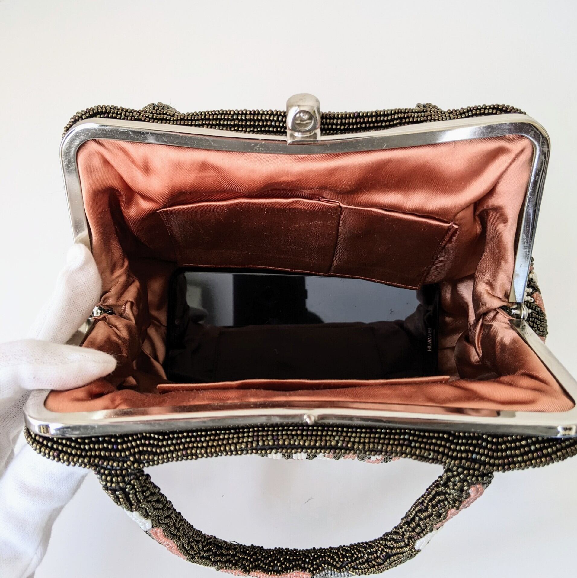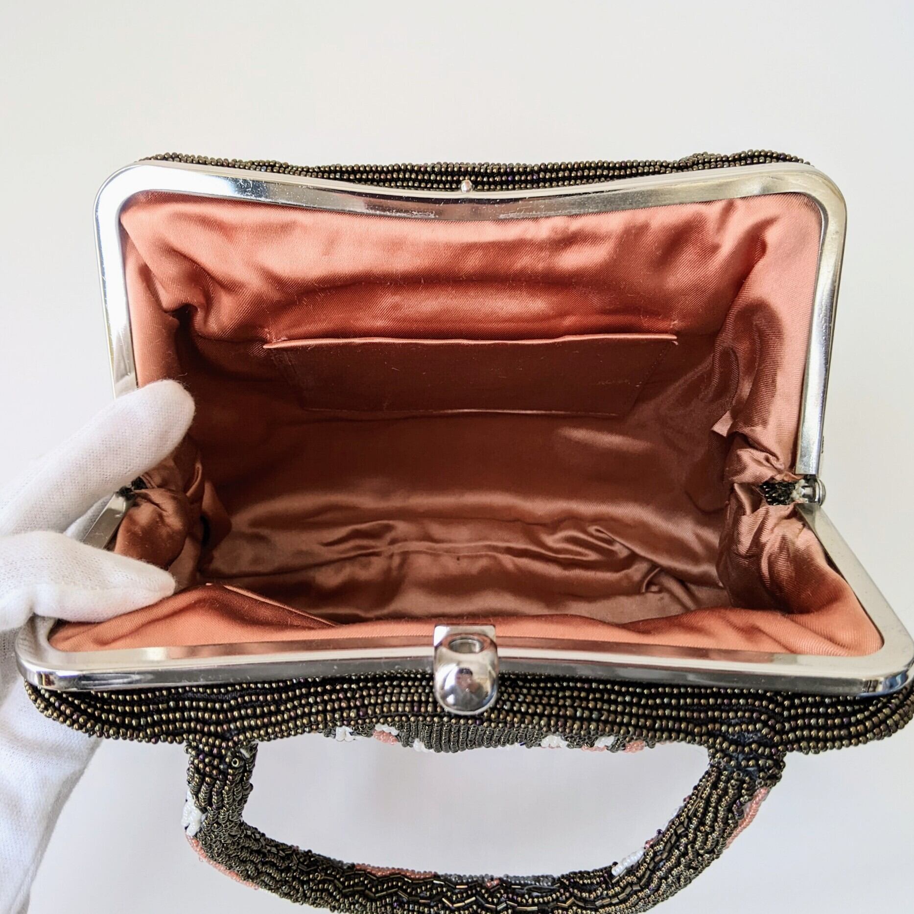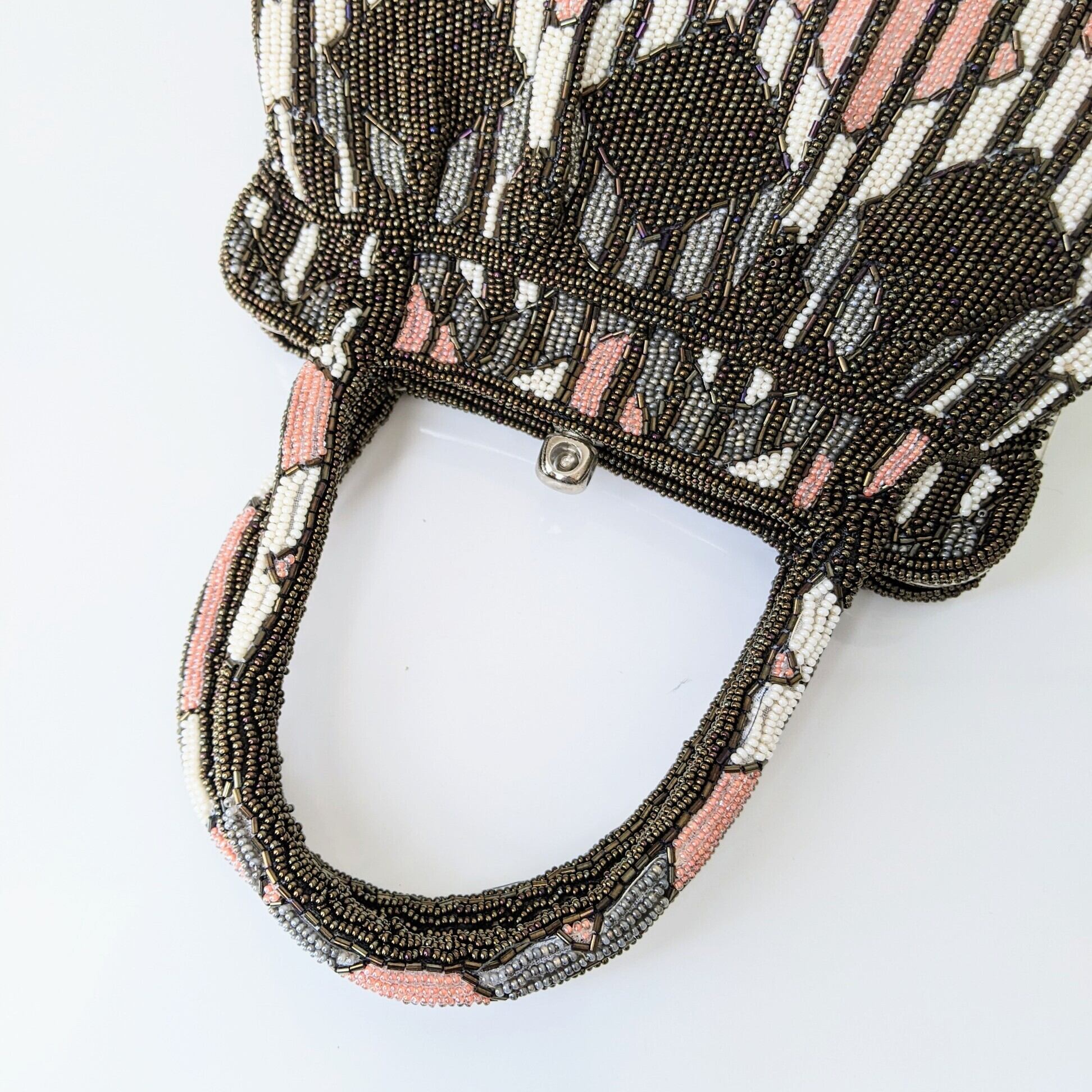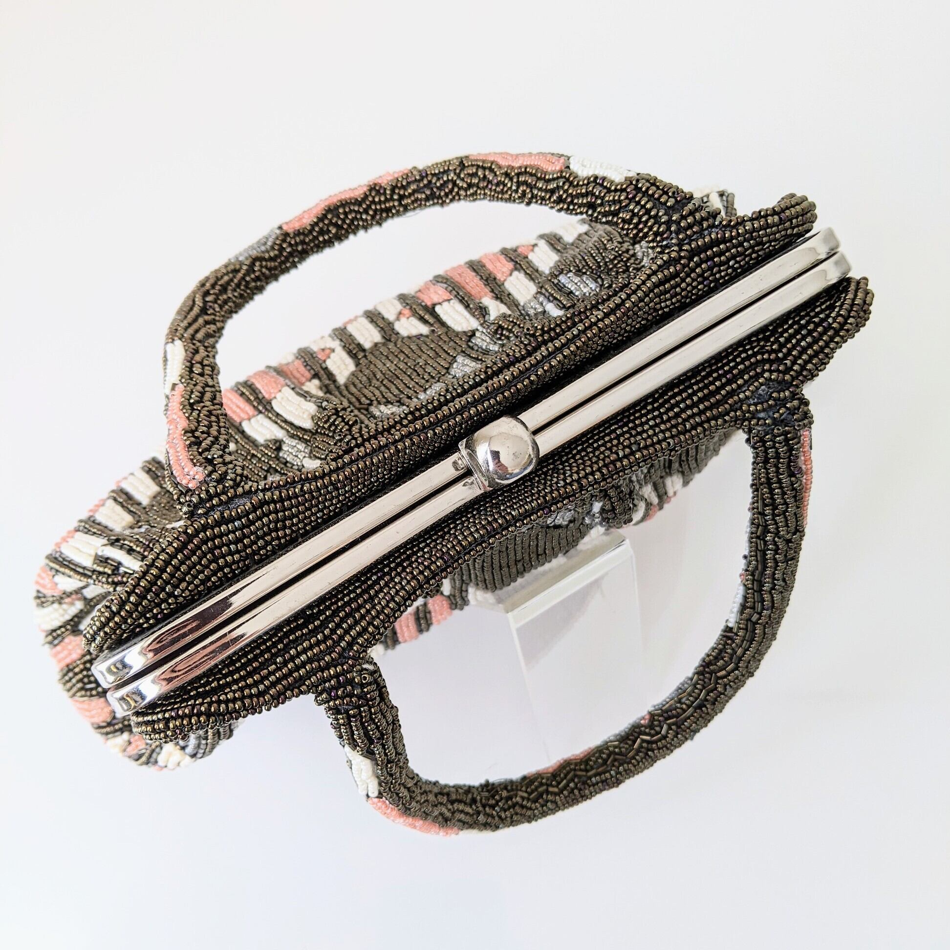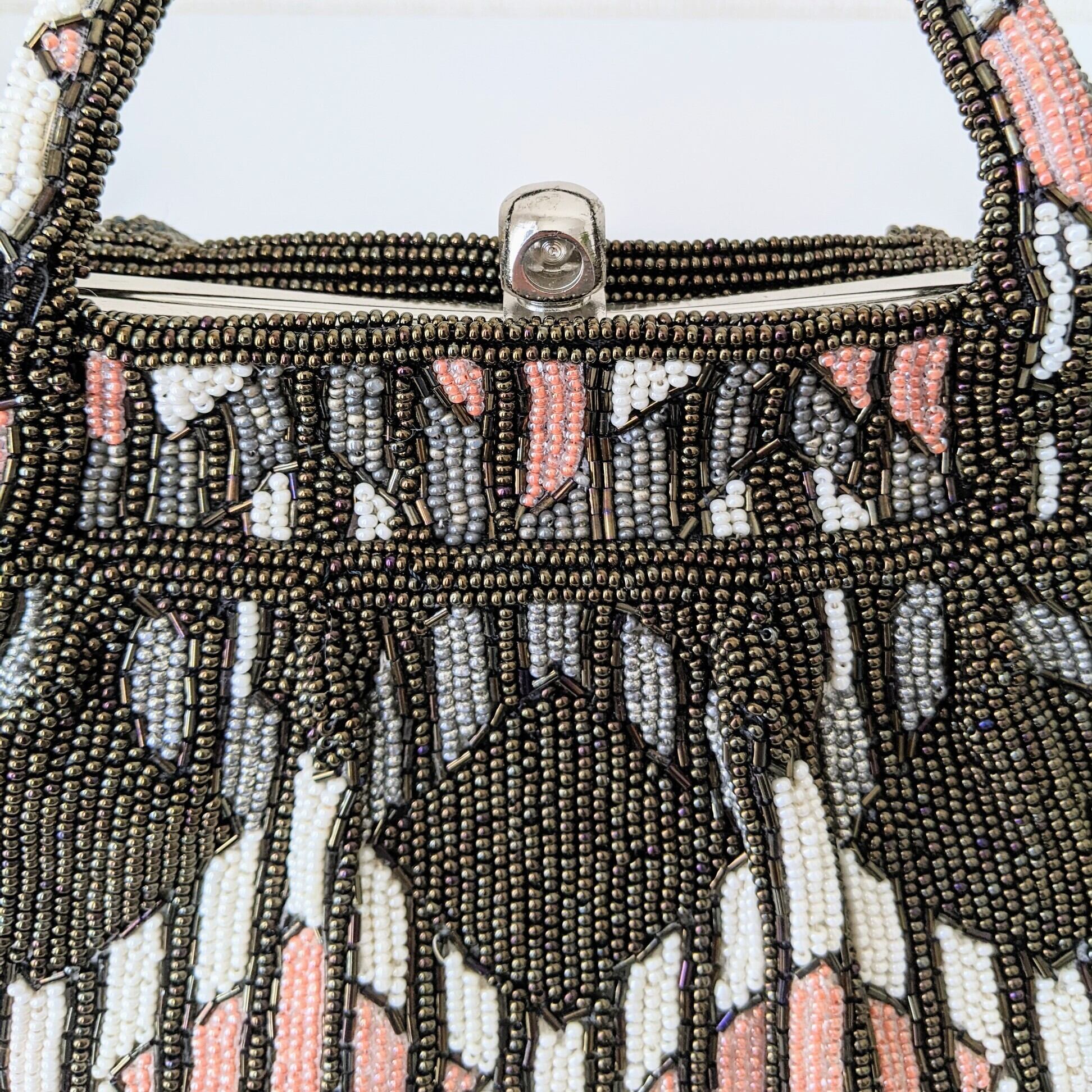 【Vintage】ビーズ刺繍バッグ Beaded Bag ピンク×カーキブラウン 菱形×縞 モダン パーティーバッグ 昭和レトロ 大正浪漫 フォーマルバッグ