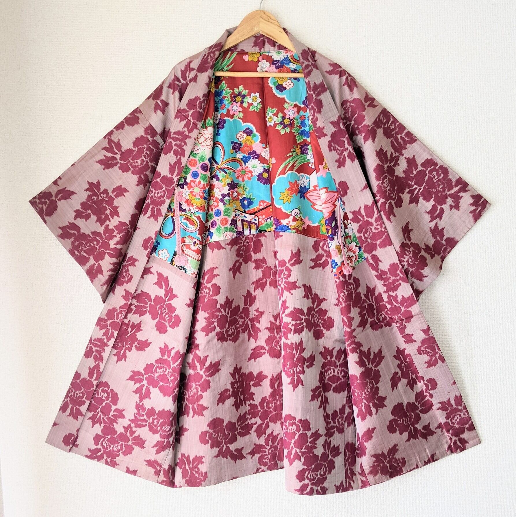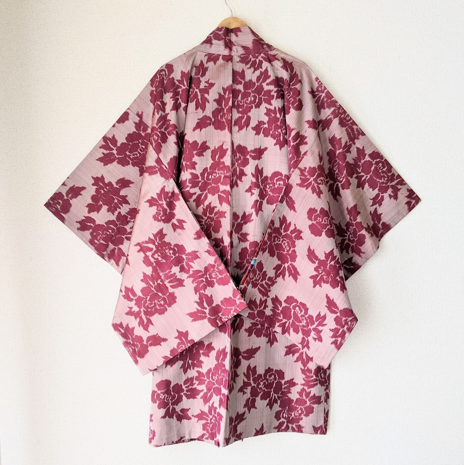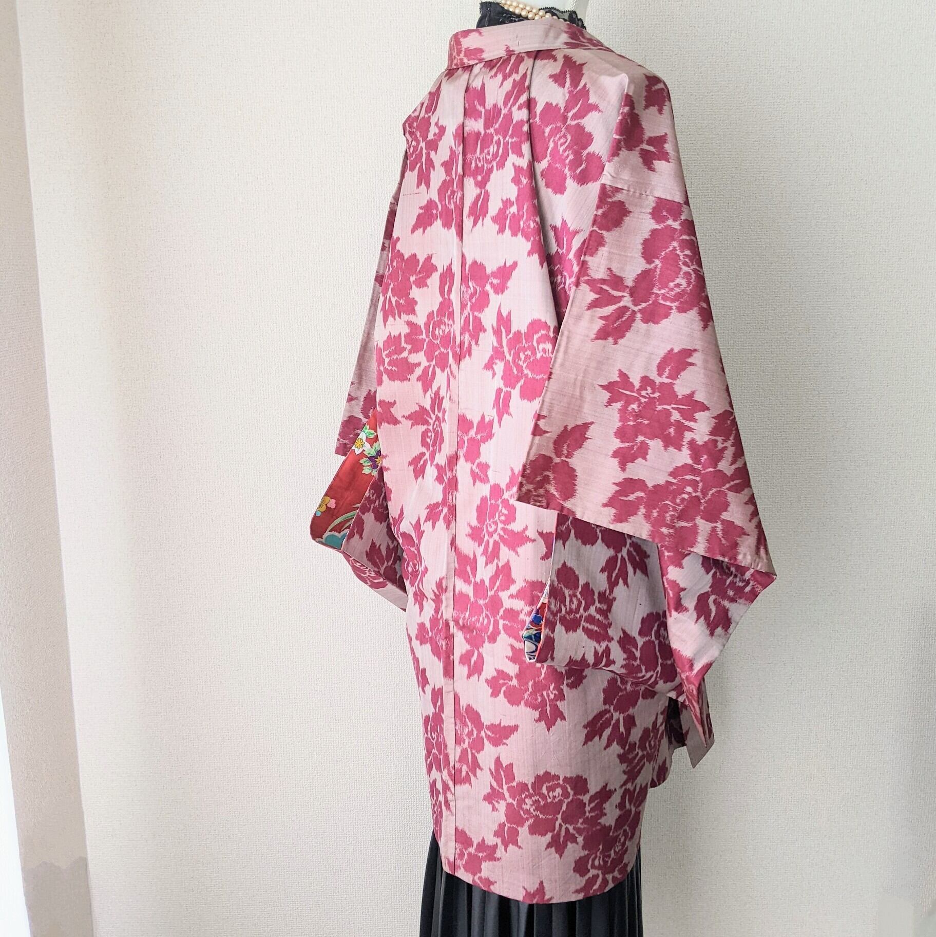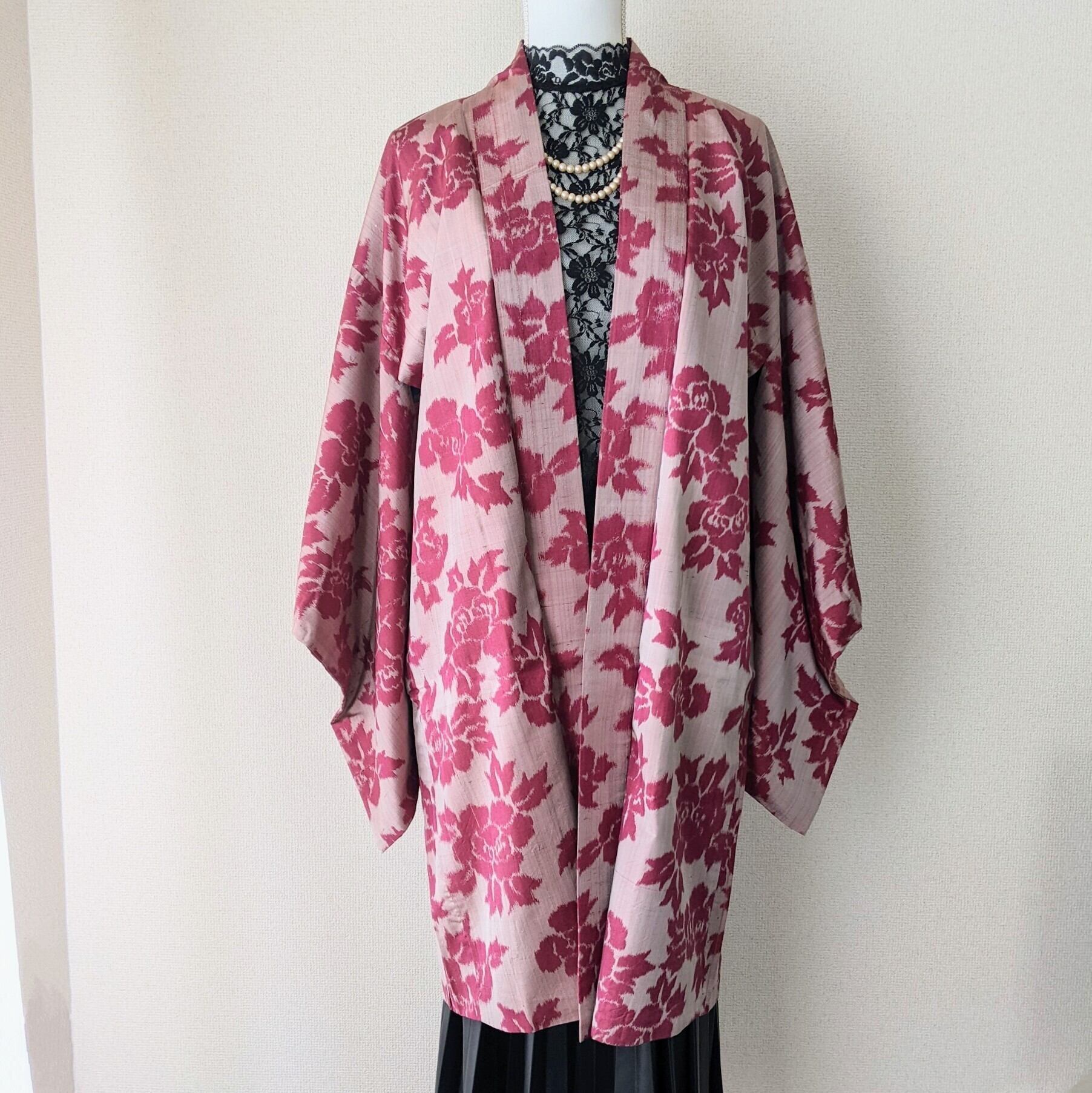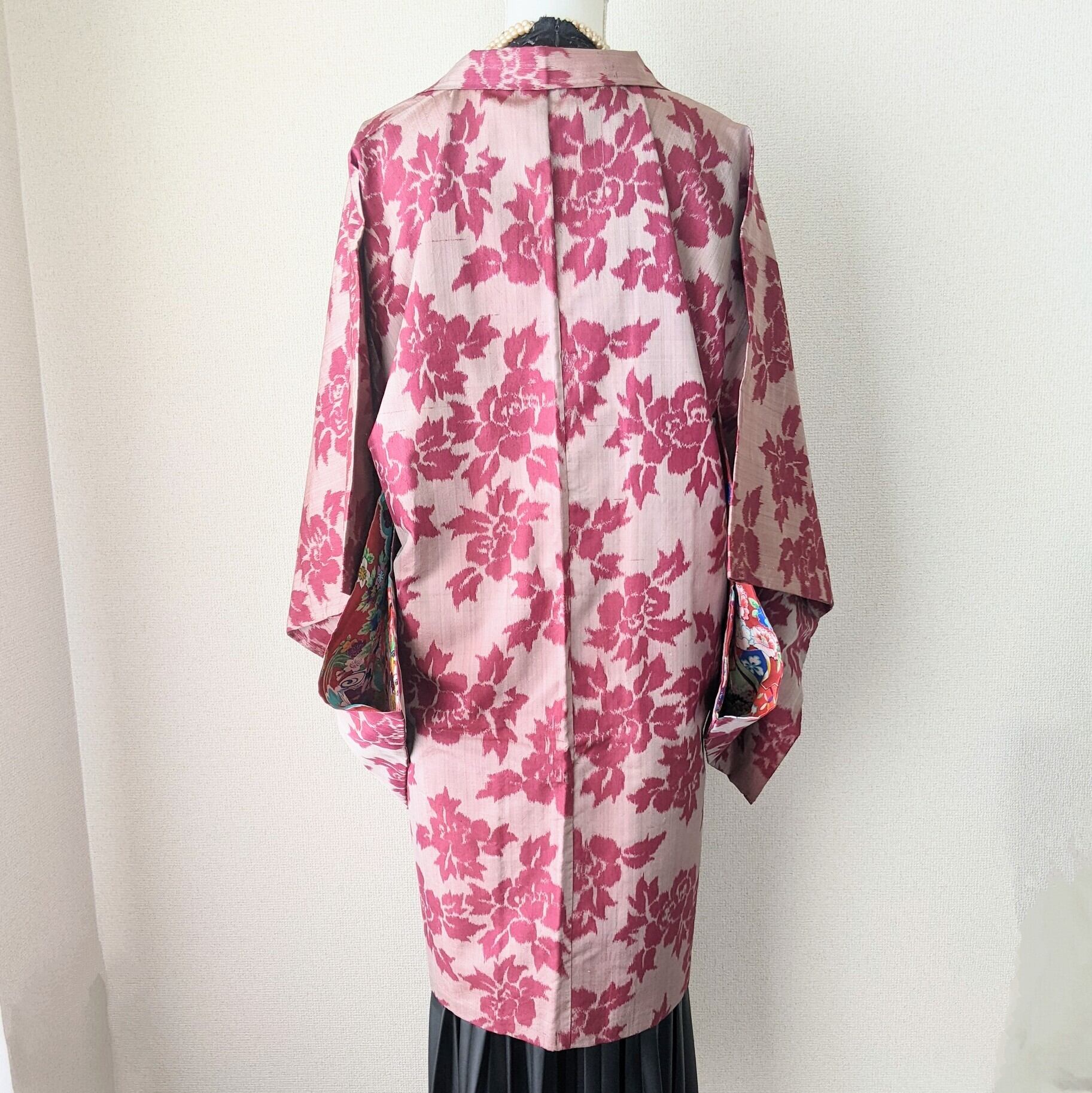 【Vintage】HAORI 長羽織 羽織 正絹 銘仙 赤紫系 花柄 裏地が可愛い シルク 大正浪漫 和洋折衷