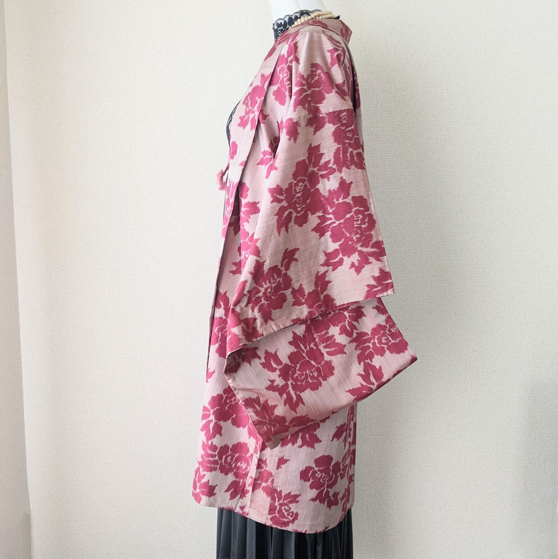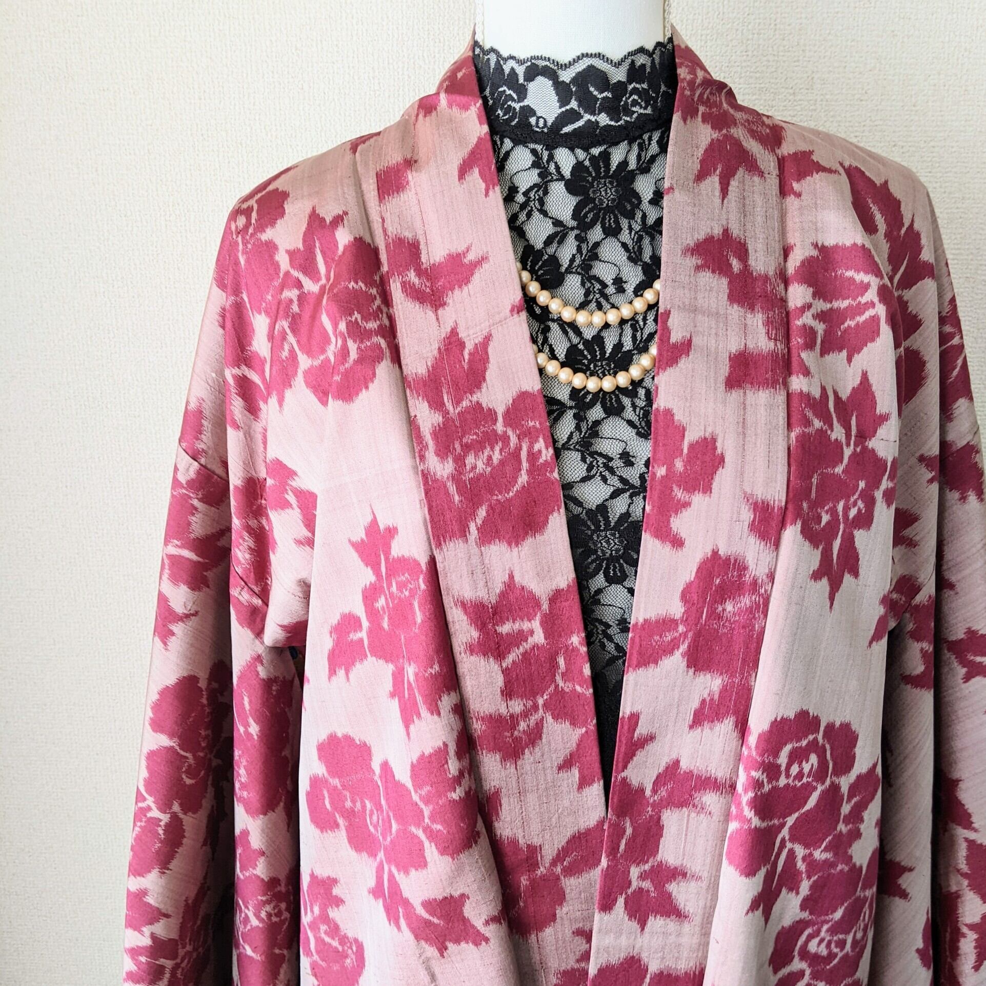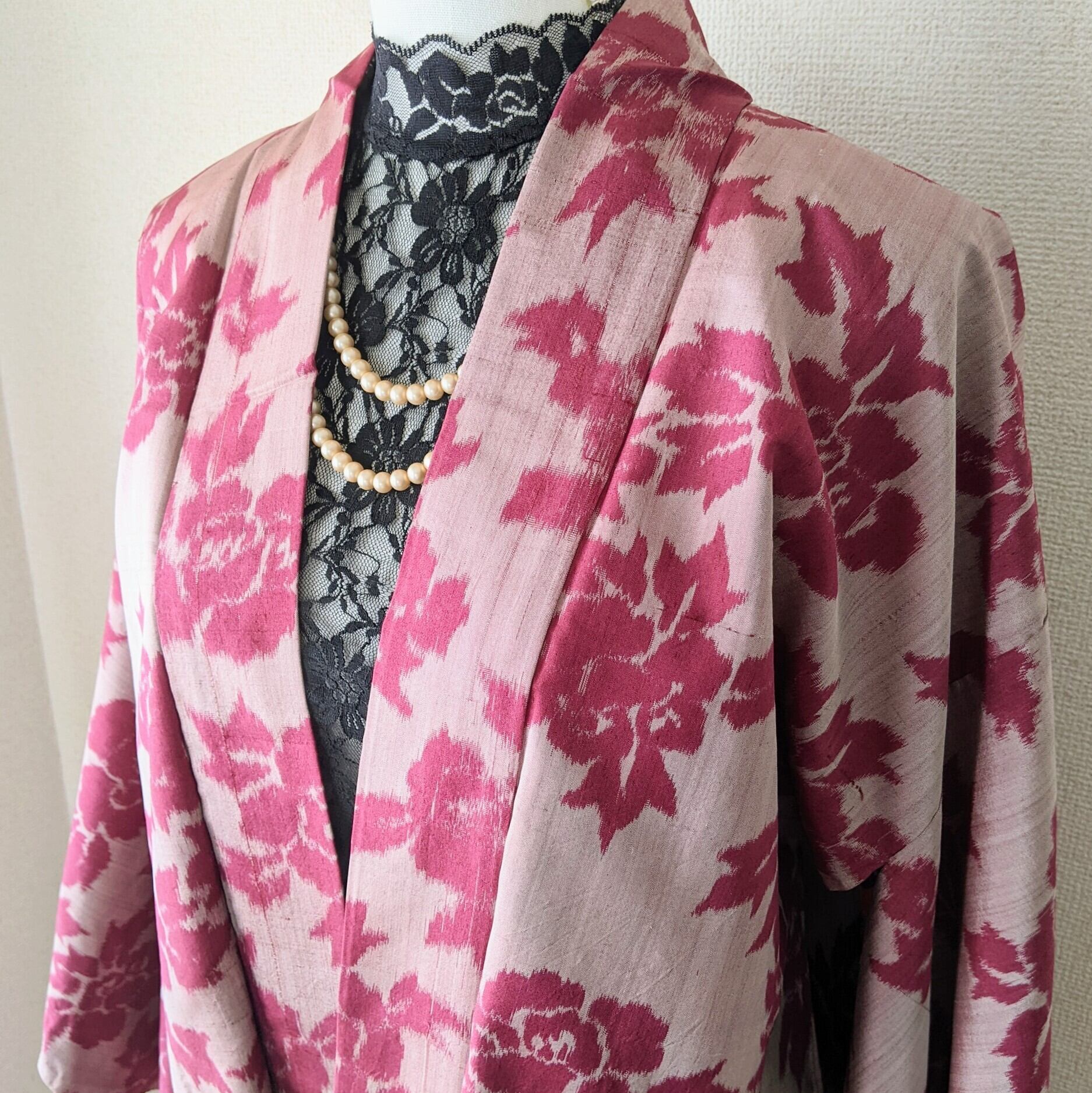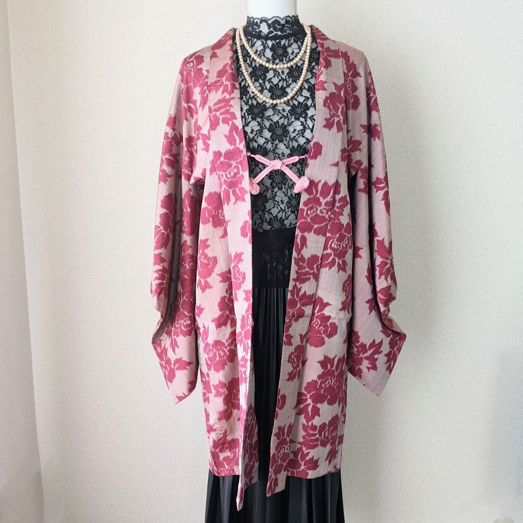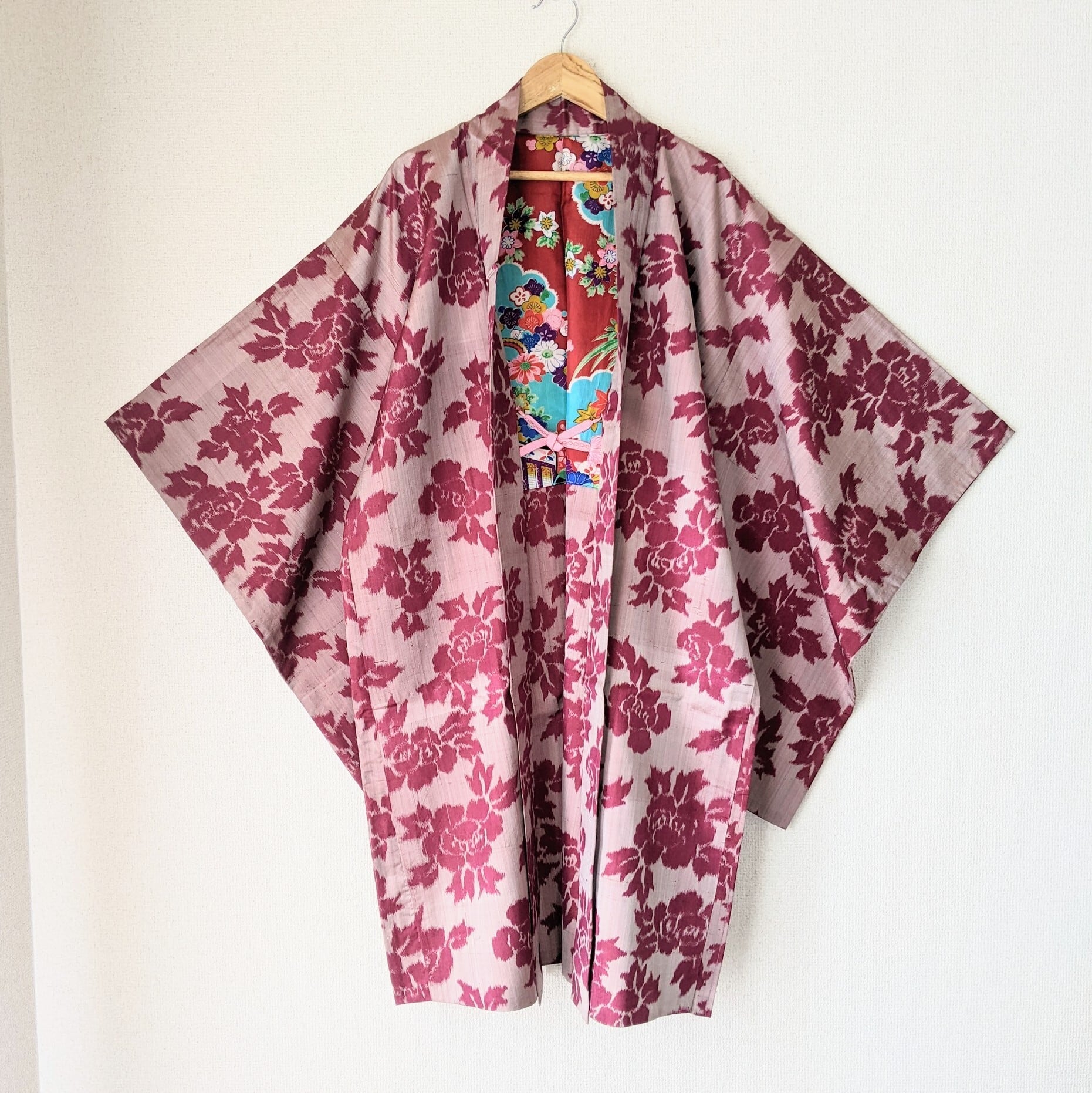 【Vintage】HAORI 長羽織 羽織 正絹 銘仙 赤紫系 花柄 裏地が可愛い シルク 大正浪漫 和洋折衷