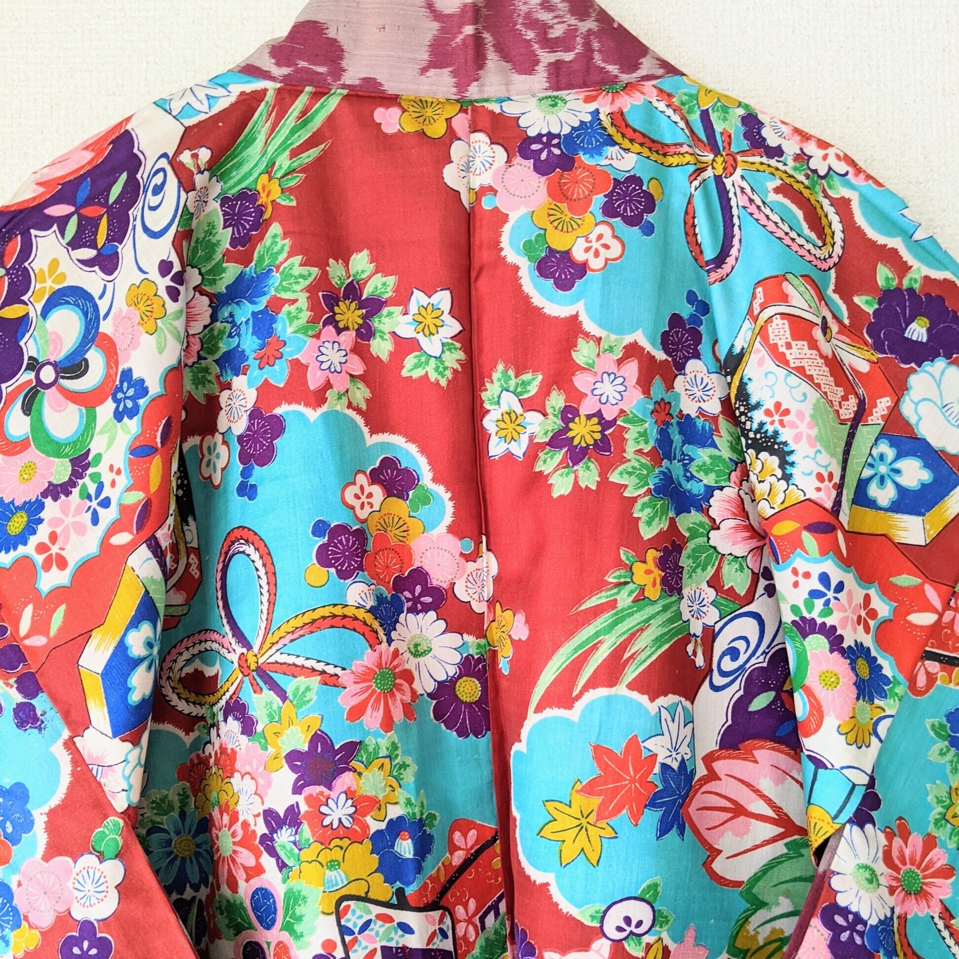 赤紫の濃淡で牡丹柄を描き出している銘仙の長羽織です。裏地はこれでもかというくらいの縁起柄が埋め尽くす、色柄ともに幸せいっぱいな裏地です。