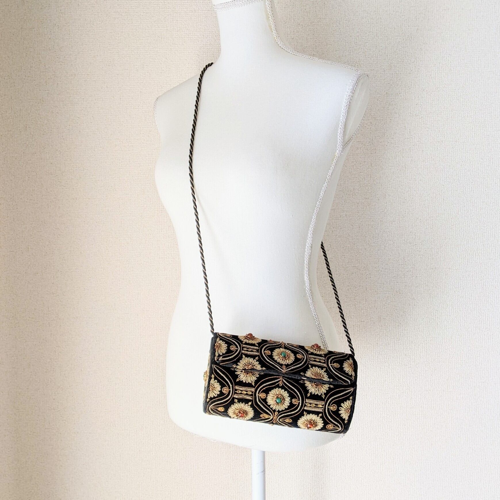 こちらのショルダーバッグは、インドの伝統的な刺繍方法である「ザリ刺繍」で作られたバッグです。金や銀のコイル状のモール糸を、釣り針のような針で縫い付ける製法です。