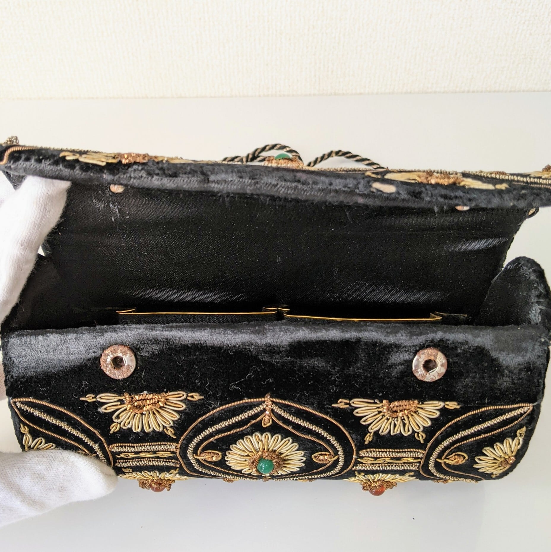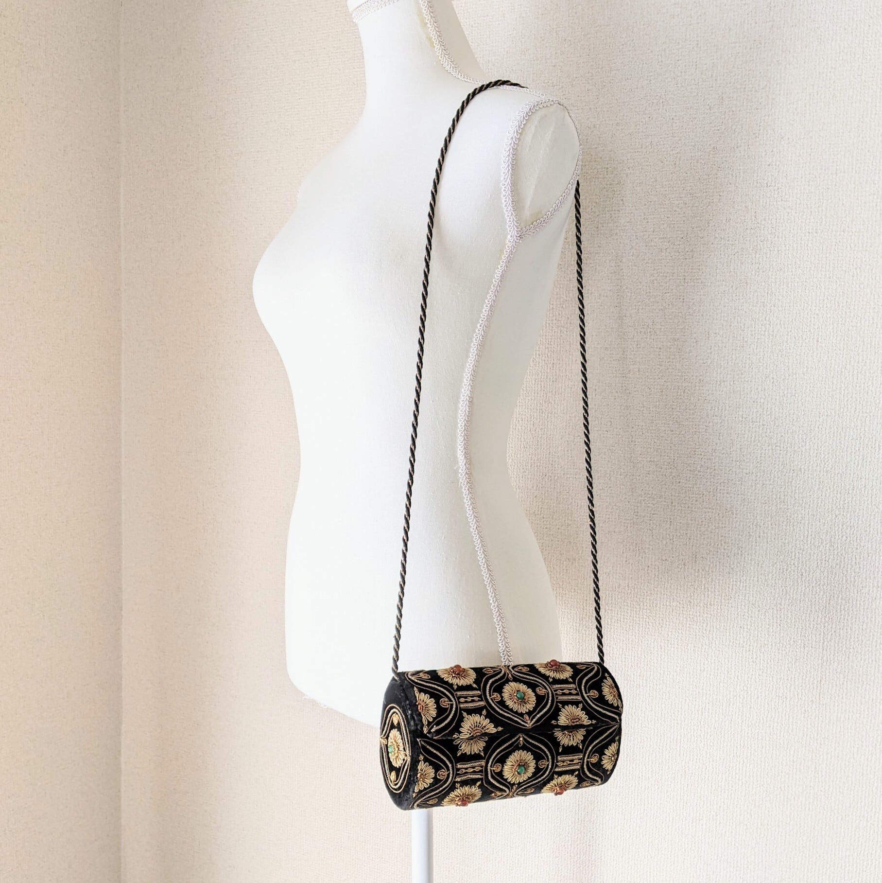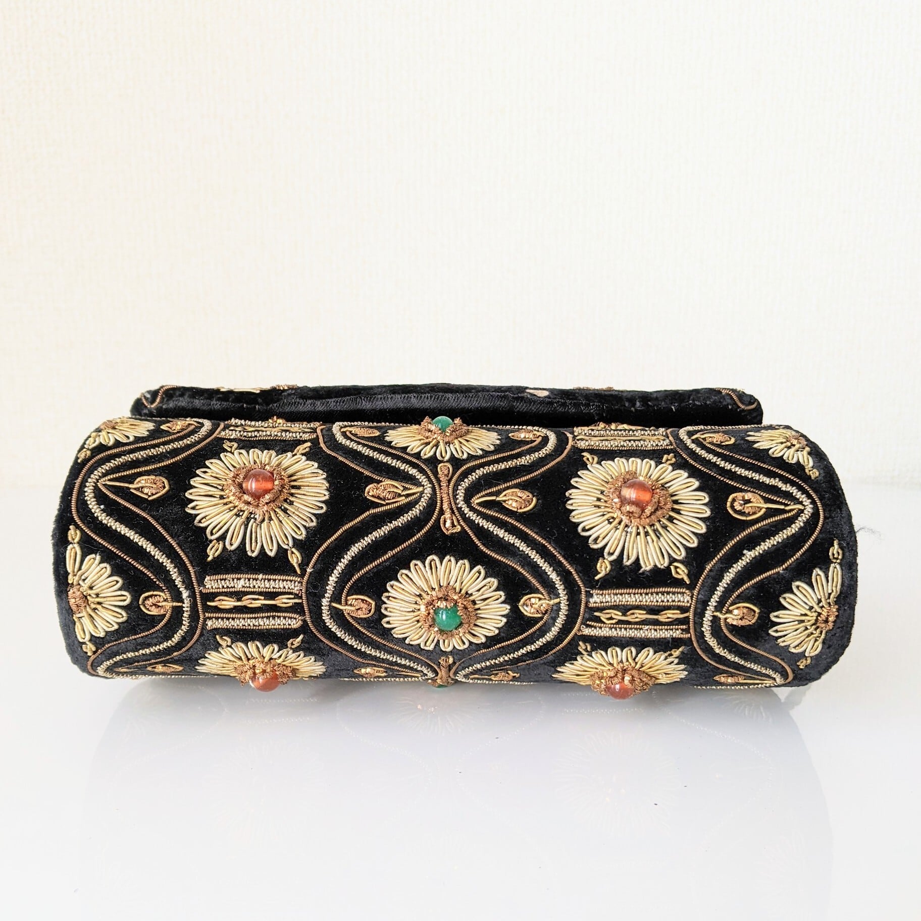 筒型のユニークな形、黒のベルベット生地に煌びやかな金の糸と天然石の美しいコントラストが素敵です。