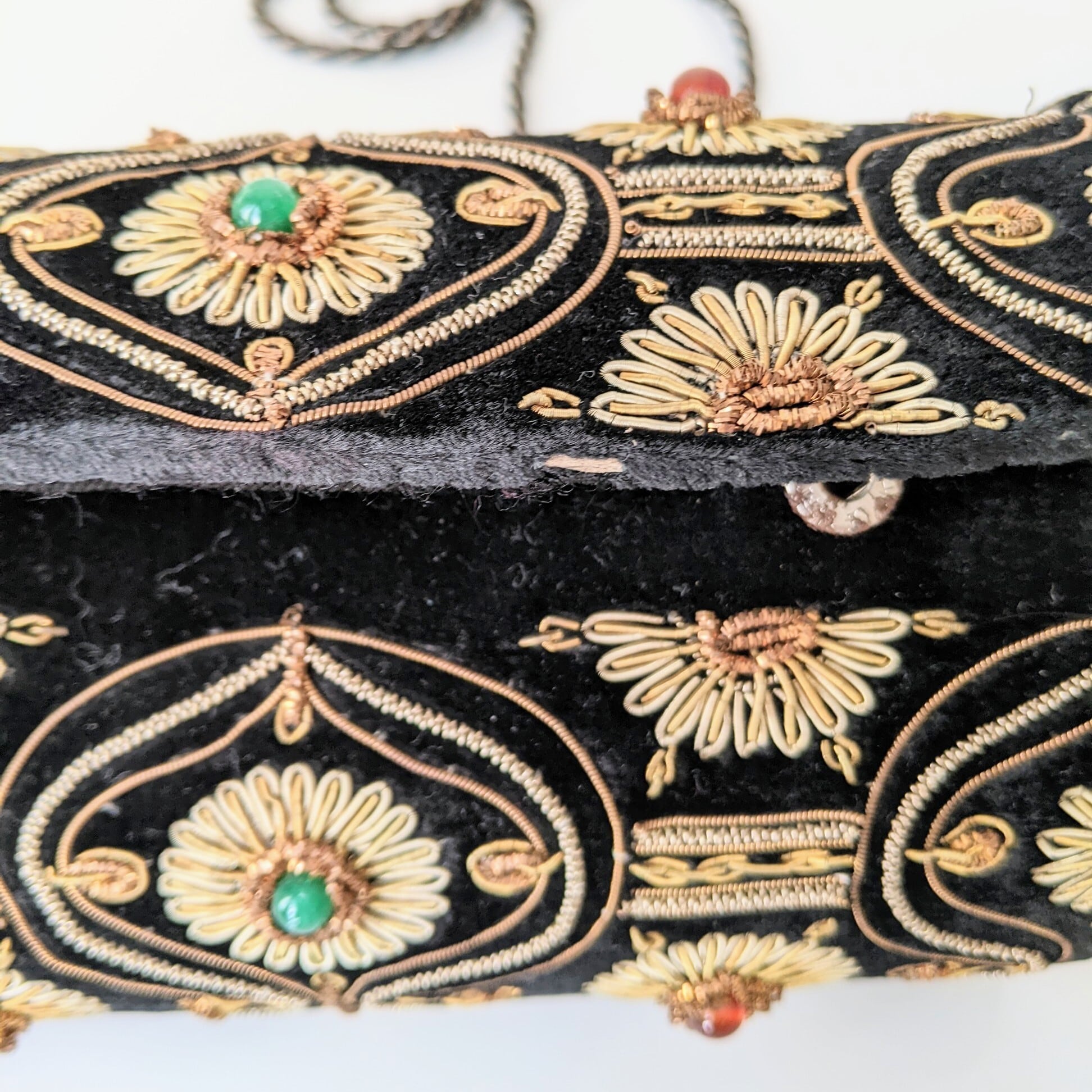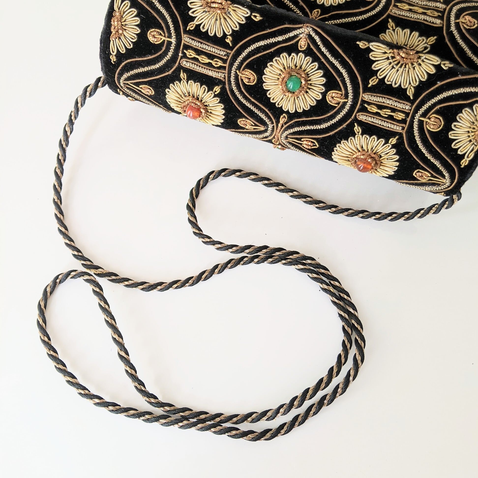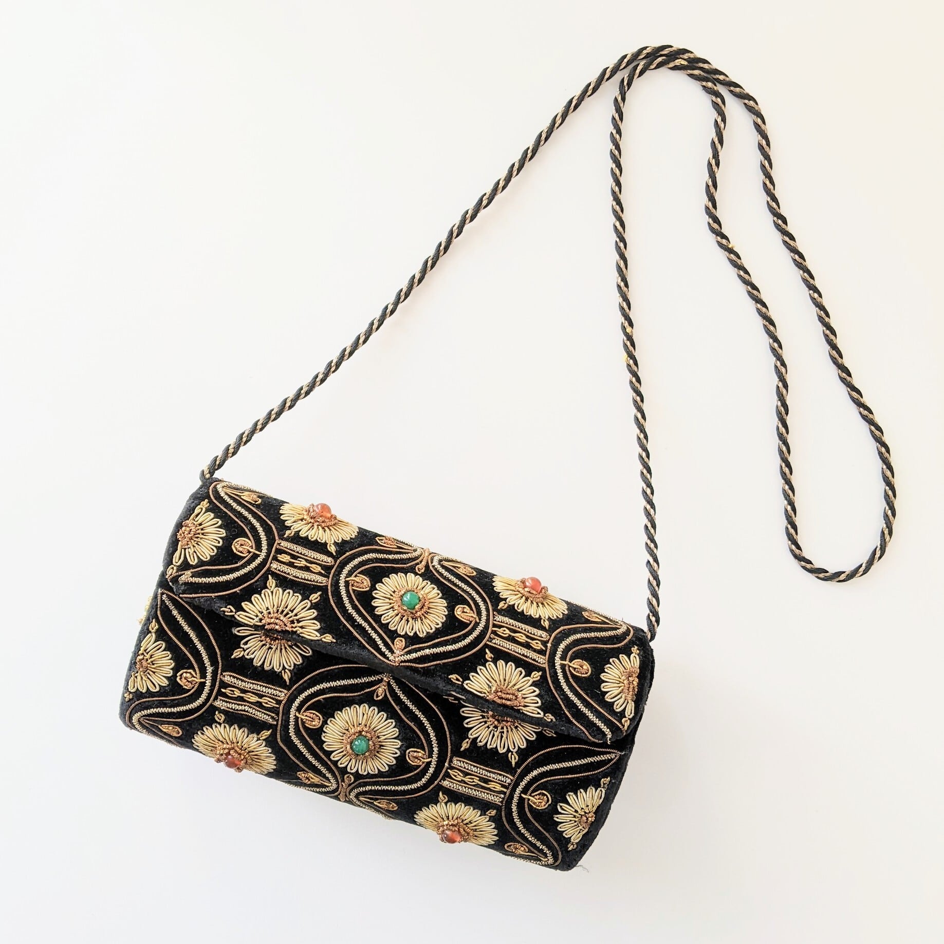 筒型のユニークな形、黒のベルベット生地に煌びやかな金の糸と天然石の美しいコントラストが素敵です。