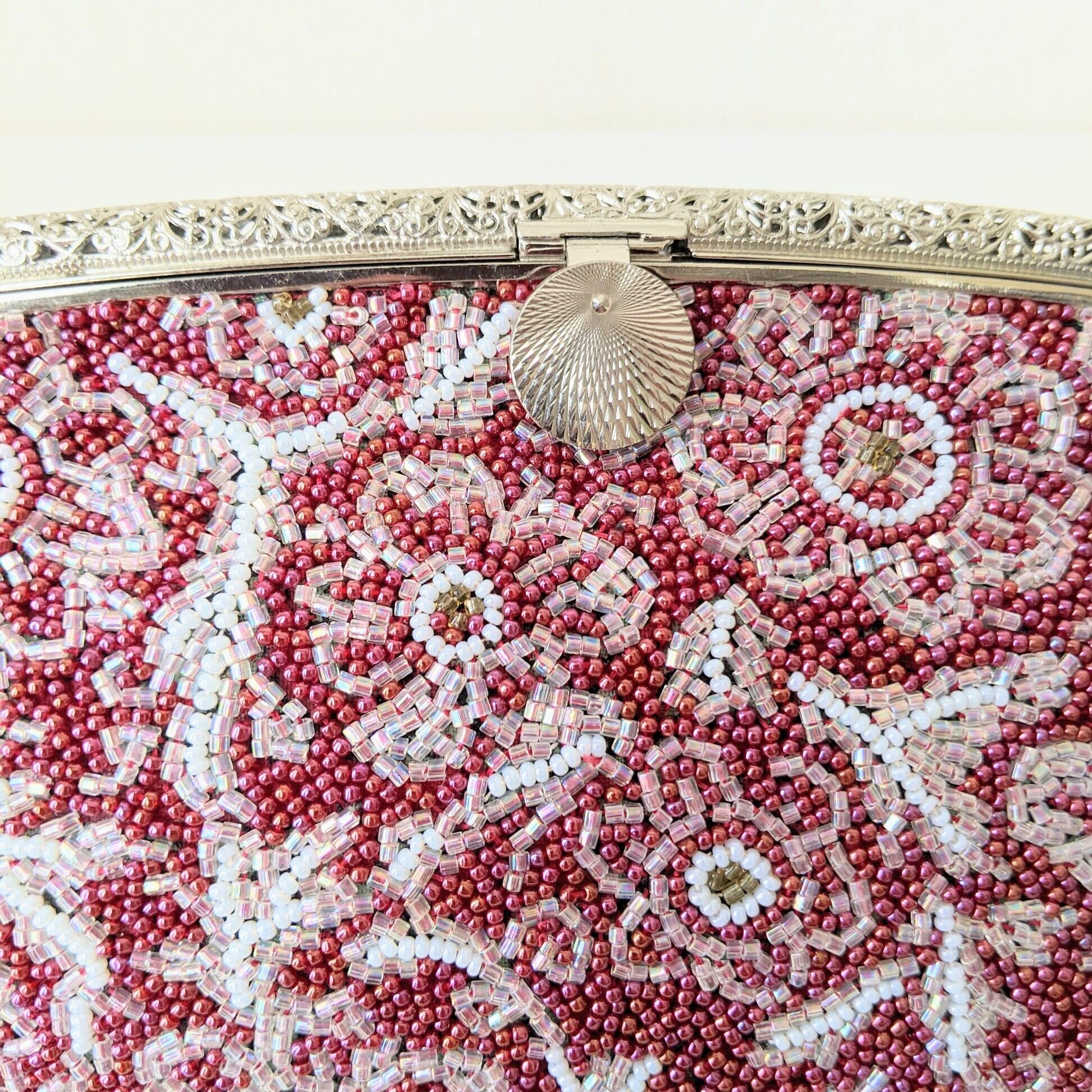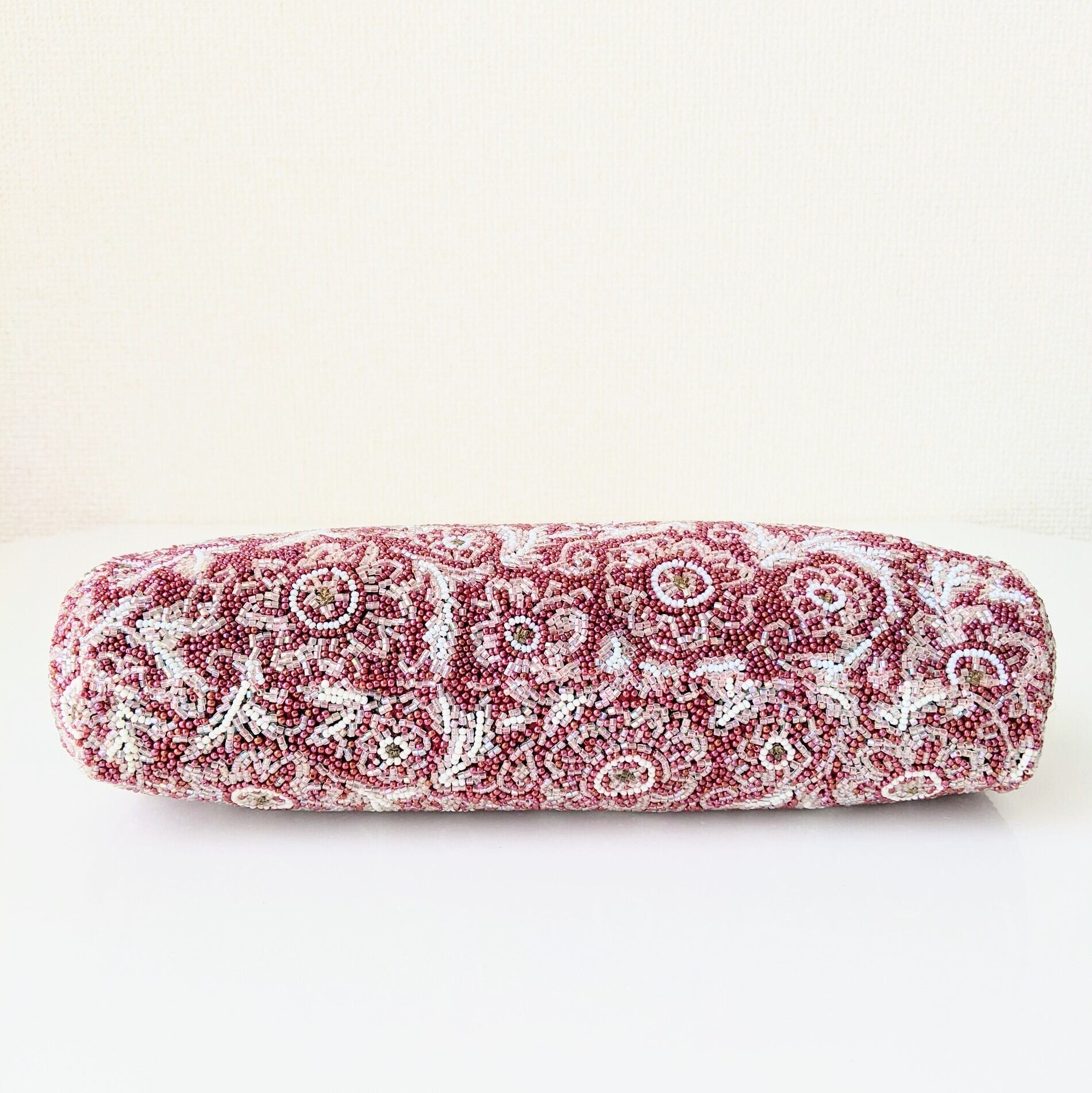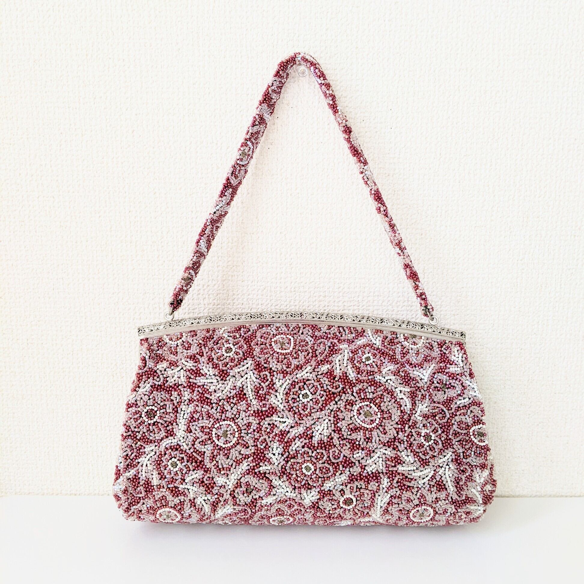 【Vintage】「はしもと」作 ビーズ刺繍バッグ Beaded Bag 赤系 小花柄 パーティーバッグ 昭和レトロ 大正浪漫 フォーマルバッグ