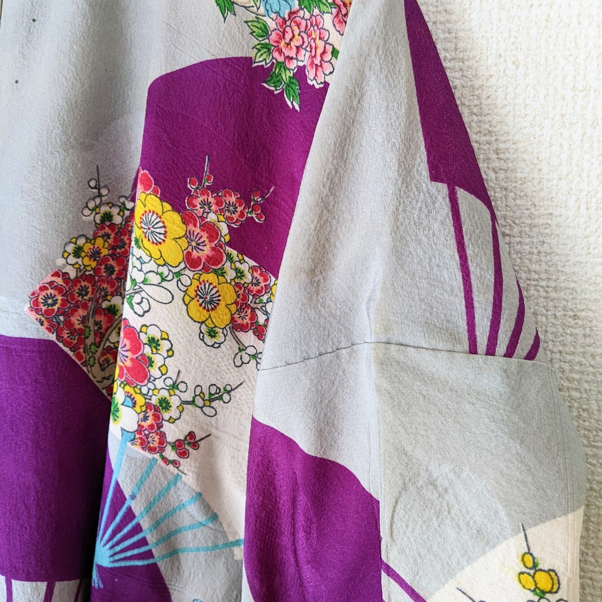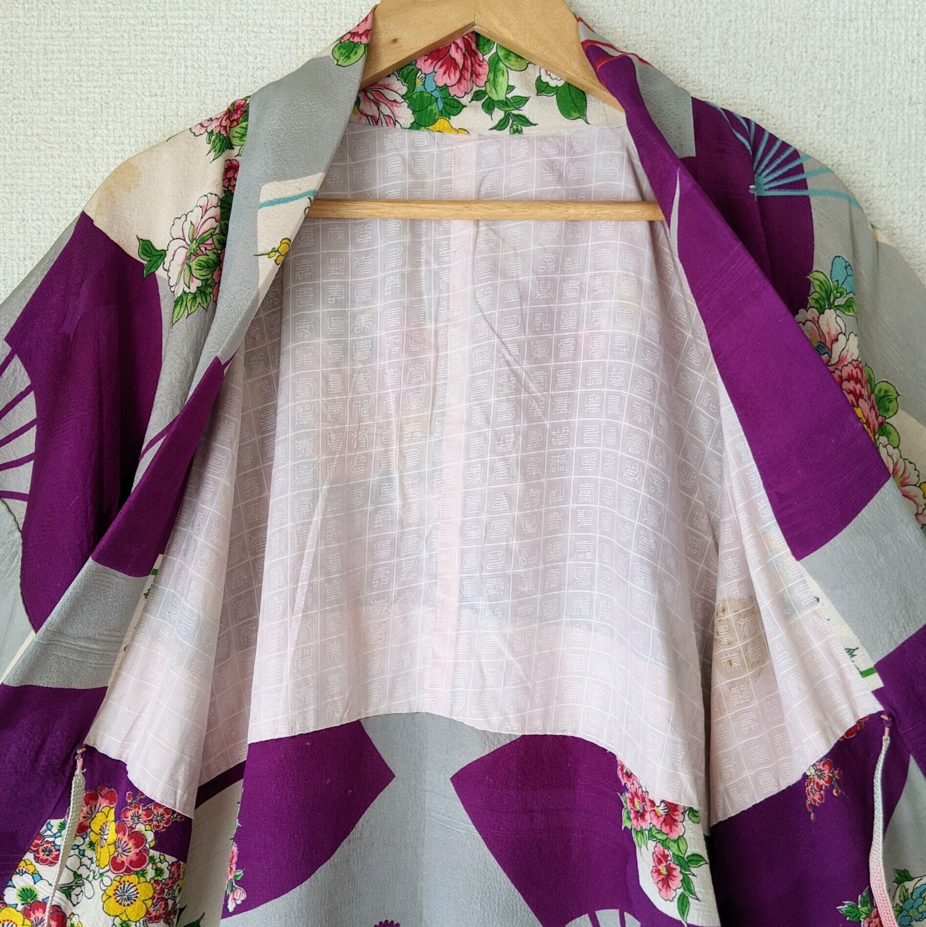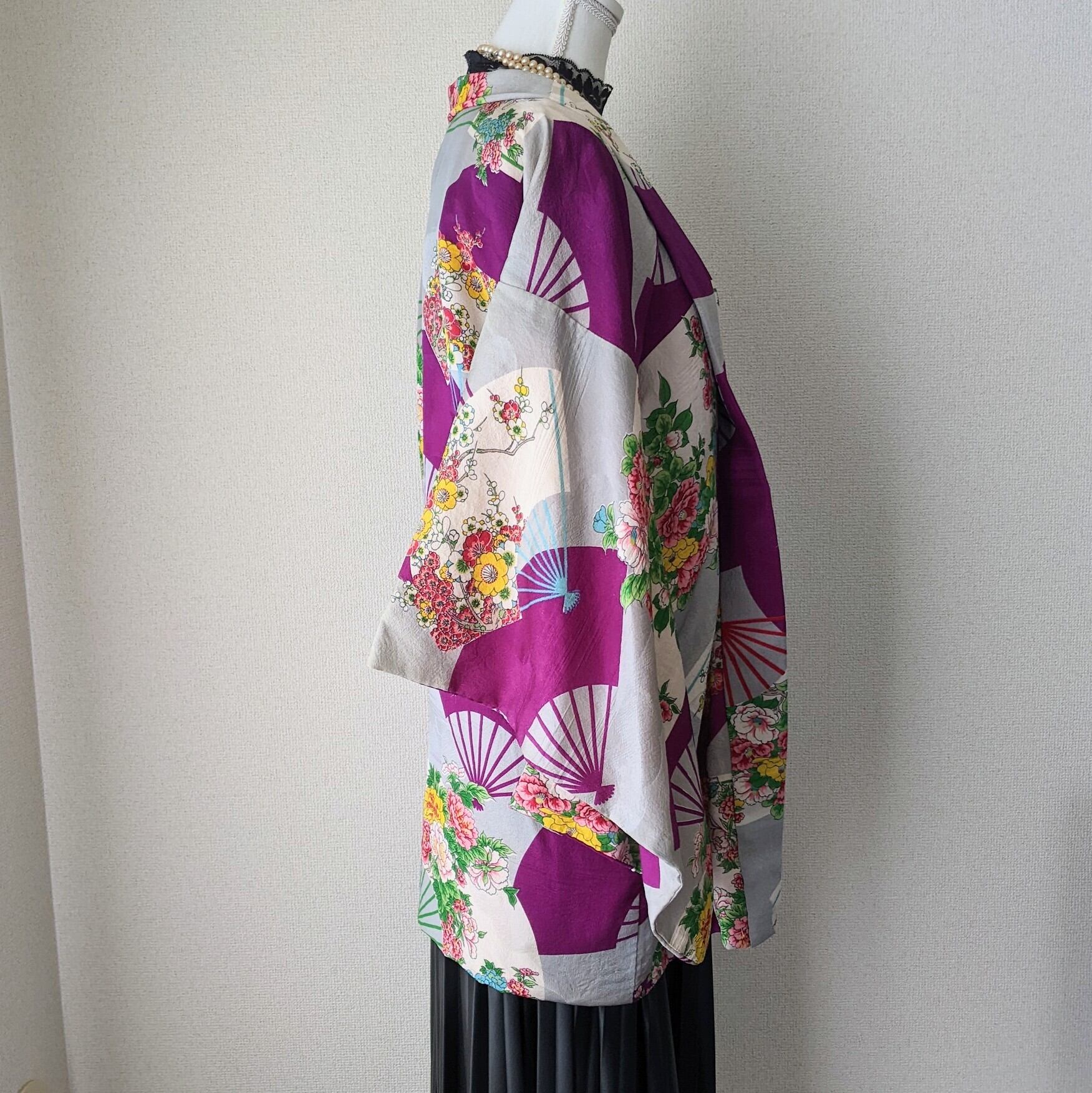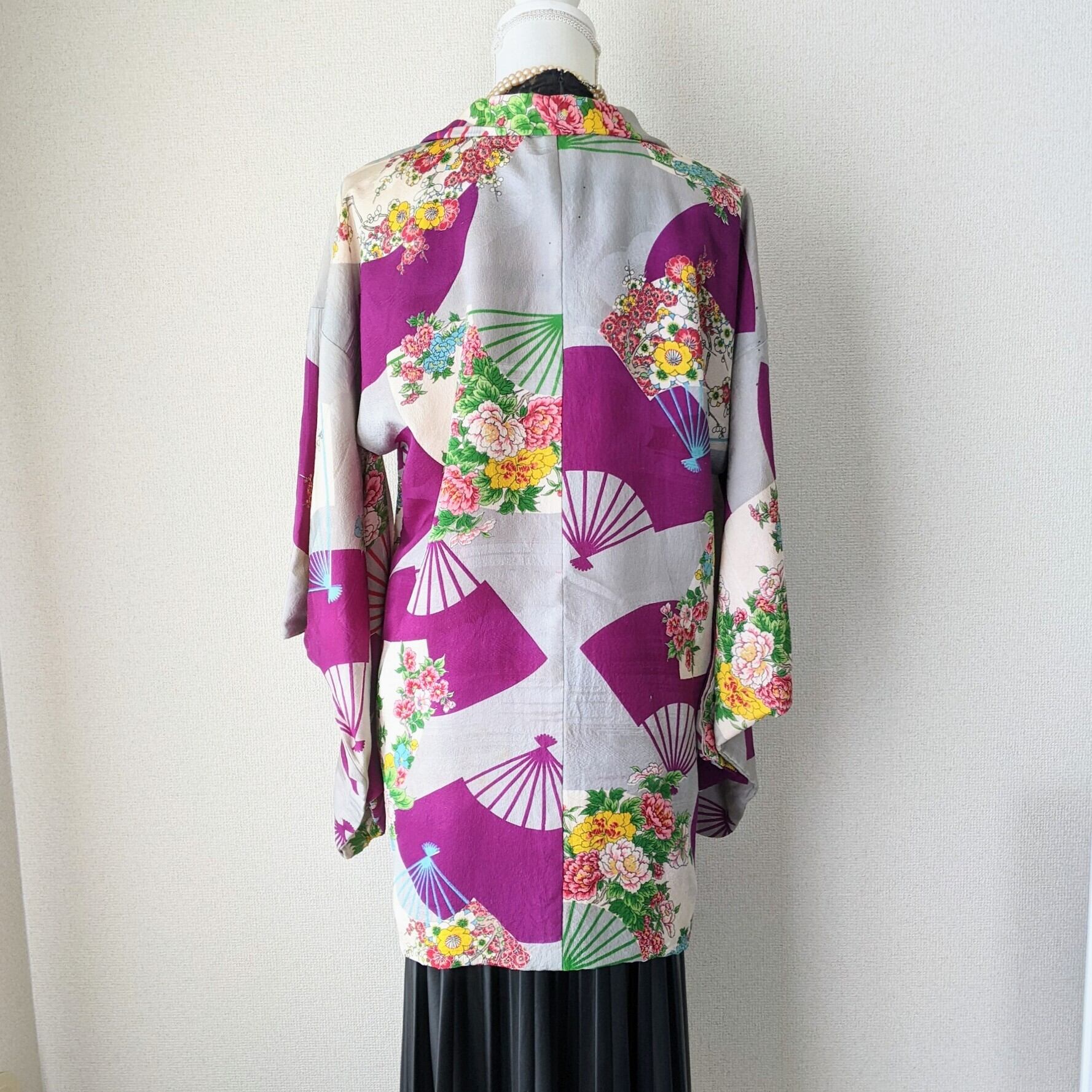 【Vintage】HAORI 長羽織 羽織 正絹 縮緬 銀鼠色(グレー)×紫色 花扇柄 シルク 大正浪漫 和洋折衷