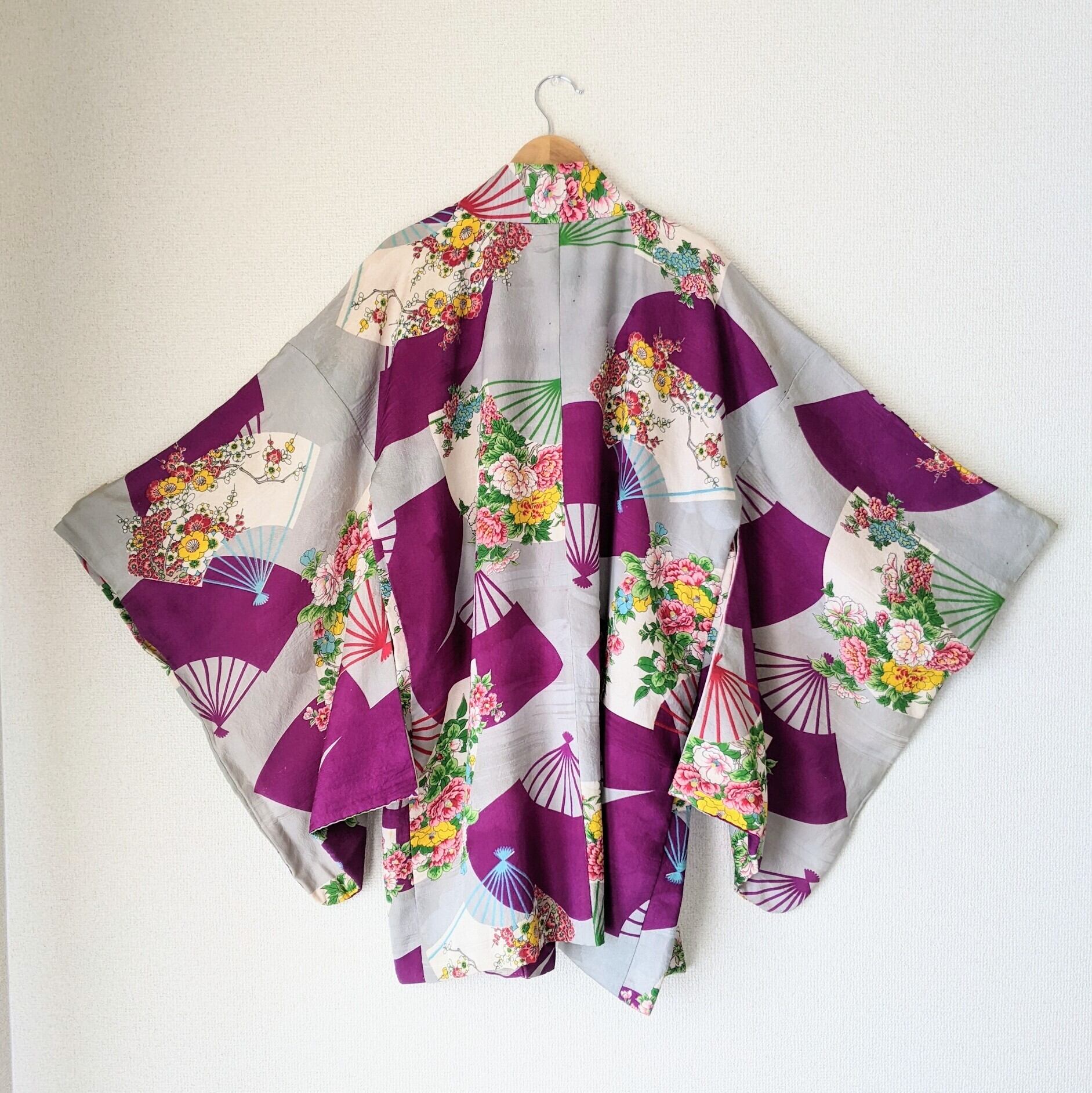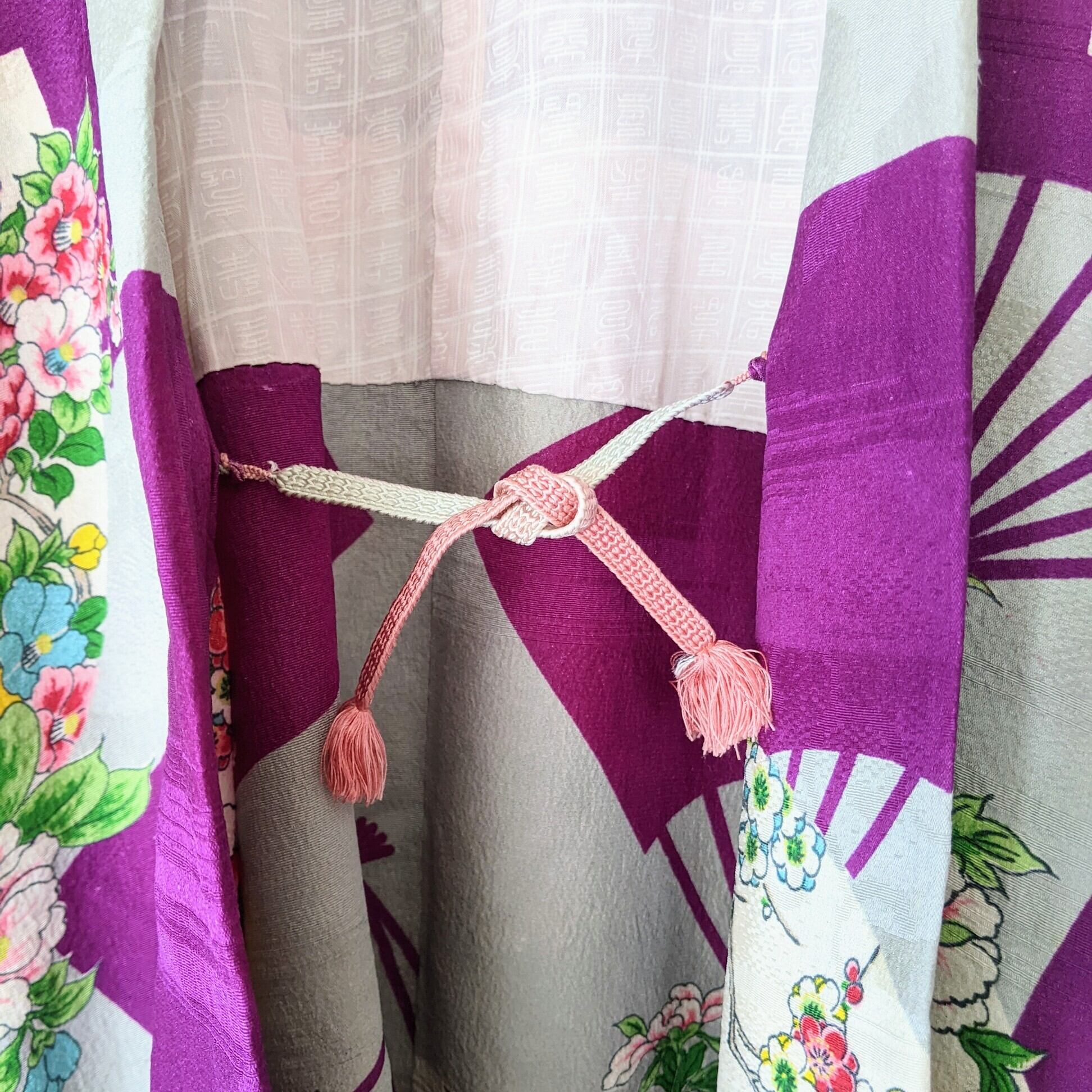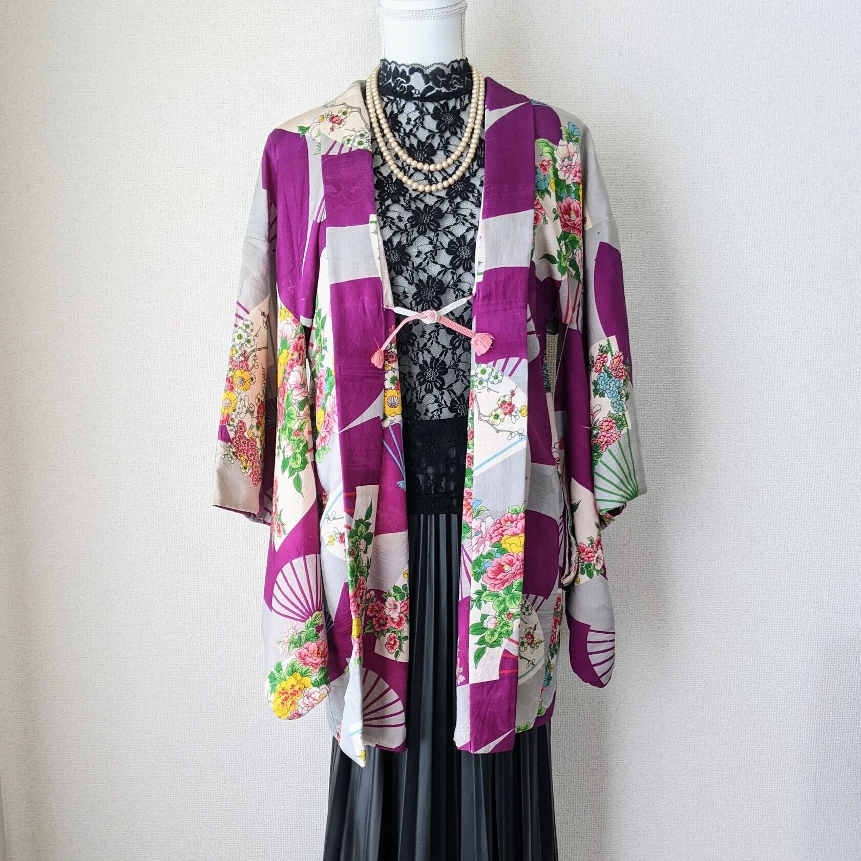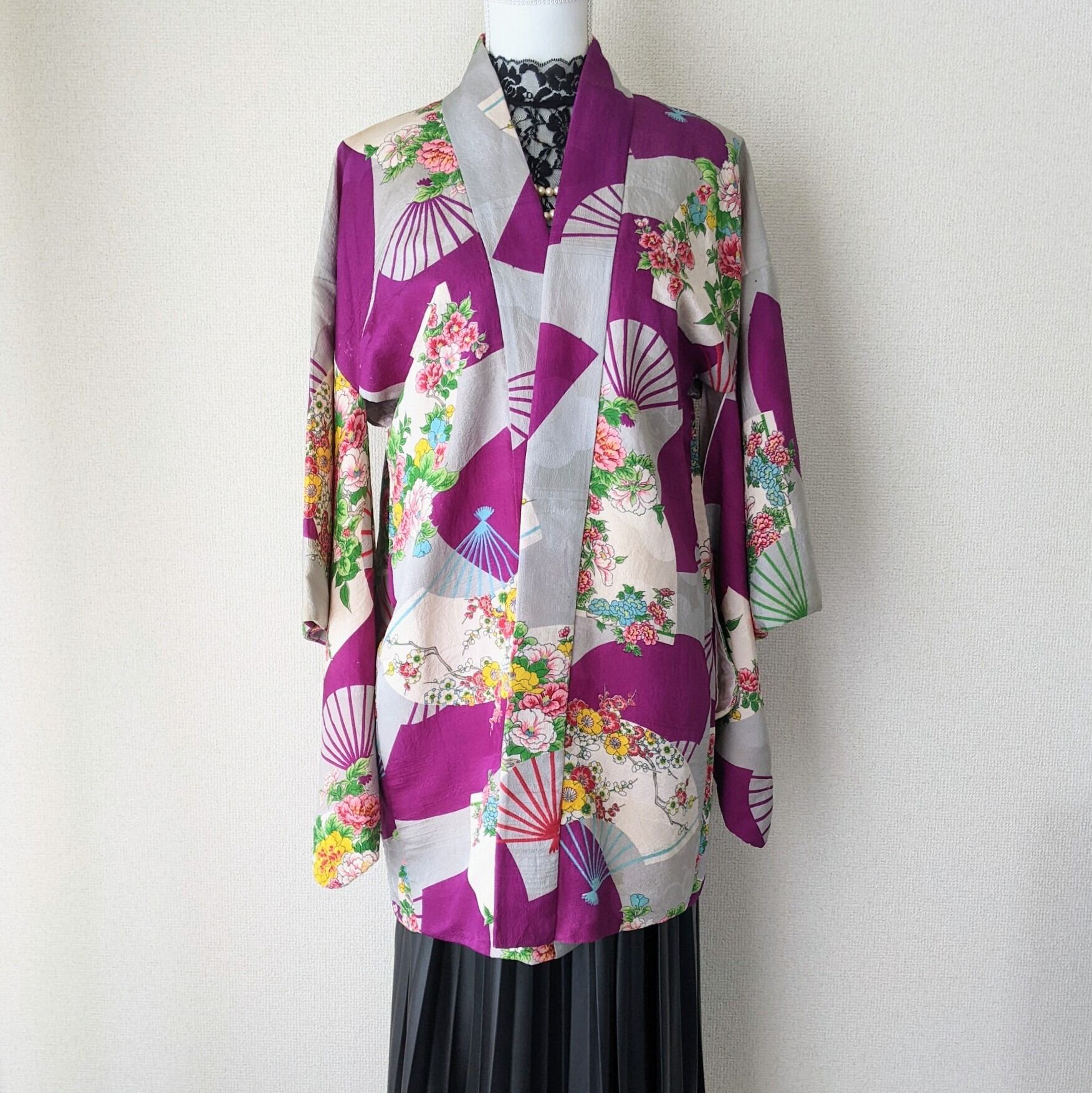 【Vintage】HAORI 長羽織 羽織 正絹 縮緬 銀鼠色(グレー)×紫色 花扇柄 シルク 大正浪漫 和洋折衷