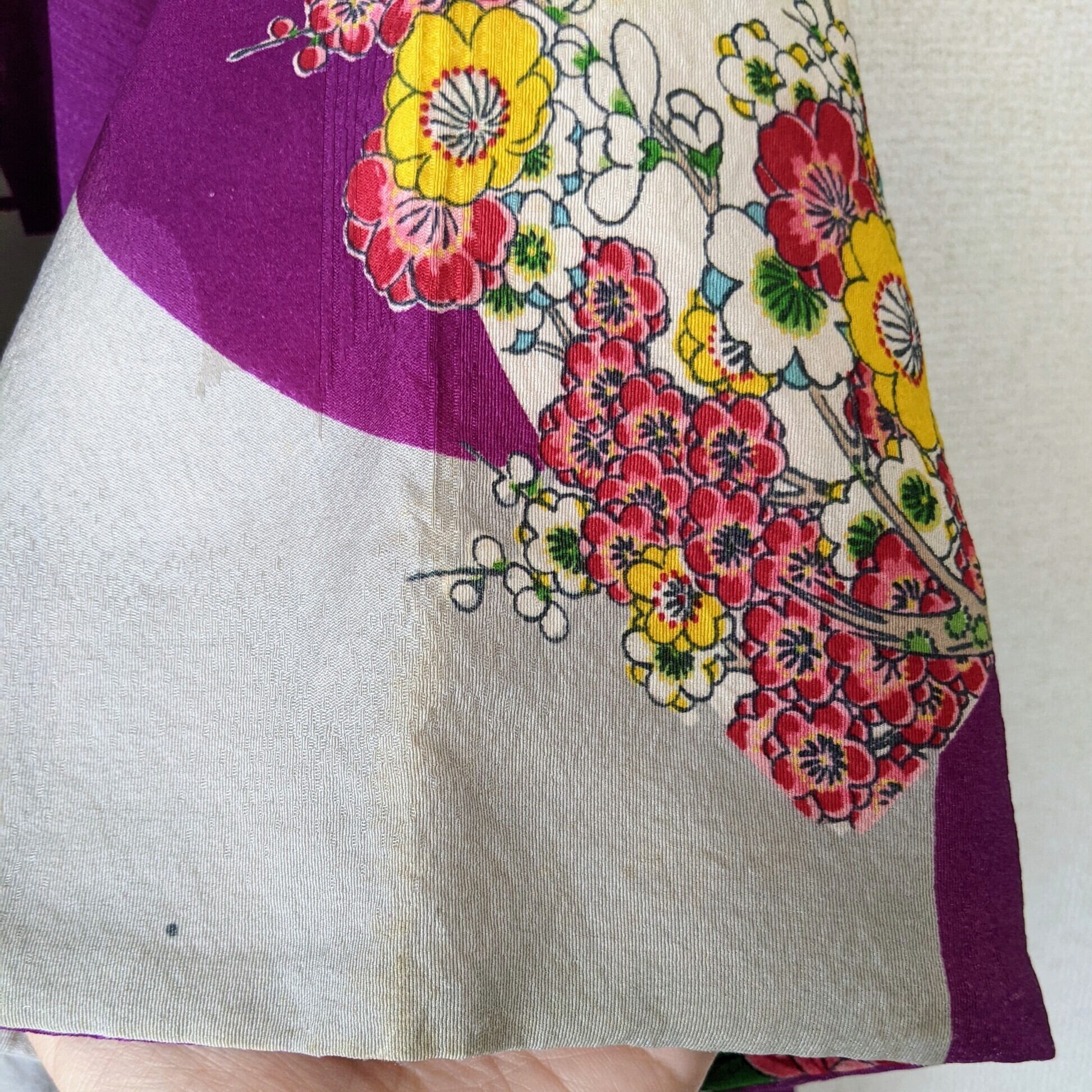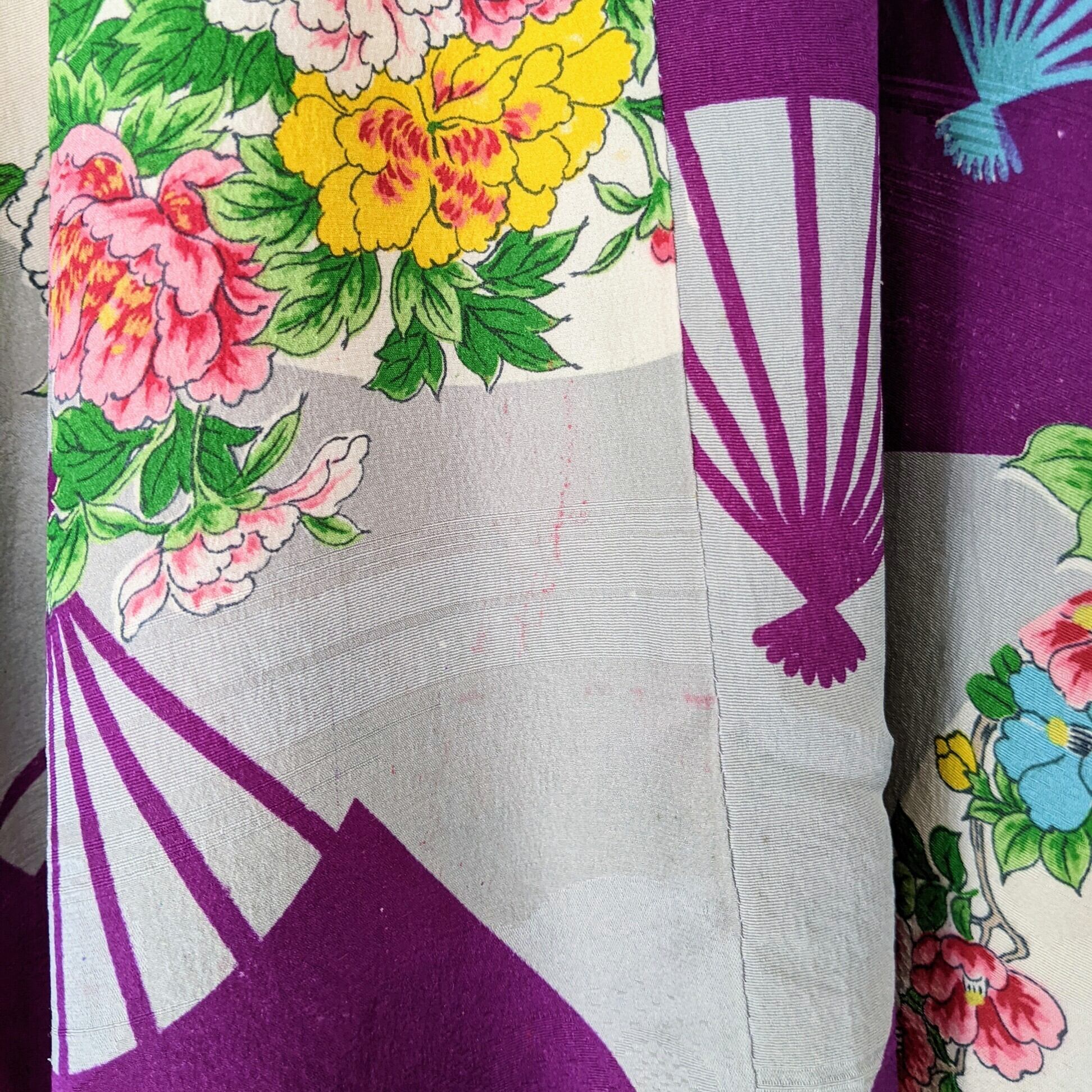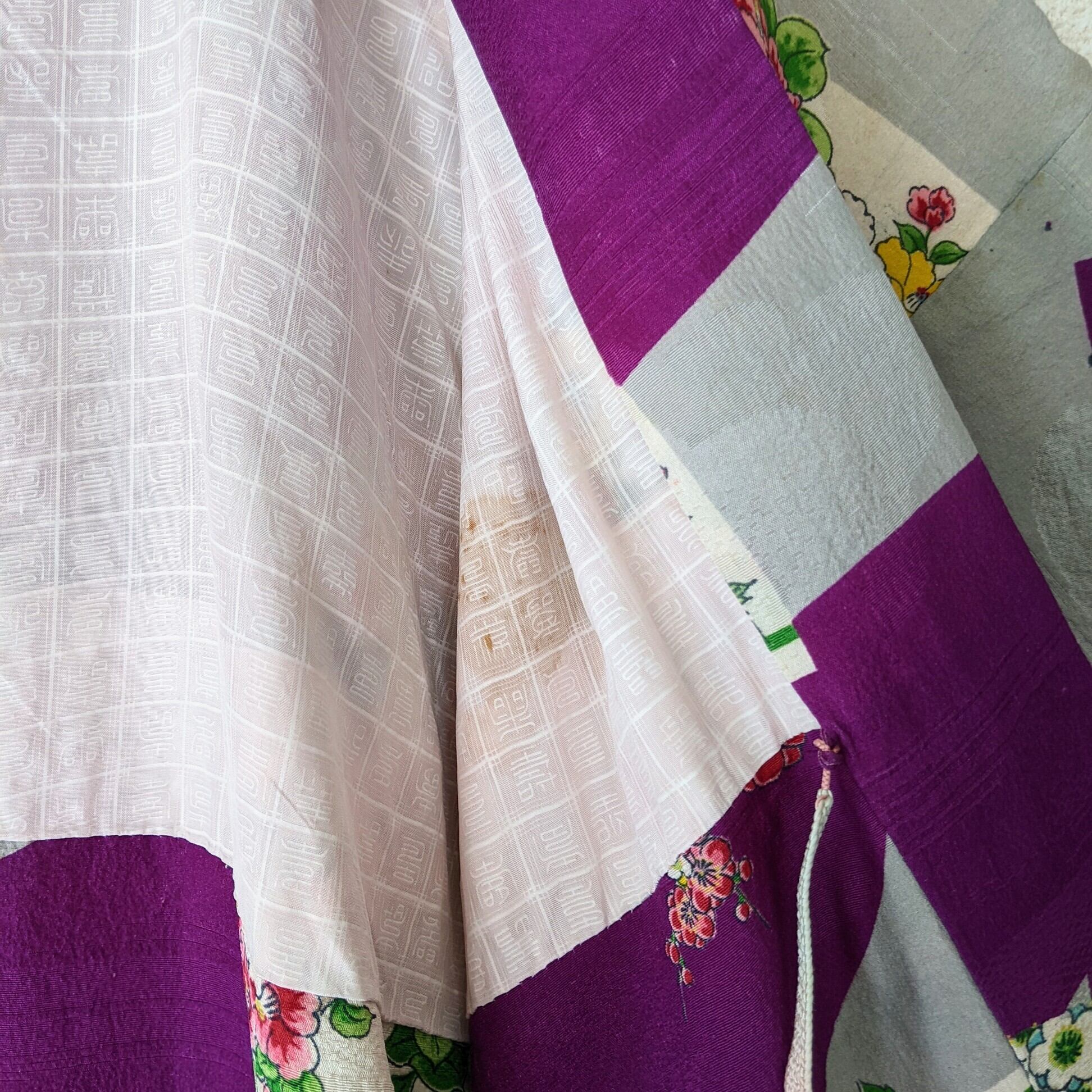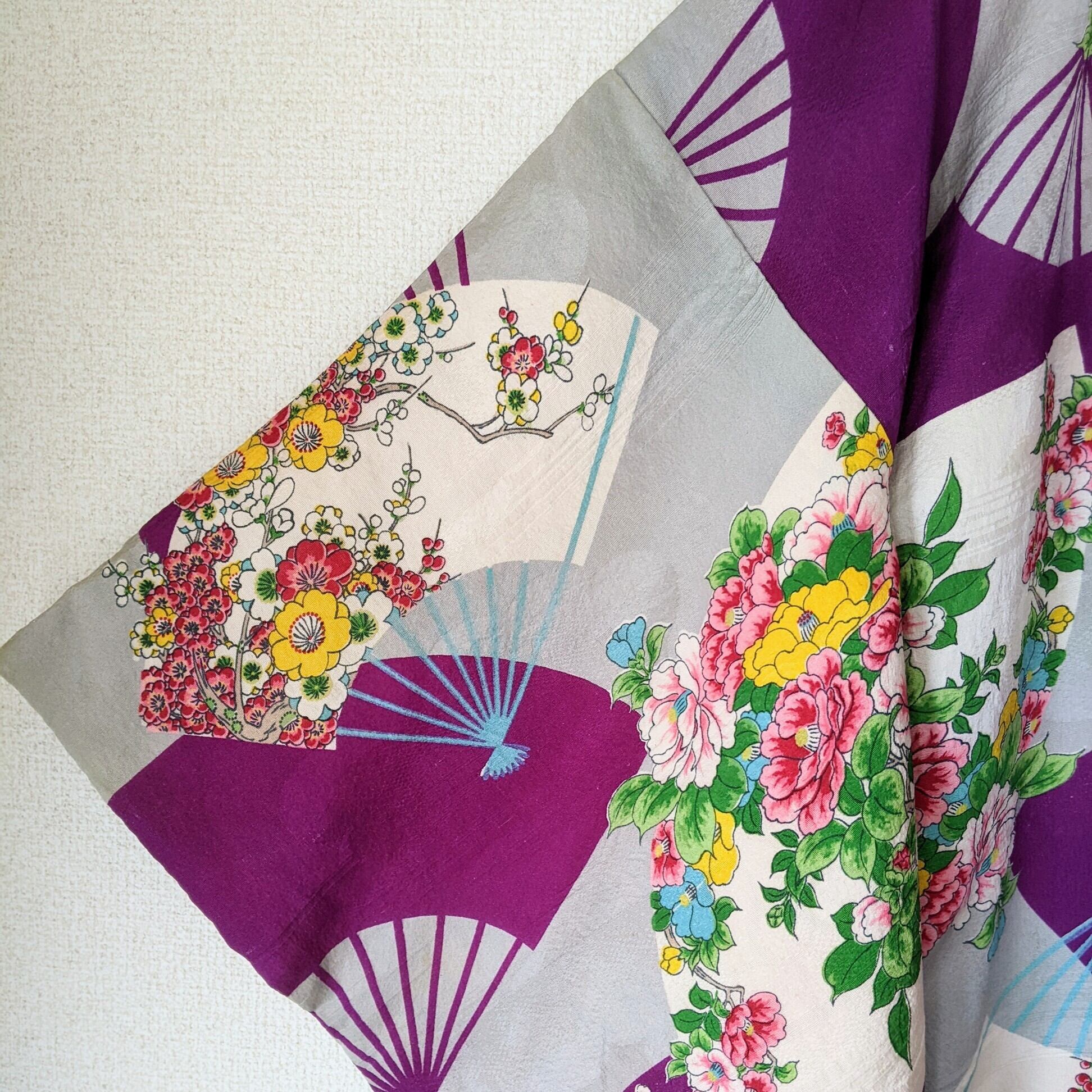 【Vintage】HAORI 長羽織 羽織 正絹 縮緬 銀鼠色(グレー)×紫色 花扇柄 シルク 大正浪漫 和洋折衷