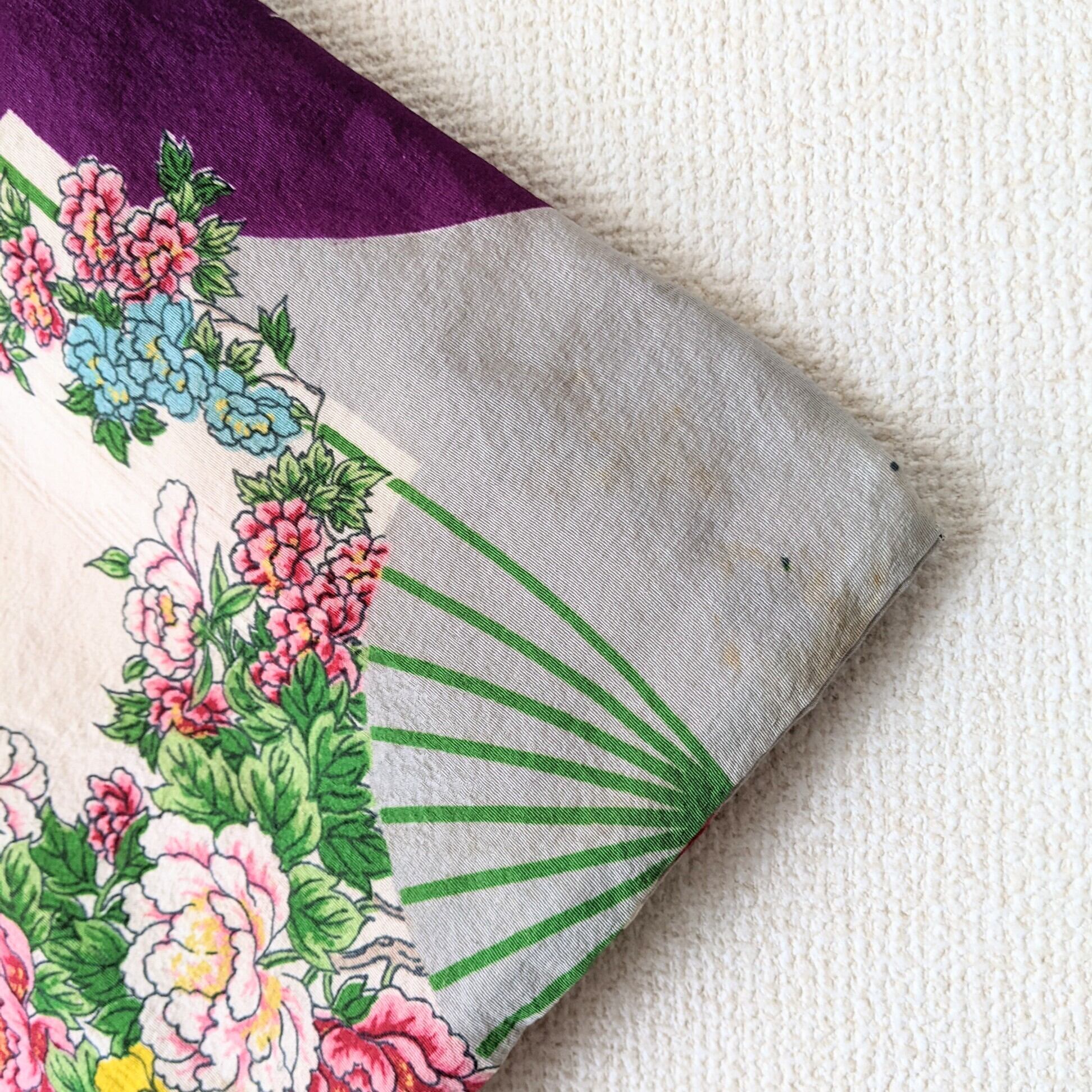柄は扇柄。カラフルな花の扇子と対になった紫一色の扇子の存在感が美しい逸品です。