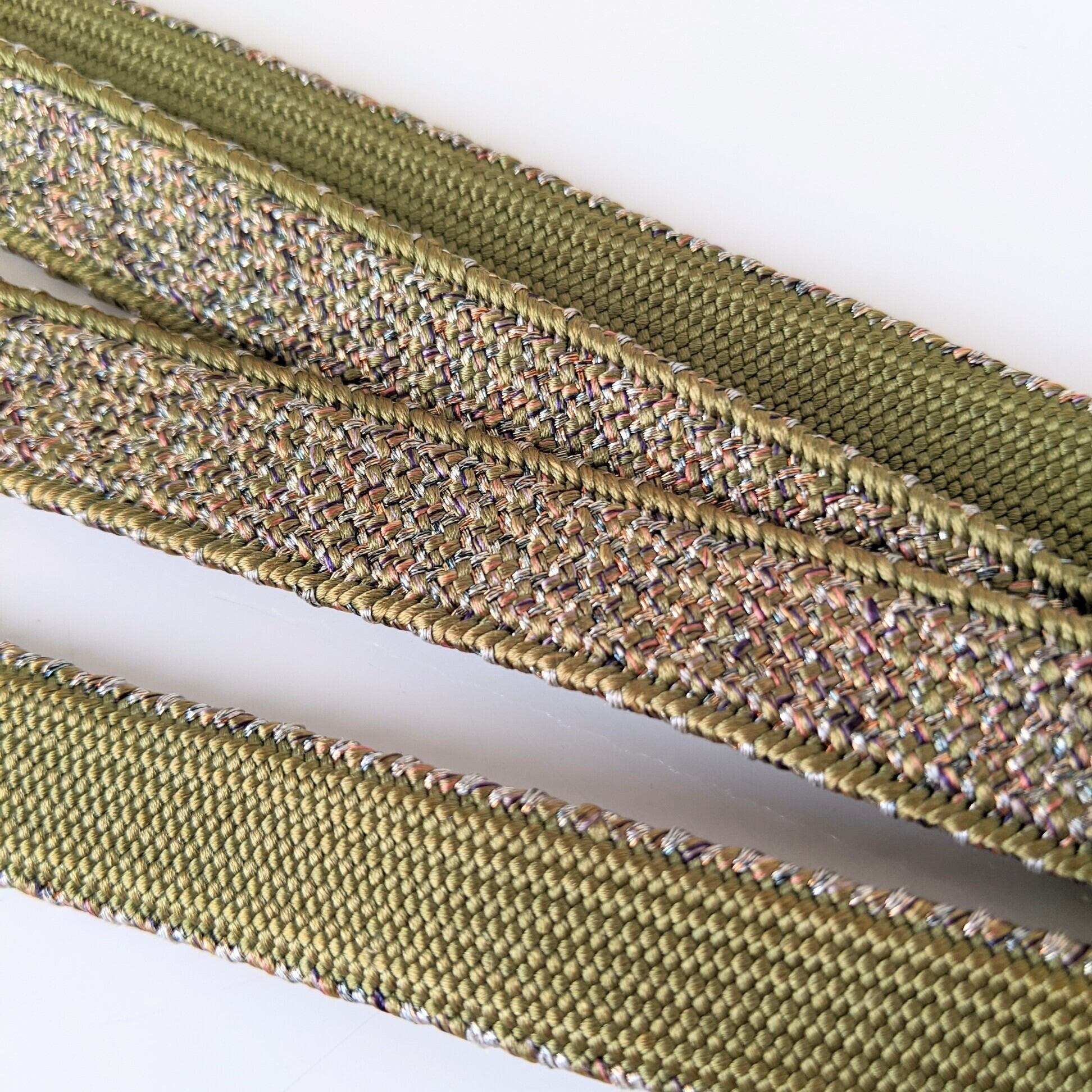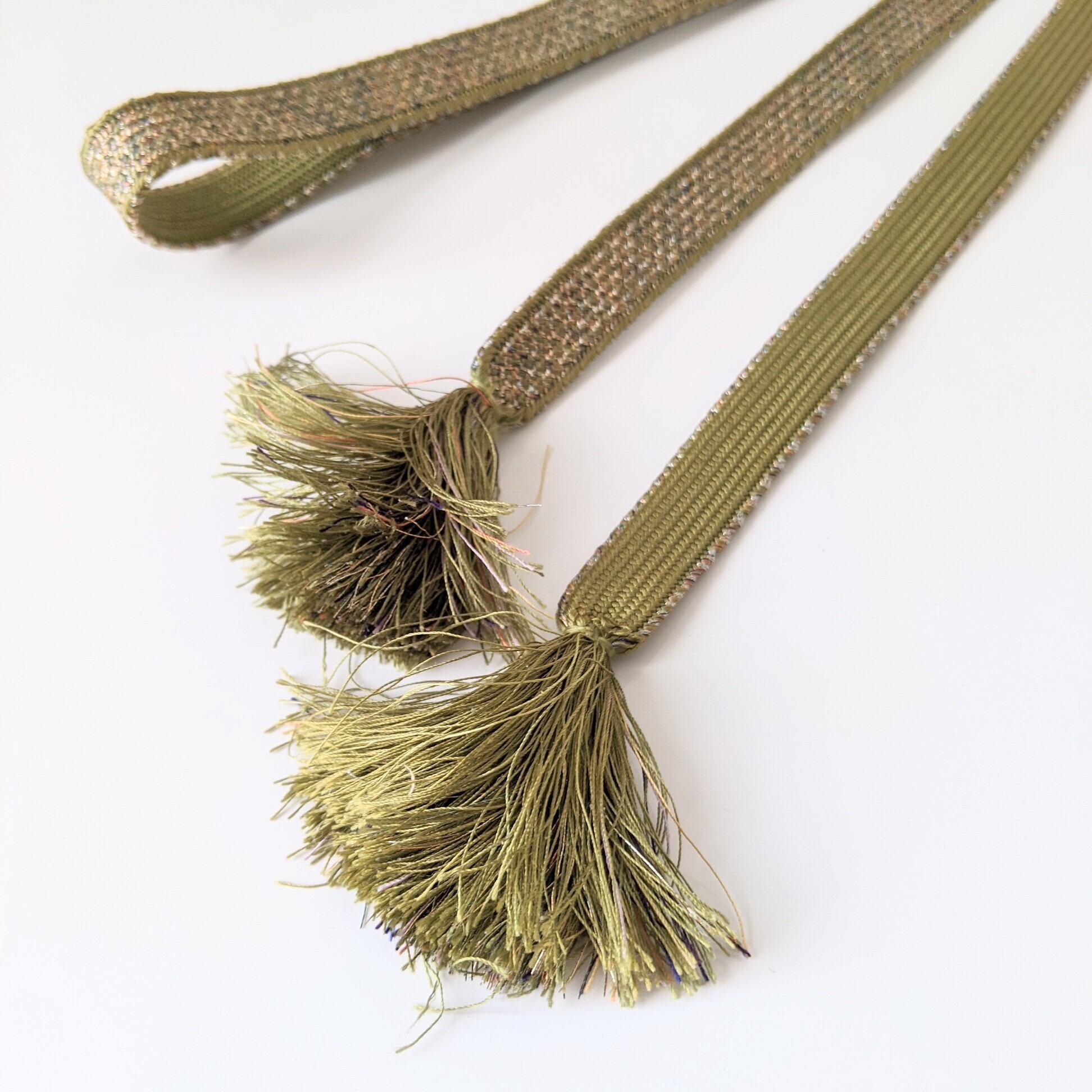 モスグリーン色とラメ糸が表裏の対になっている平組の帯締めです。