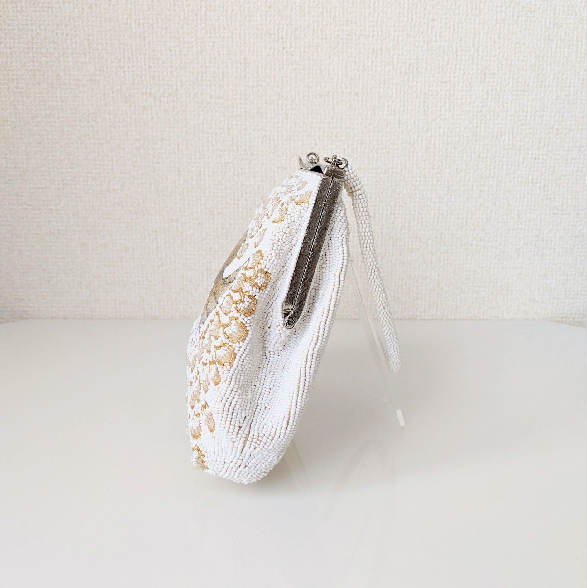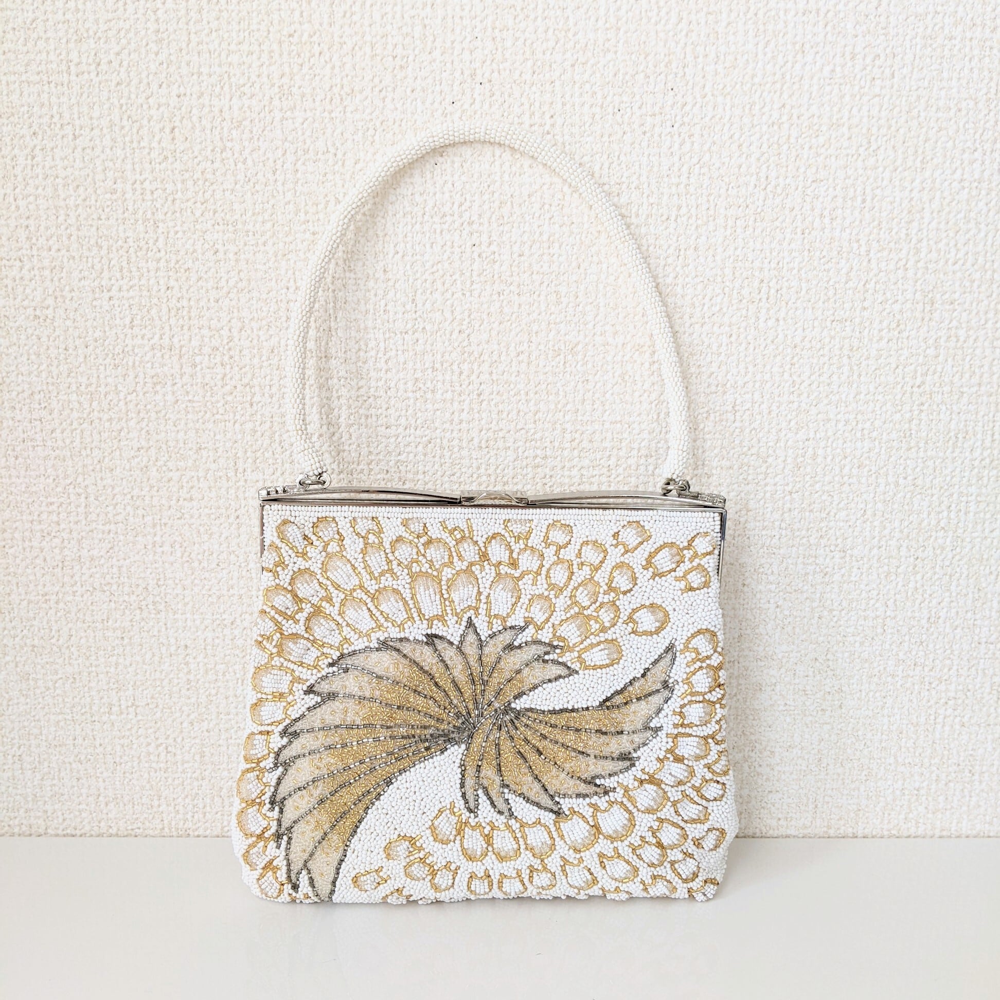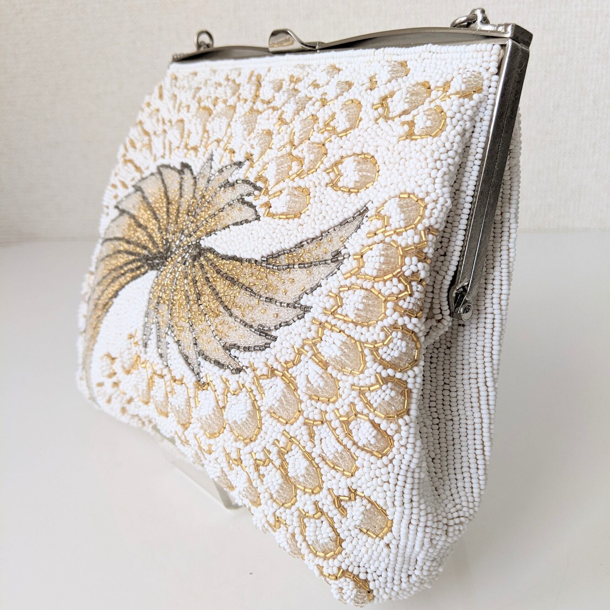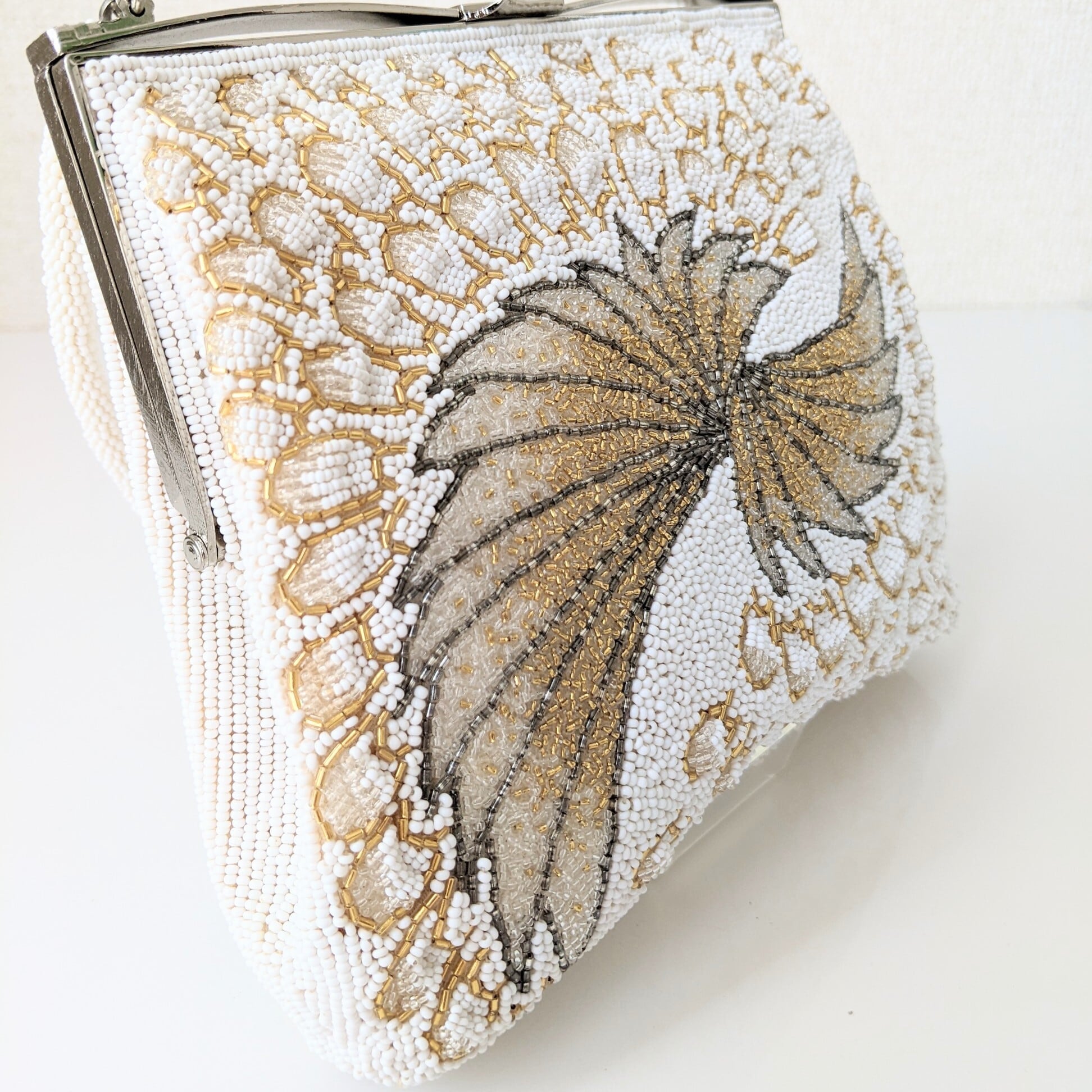 白地に金色の孔雀の羽がバッグ全面にあしらわれた個性的なデザイン。色合いもゴージャスなビーズバッグです。