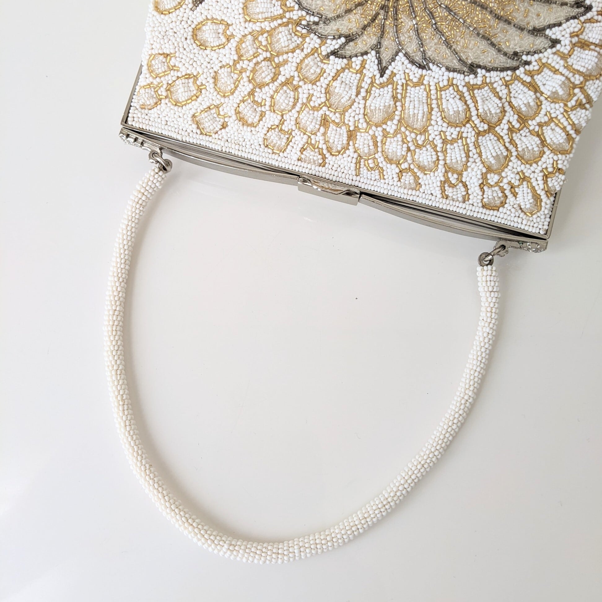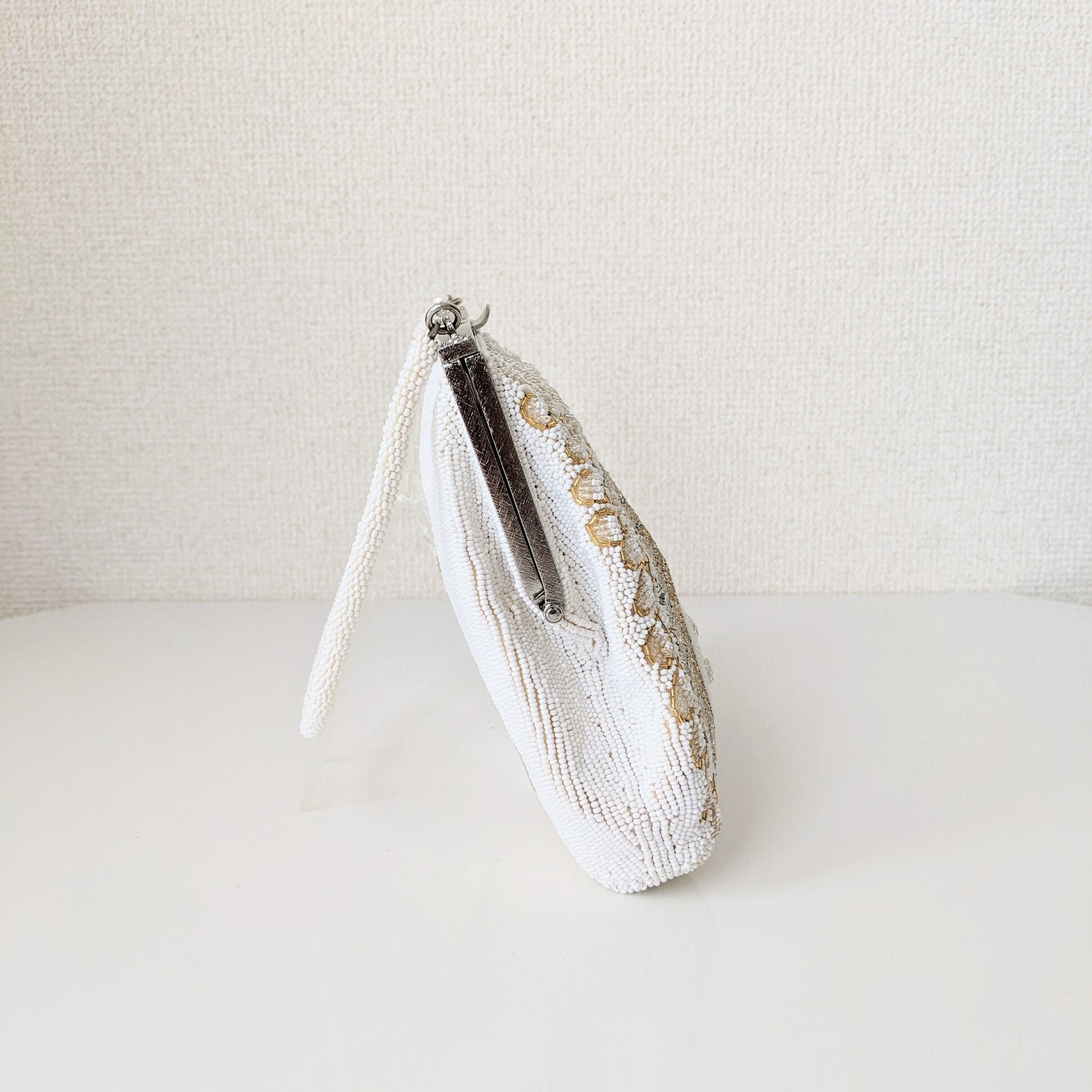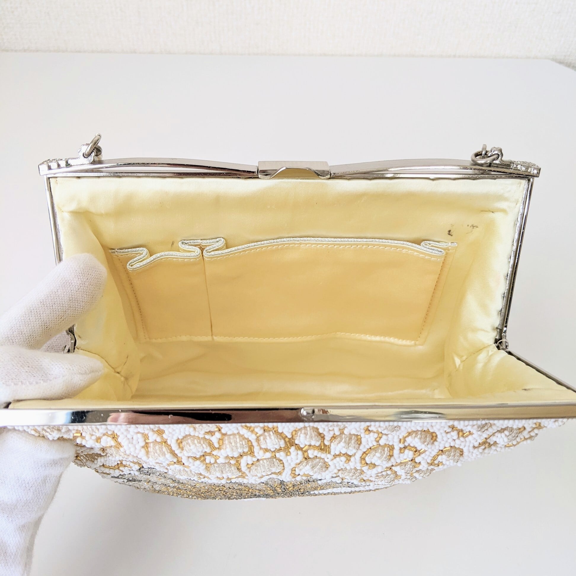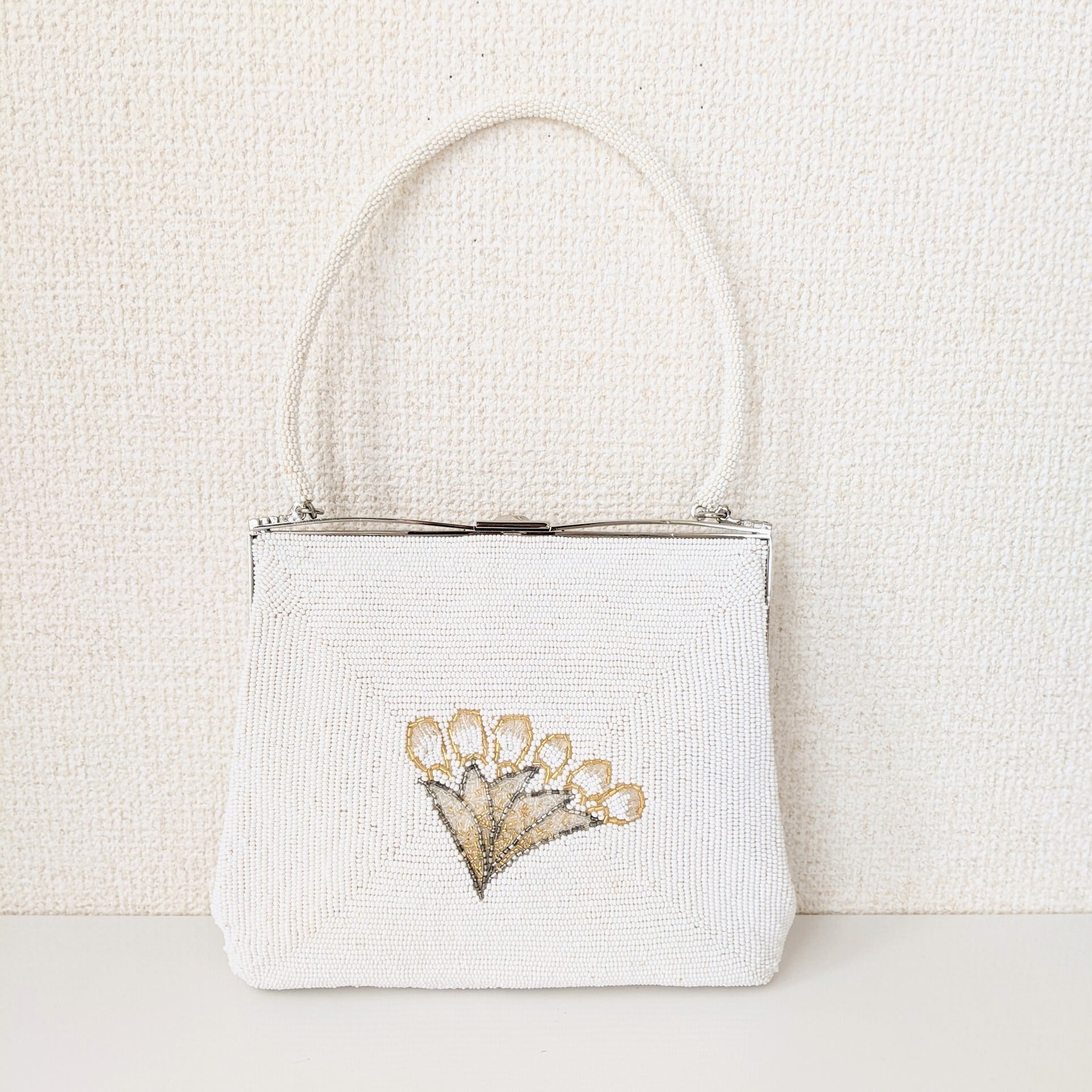 白地に金色の孔雀の羽がバッグ全面にあしらわれた個性的なデザイン。色合いもゴージャスなビーズバッグです。