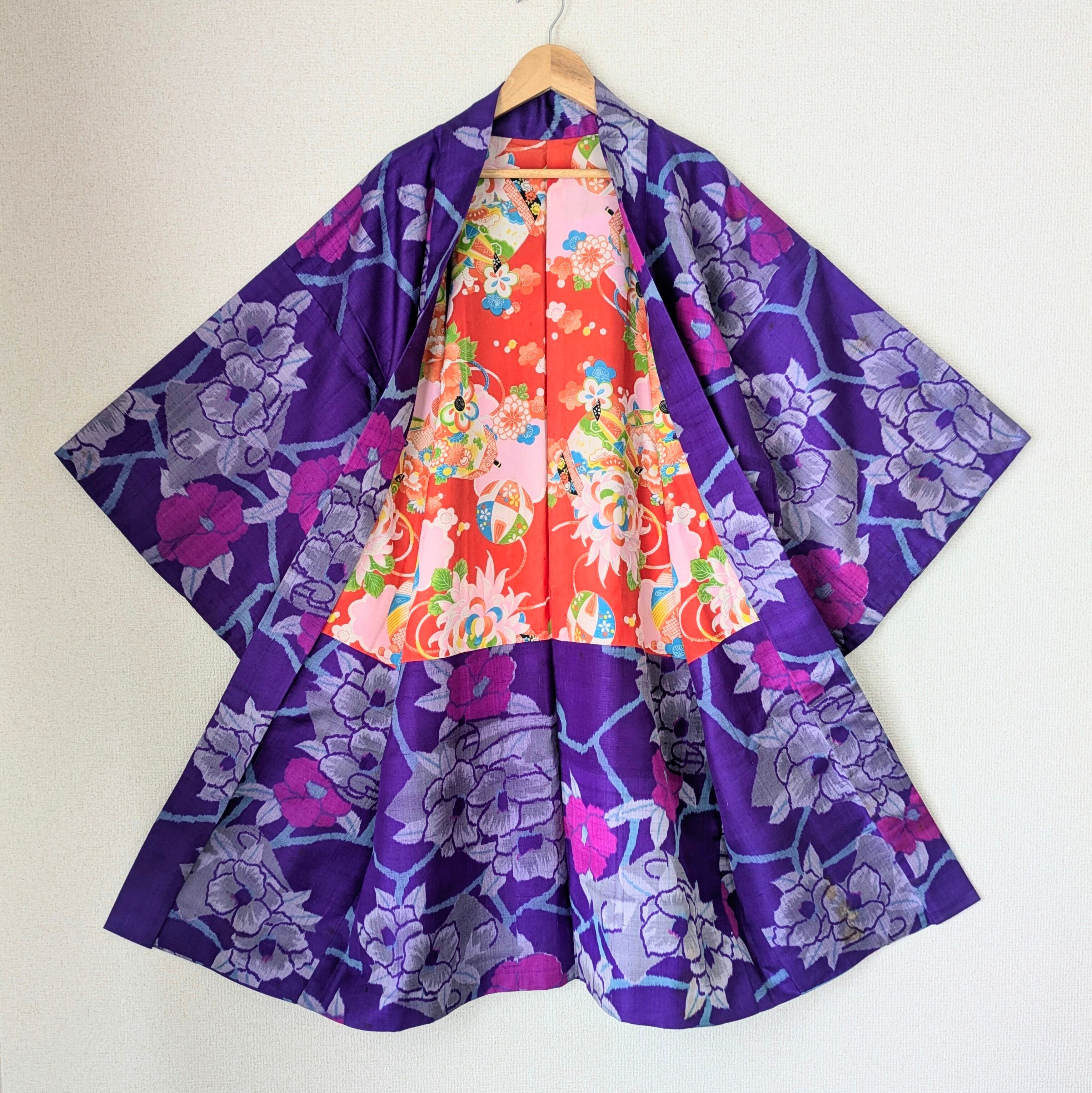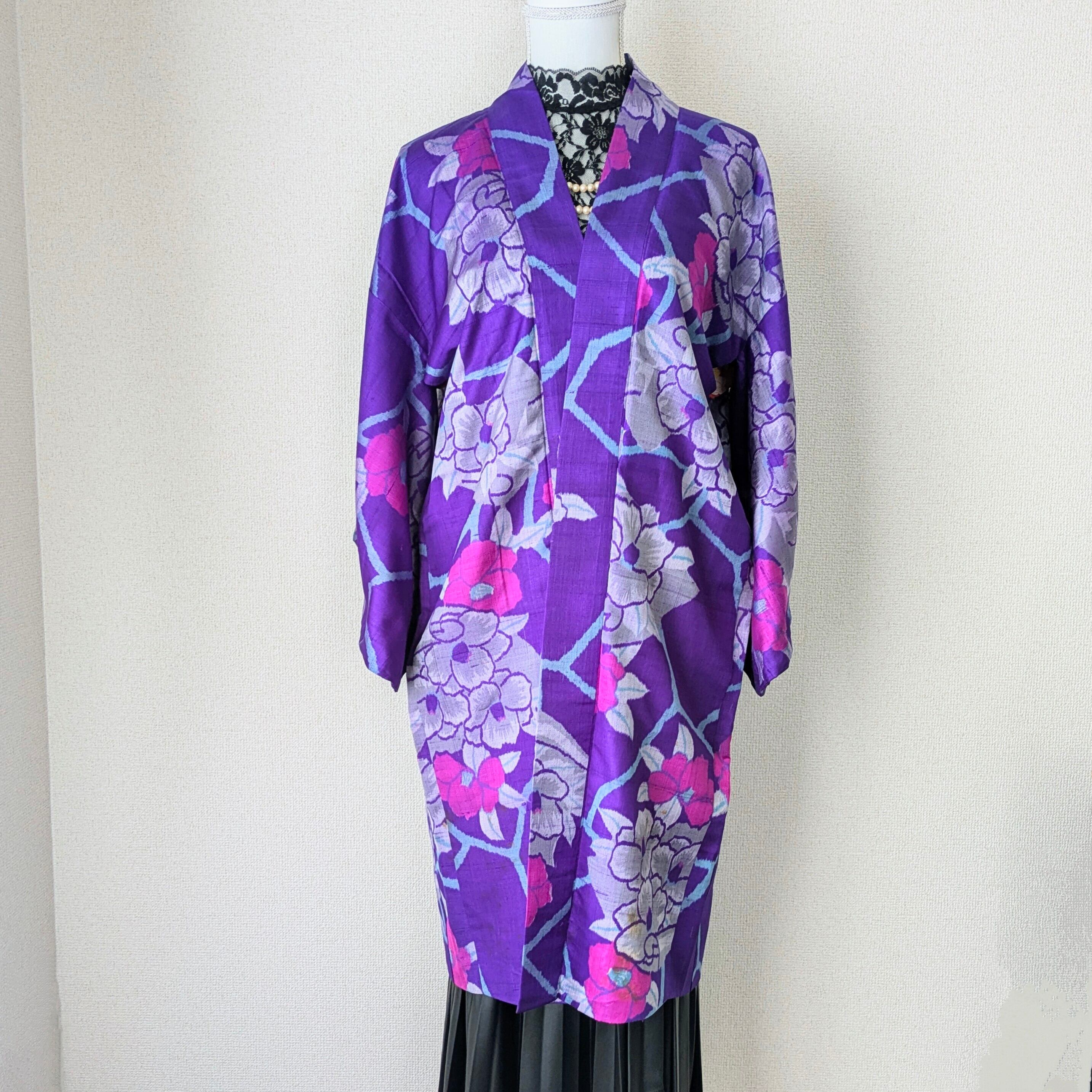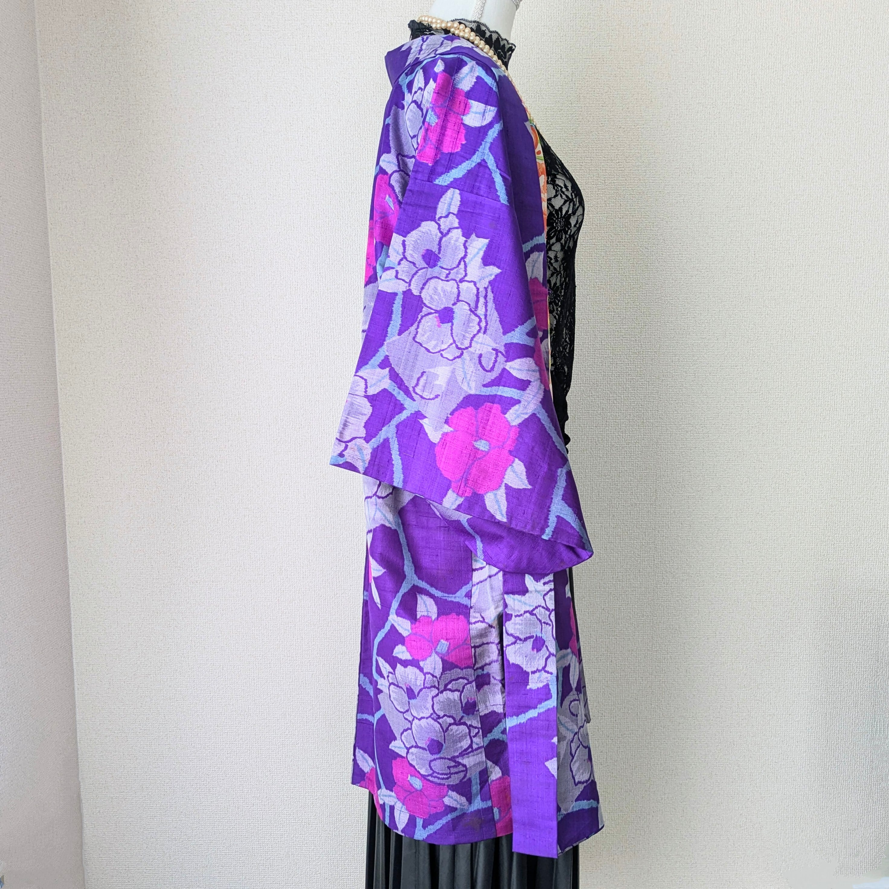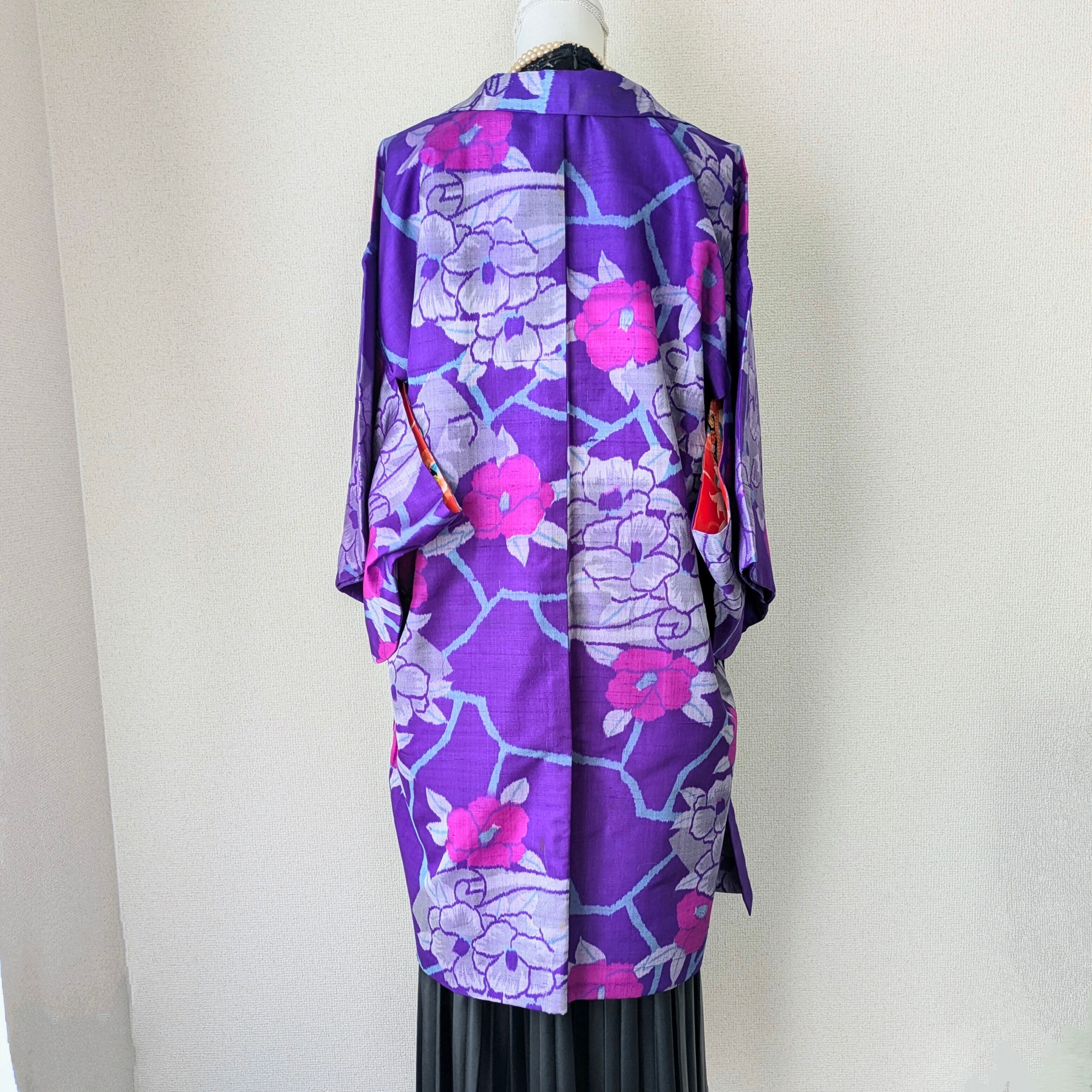 【Vintage】HAORI 長羽織 羽織 正絹 銘仙 紫 椿柄 石畳文 裏地が可愛い シルク 大正浪漫 和洋折衷