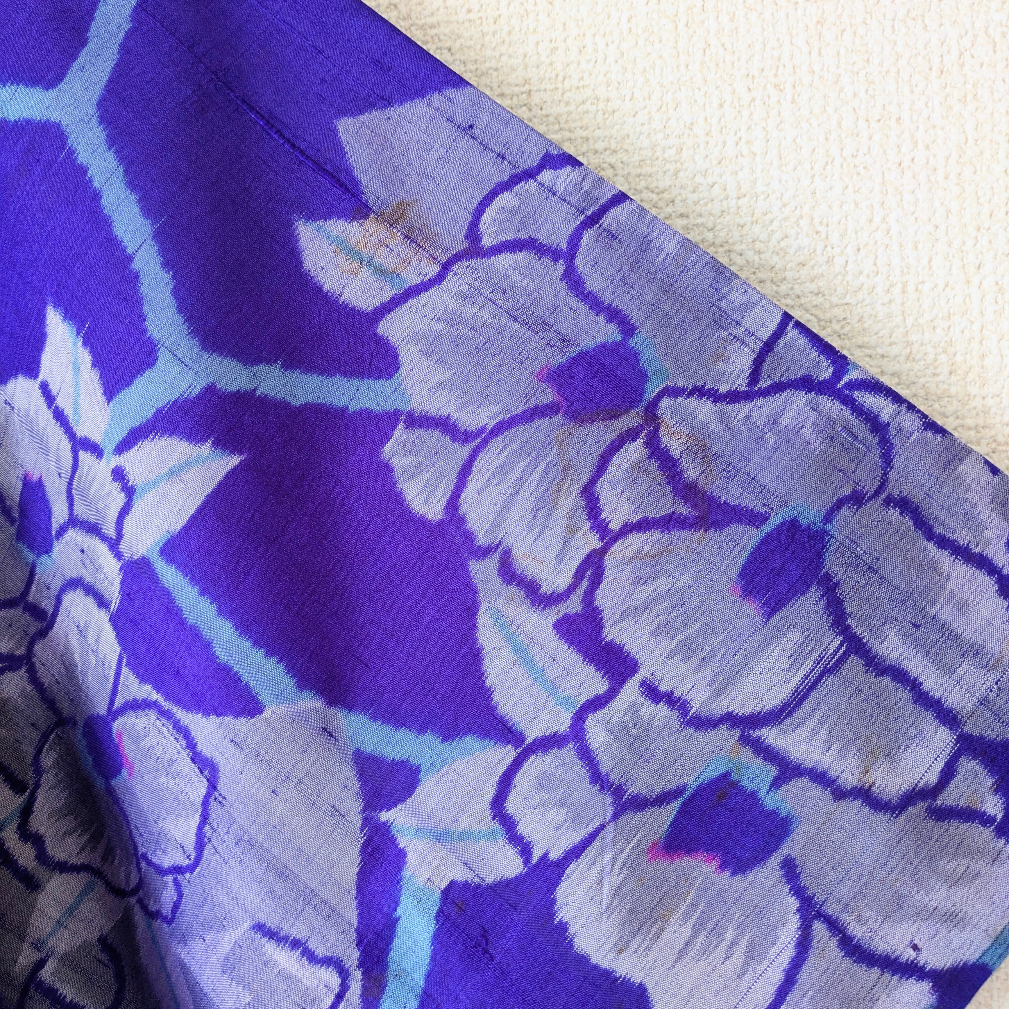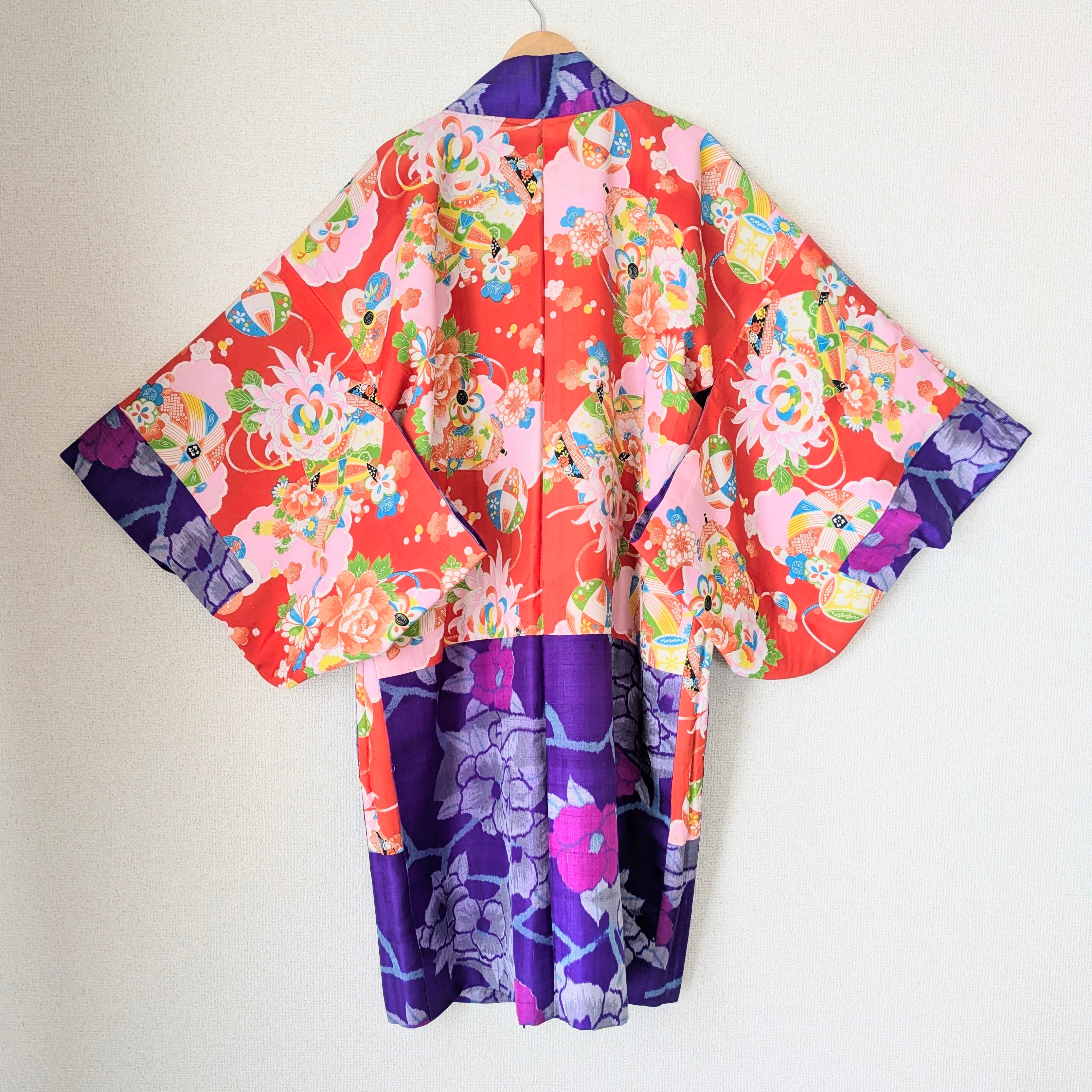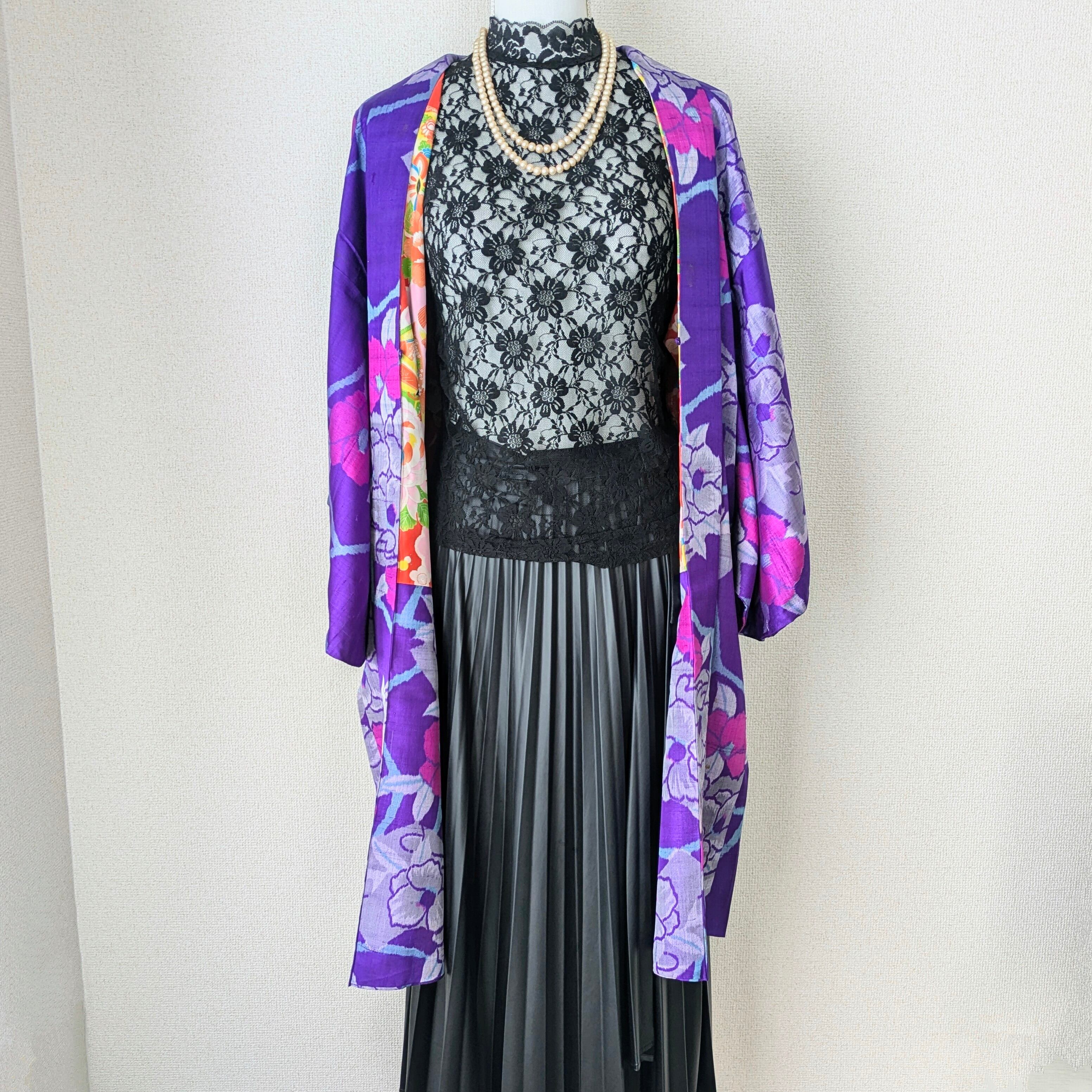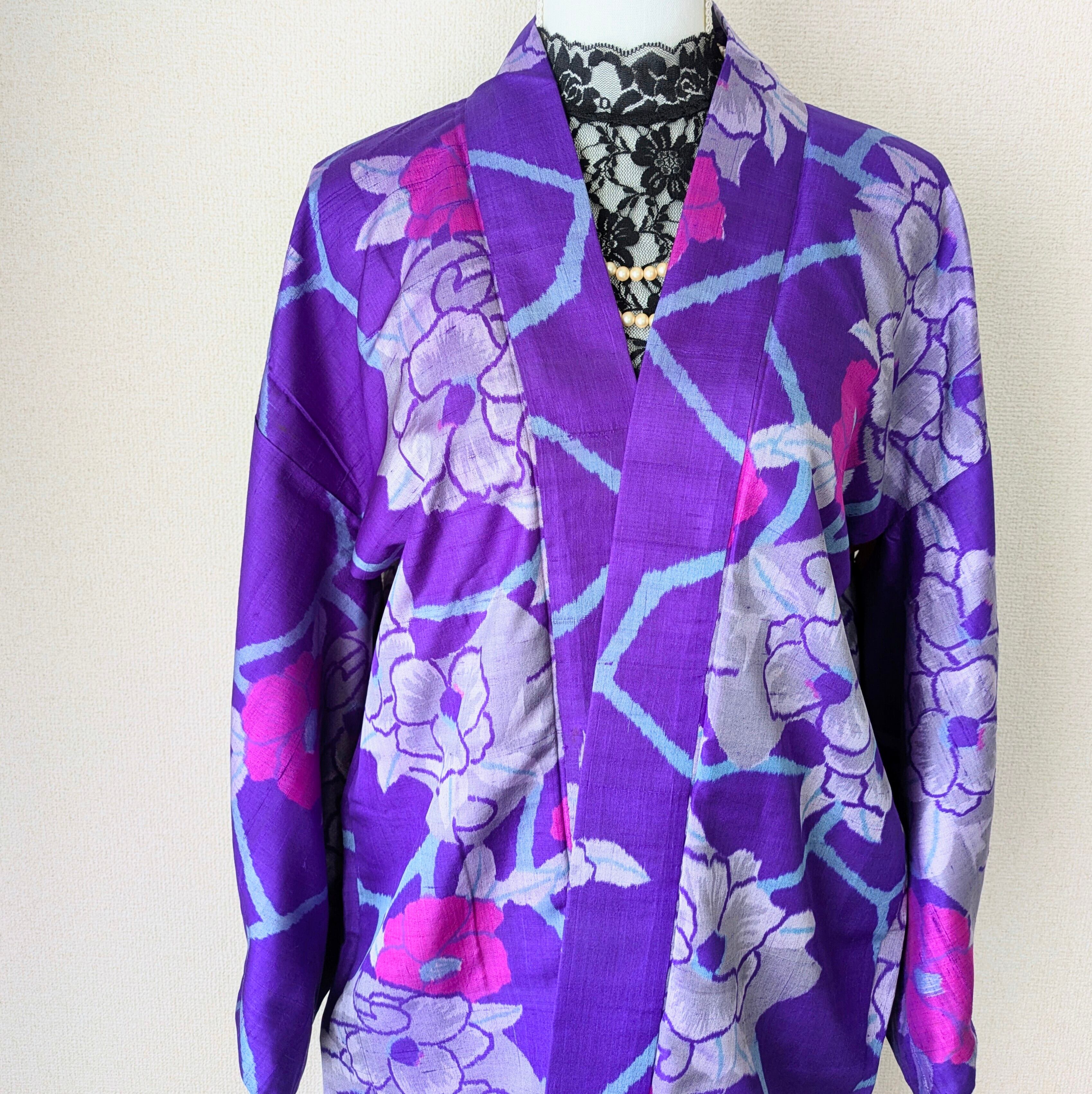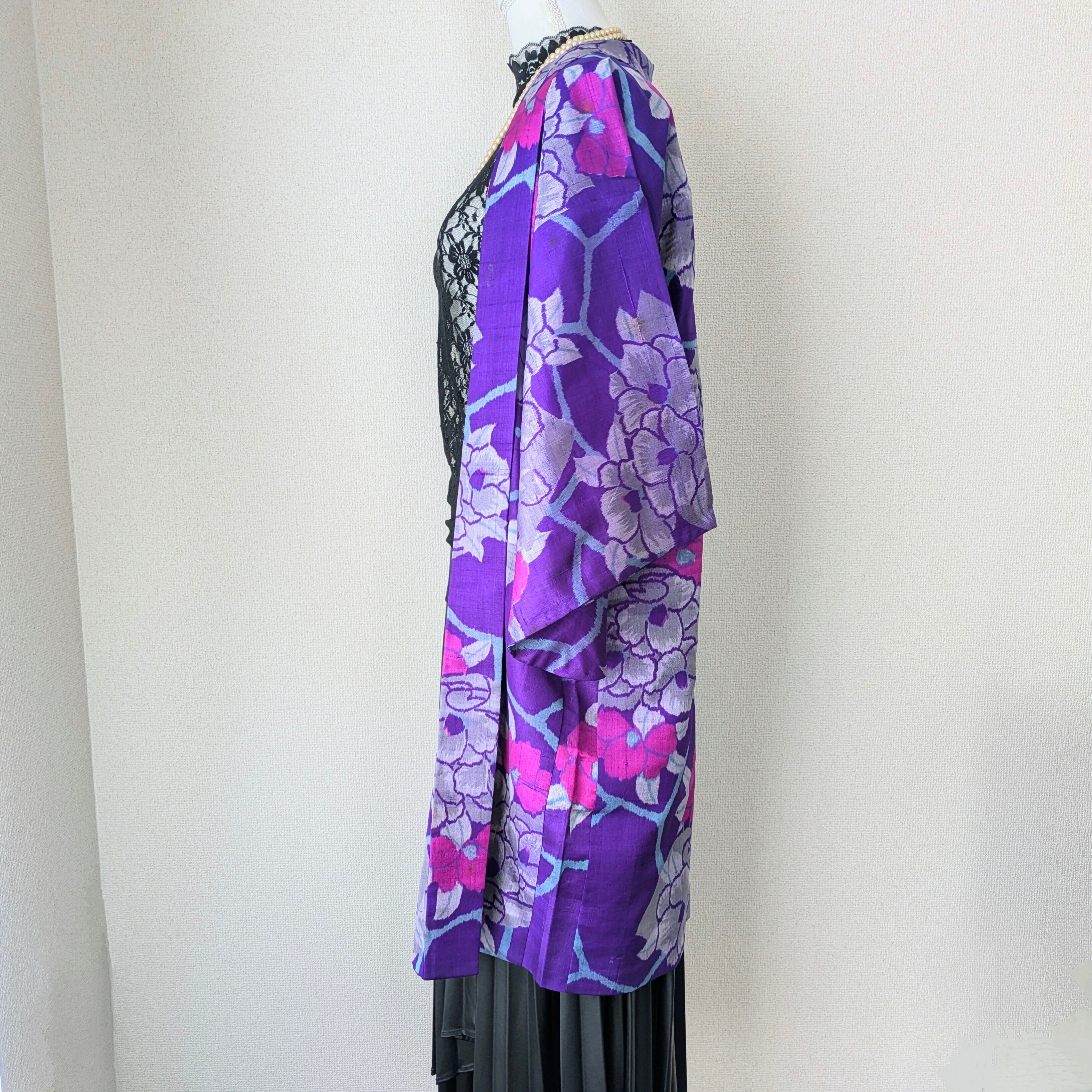 【Vintage】HAORI 長羽織 羽織 正絹 銘仙 紫 椿柄 石畳文 裏地が可愛い シルク 大正浪漫 和洋折衷