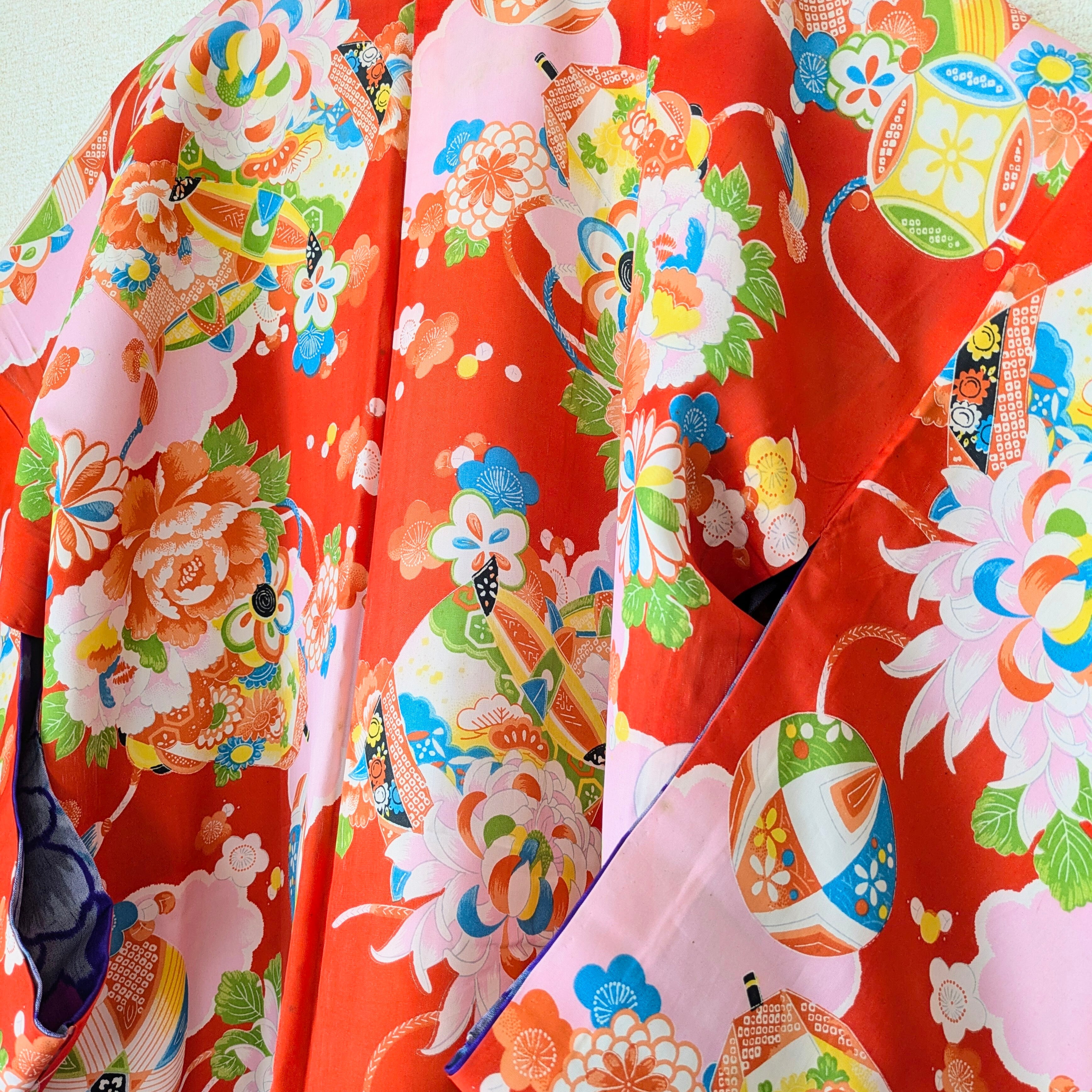 裏地は極彩色の花々や手毬の絵柄の入った可愛らしい裏地です。