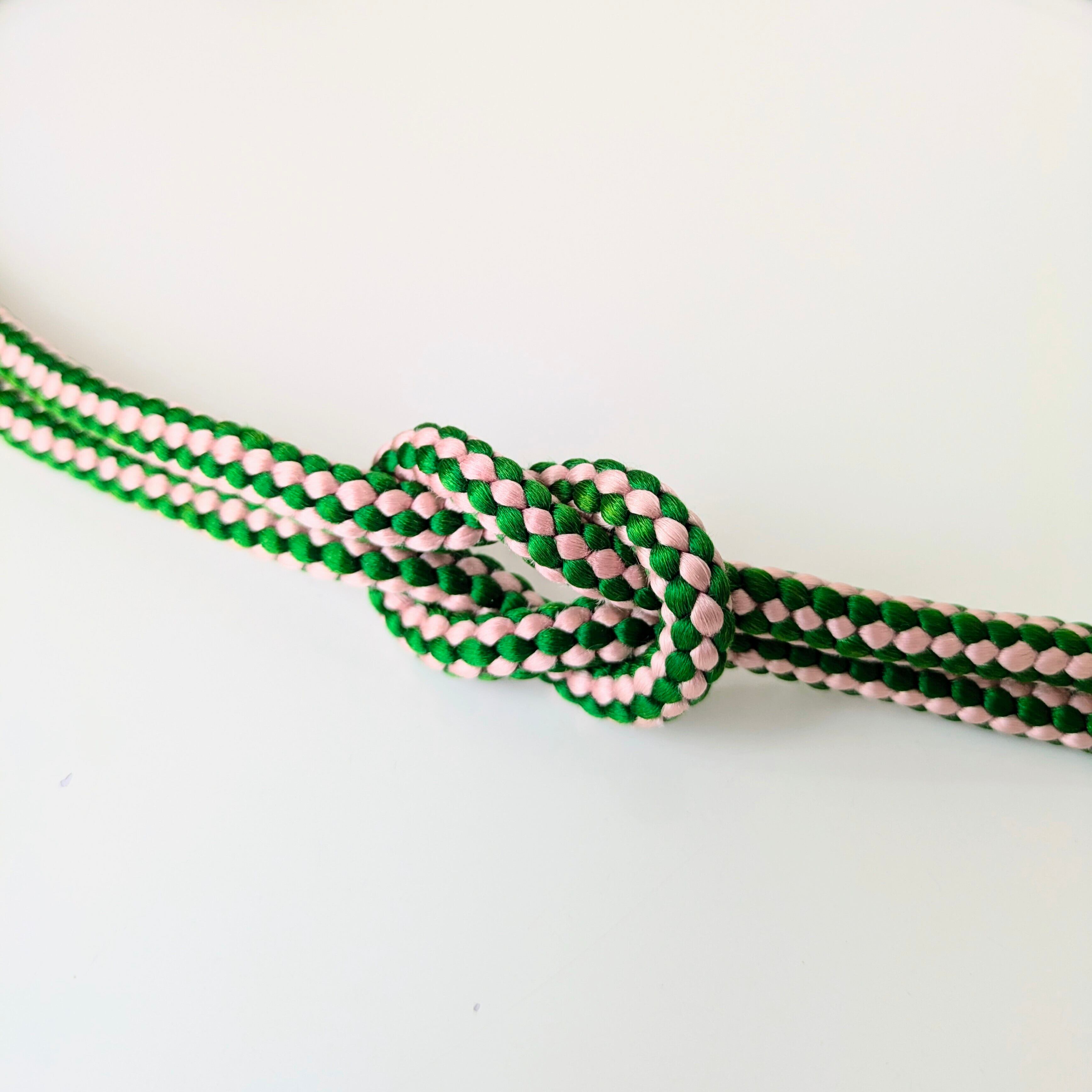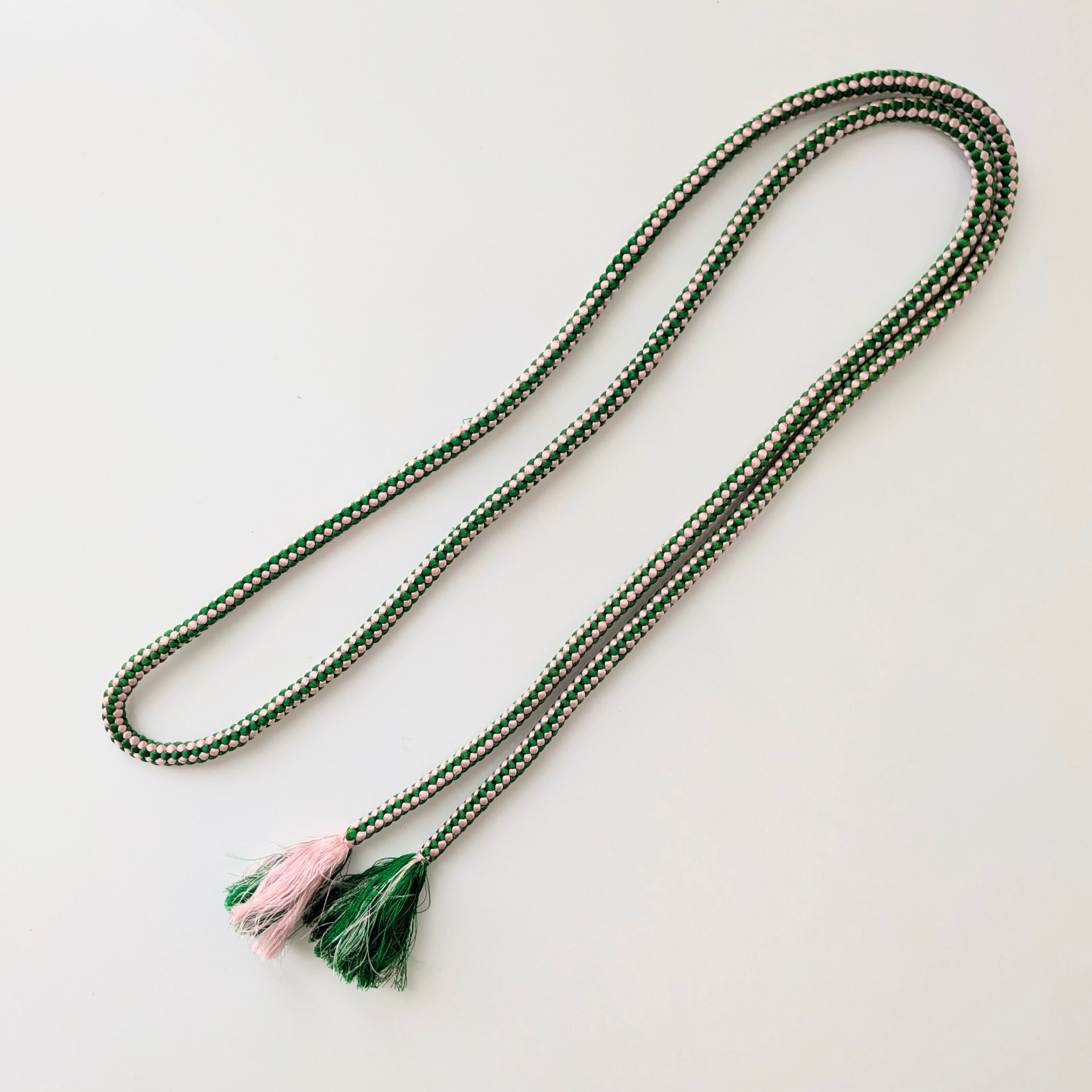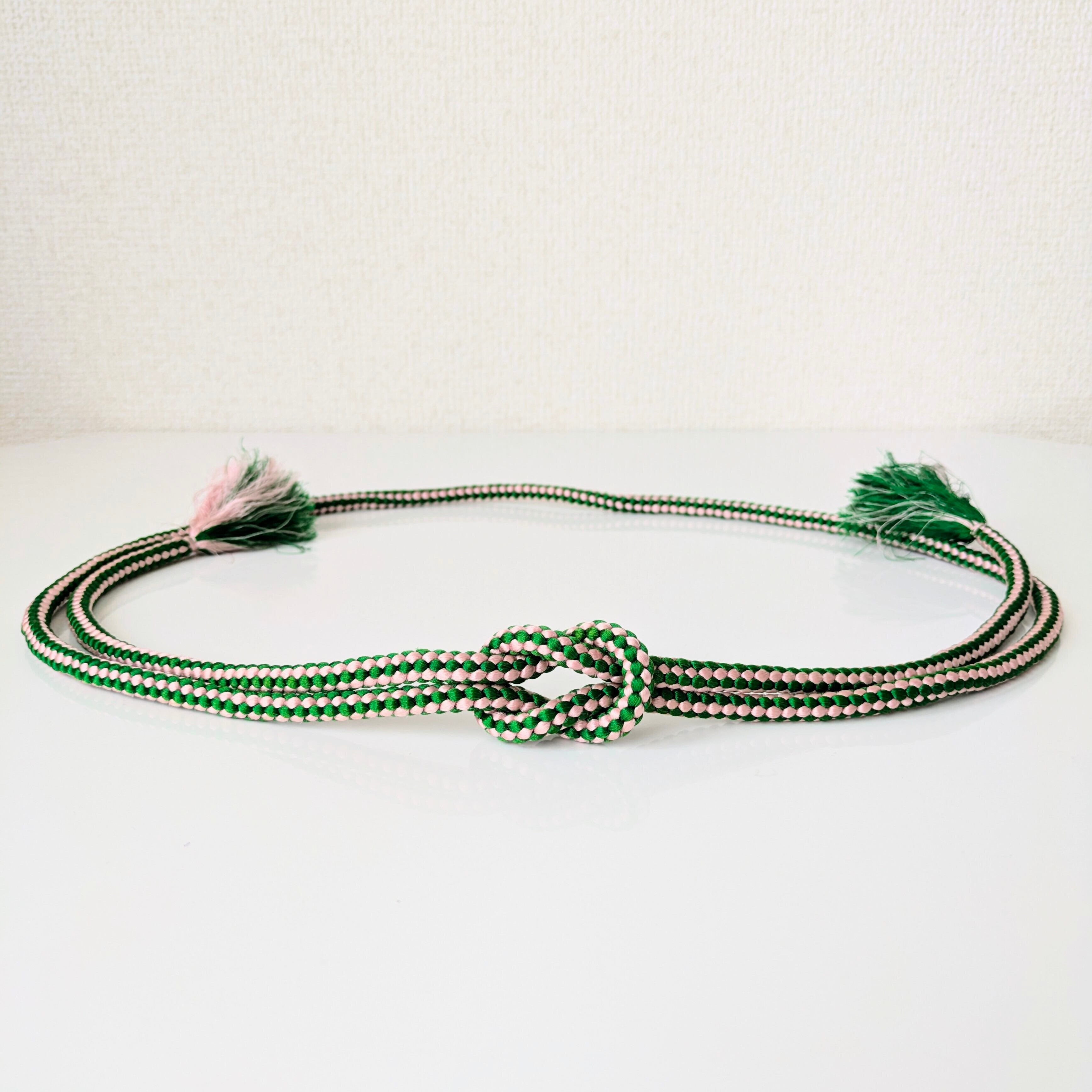 ピンクとグリーンの色の組み合わせが新鮮な丸組(八つ組)の帯締めです。弾力性があり結びやすいお品です。