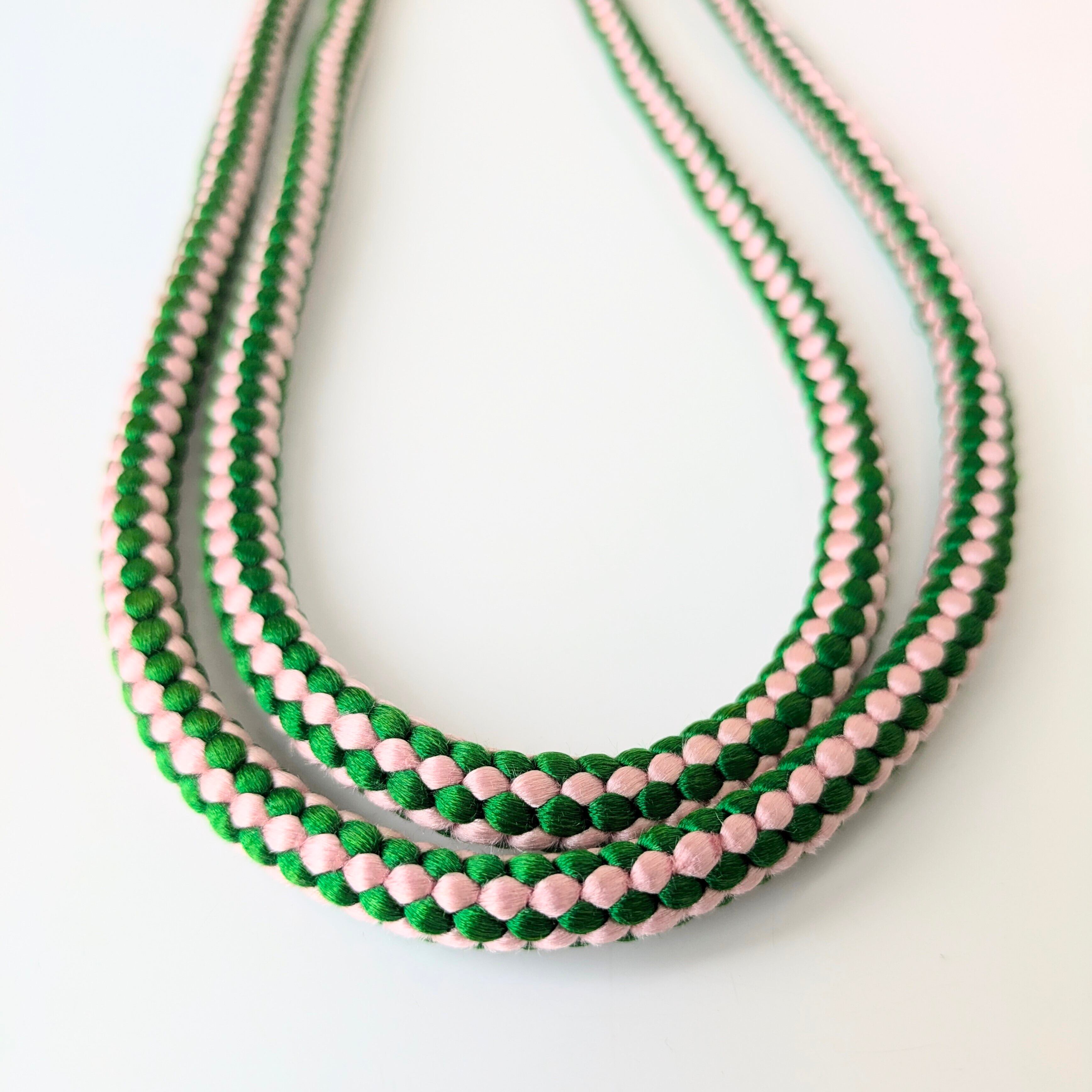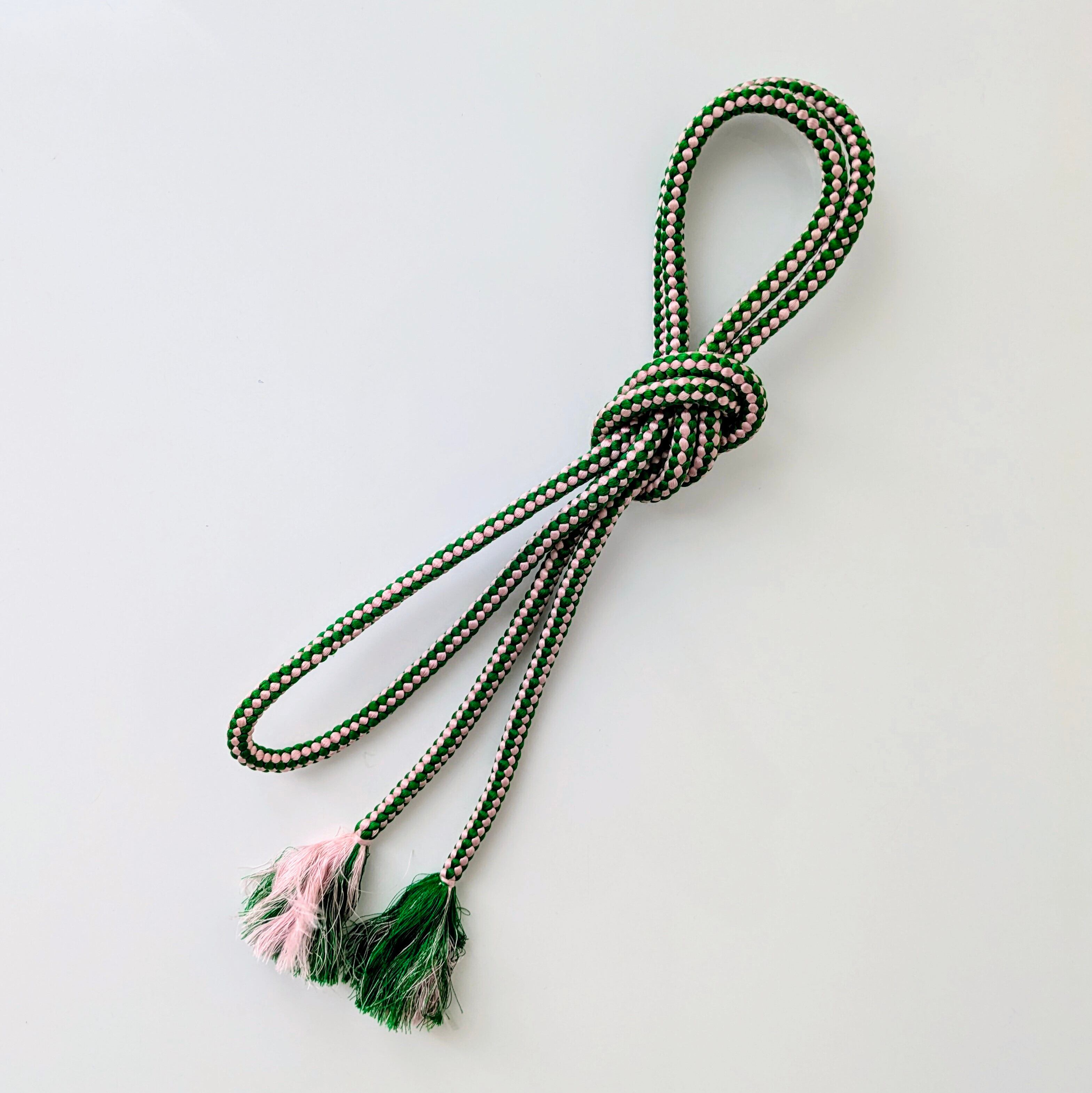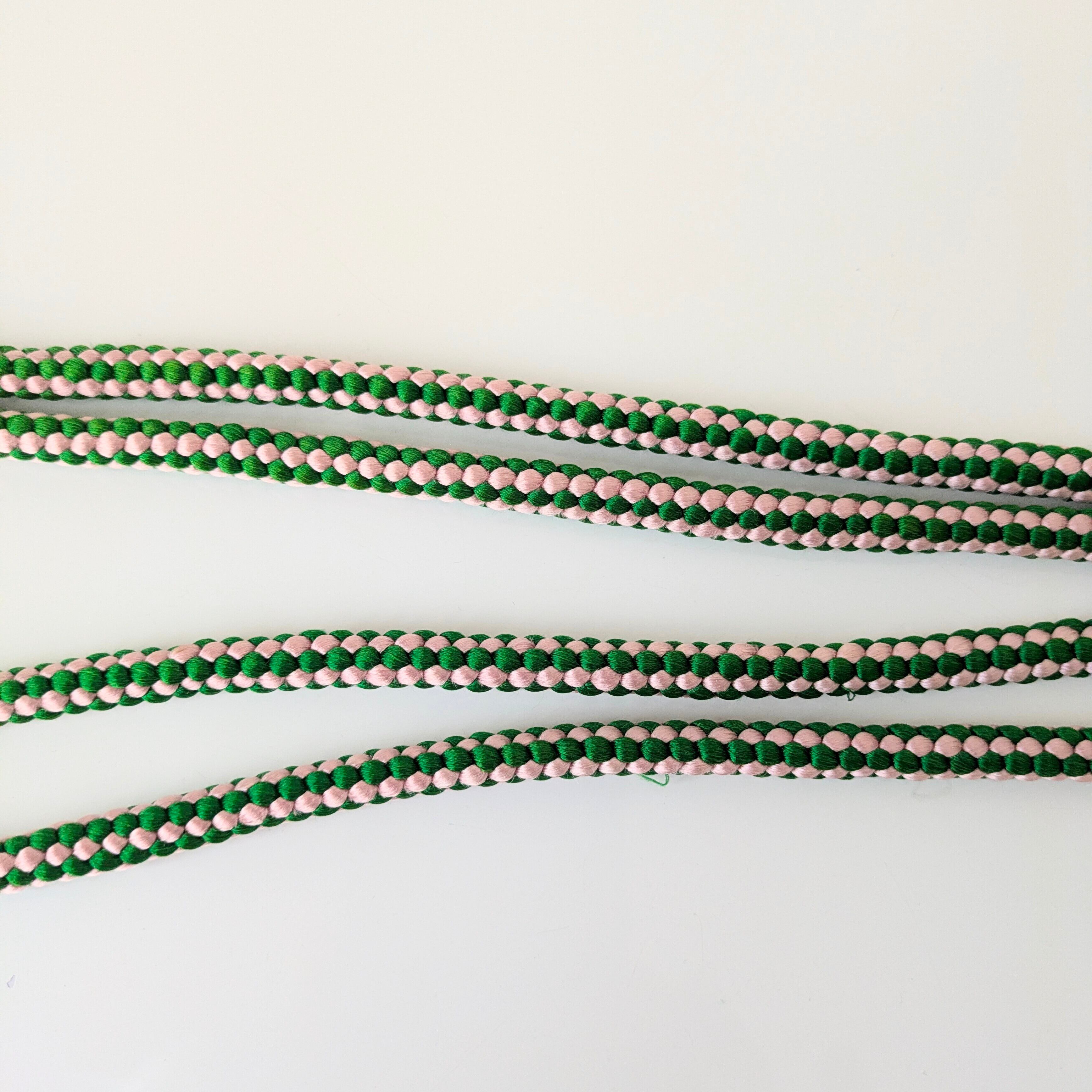 ピンクとグリーンの色の組み合わせが新鮮な丸組(八つ組)の帯締めです。弾力性があり結びやすいお品です。