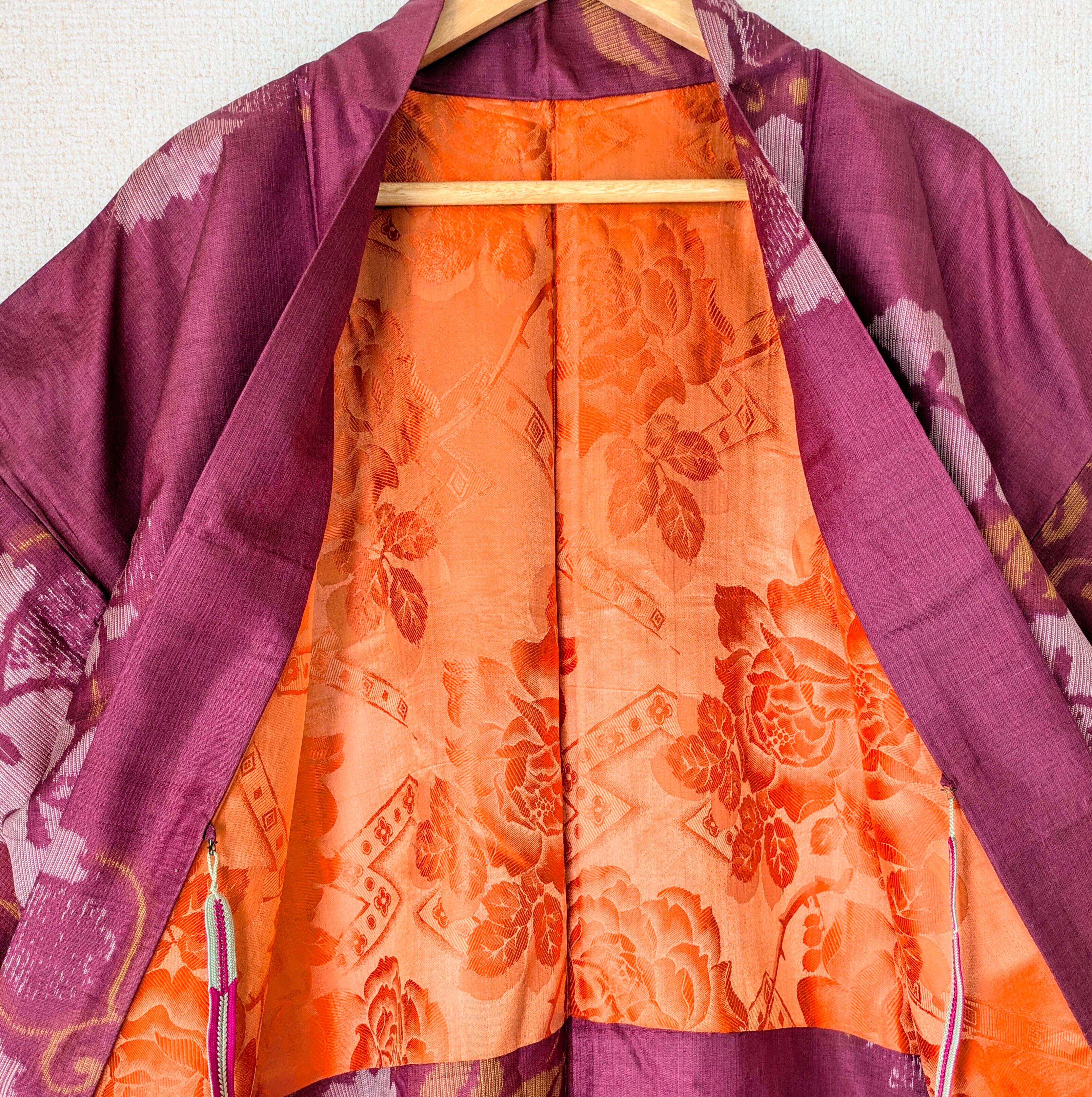 赤紫蘇のような赤紫色の地色に花丸文様が描かれた銘仙の長羽織です。羽裏の鮮やかなオレンジ色が映えます。