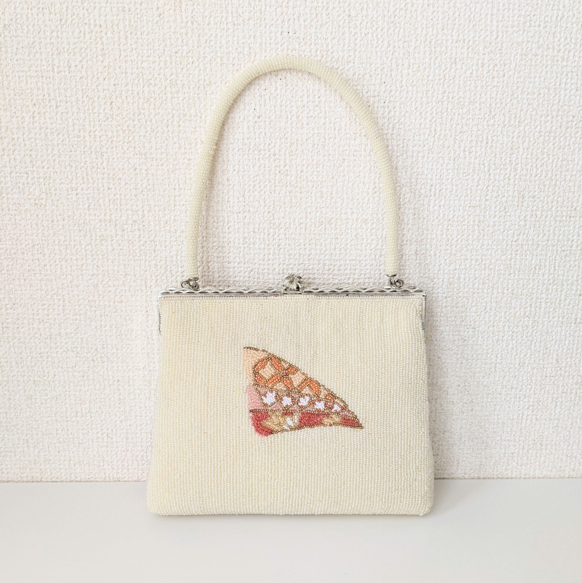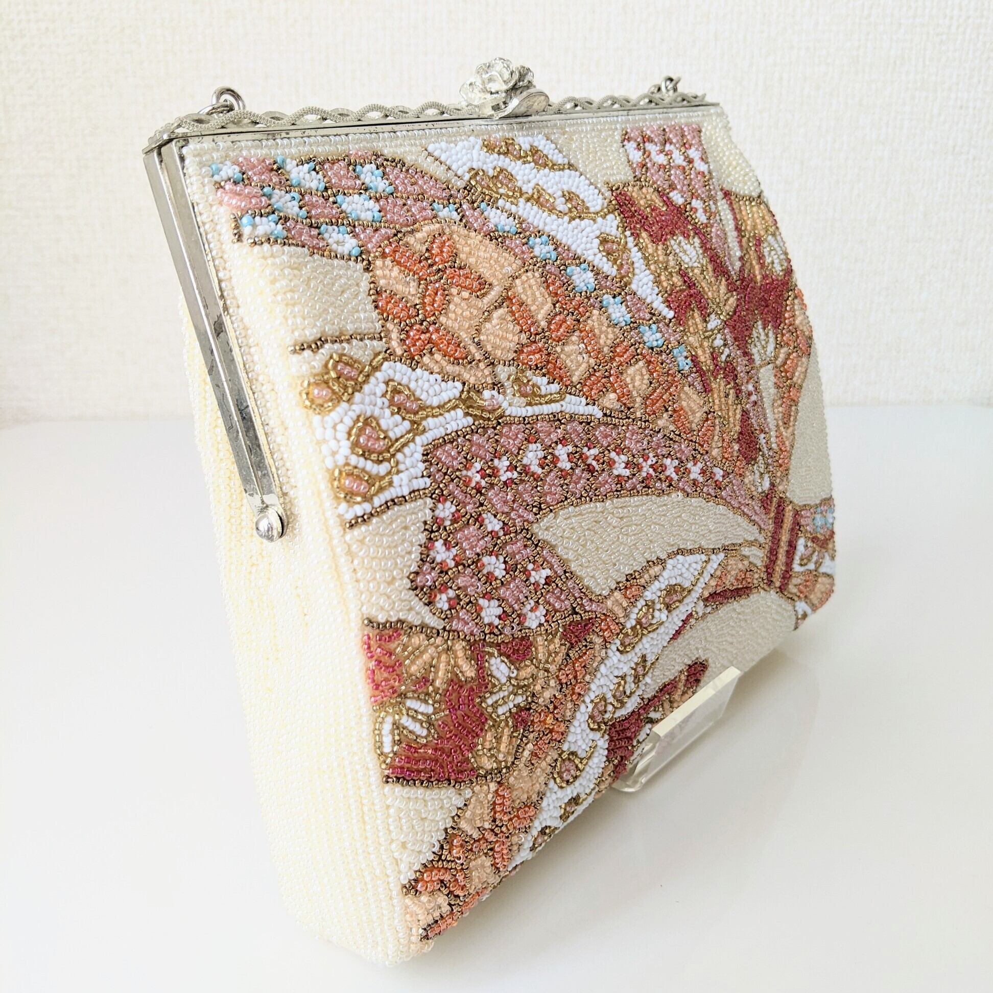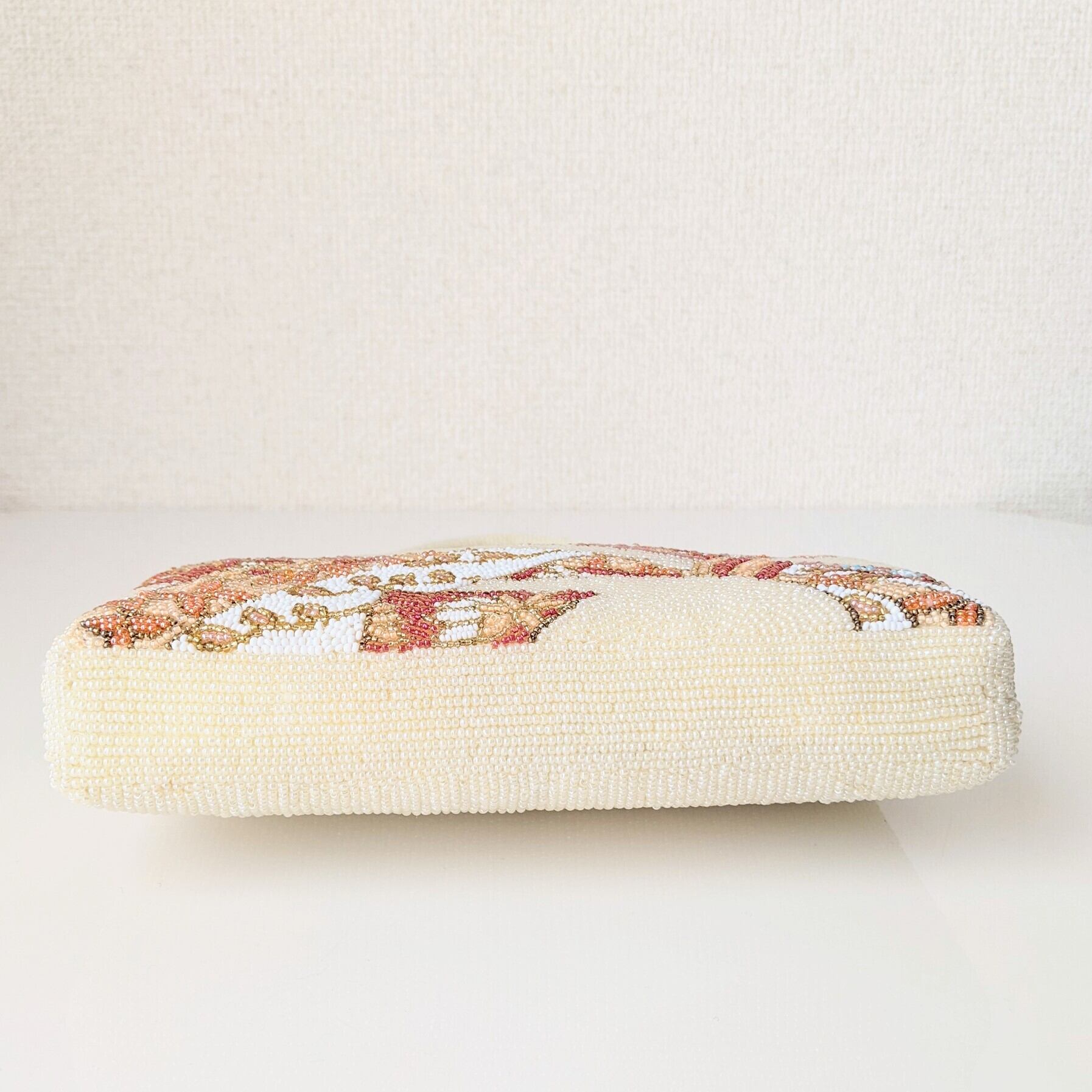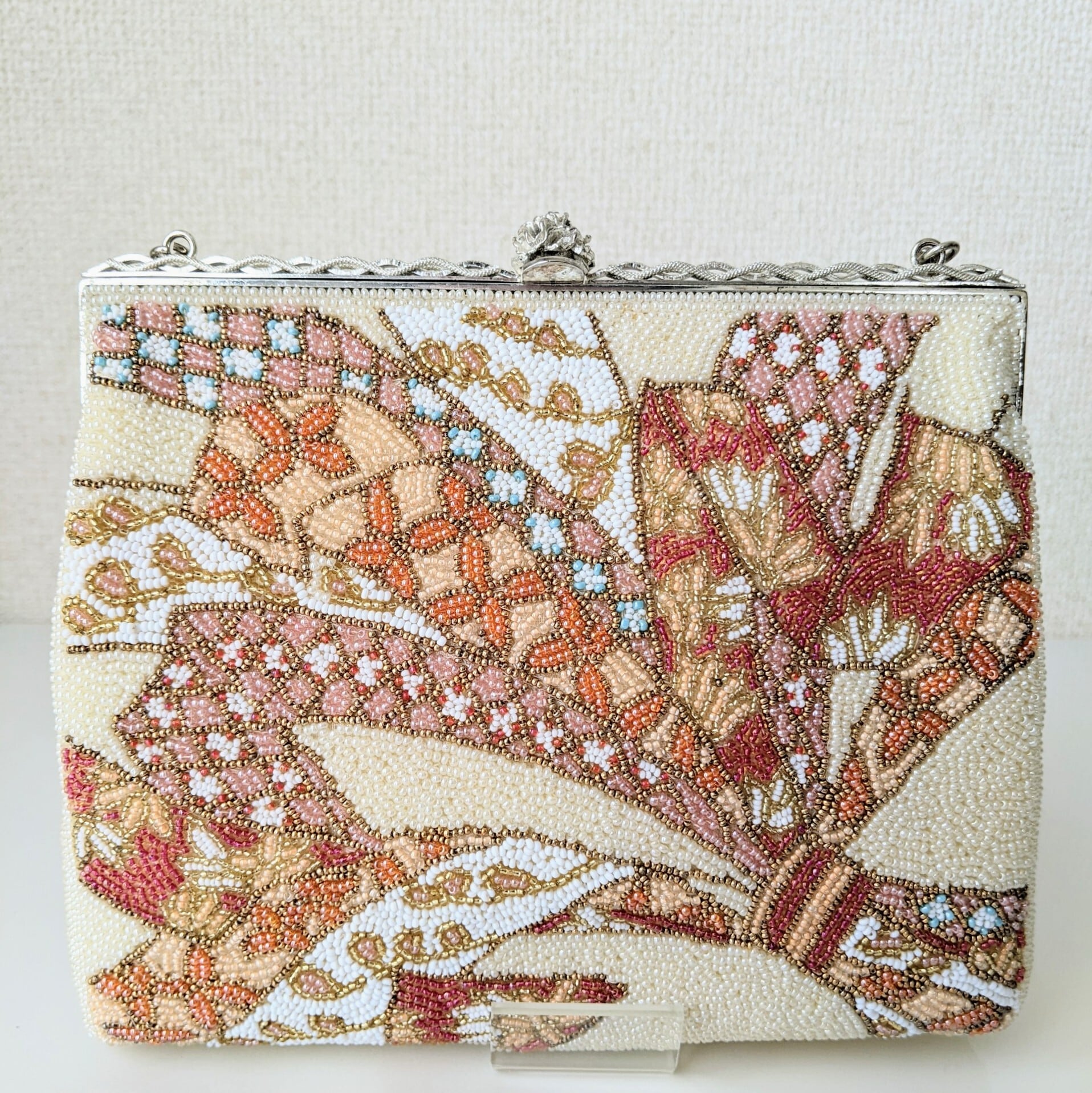 【Vintage】ビーズ刺繍バッグ Beaded Bag オフホワイト 束熨斗 縁起柄 パーティーバッグ 昭和レトロ 大正浪漫 フォーマルバッグ
