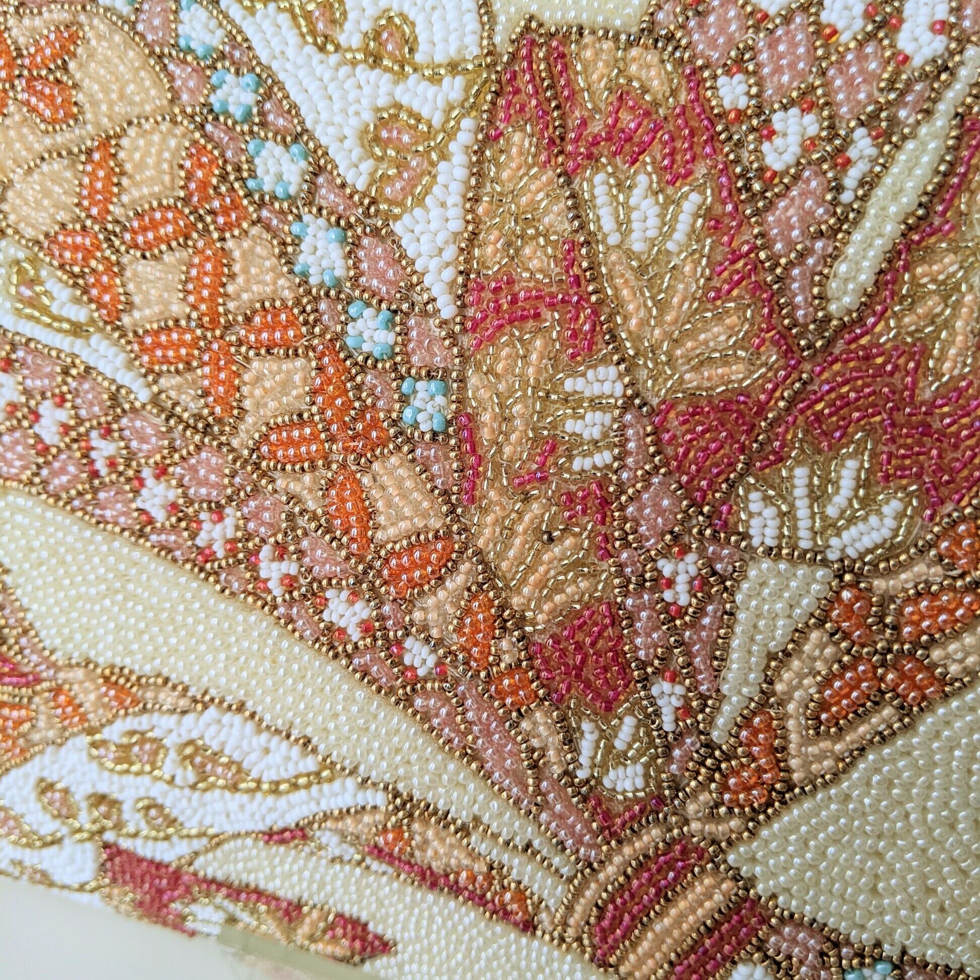 束ね熨斗柄は、婚礼や式典などの慶事の際に着る振袖などに多用される、古来から伝わる吉祥文様です。着物ではよく見る柄ですが、ビーズバッグの柄としてはあまりお目にかかれない希少なデザインかと思います。ダイナミックで躍動感の溢れる力作ではないでしょうか。