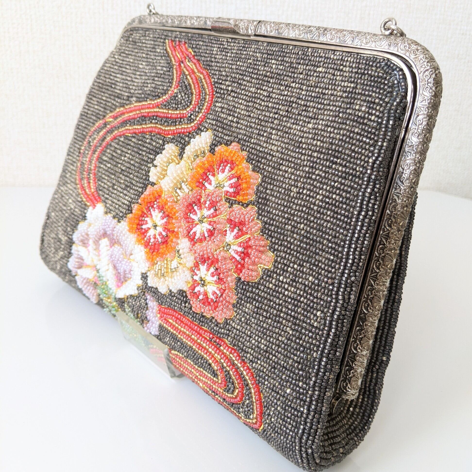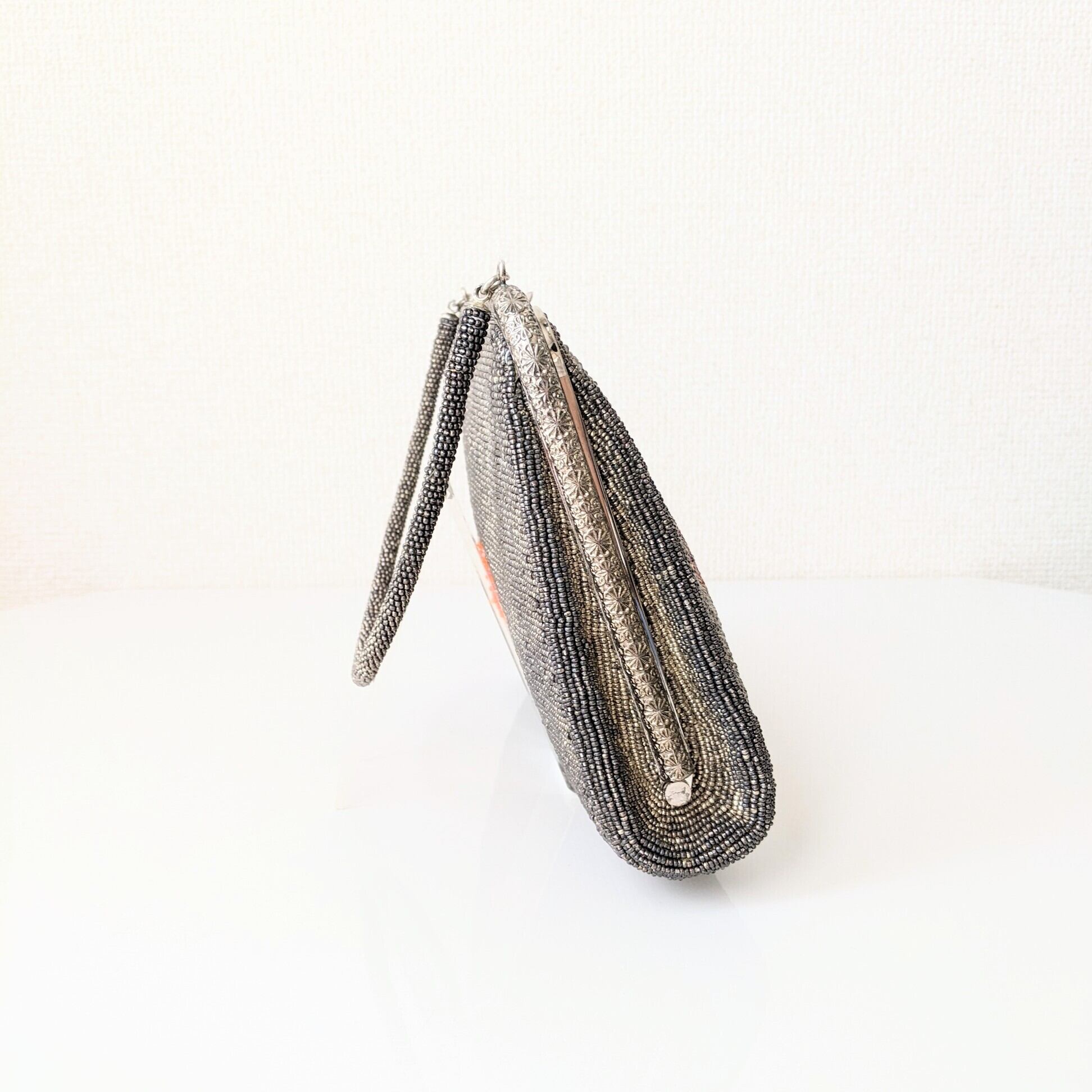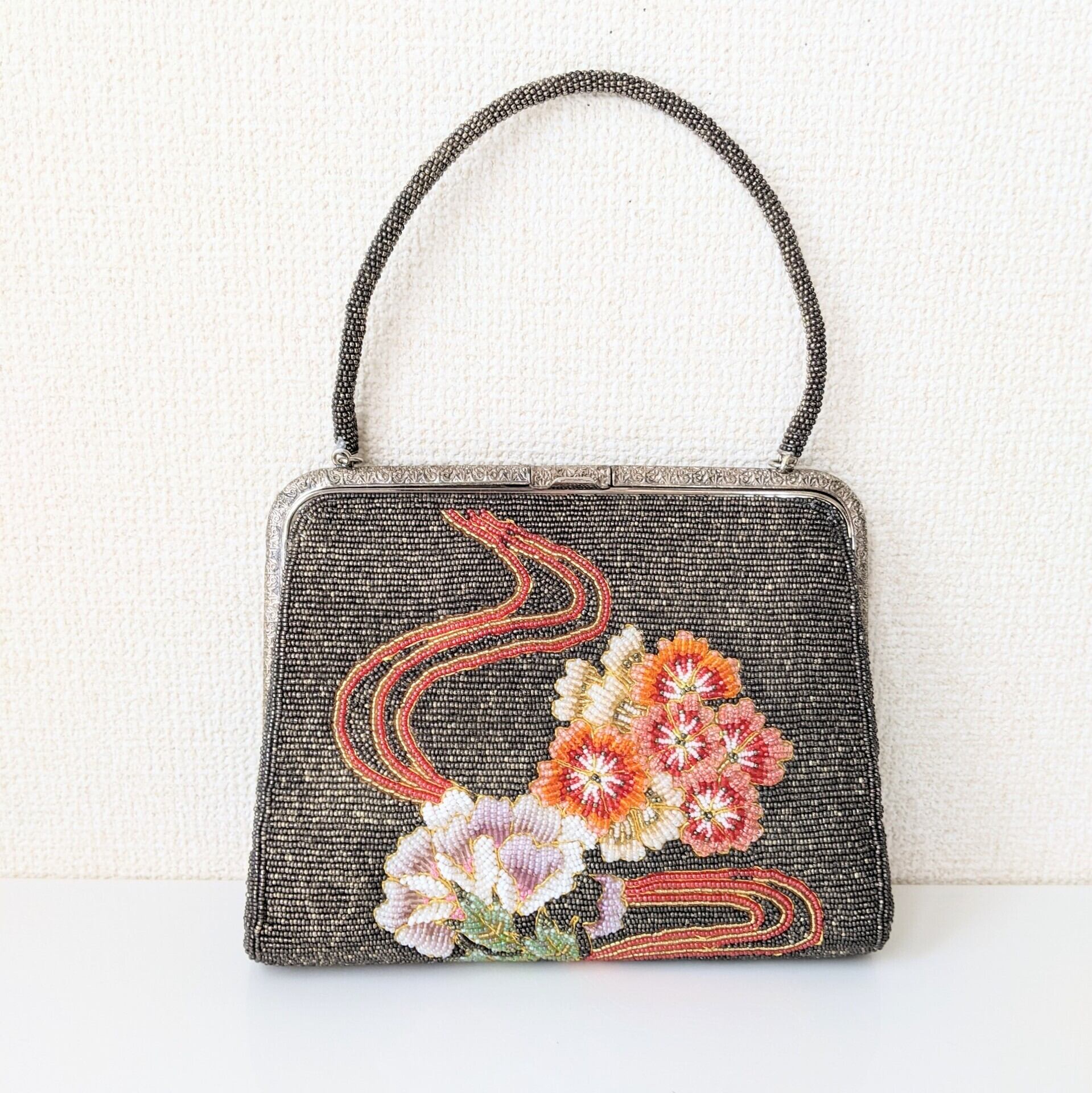 【Vintage】ビーズ刺繍バッグ Beaded Bag グレー 花流水柄 パーティーバッグ 昭和レトロ 大正浪漫 フォーマルバッグ