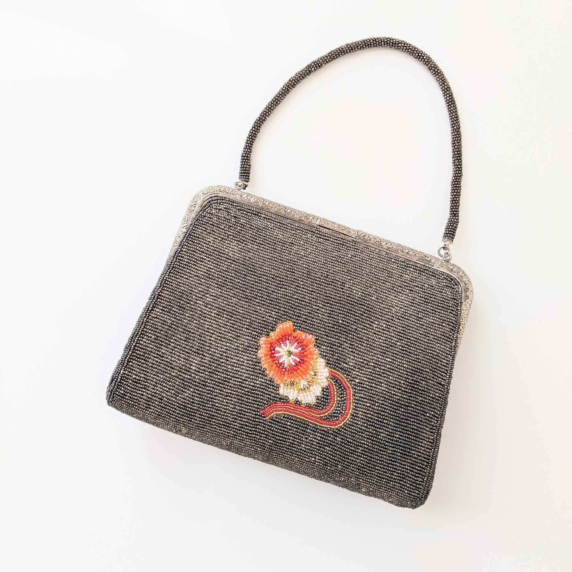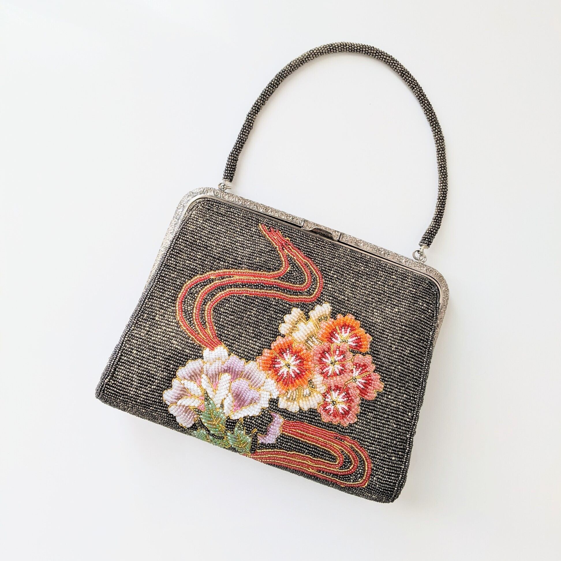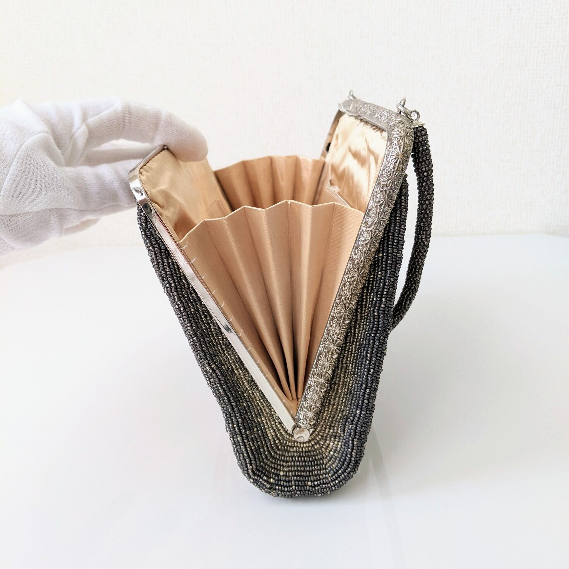 銀×グレー地に花流水柄が雅な雰囲気のビーズバッグです。金属部分にくすみ、内布にやや色褪せ、生地の擦れ等がありますが、ビーズの取れもなくヴィンテージ品としては良好なコンディションです。