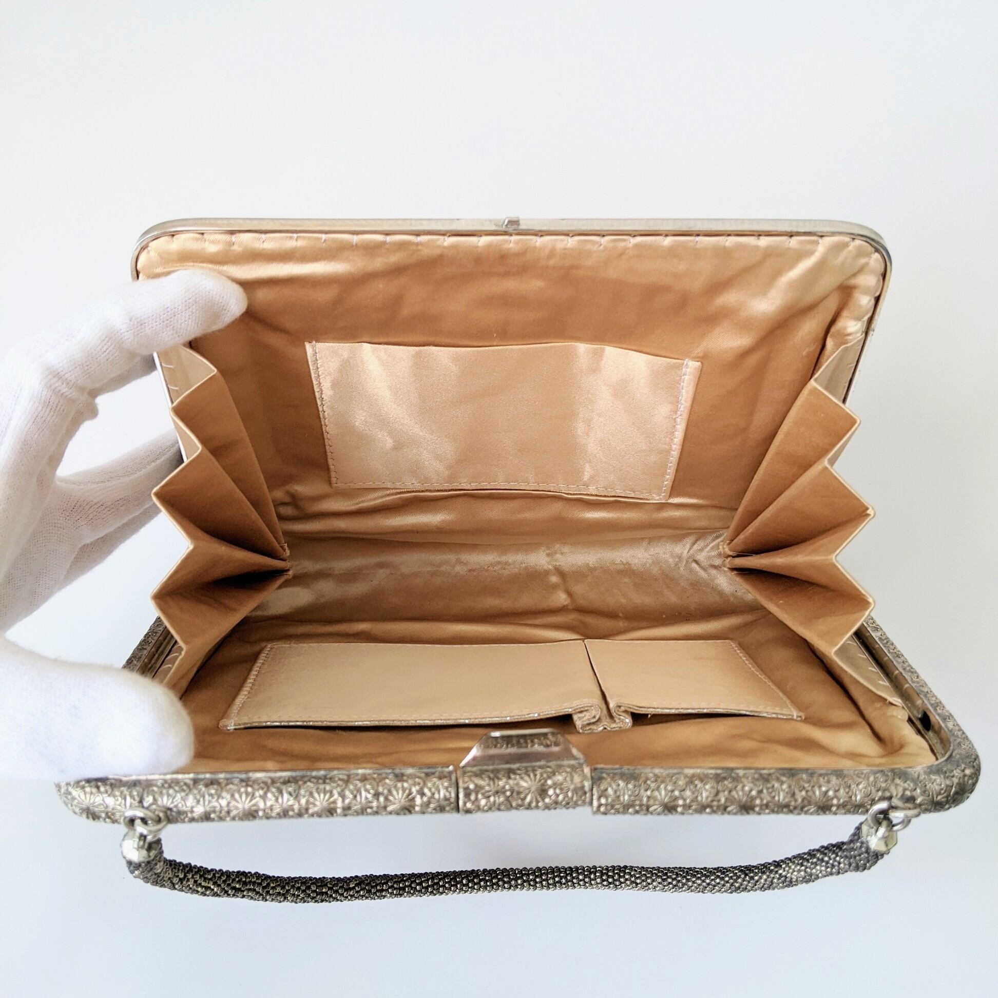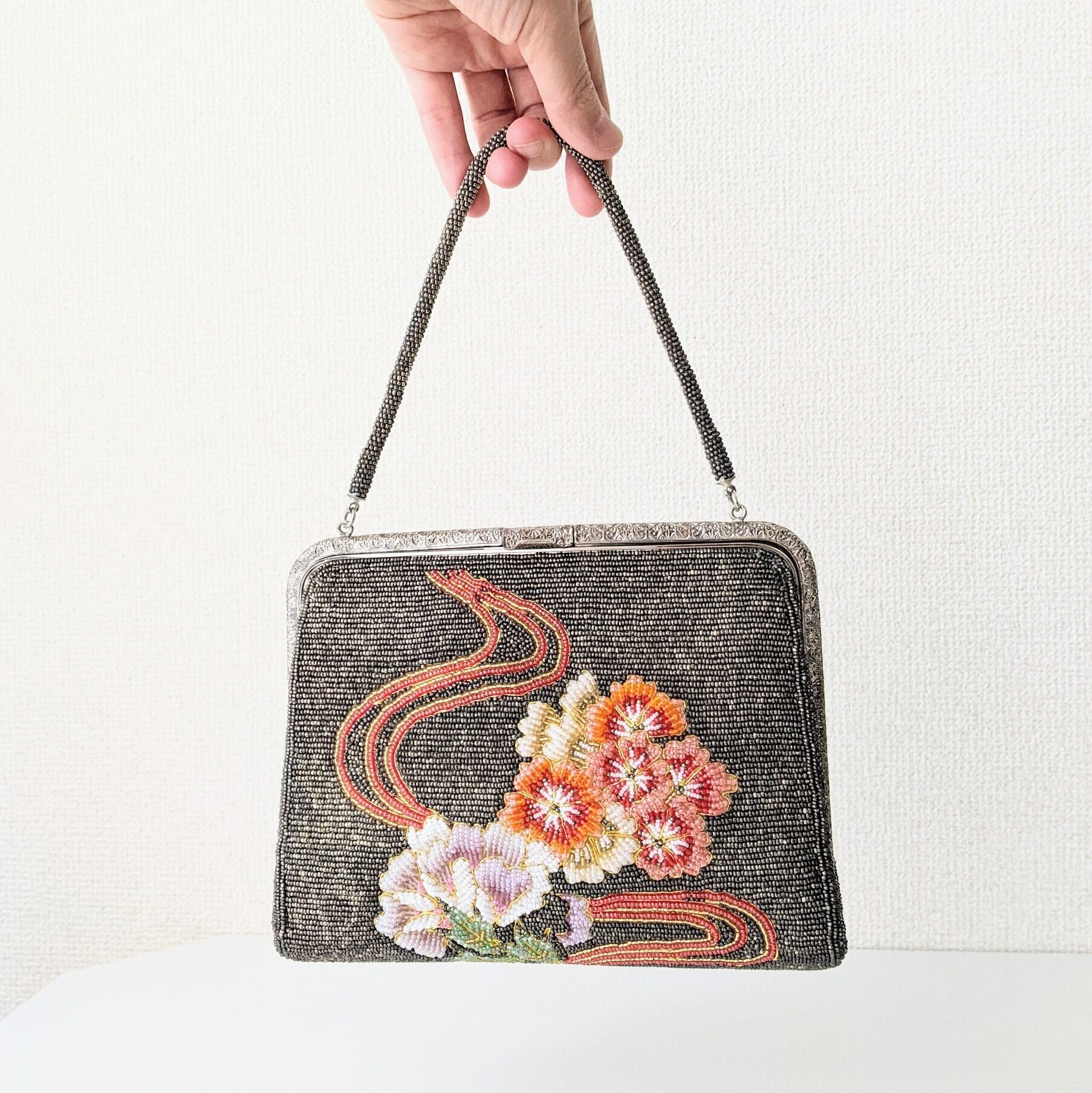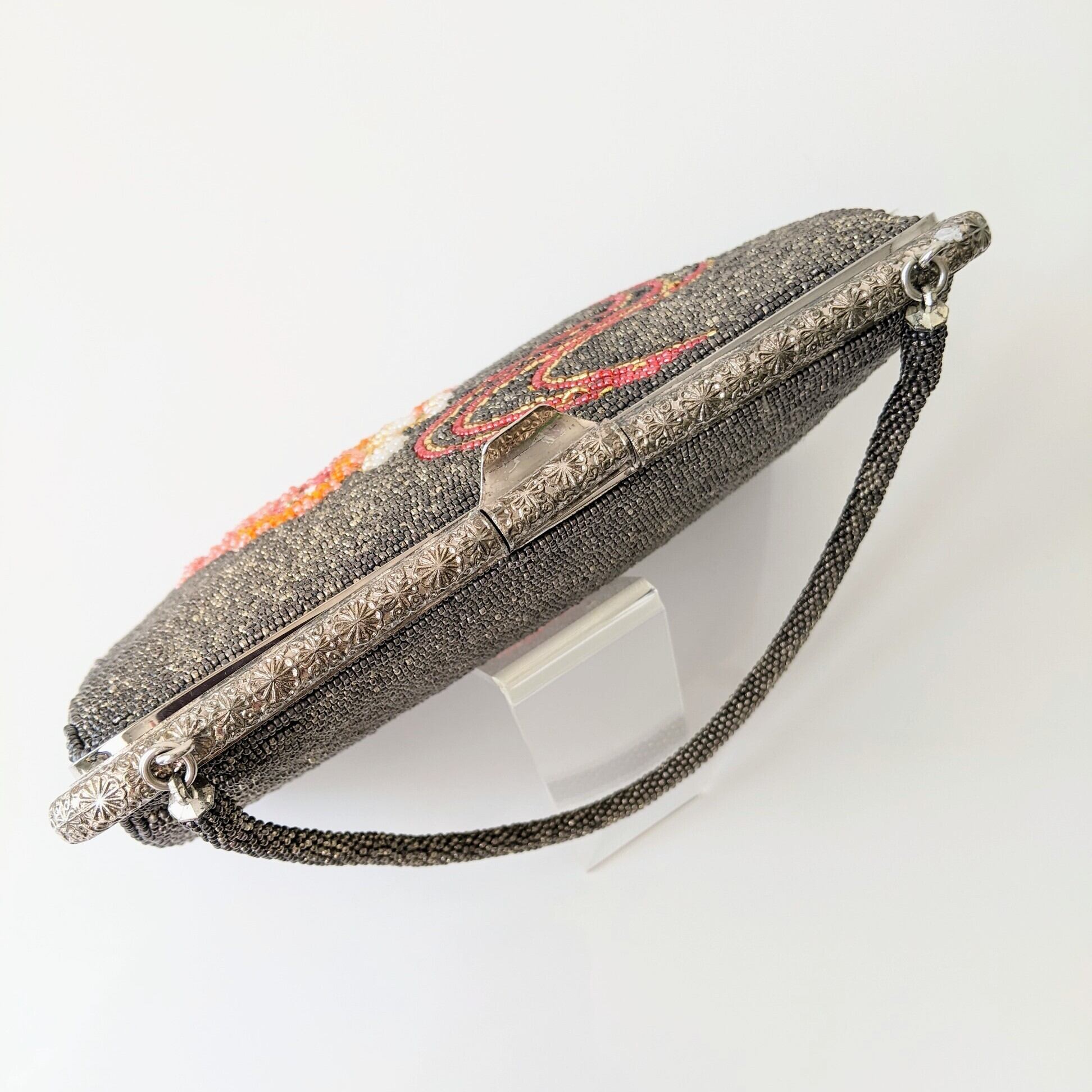 銀×グレー地に花流水柄が雅な雰囲気のビーズバッグです。金属部分にくすみ、内布にやや色褪せ、生地の擦れ等がありますが、ビーズの取れもなくヴィンテージ品としては良好なコンディションです。