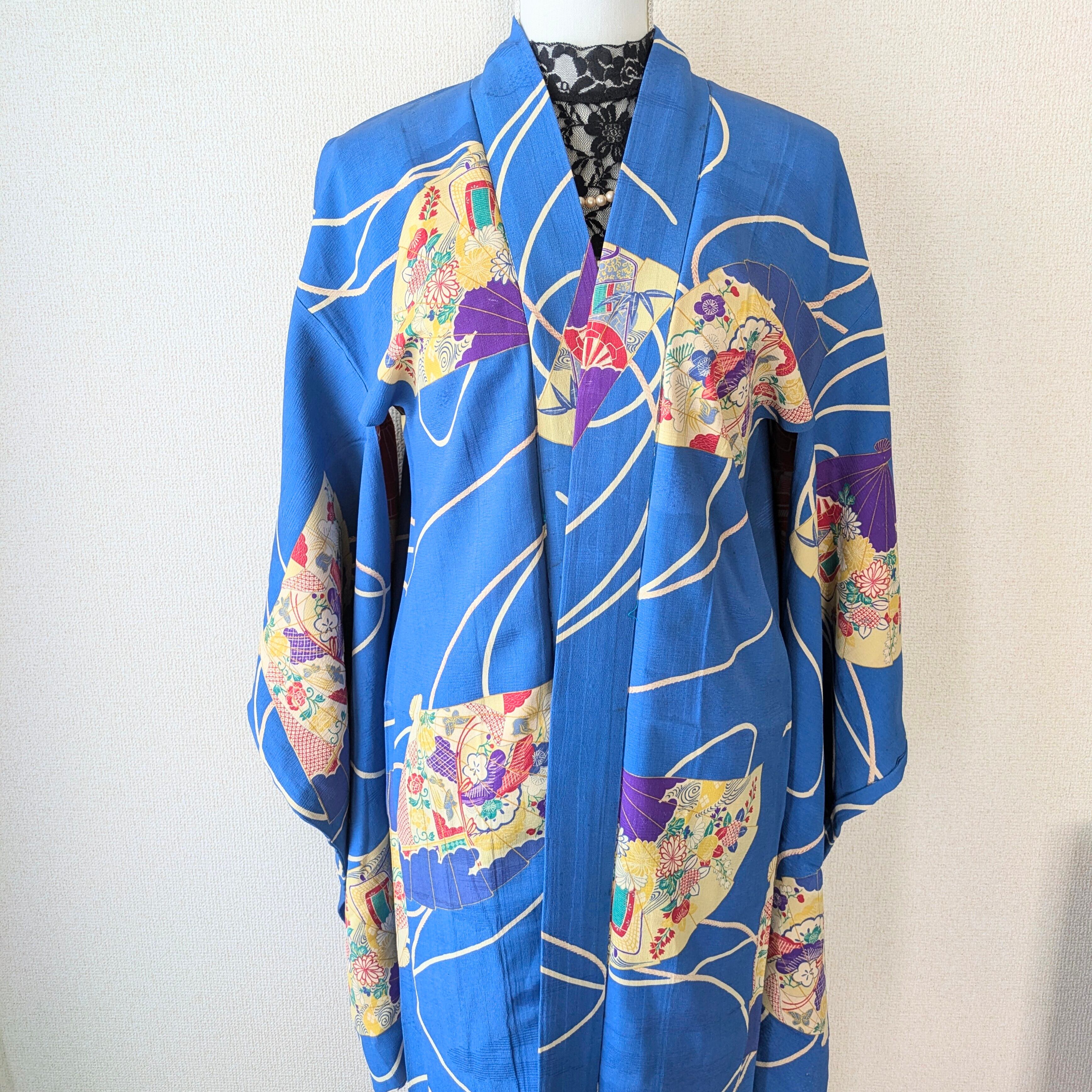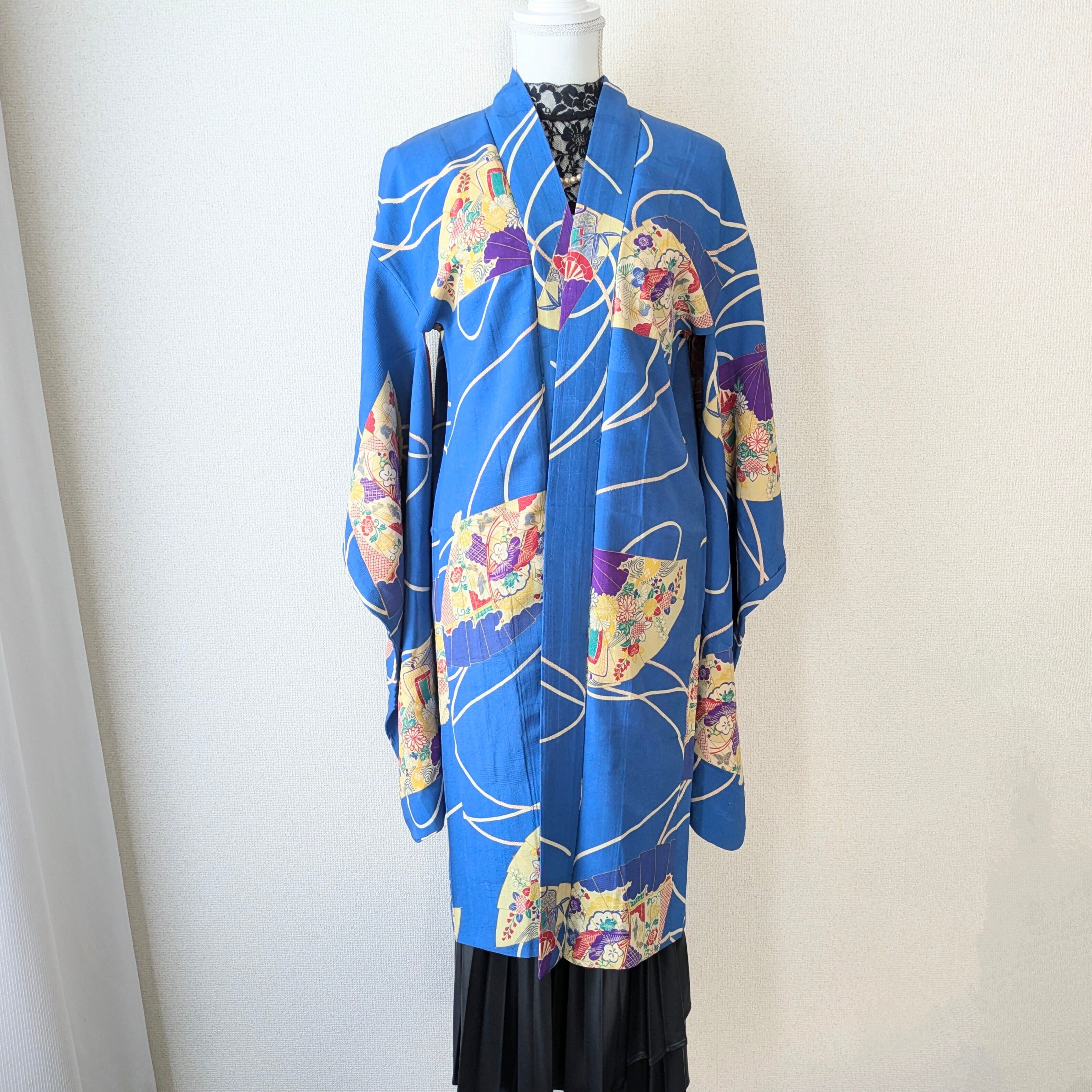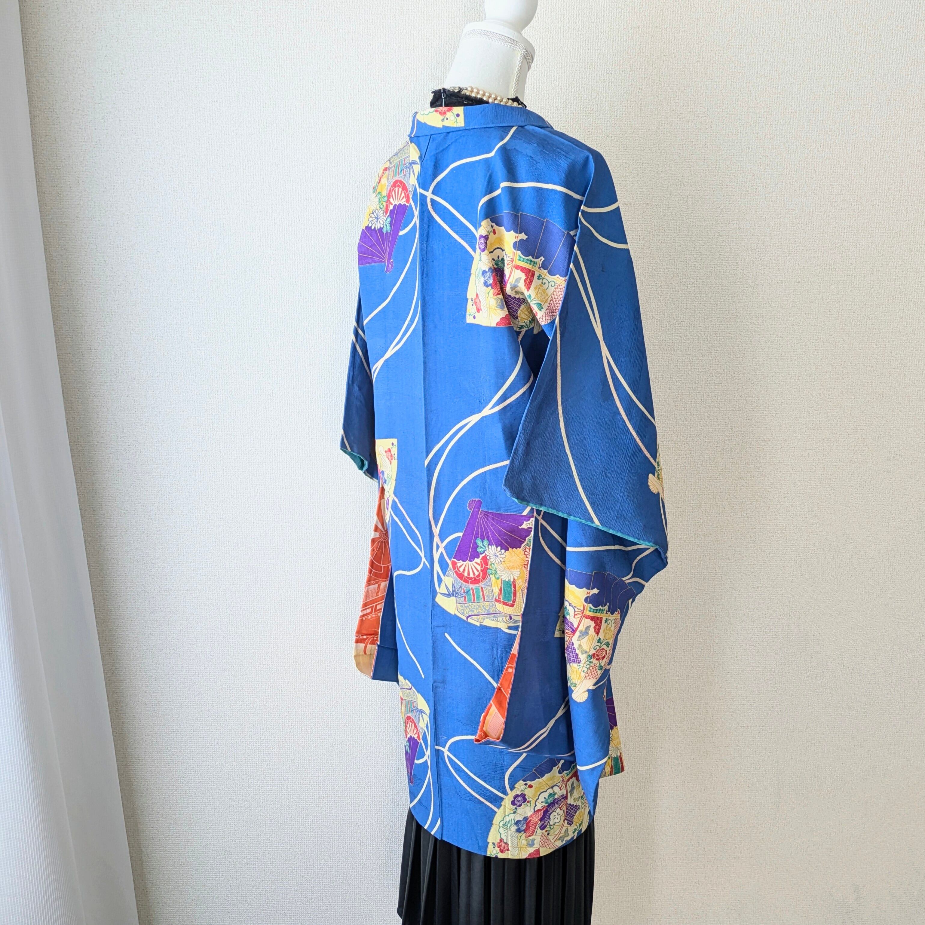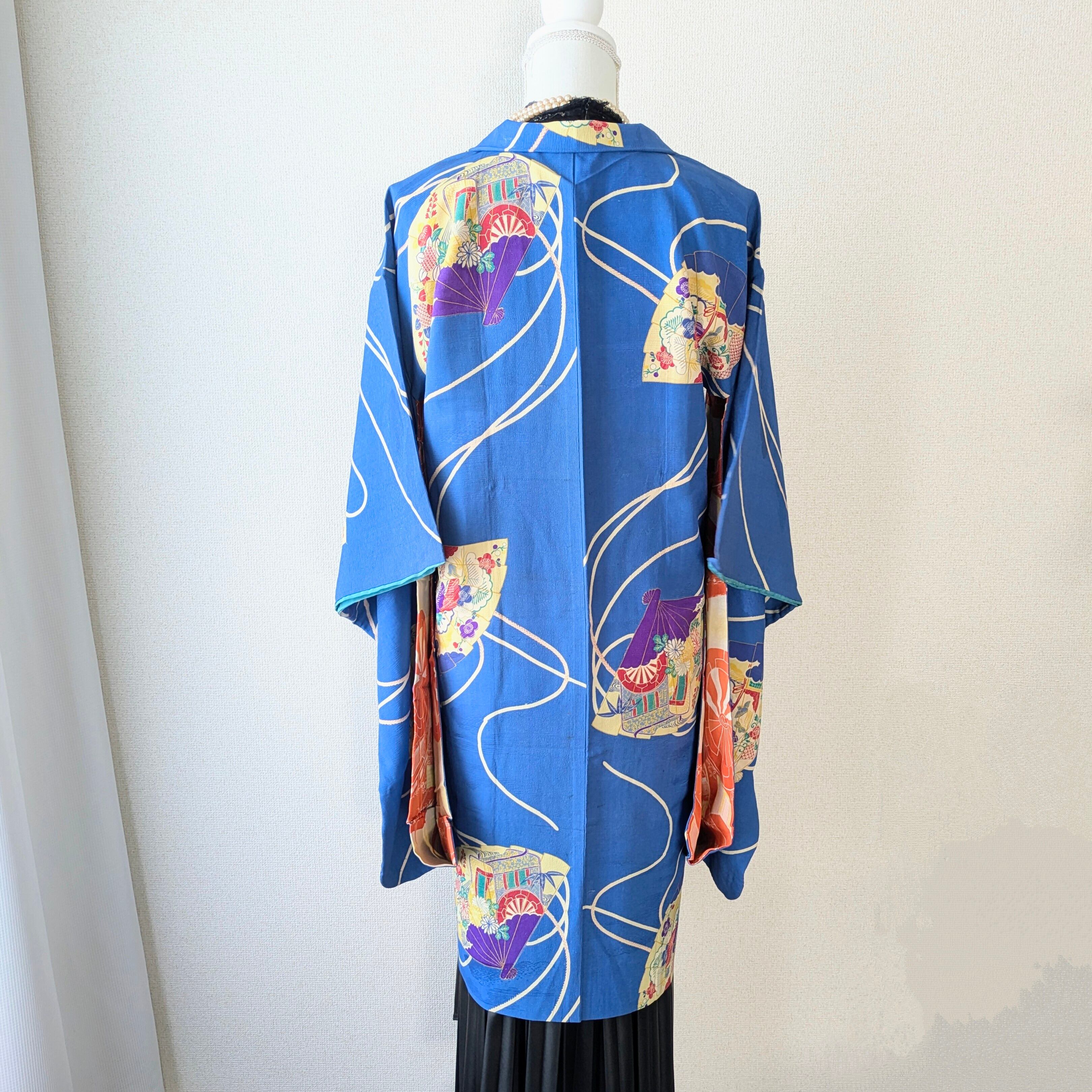 【Vintage】HAORI 長羽織 羽織 正絹 縮緬 青 扇柄 大正浪漫 古布 時代布 和洋折衷