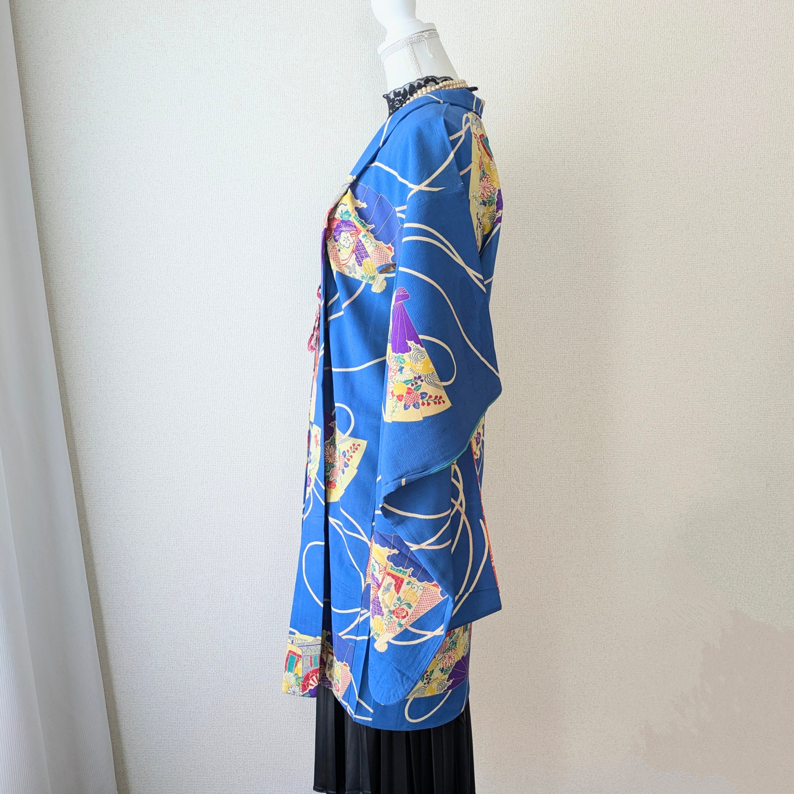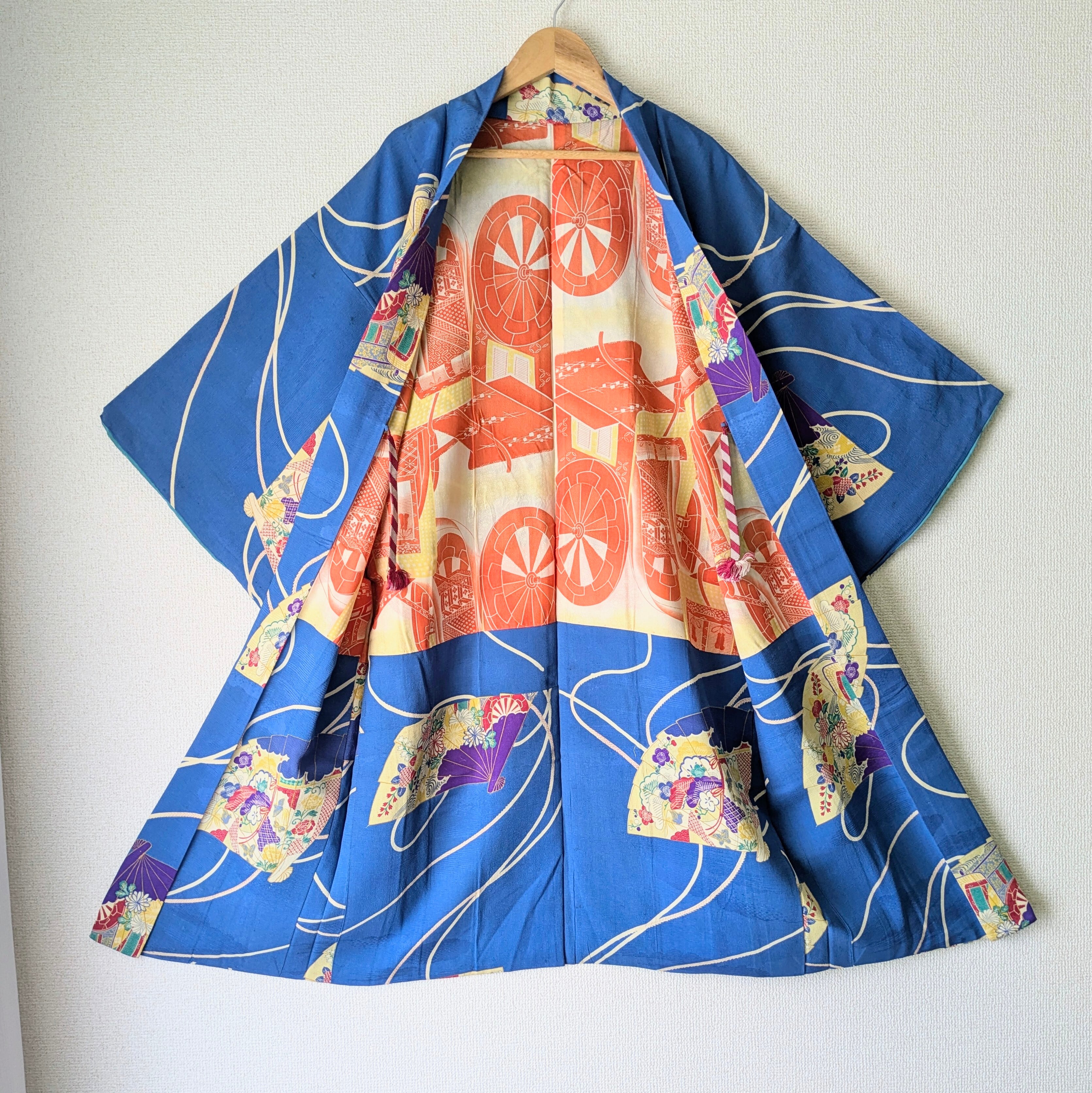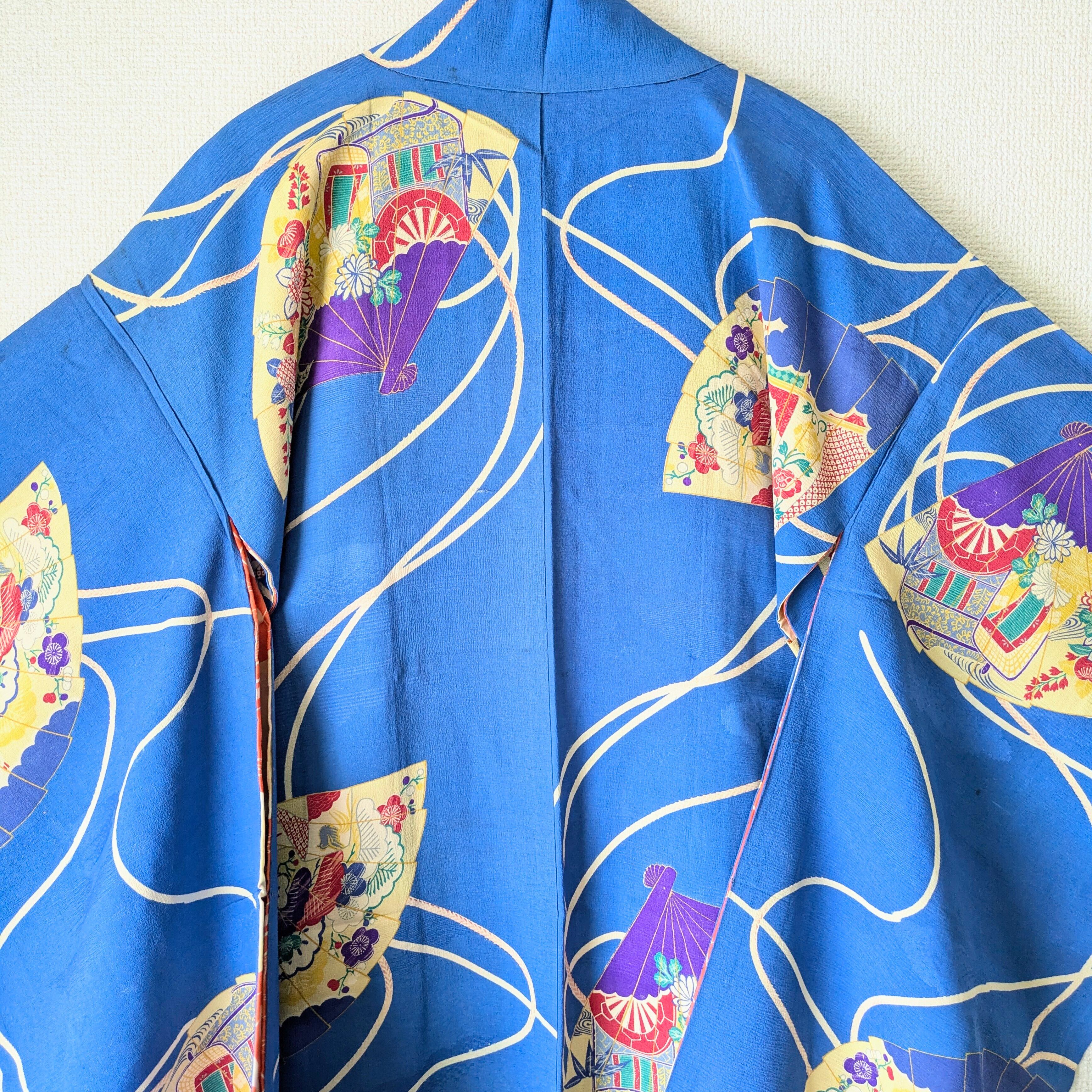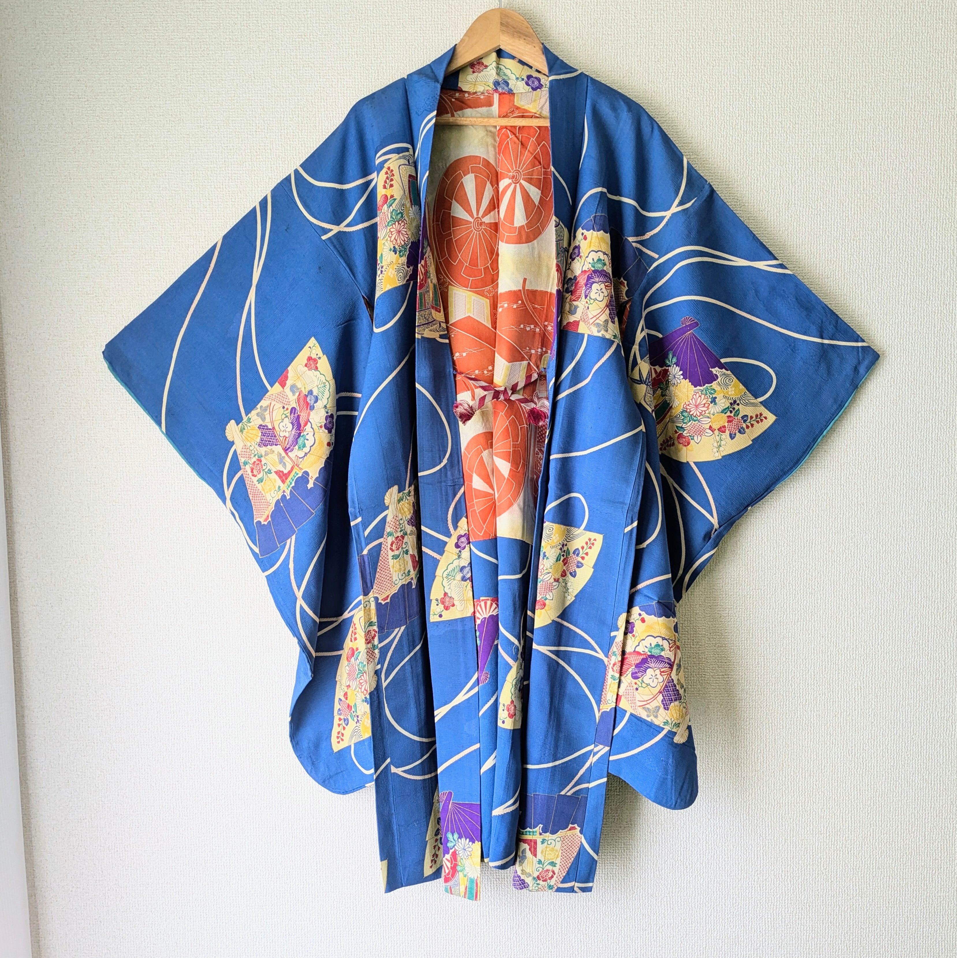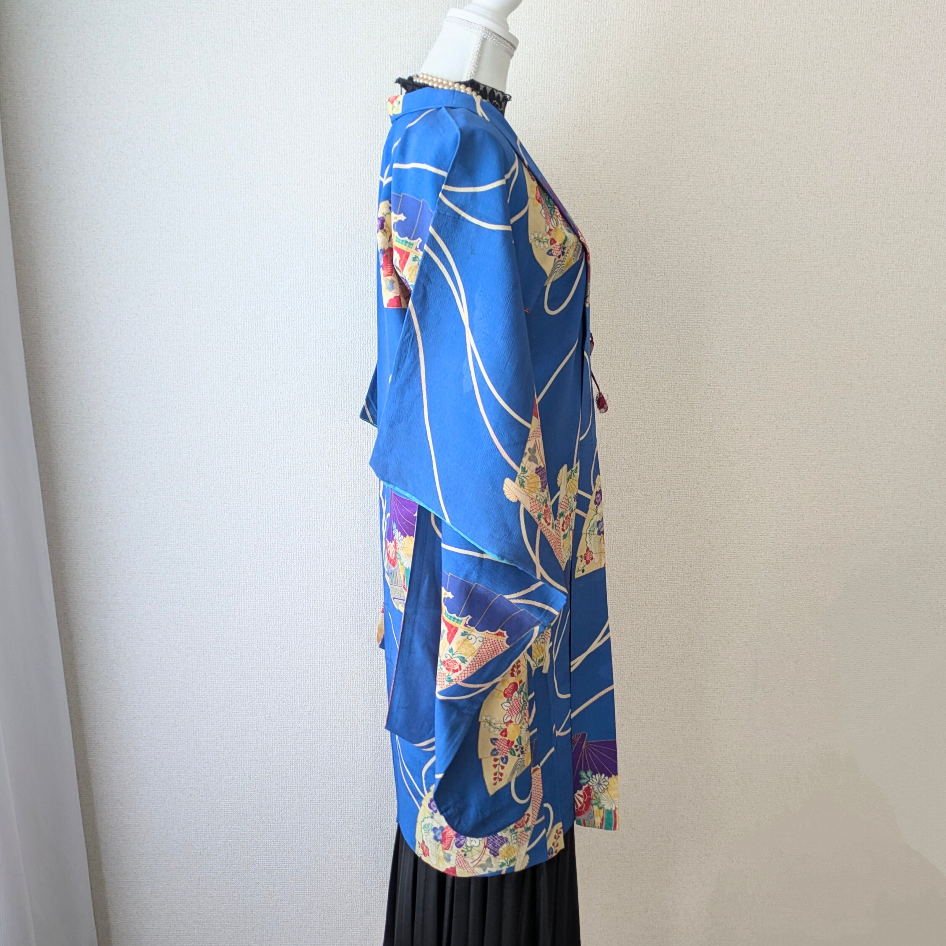 【Vintage】HAORI 長羽織 羽織 正絹 縮緬 青 扇柄 大正浪漫 古布 時代布 和洋折衷