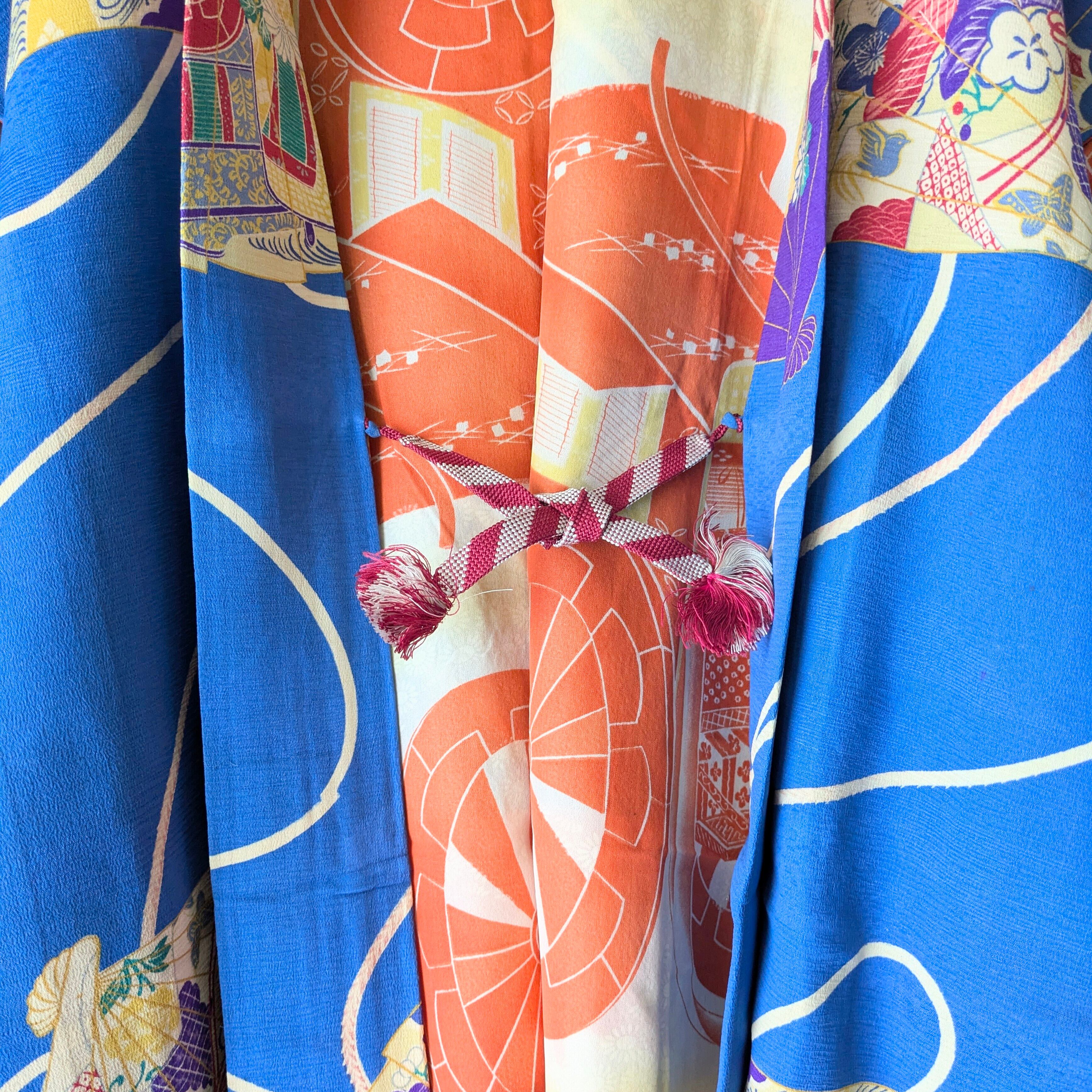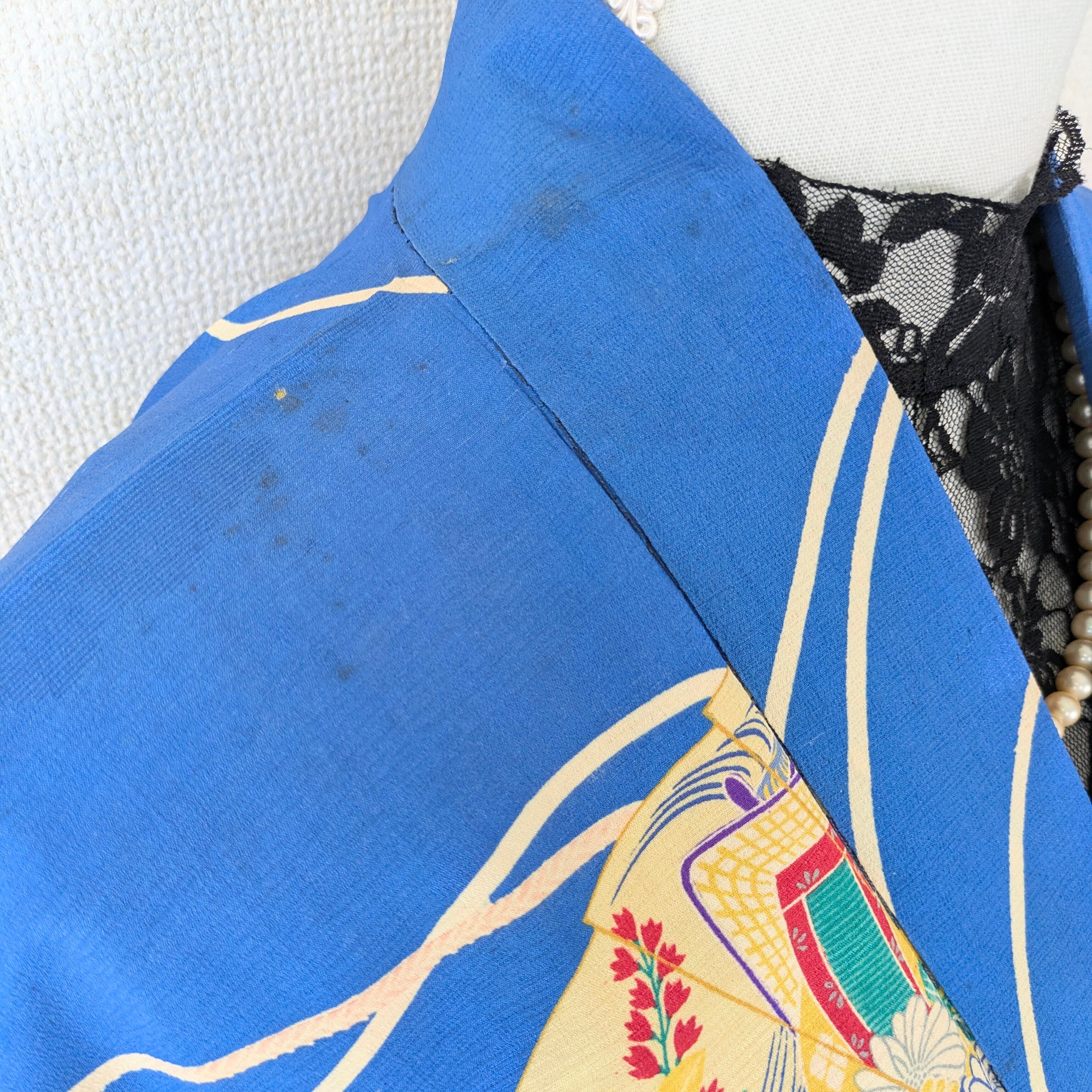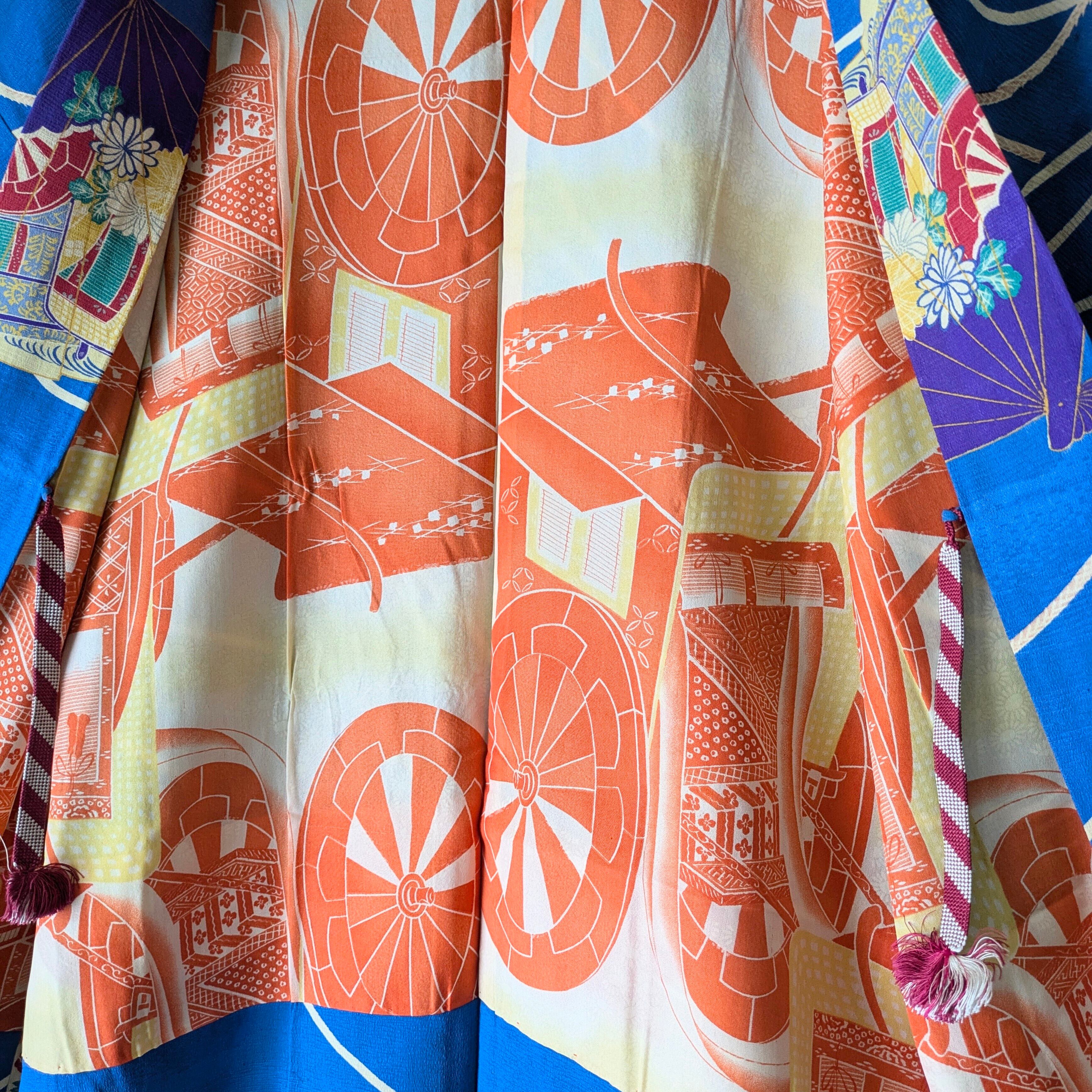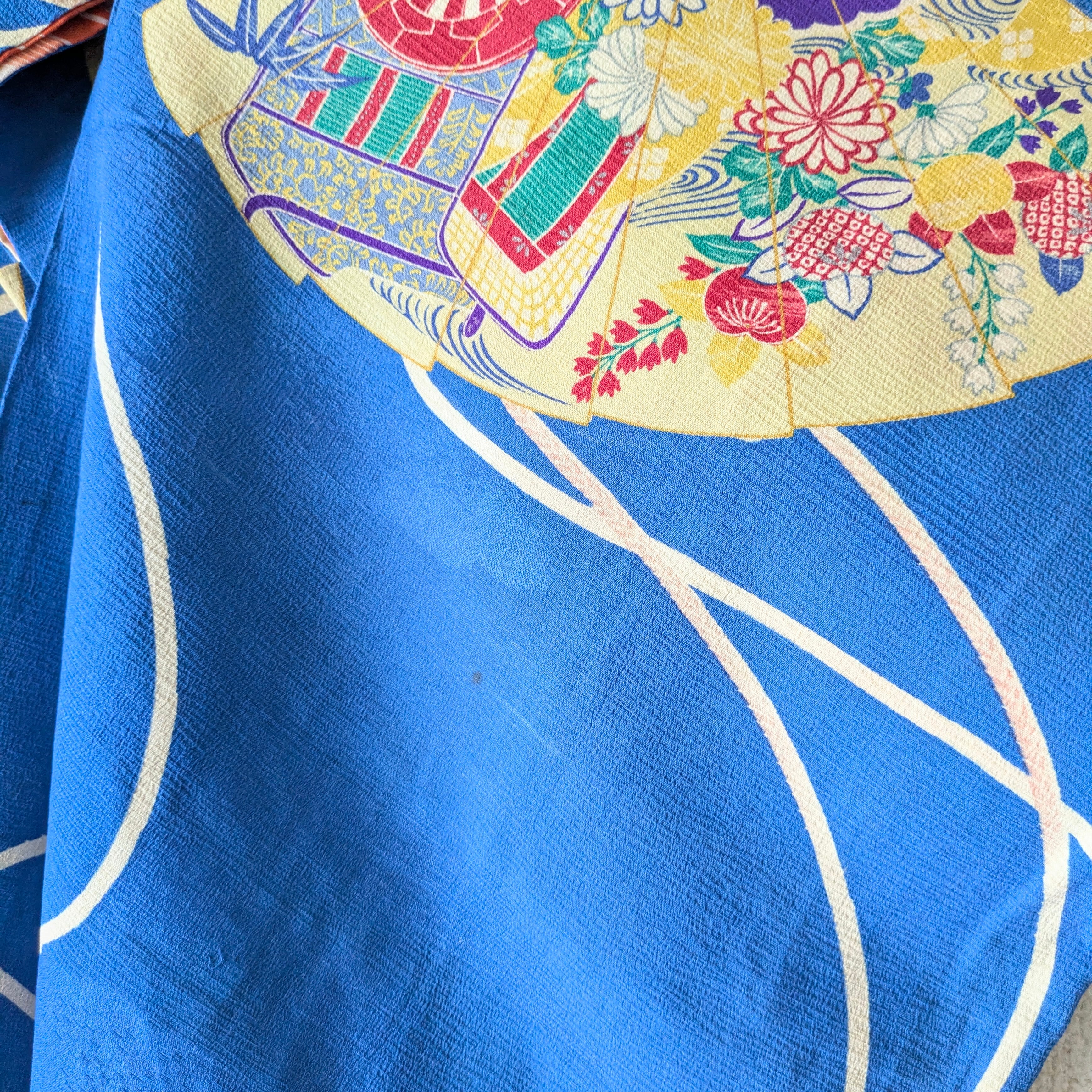 【Vintage】HAORI 長羽織 羽織 正絹 縮緬 青 扇柄 大正浪漫 古布 時代布 和洋折衷