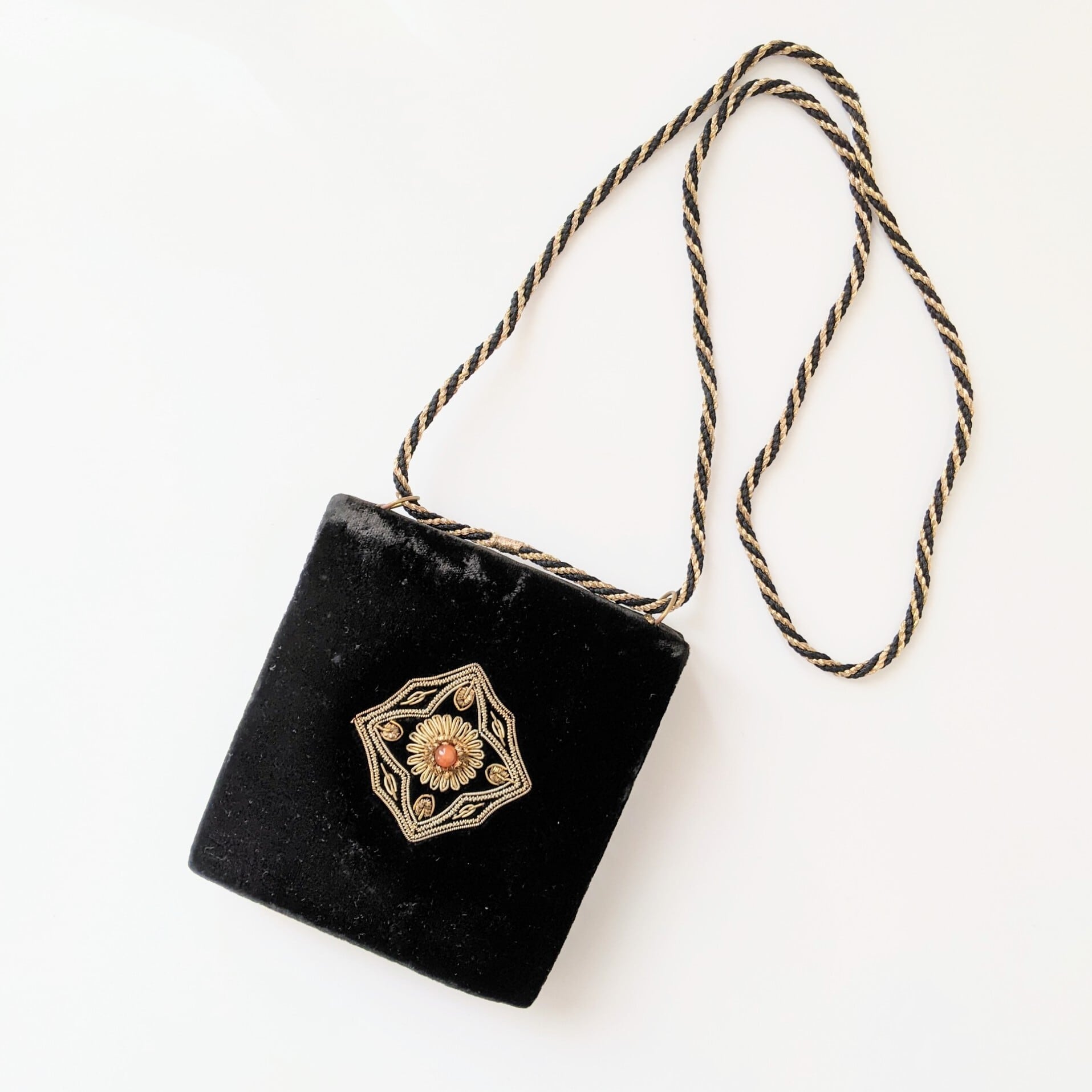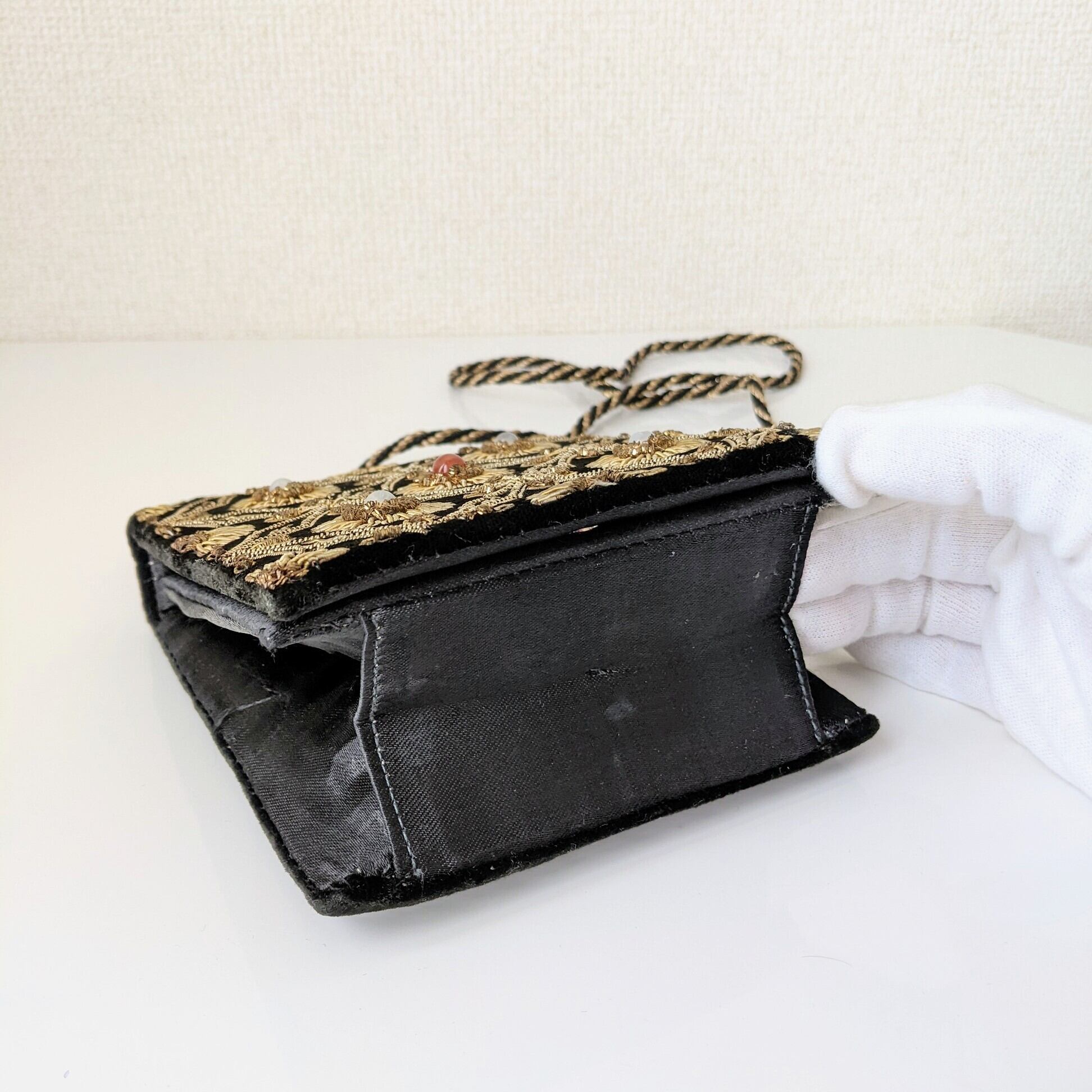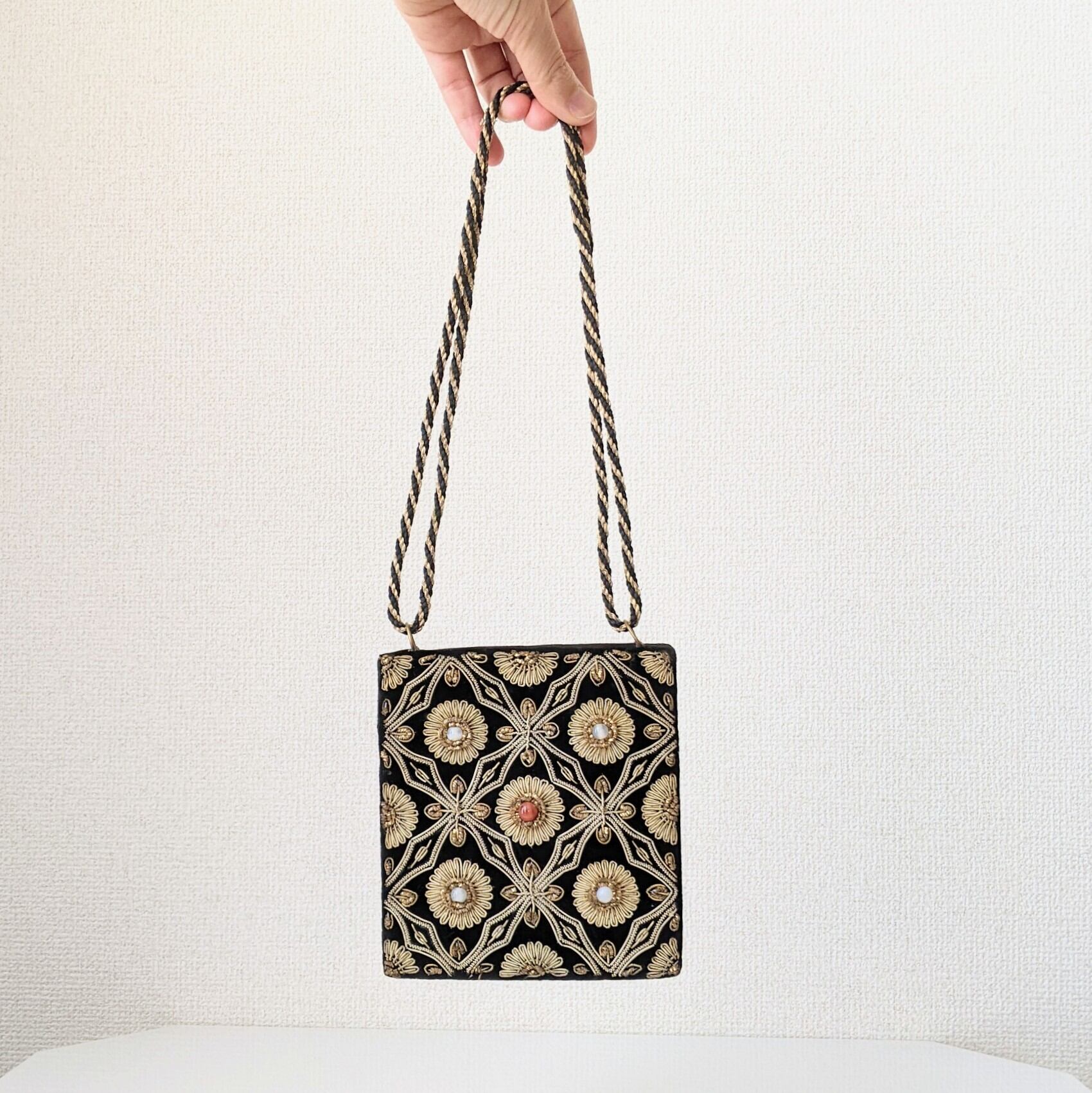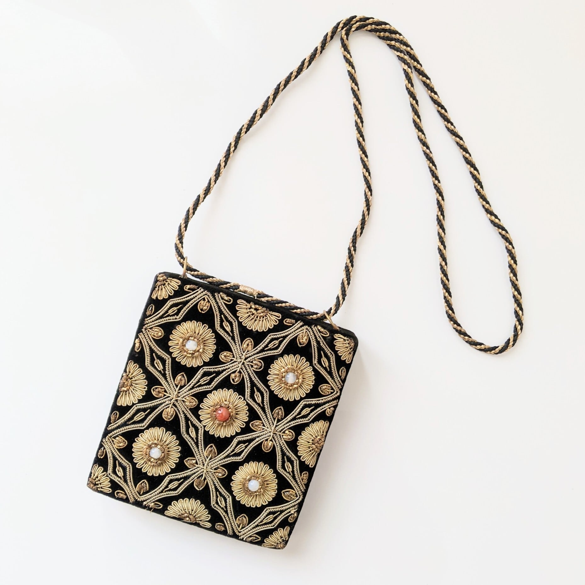 ほぼ正方形の形、黒のベルベット生地に煌びやかな金の糸と天然石の美しいコントラストが素敵です。