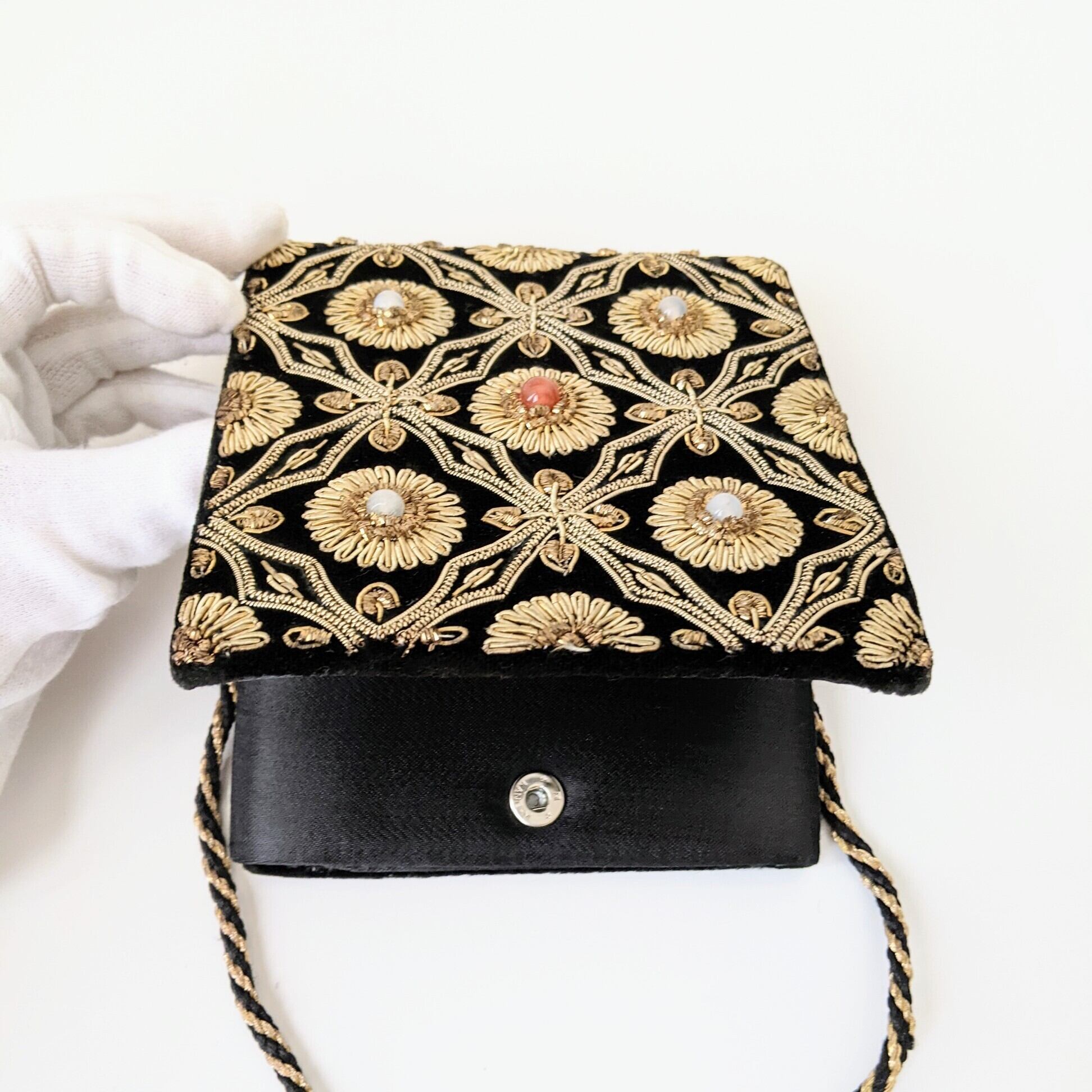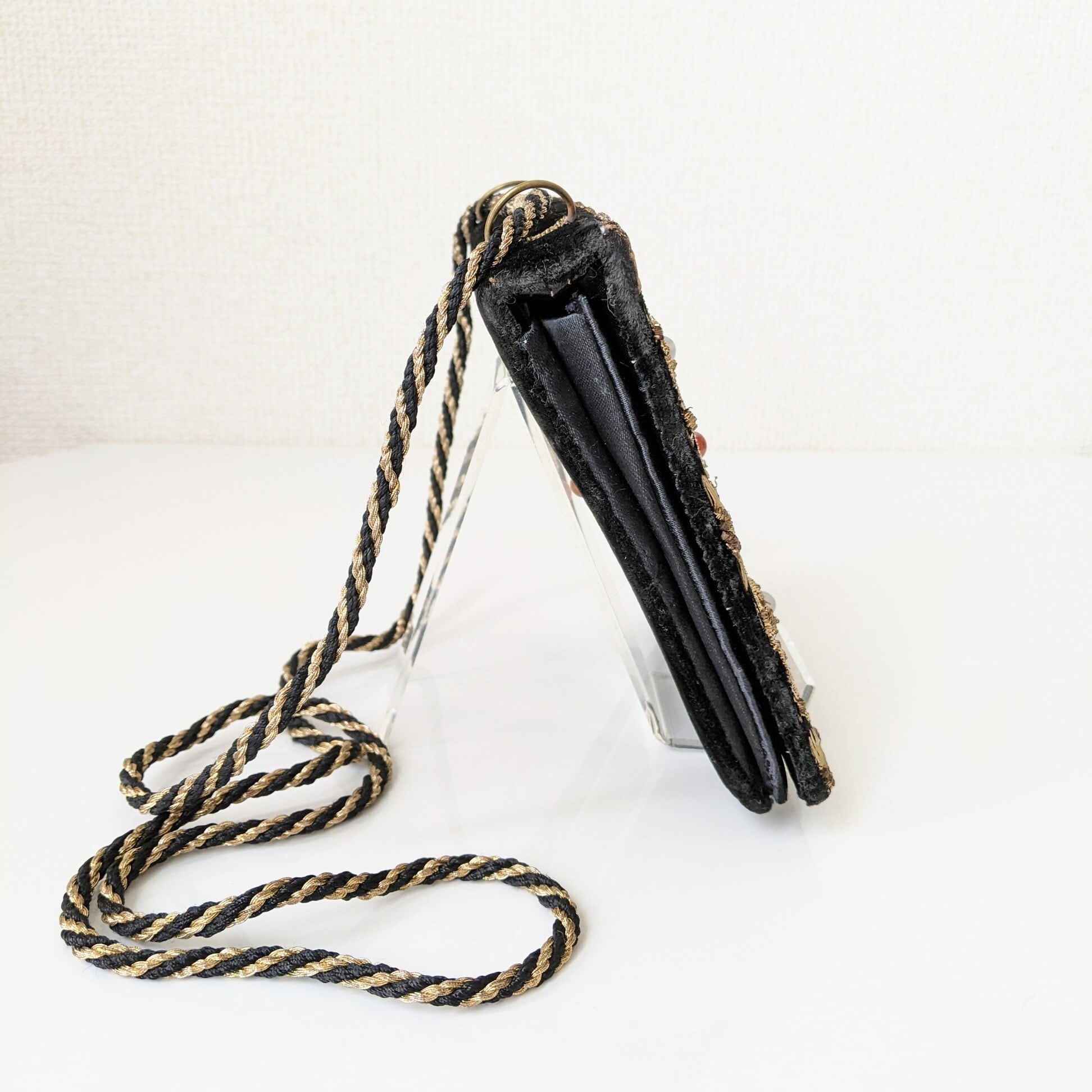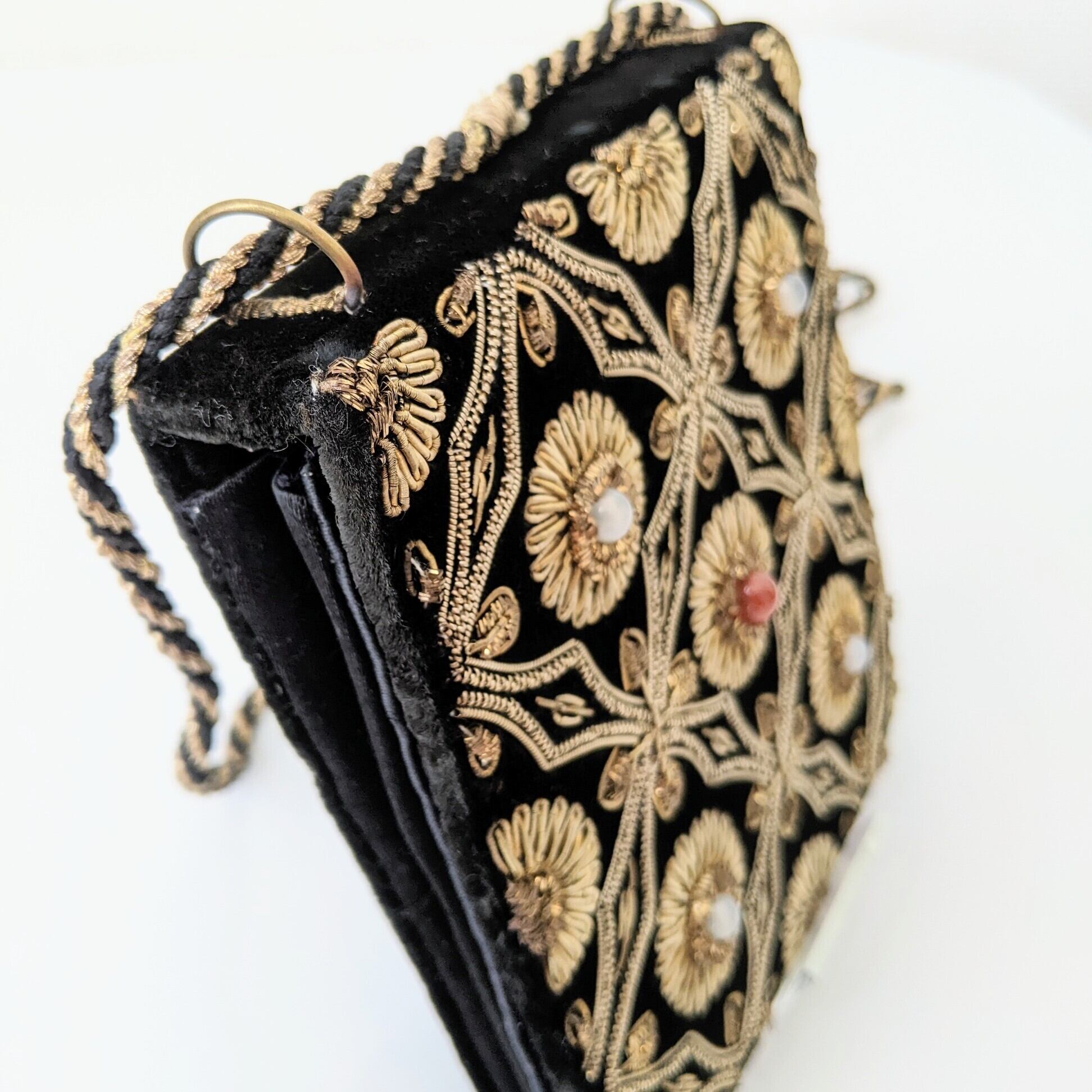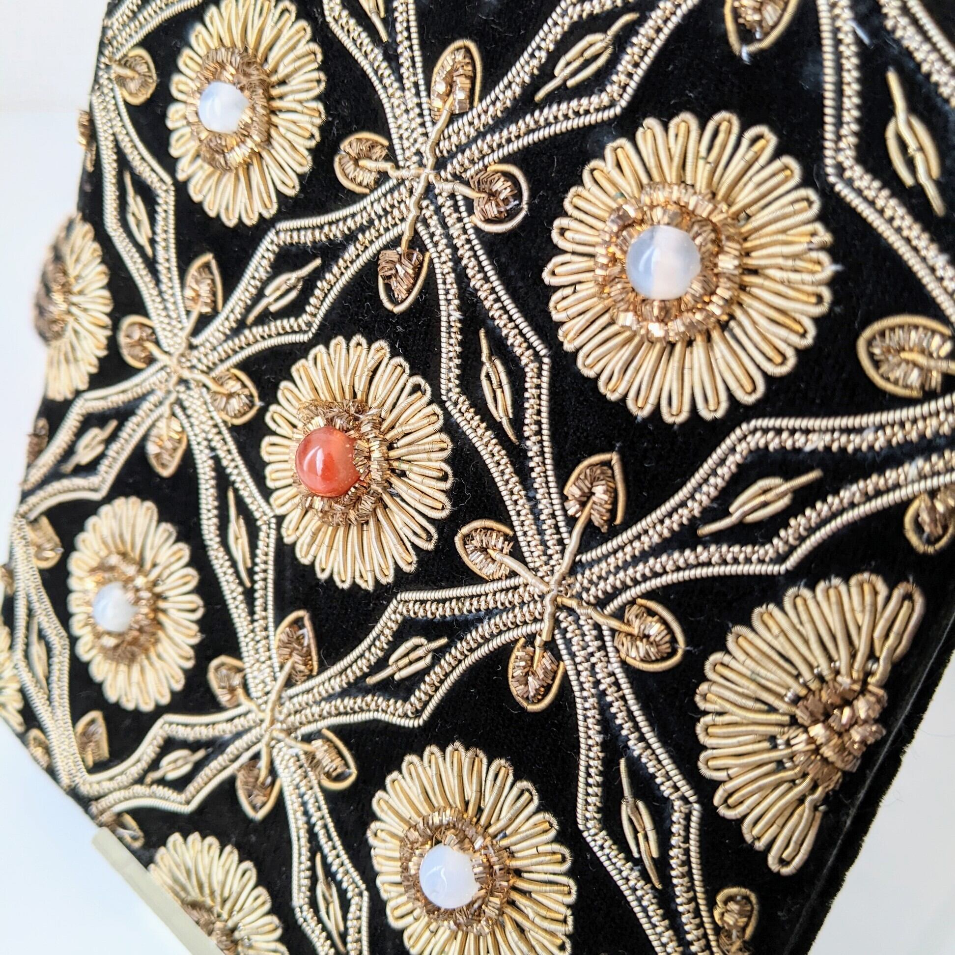 ほぼ正方形の形、黒のベルベット生地に煌びやかな金の糸と天然石の美しいコントラストが素敵です。
