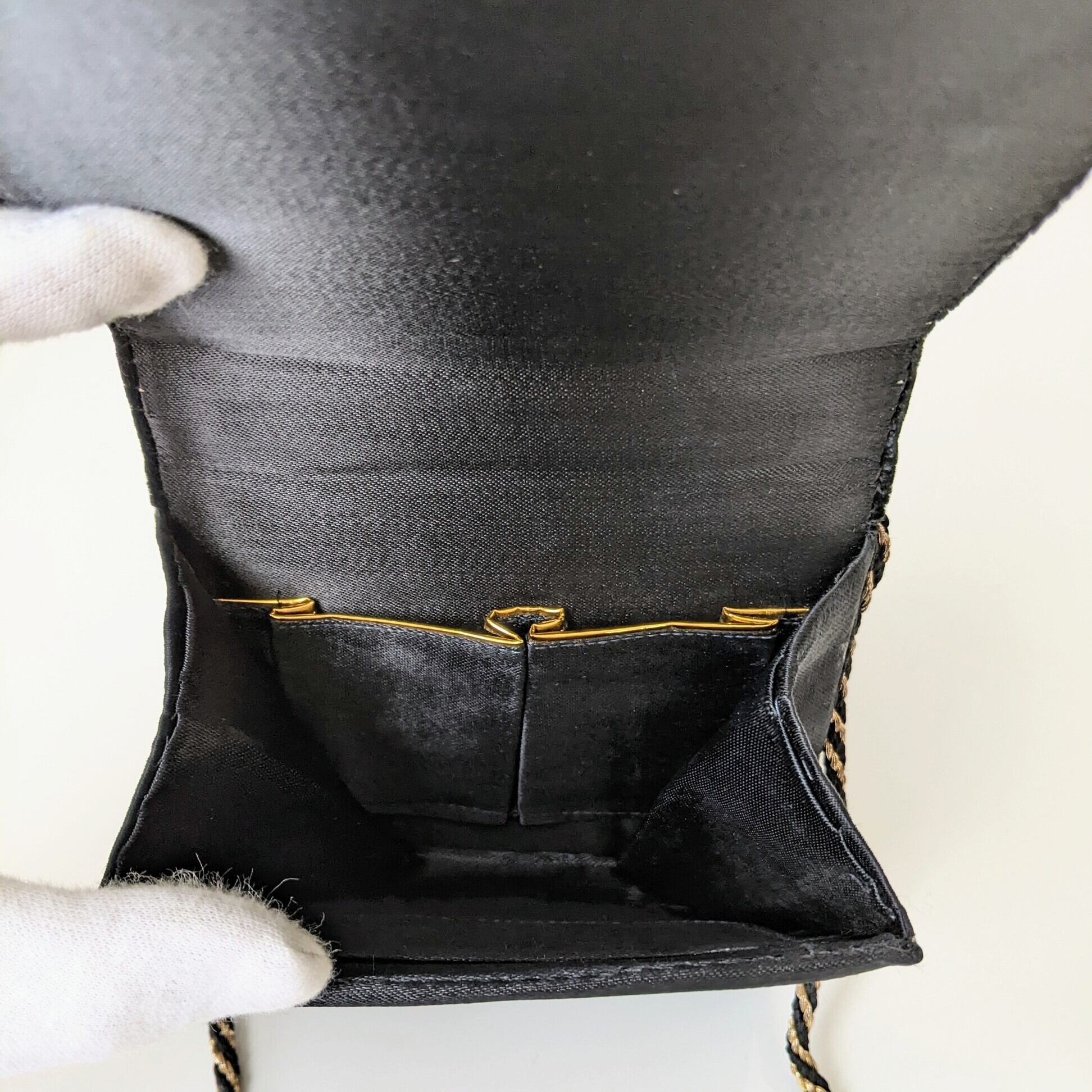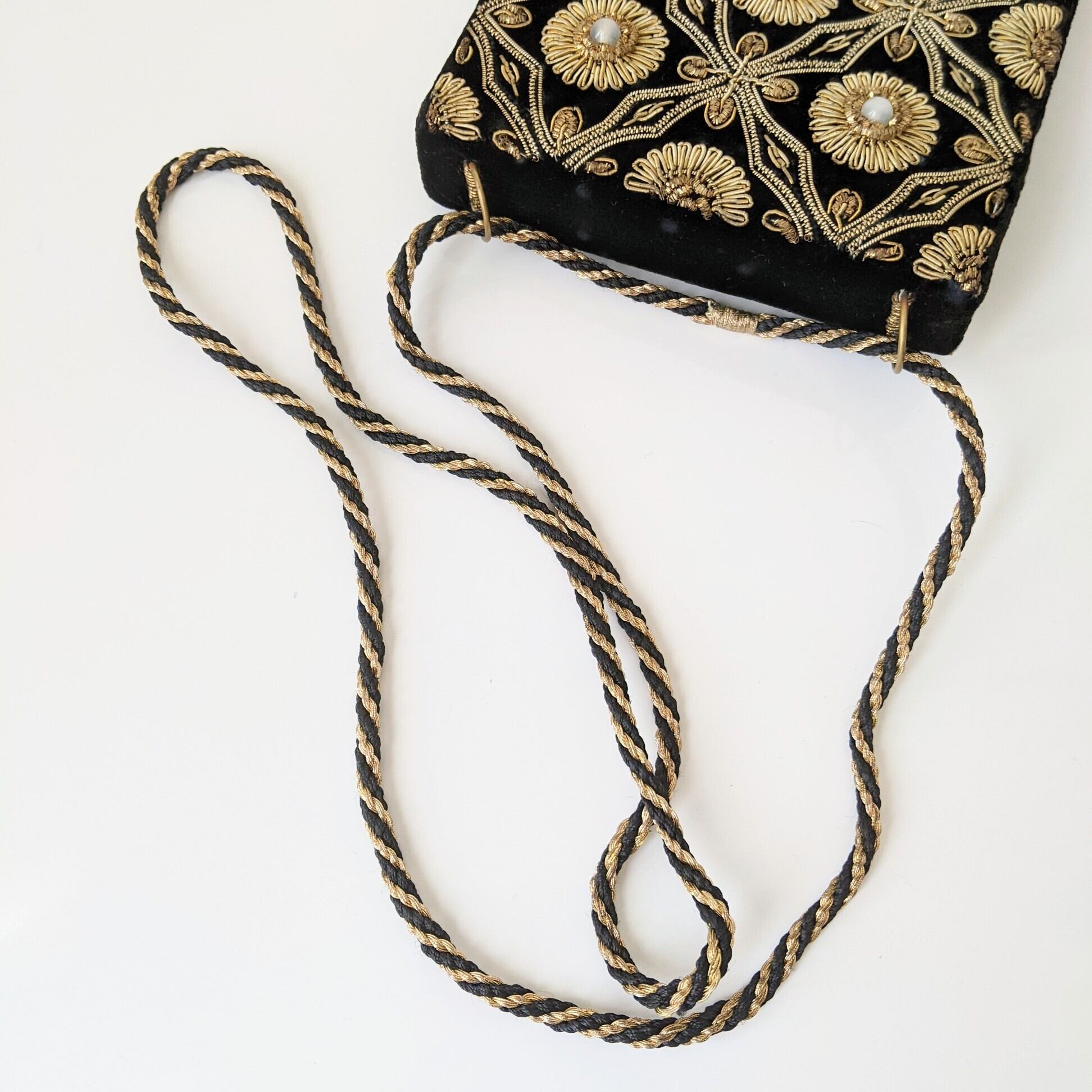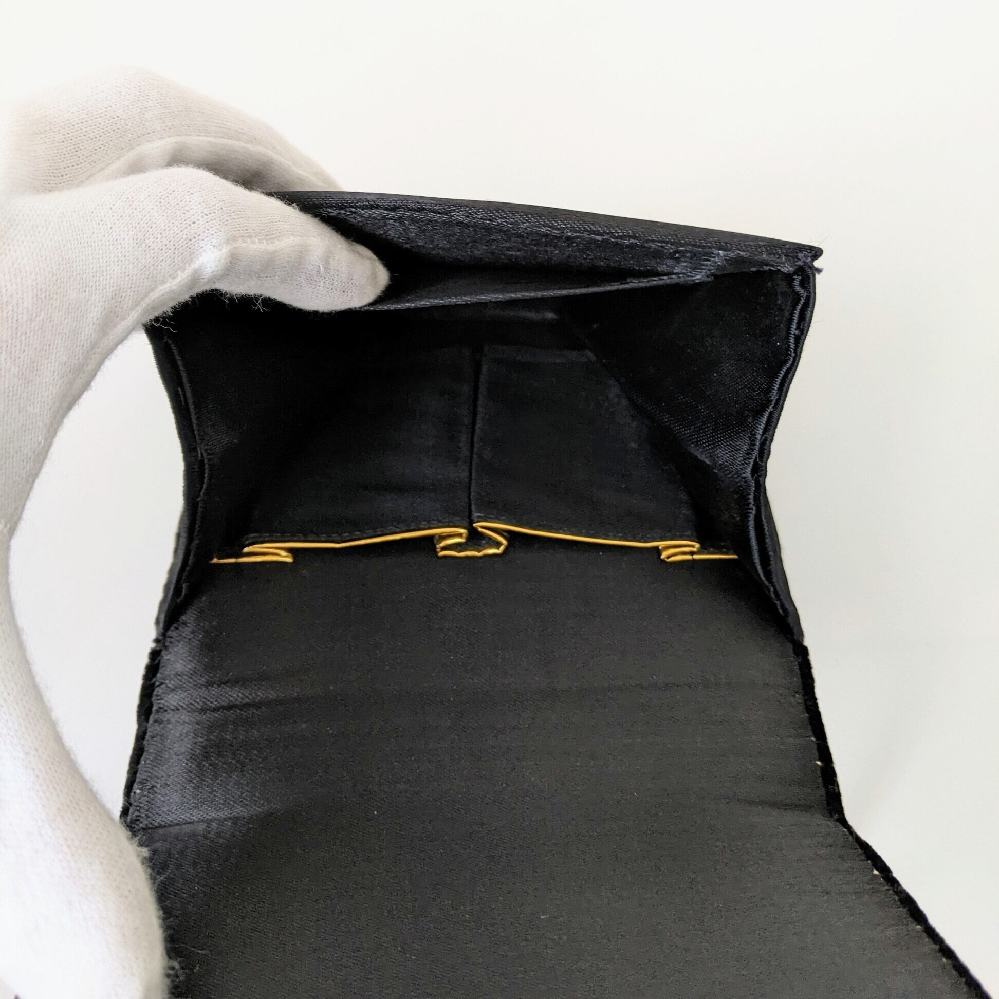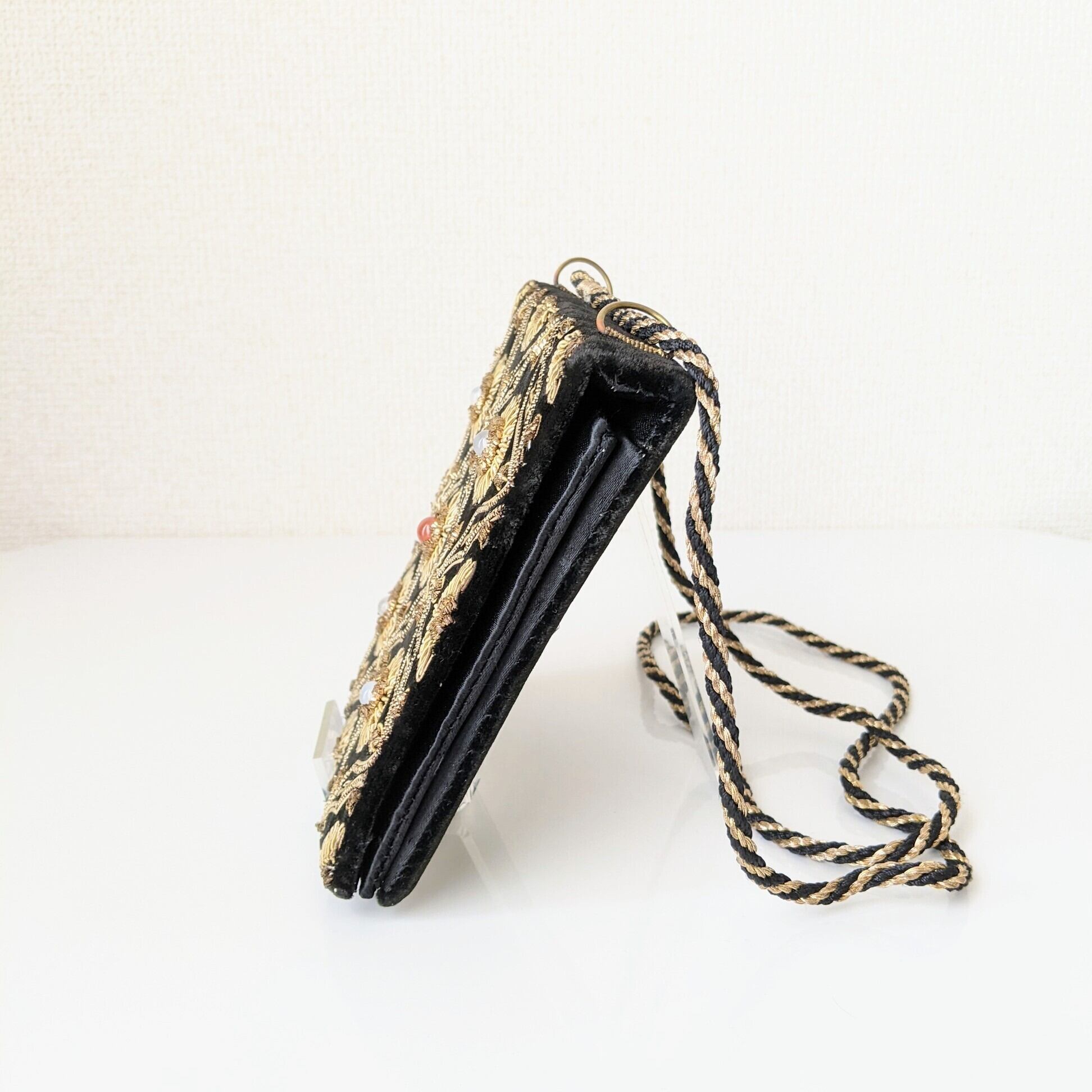 ほぼ正方形の形、黒のベルベット生地に煌びやかな金の糸と天然石の美しいコントラストが素敵です。