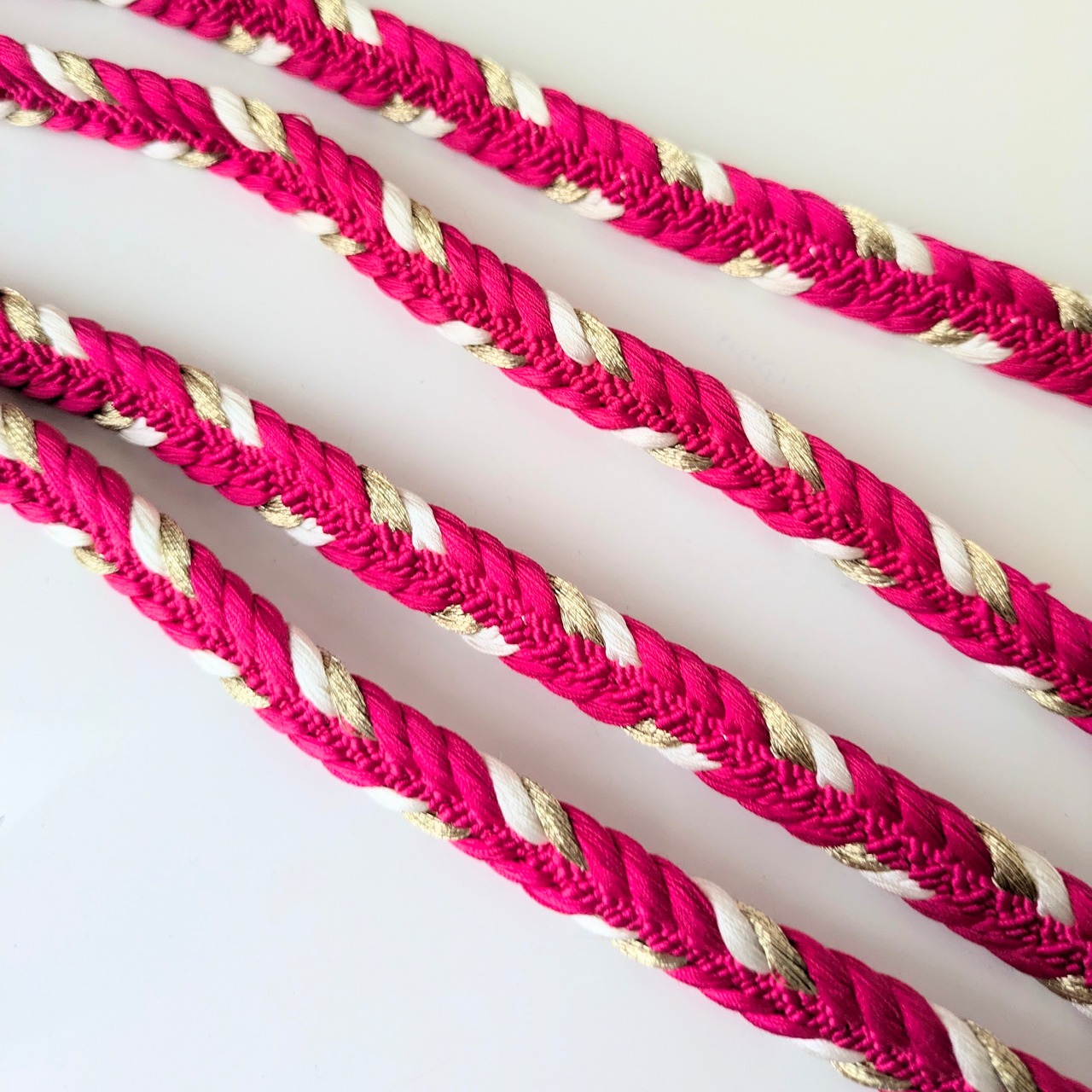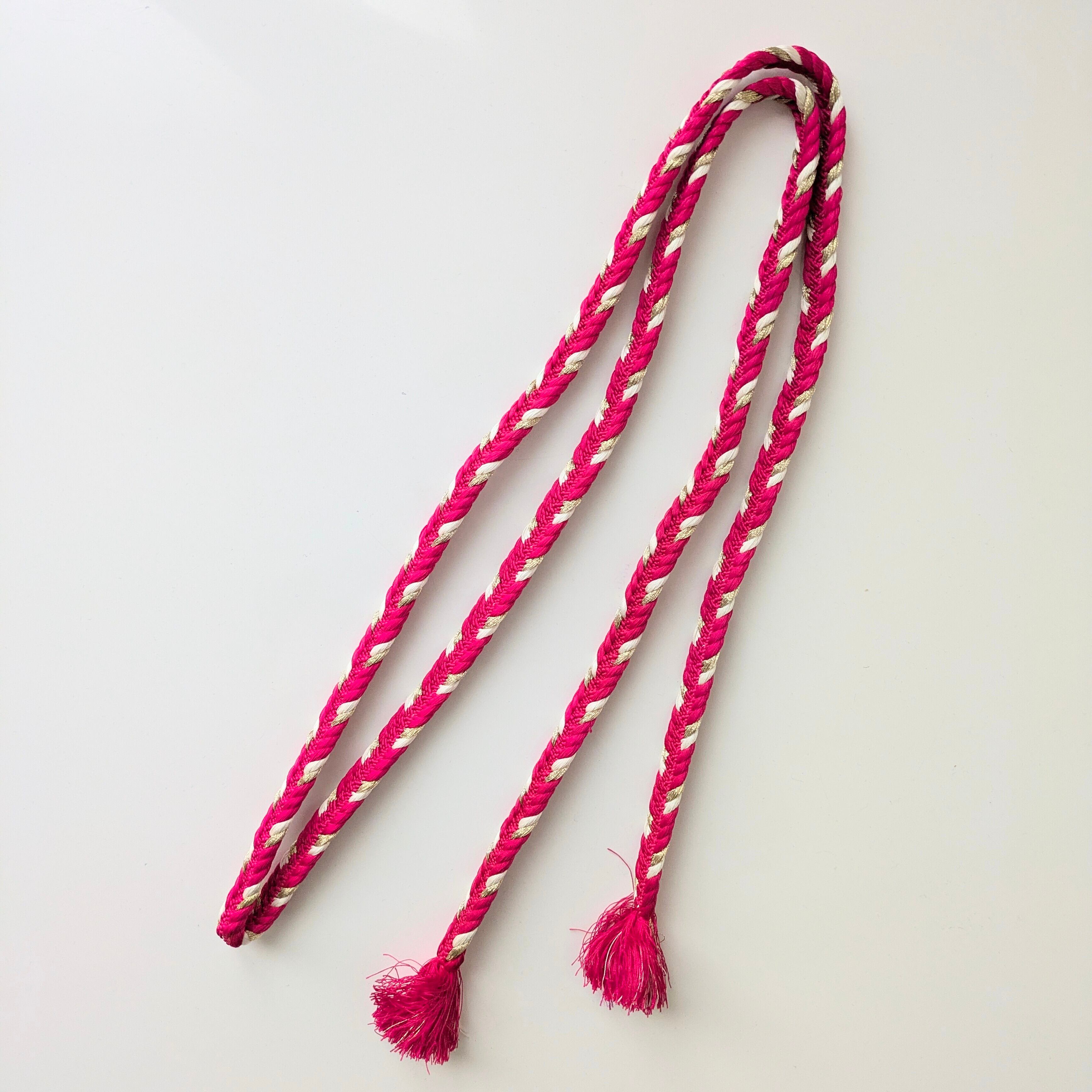 赤寄りの濃いピンクに白と金糸の華やかさのある平組の帯締めです。