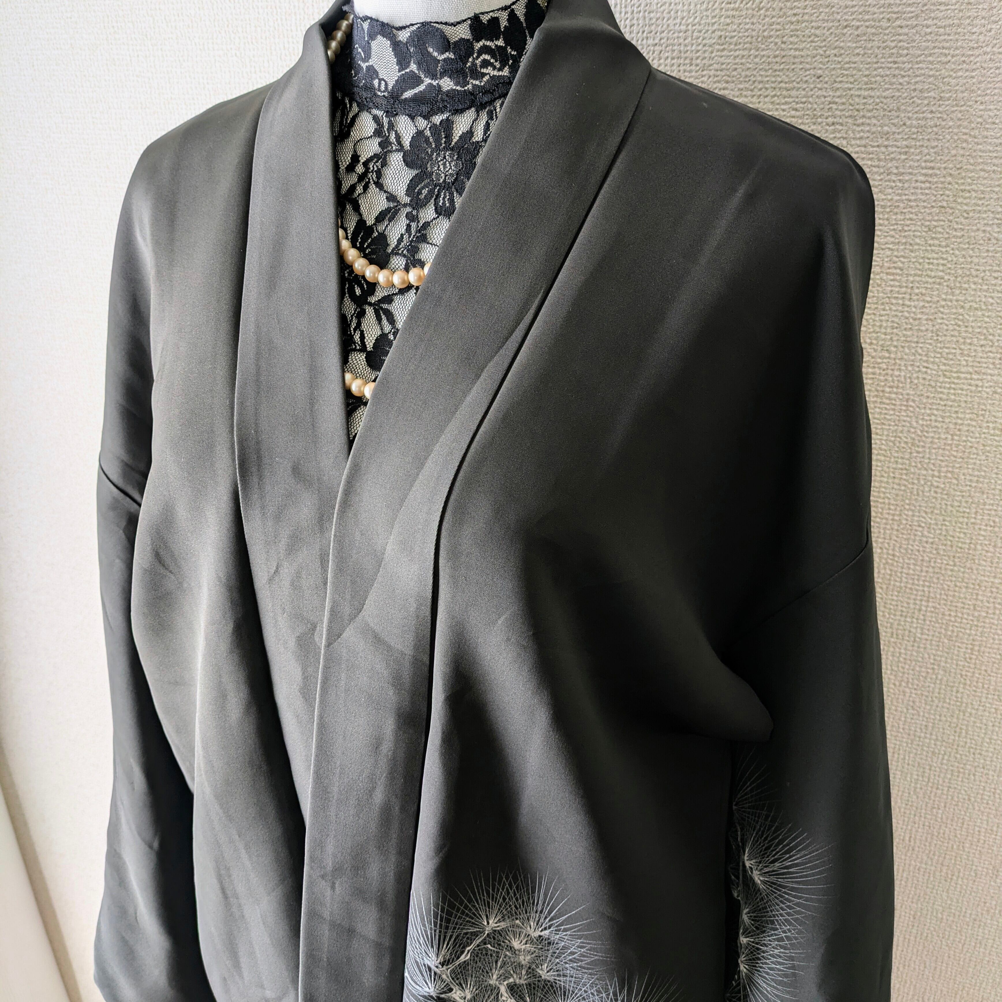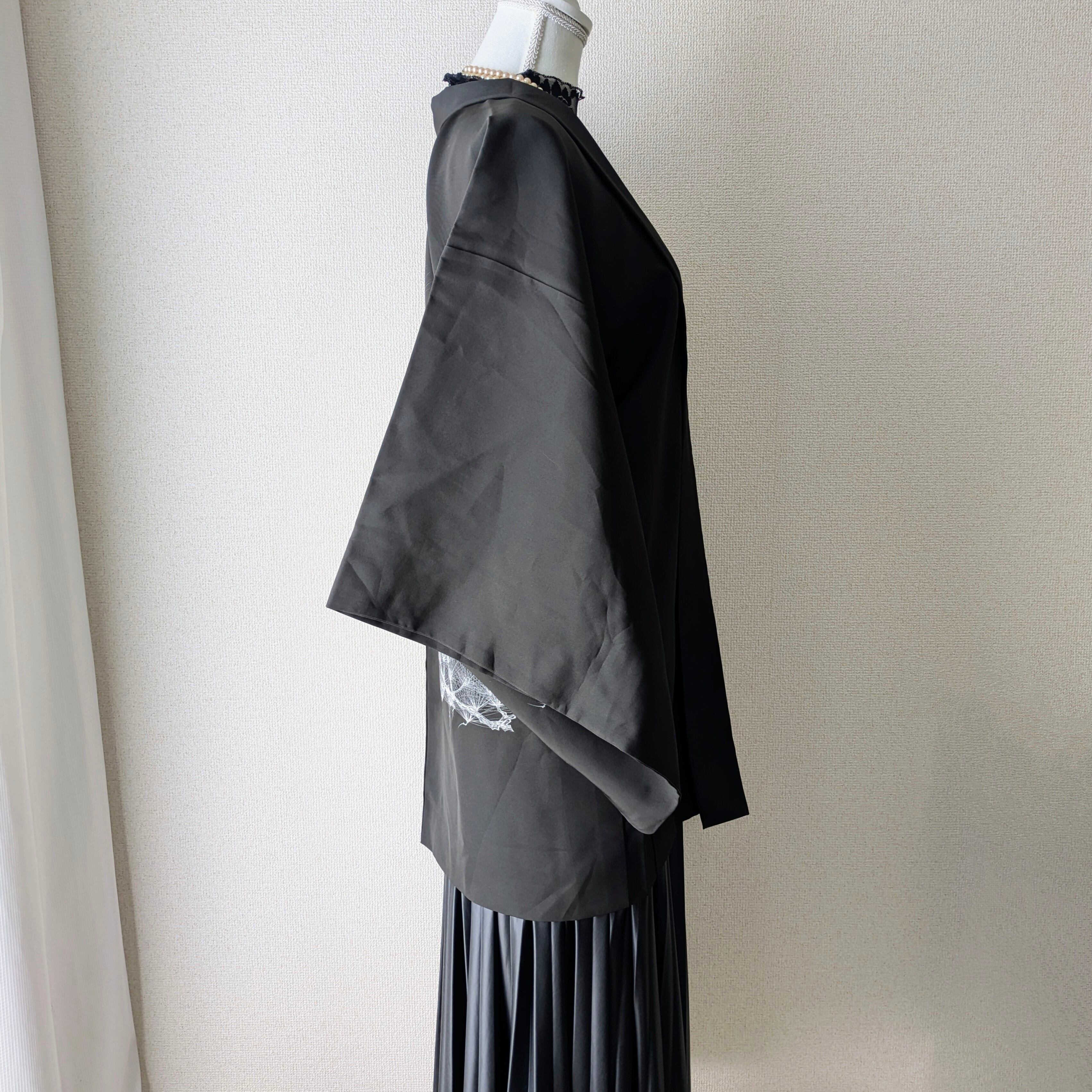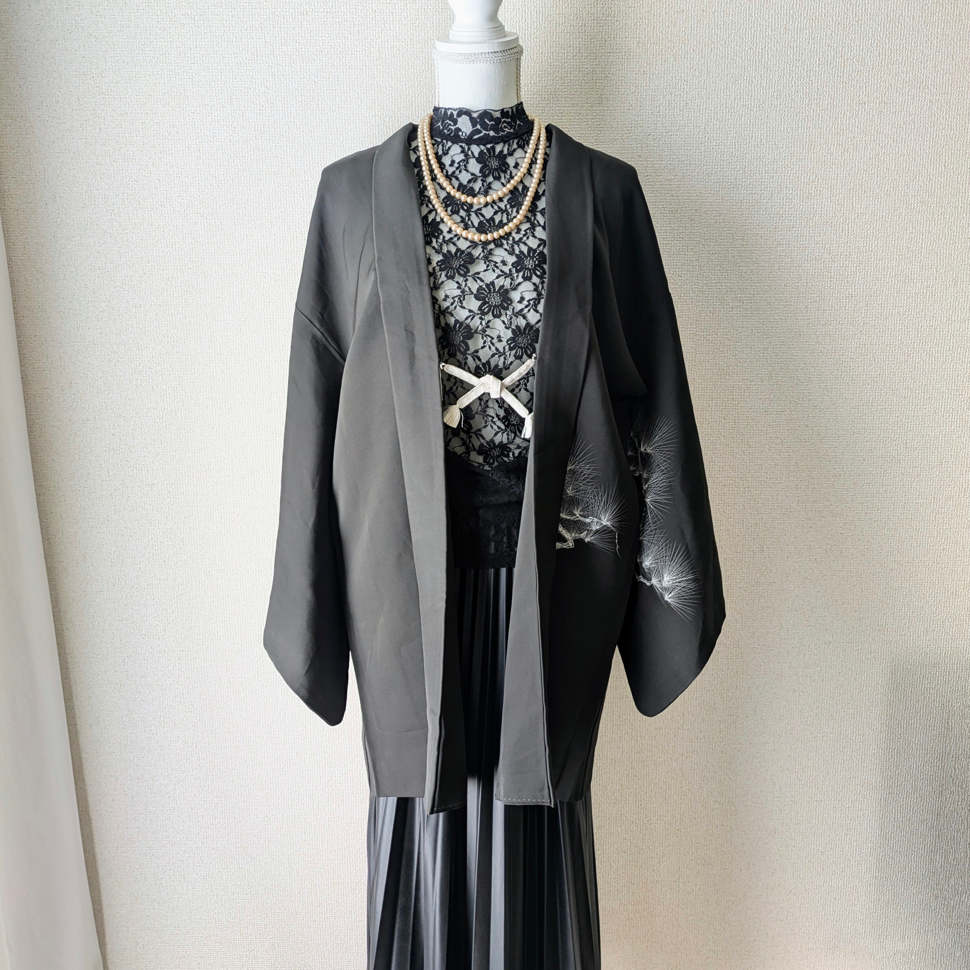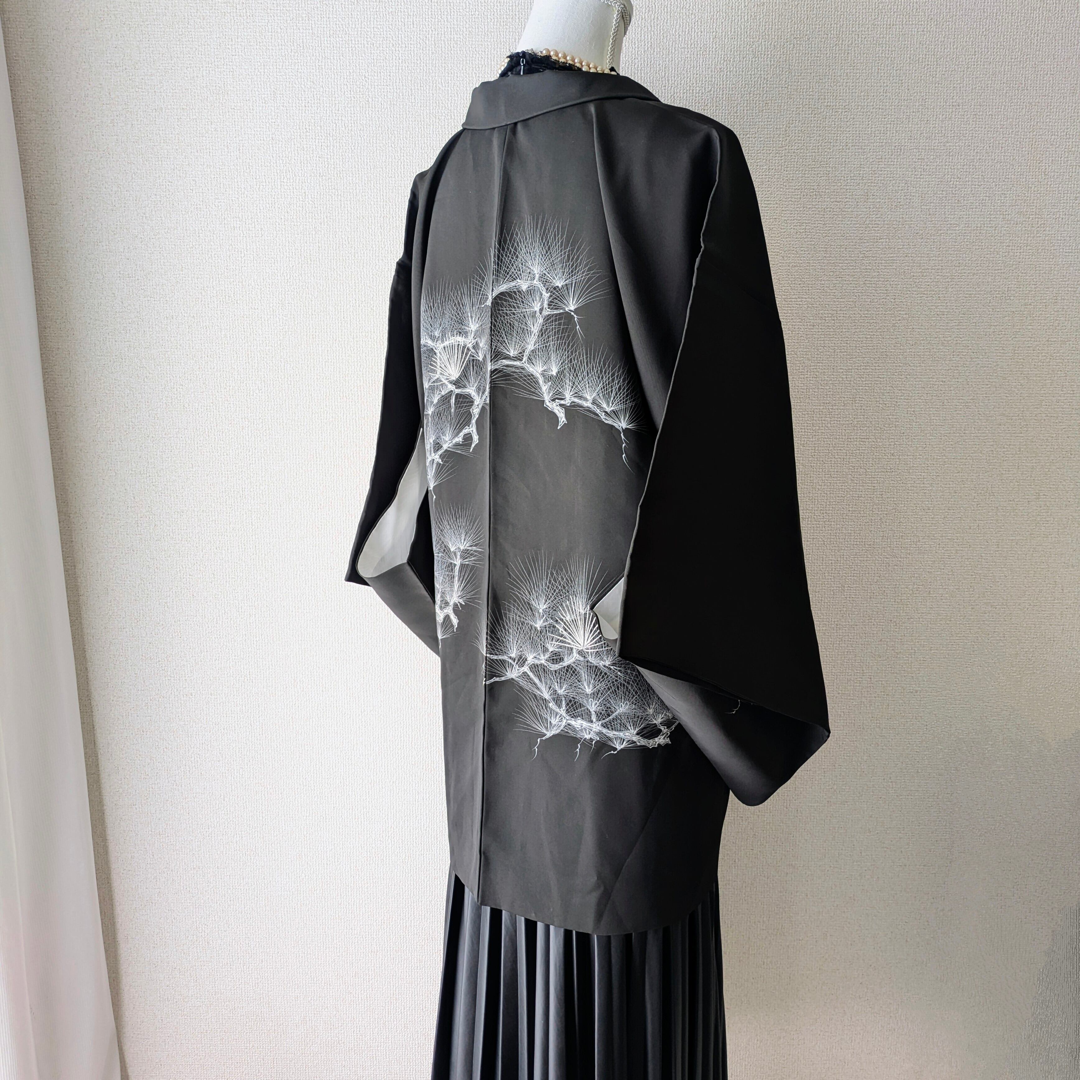 【Vintage】HAORI 長羽織 羽織 正絹 縮緬 黒 白松 刺繍 大正浪漫 古布 時代布 和洋折衷